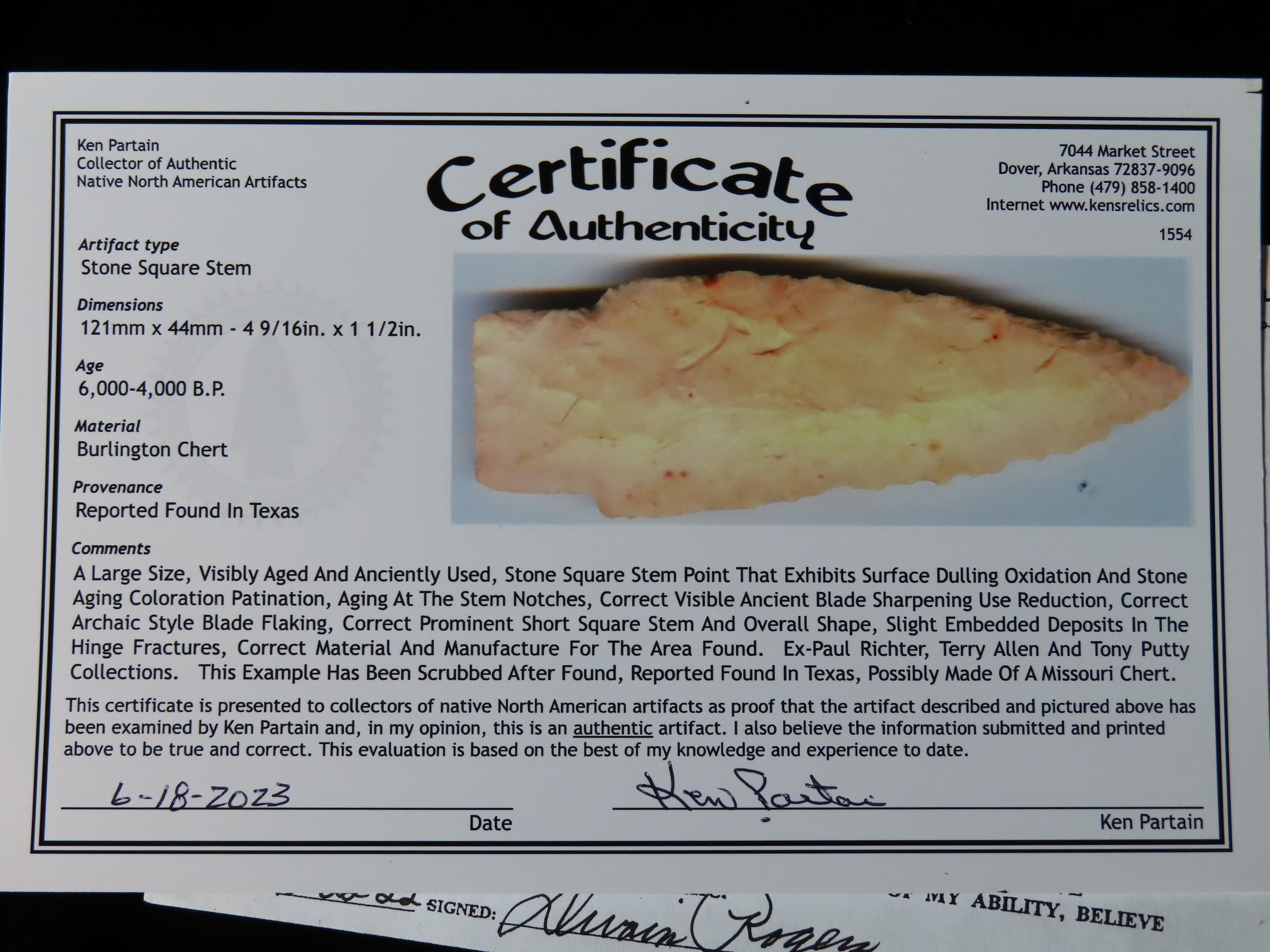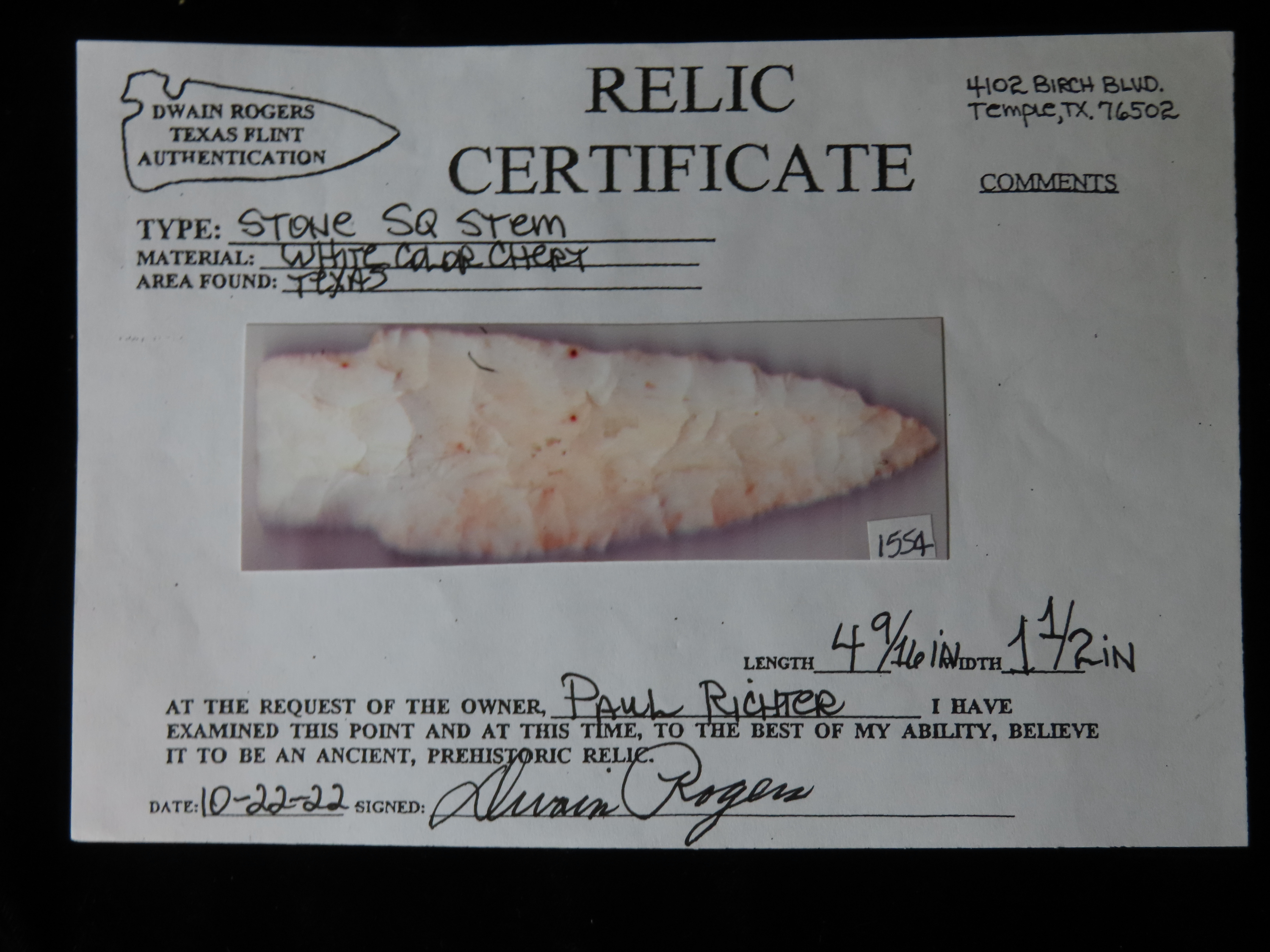 4.9/16" Stone Square Stem, Partain / Rogers COA, Texas