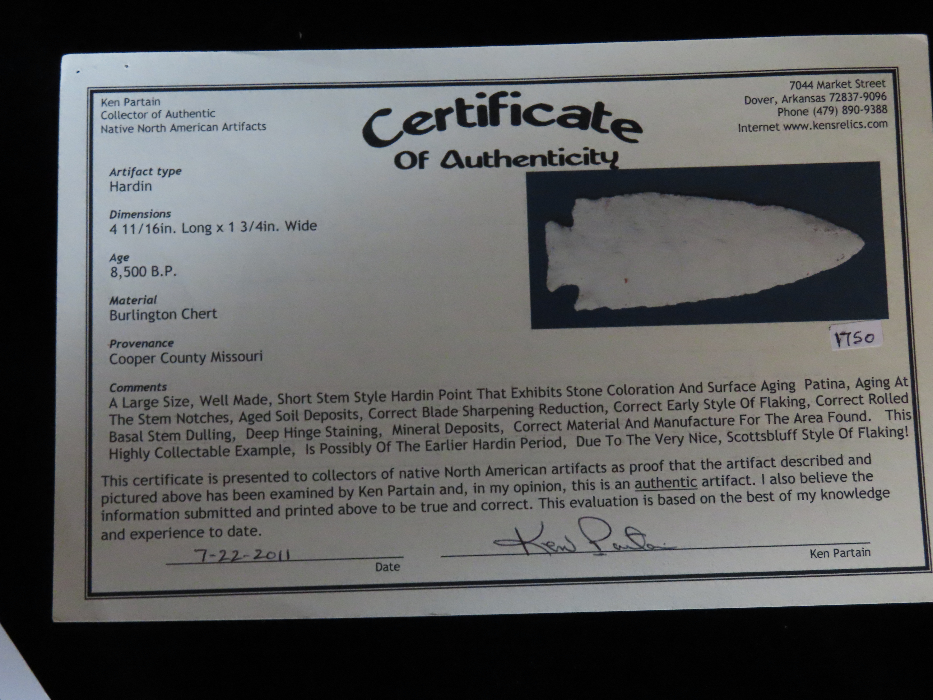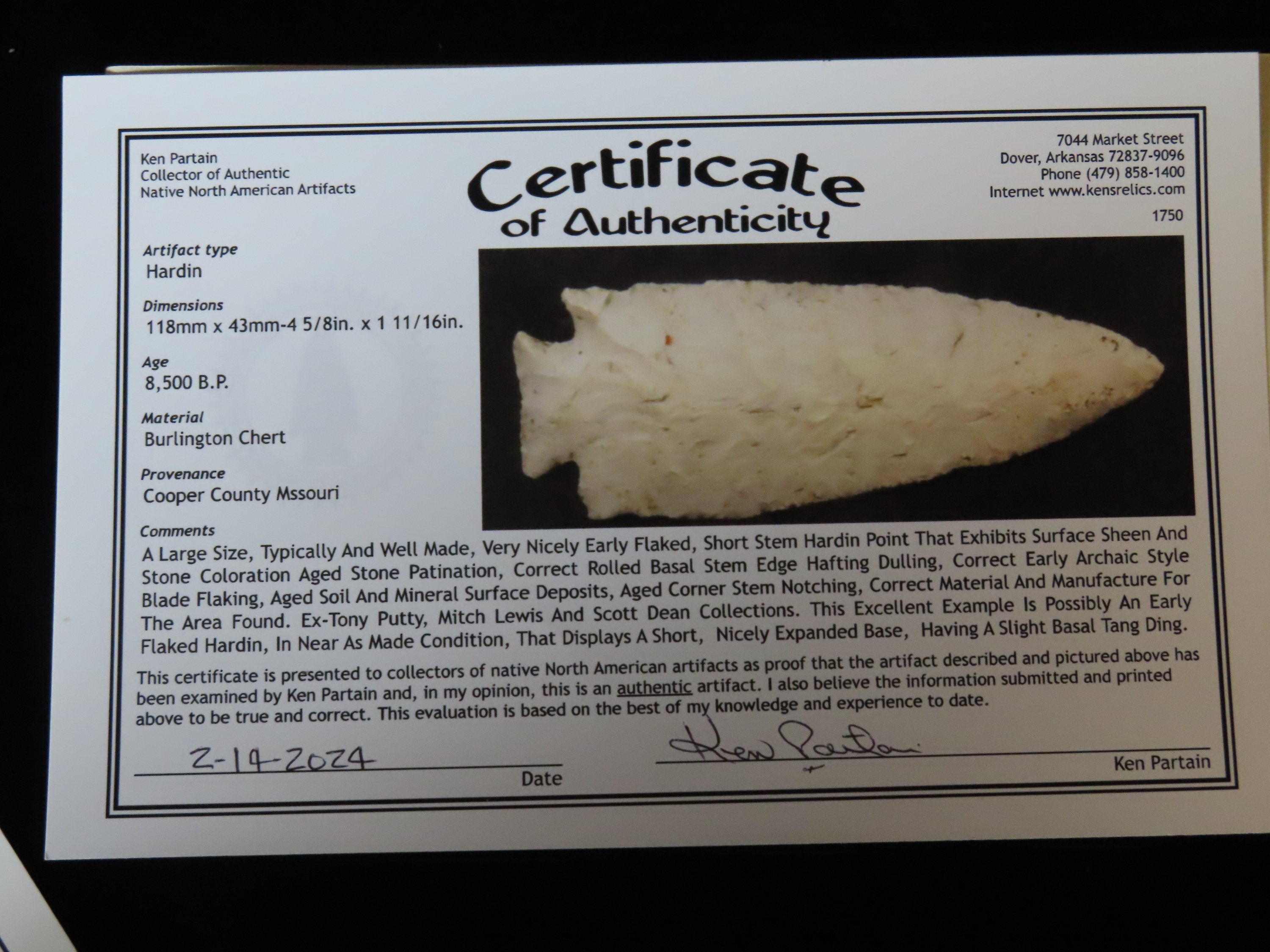 4.11/16″ Hardin, Partain / Jackson COA, Cooper CO MO