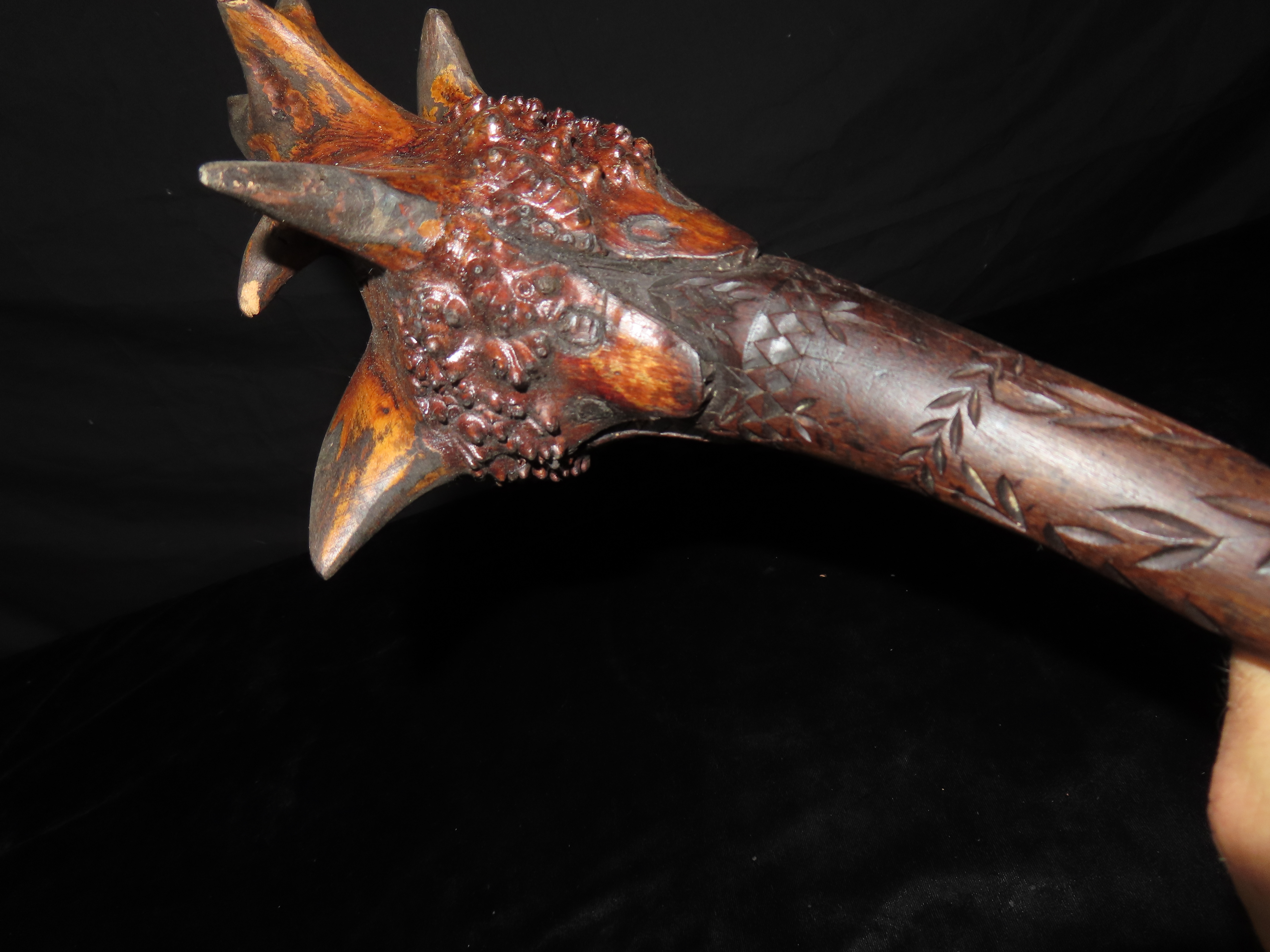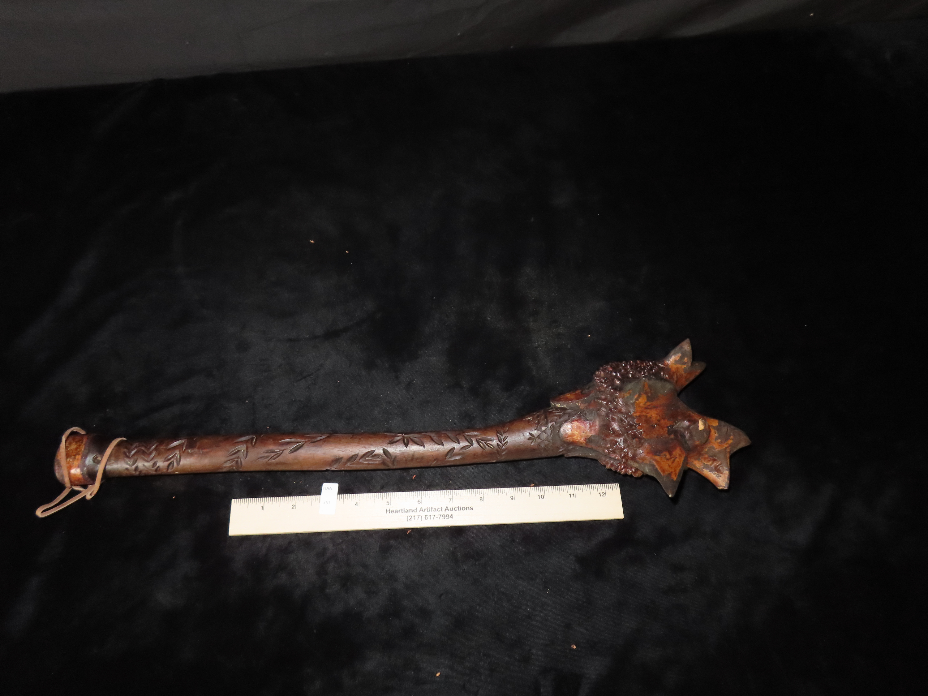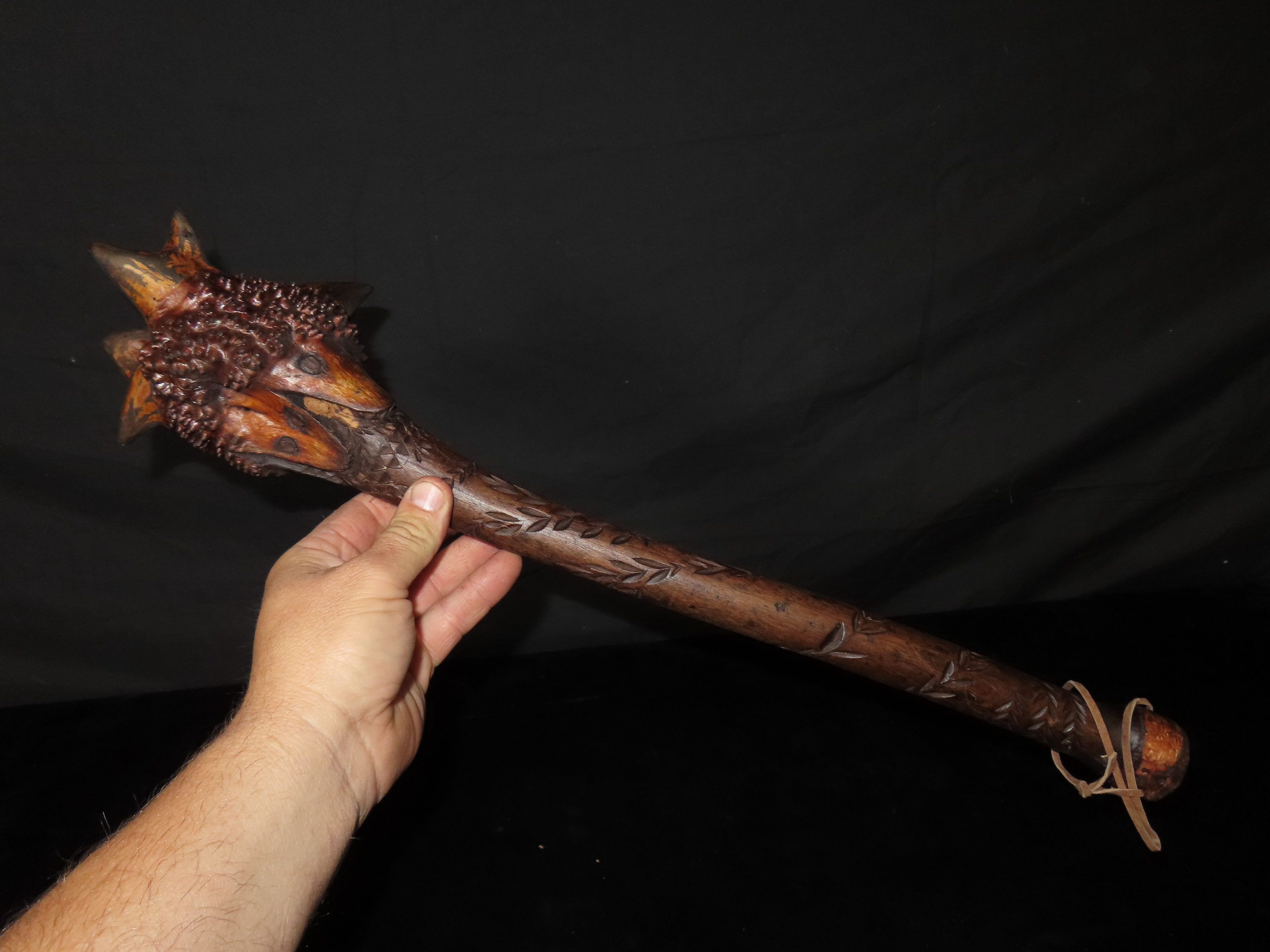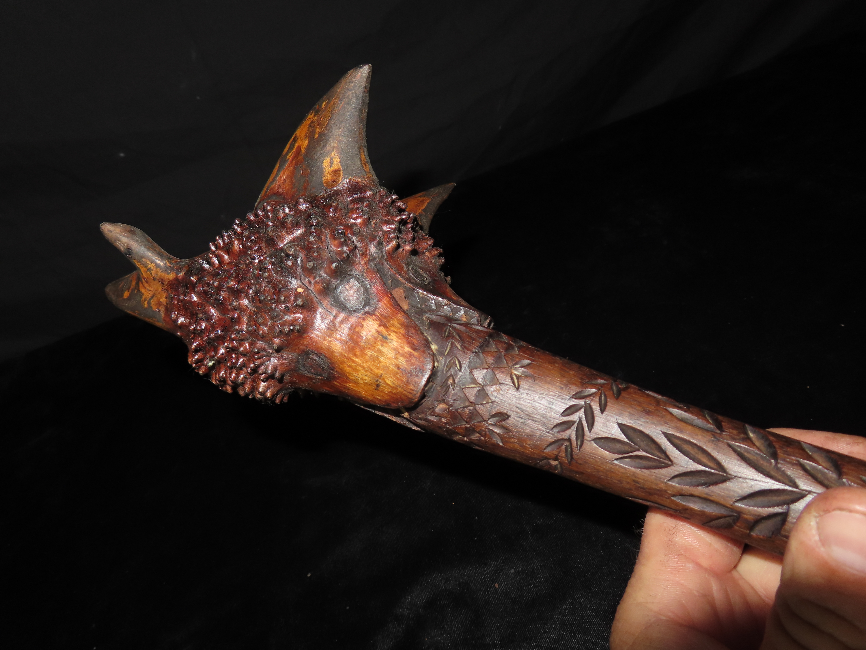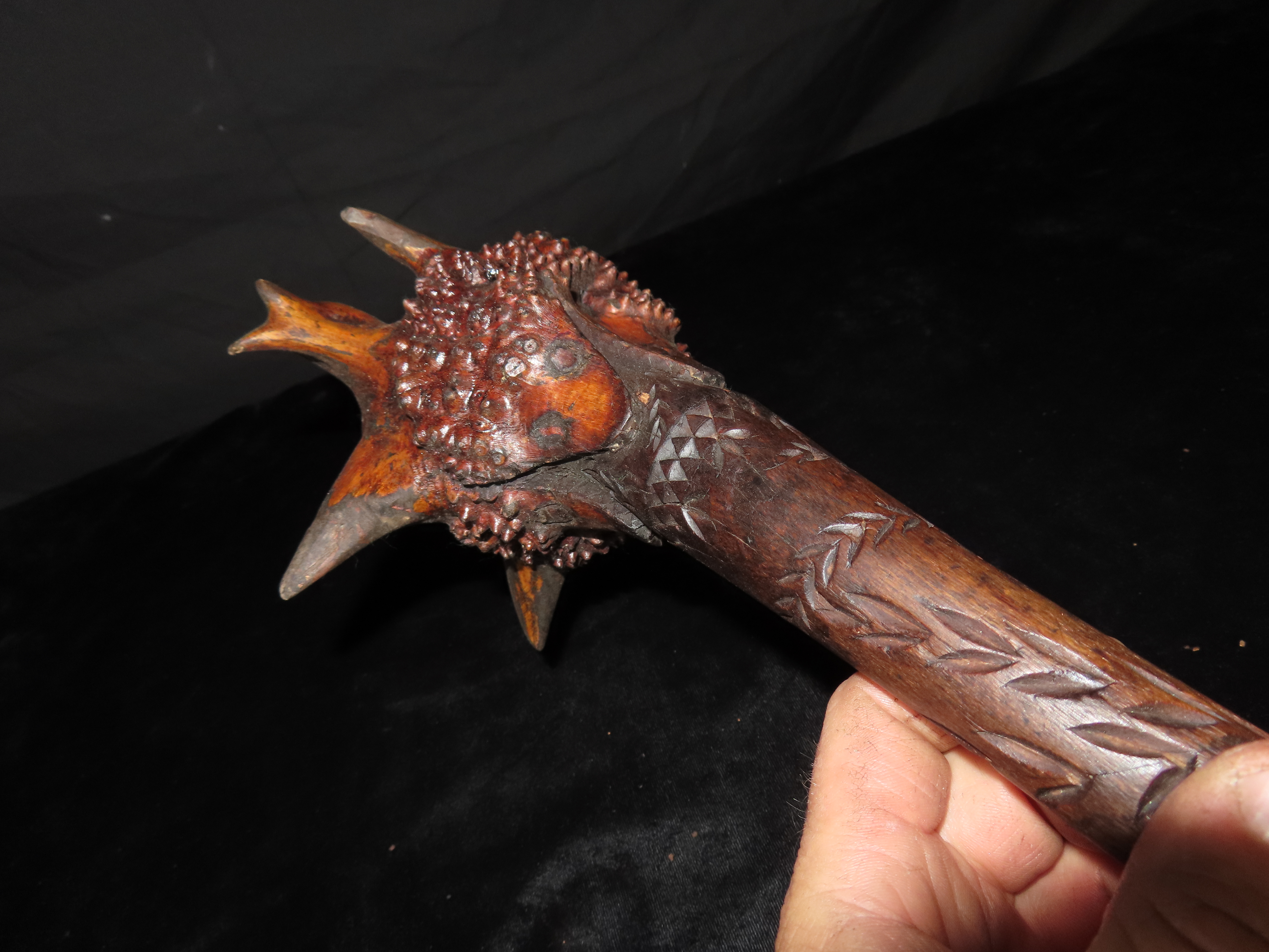 23″ Penobscot Root War Club, Very Intricately Carved, Several Porcupine Effigy carvings, Beautiful Patina to wood, And Beautiful Detailed Carving of Handle