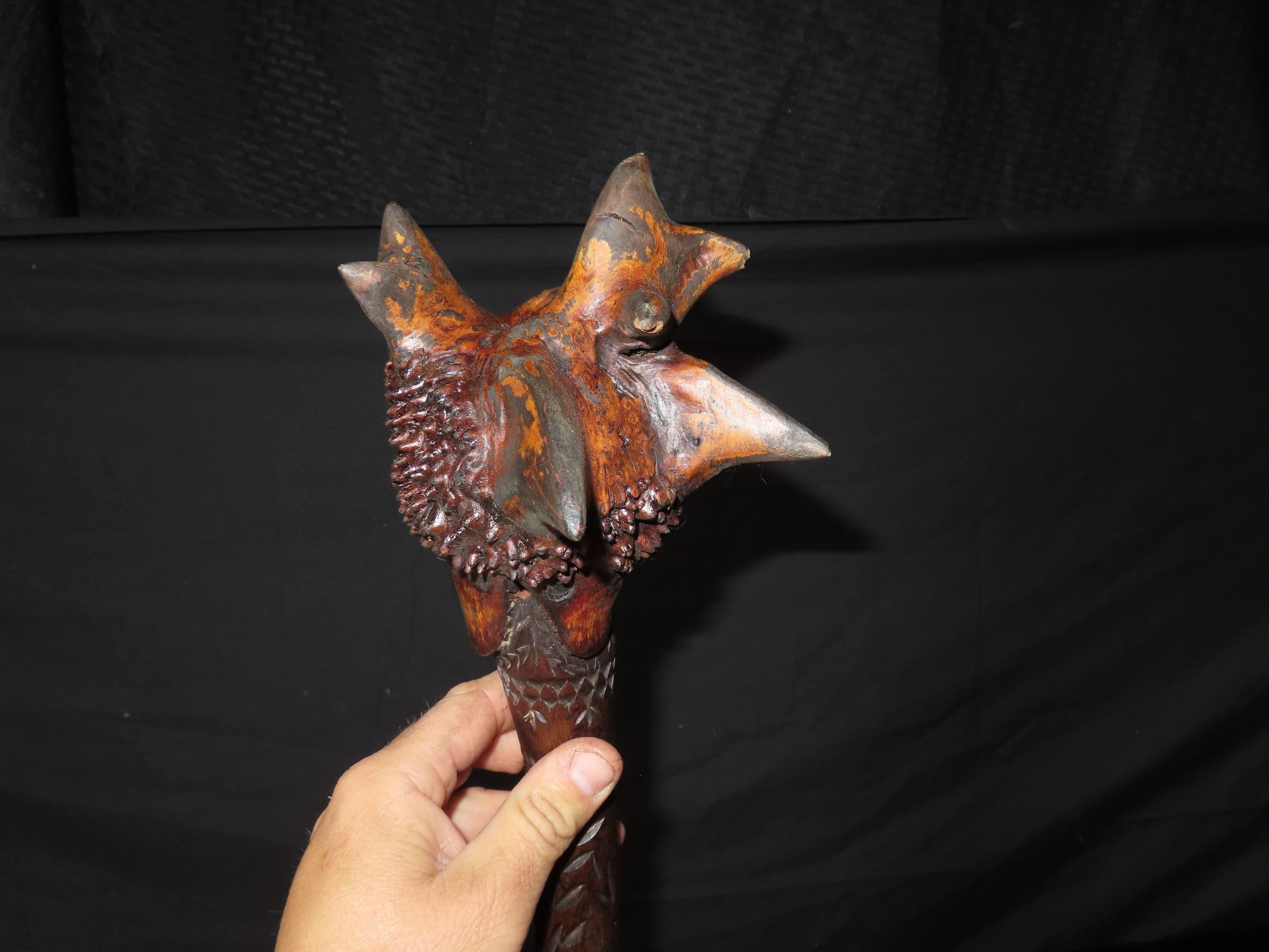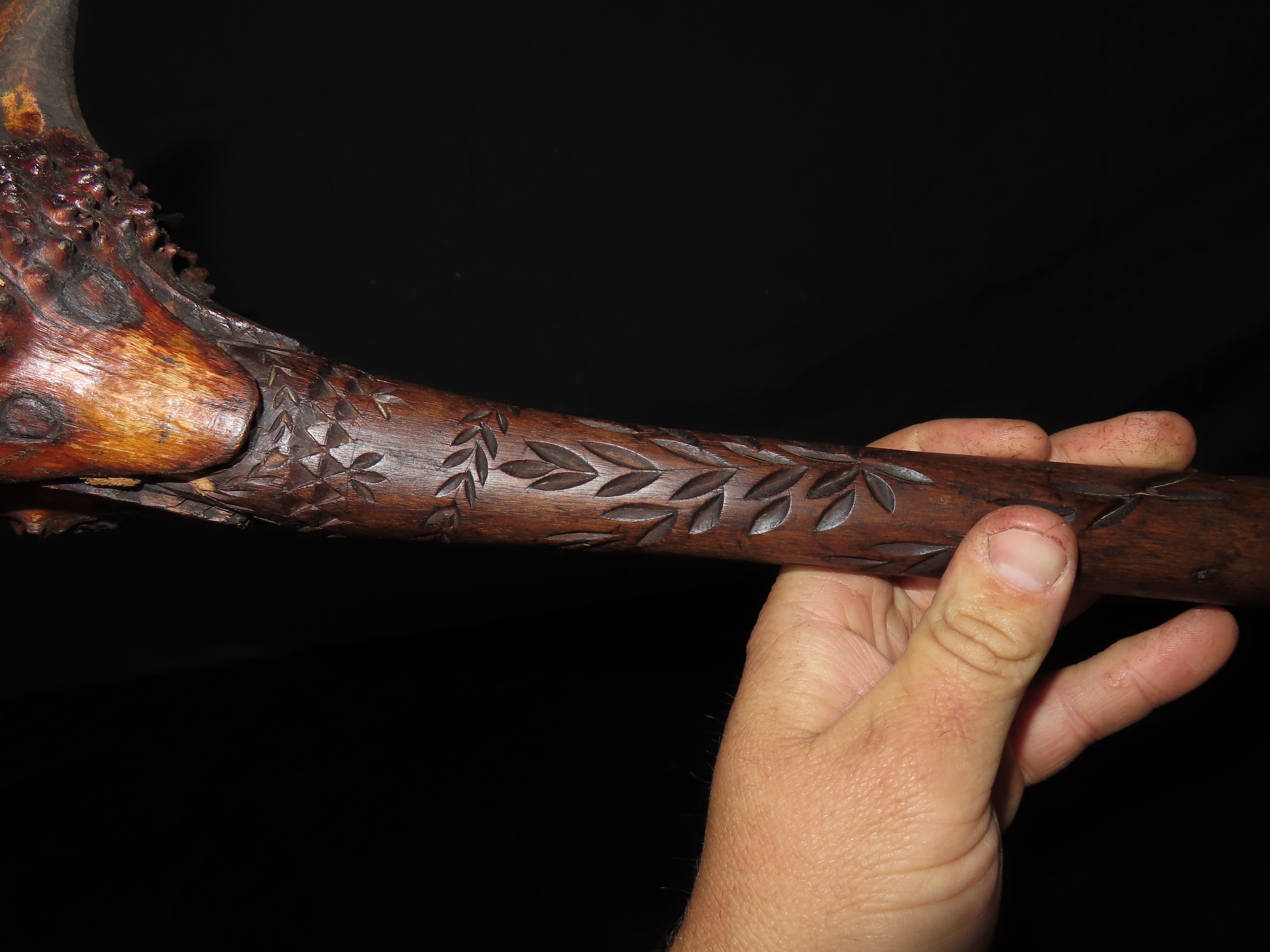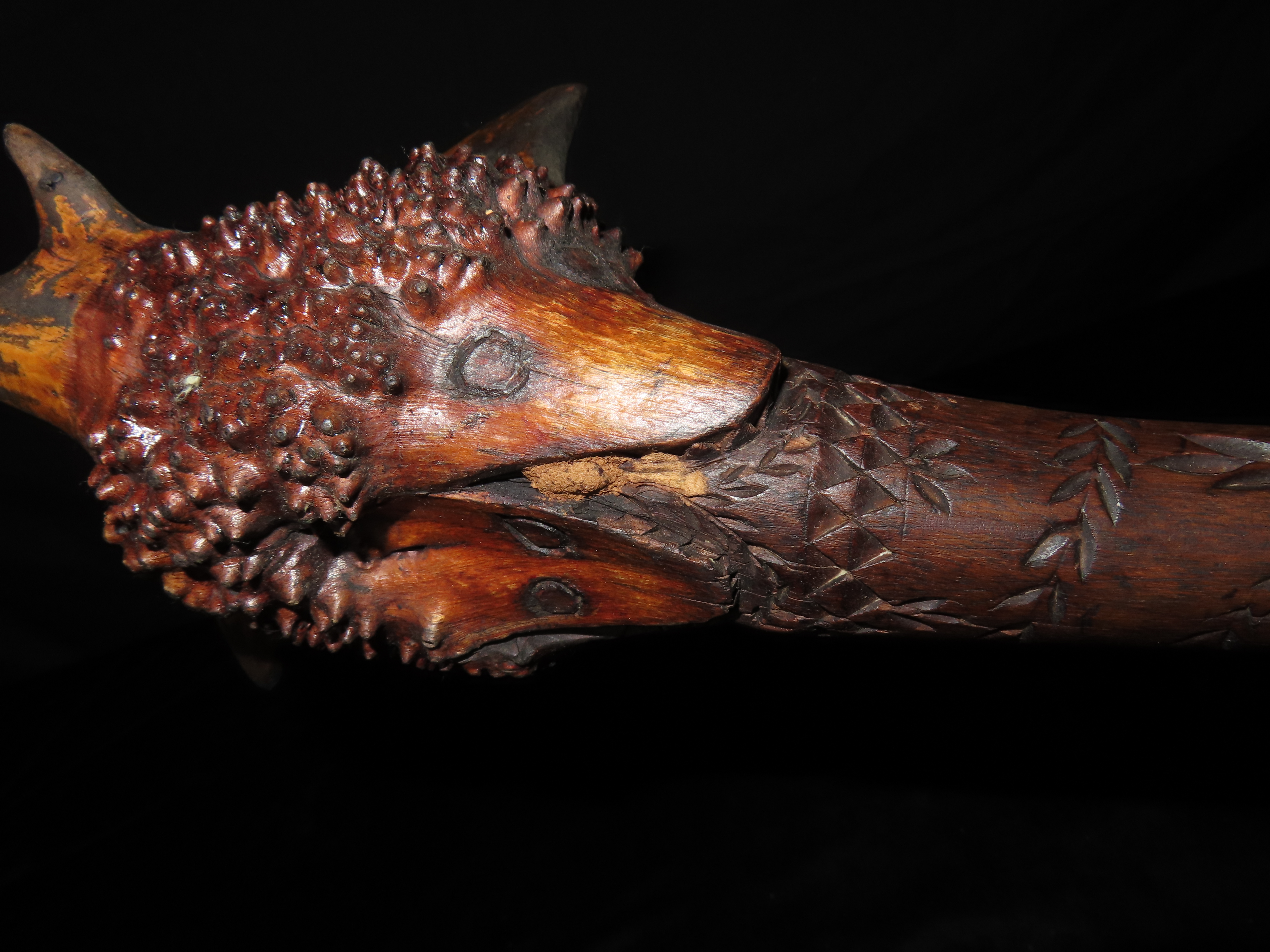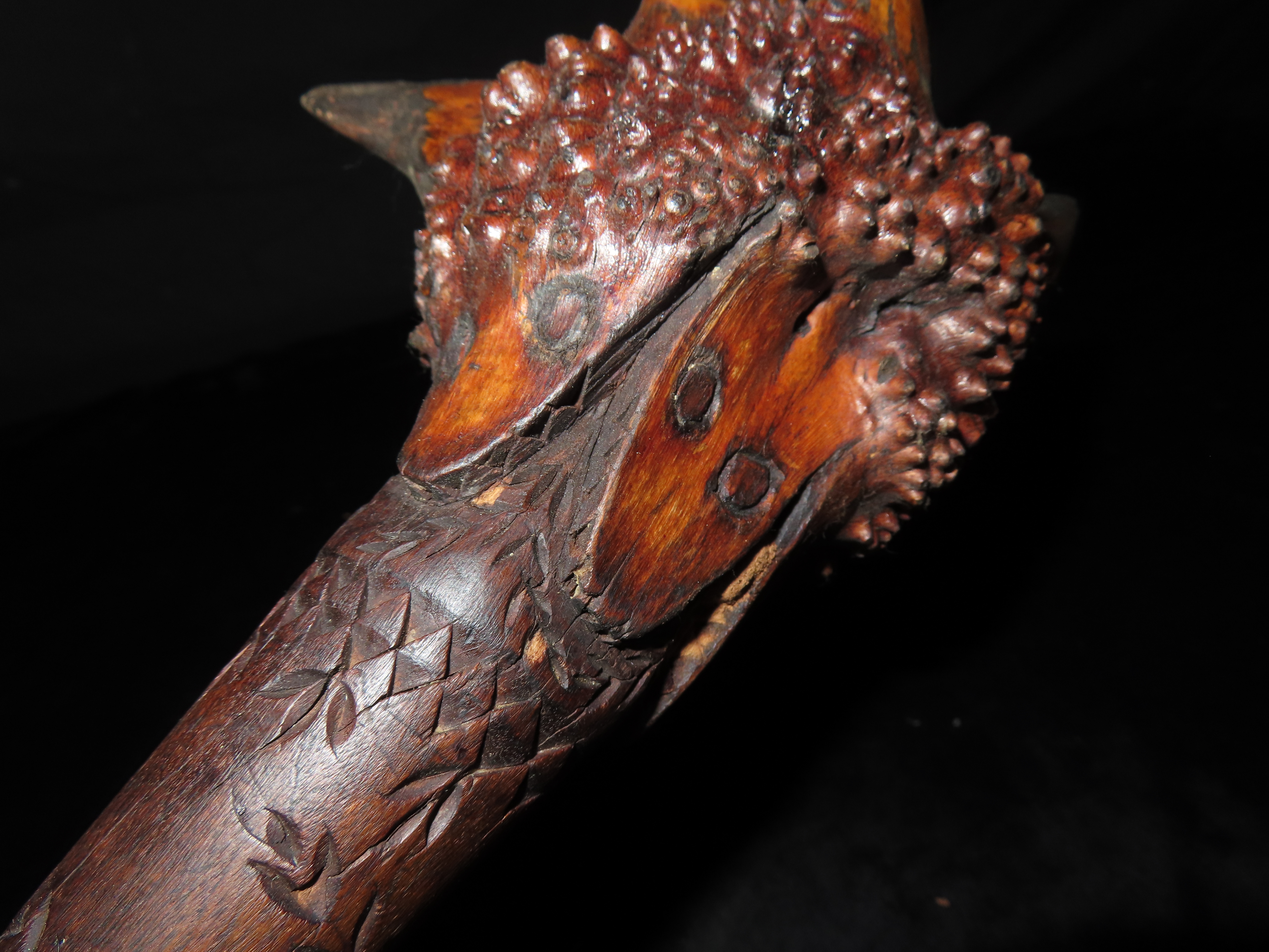 23″ Penobscot Root War Club, Very Intricately Carved, Several Porcupine Effigy carvings, Beautiful Patina to wood, And Beautiful Detailed Carving of Handle