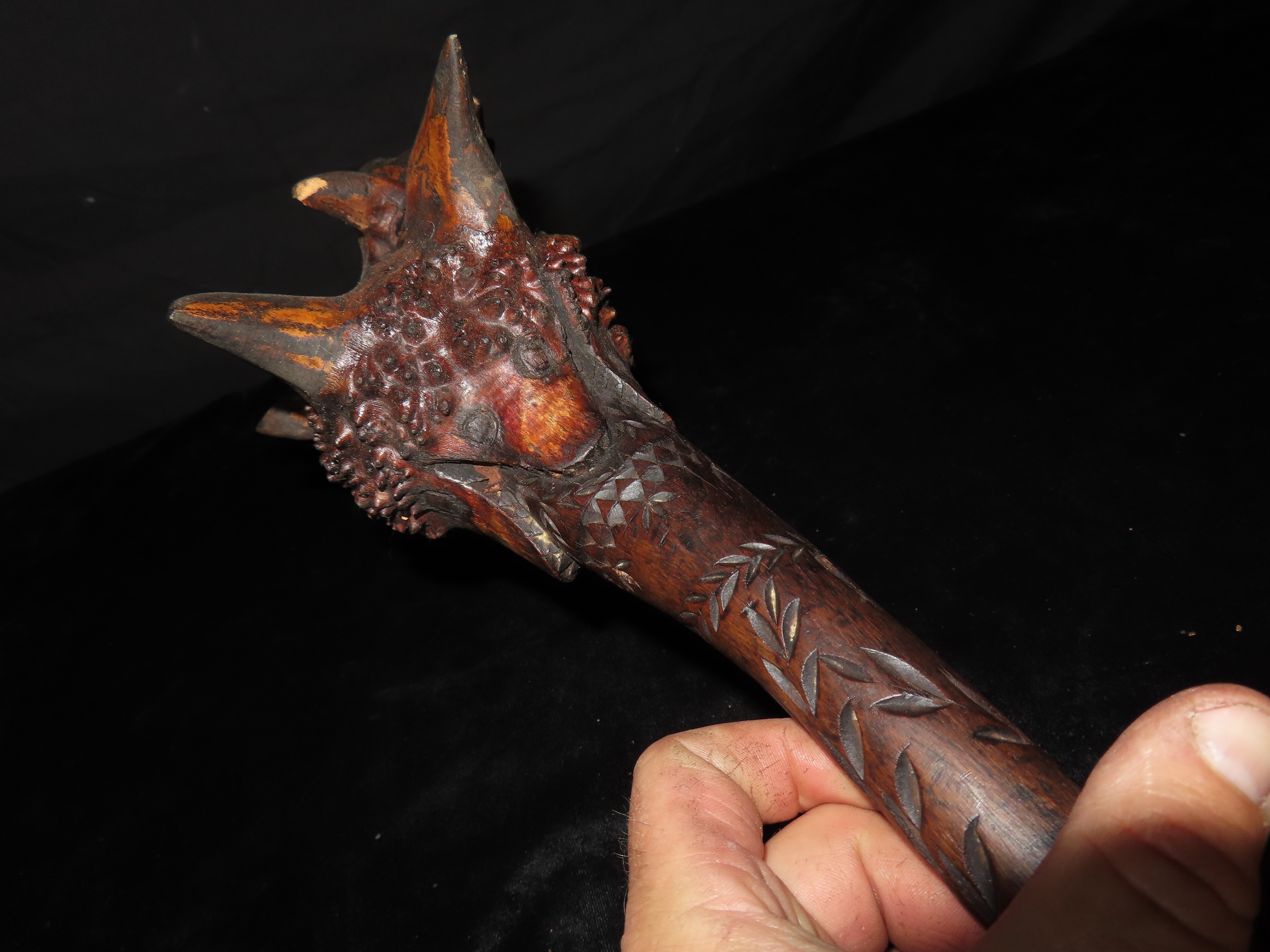 23" Penobscot Root War Club, Very Intricately Carved, Several Porcupine Effigy carvings, Beautiful Patina to wood, And Beautiful Detailed Carving of Handle
