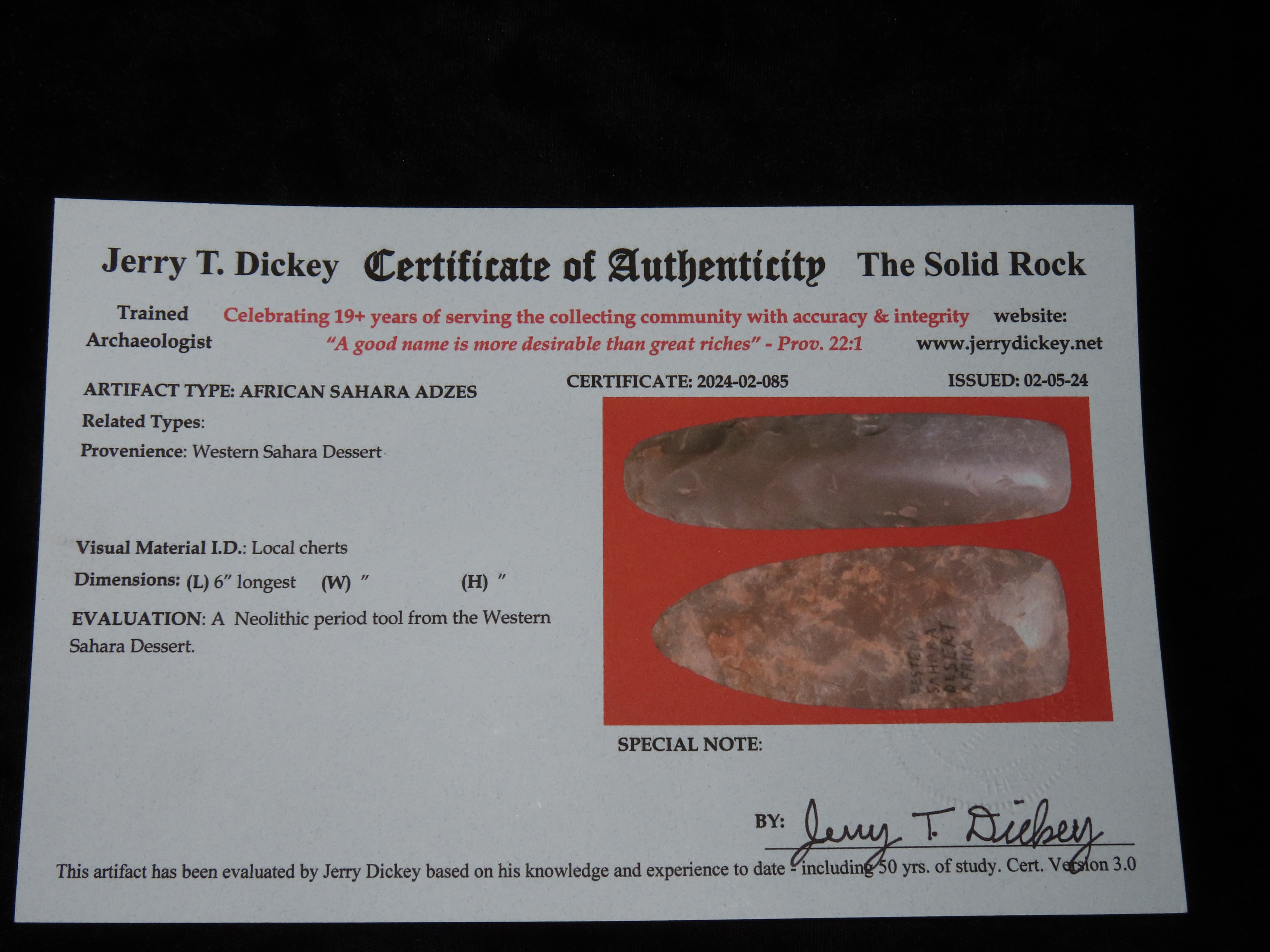 Lot of 2 Neolithic Adzes, Dickey COA, longest 6", found in the Saharan Desert