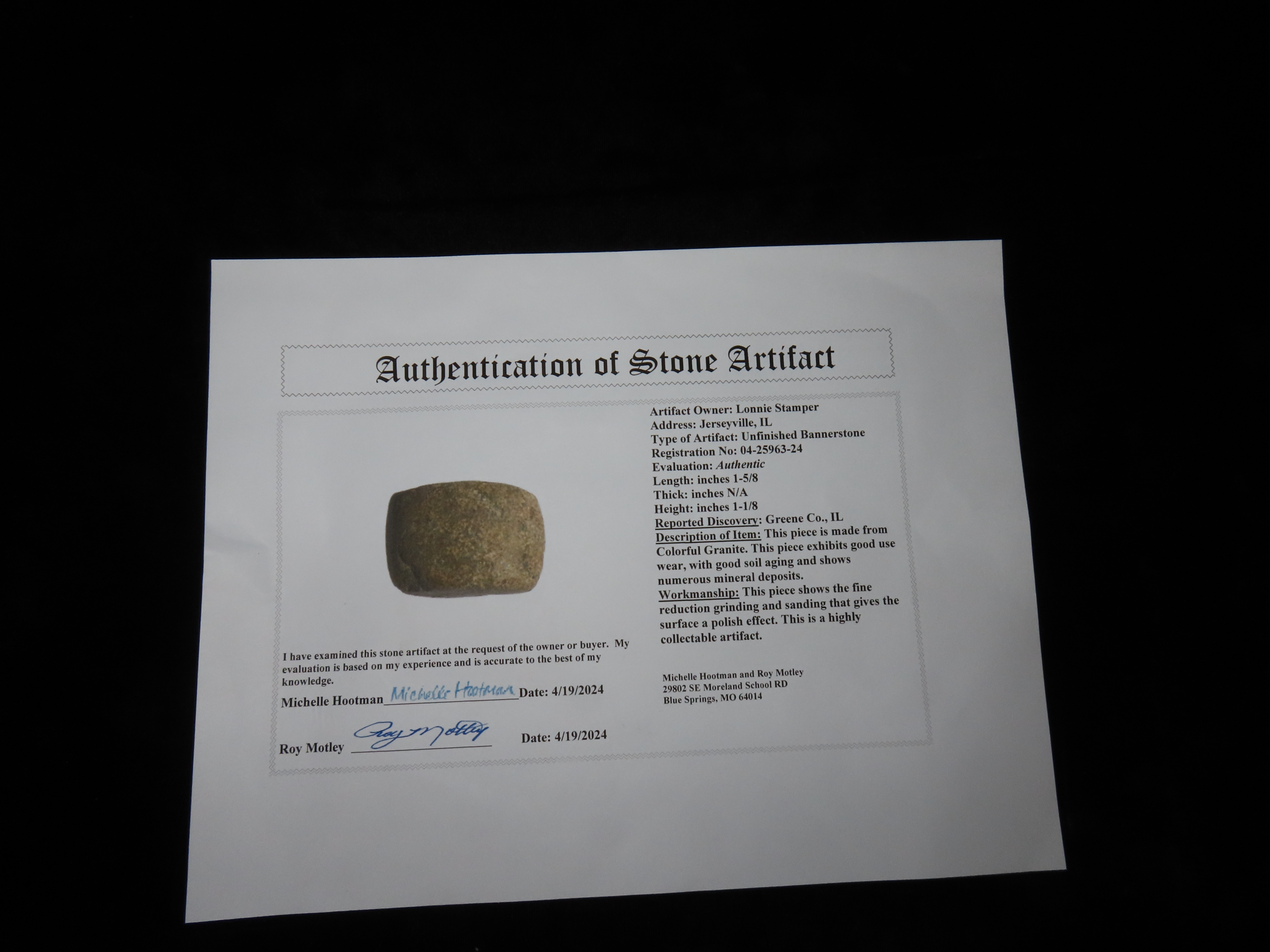 1.5/8″ Bannerstone Preform, Motley COA, Greene CO IL