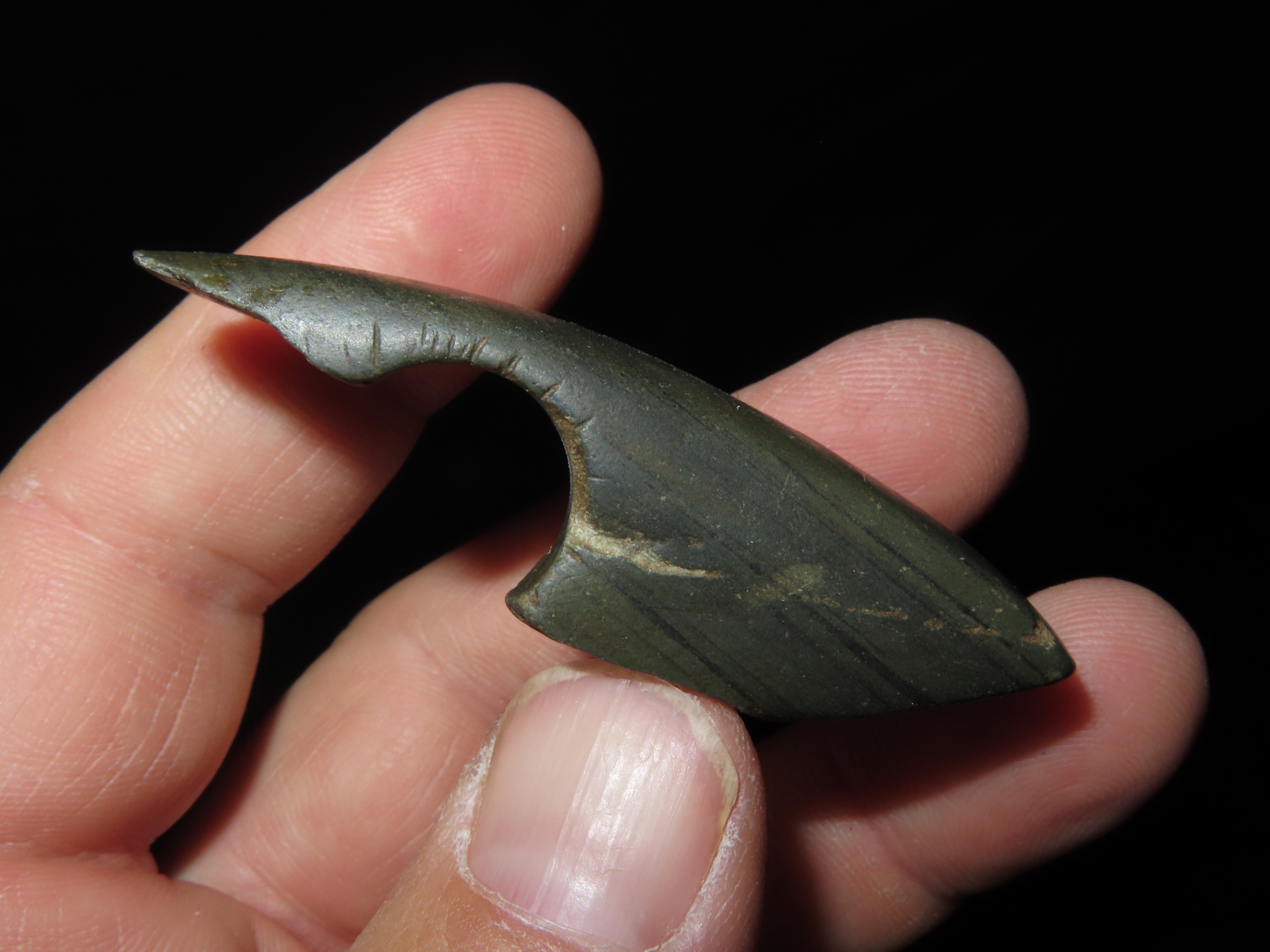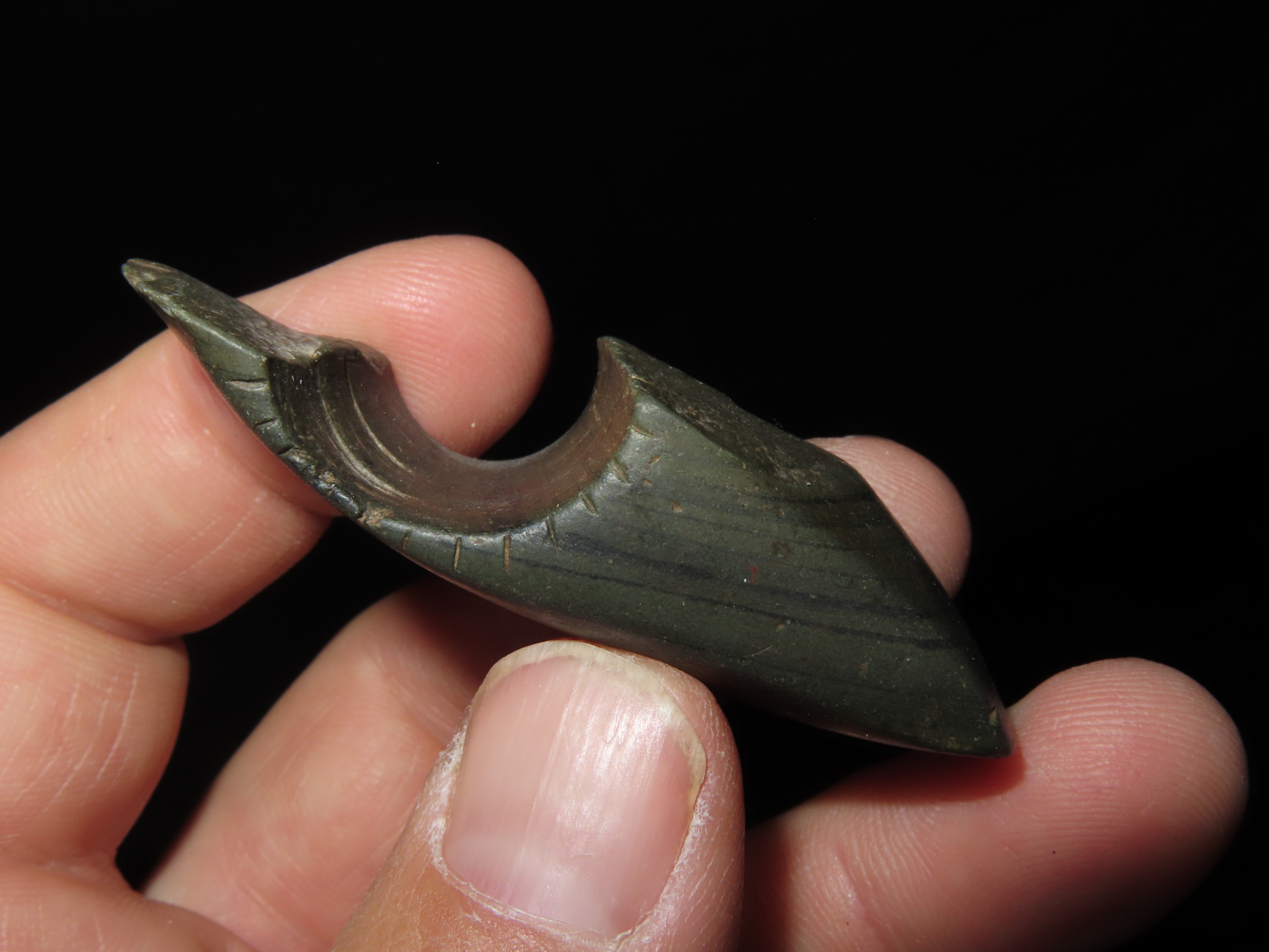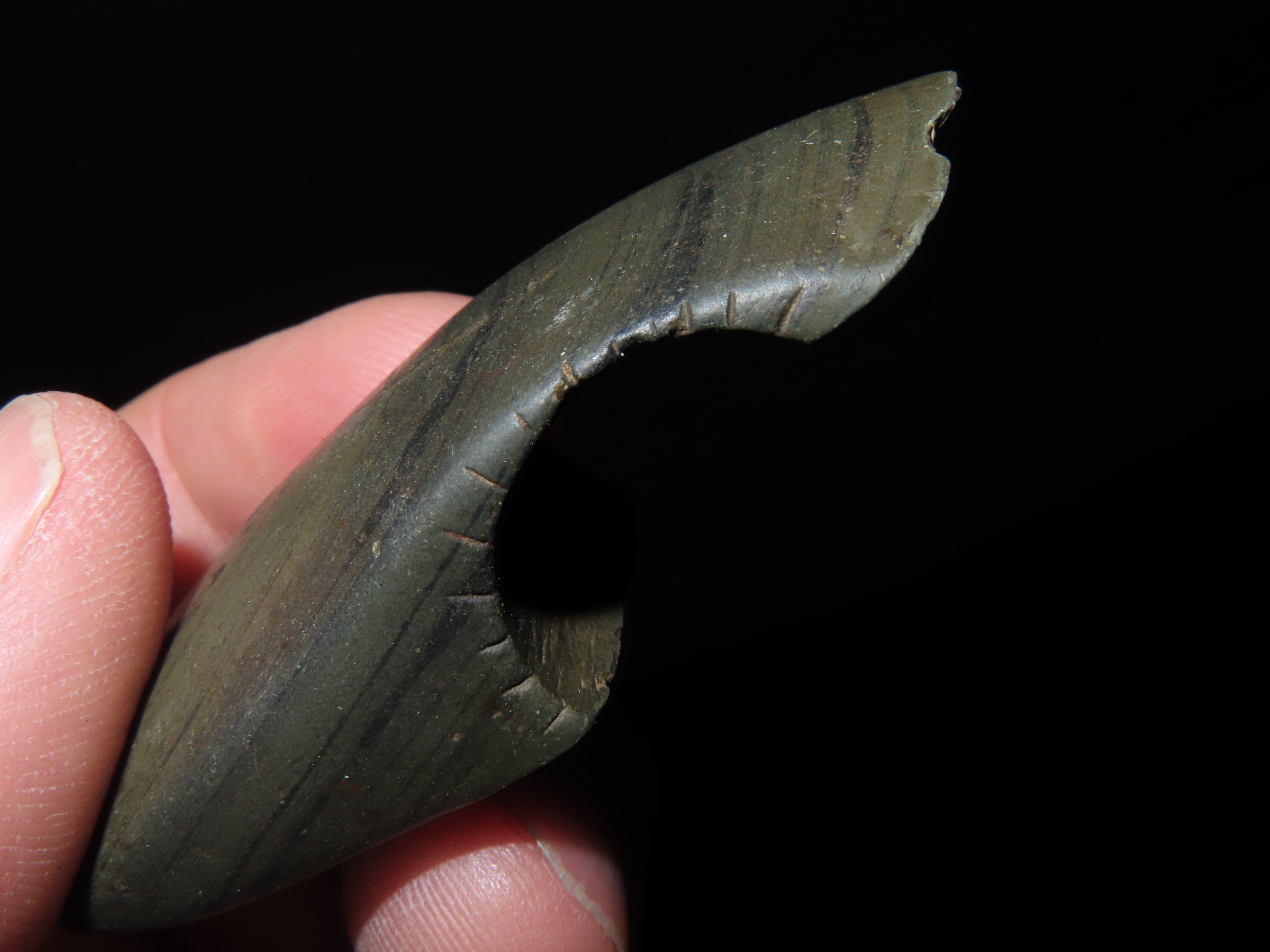 2 3/8″ Heartbreaker Slate Bannerstone, tally marks around hole, Ex Steve McCabe, Sullivan Co., Missouri