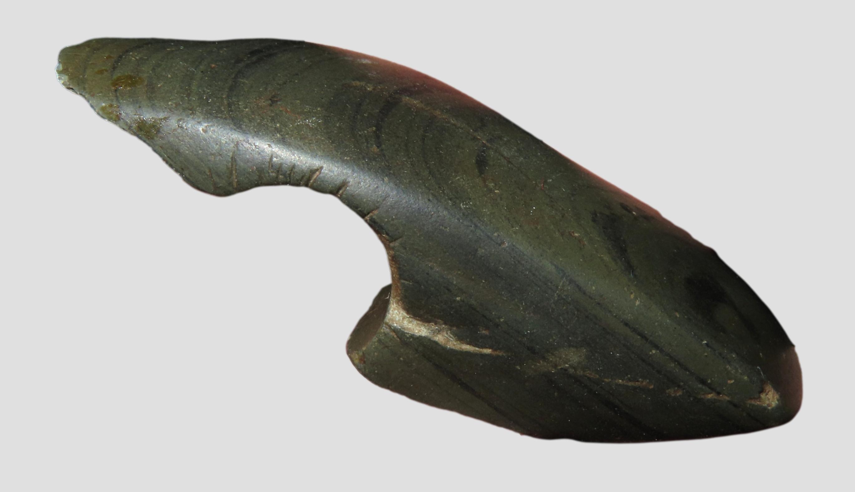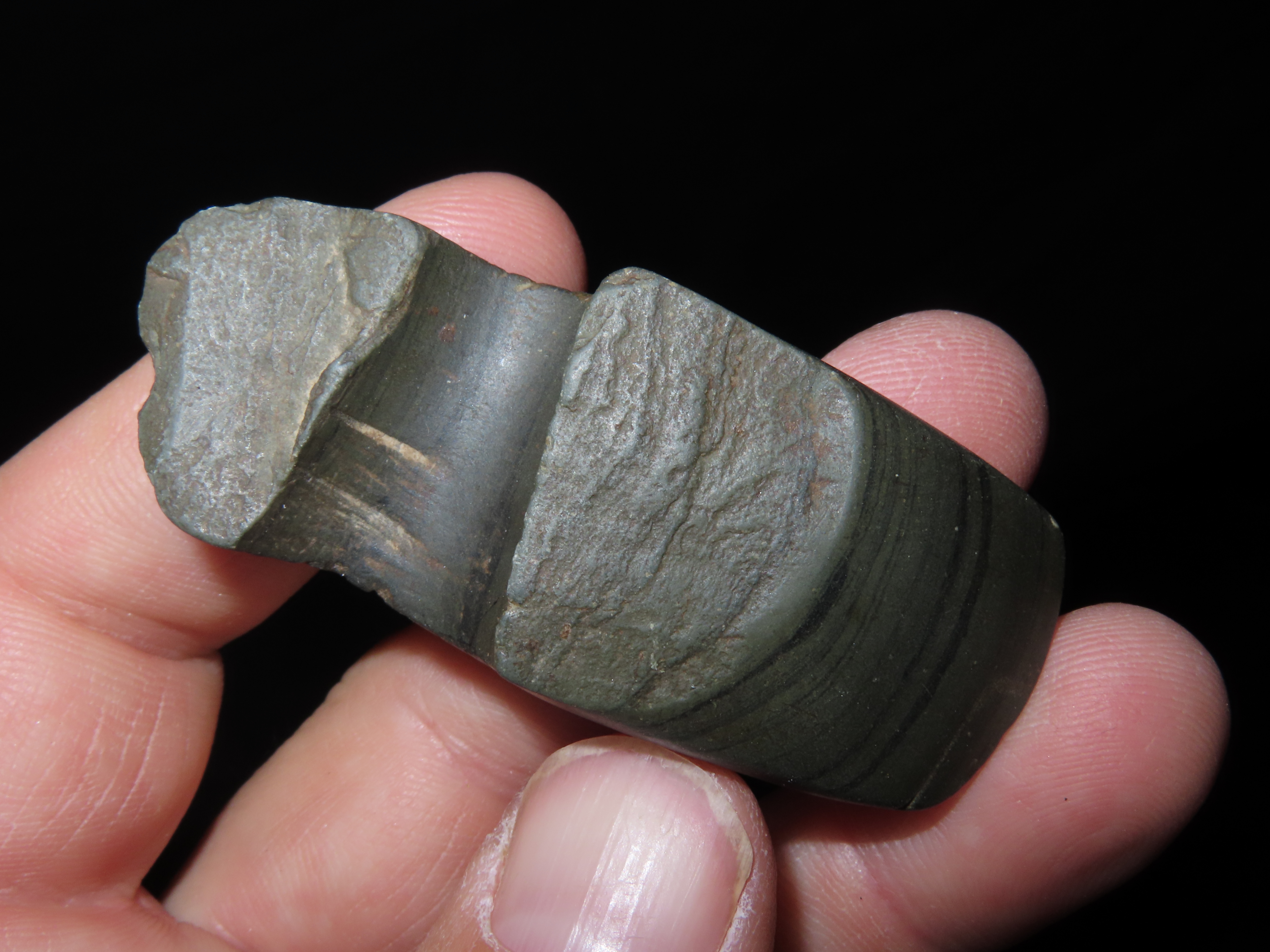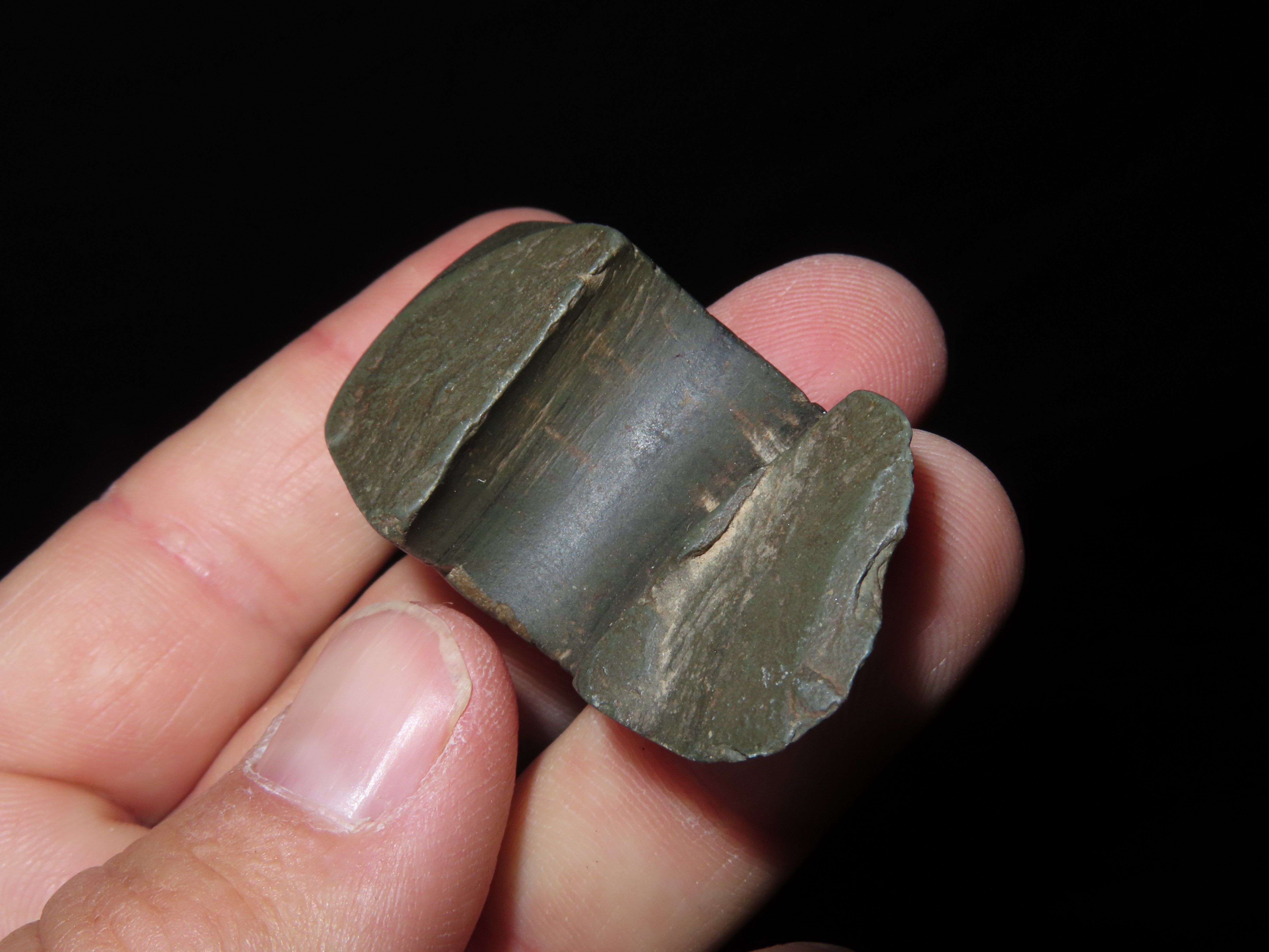 2 3/8″ Heartbreaker Slate Bannerstone, tally marks around hole, Ex Steve McCabe, Sullivan Co., Missouri