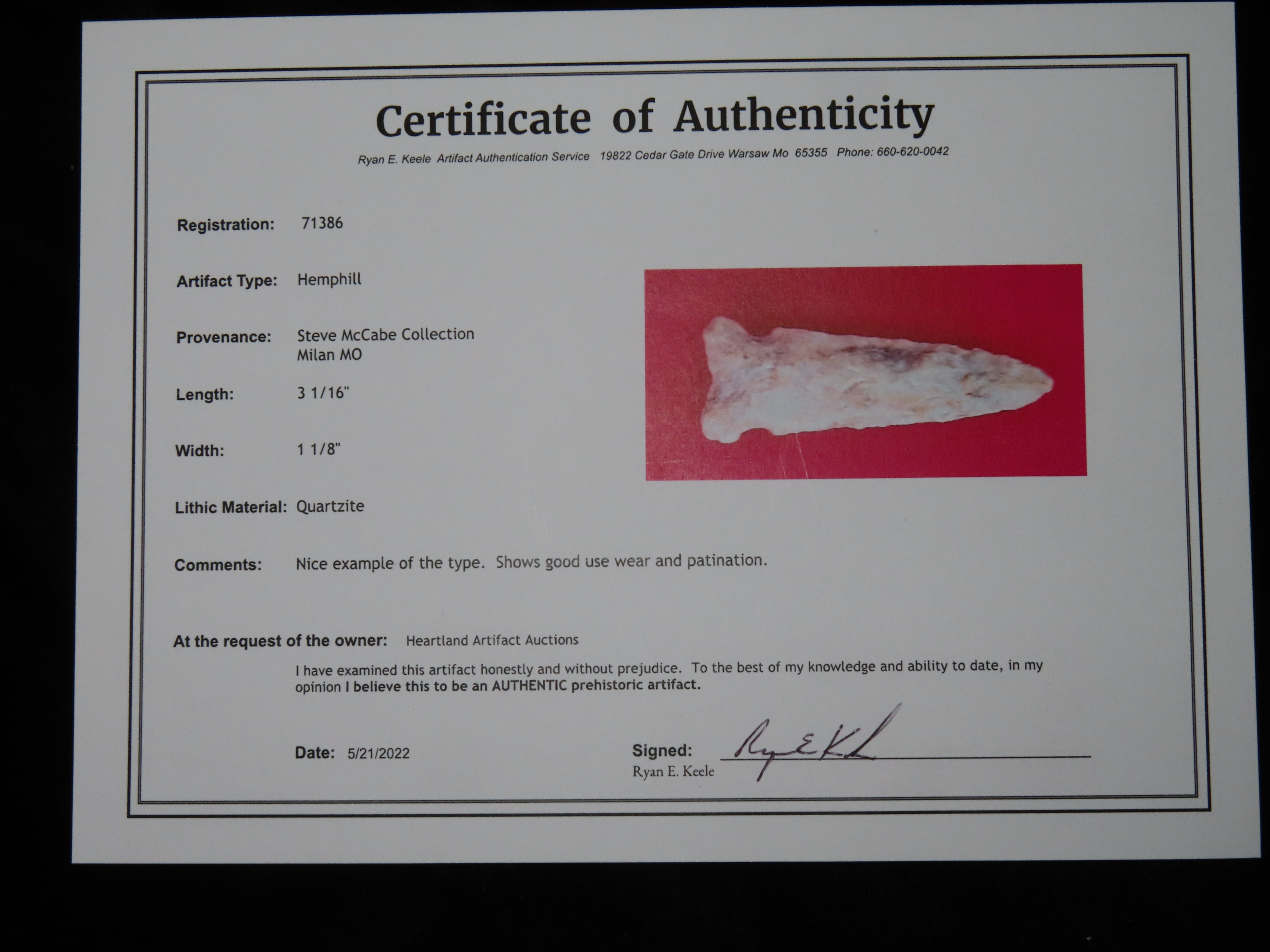 3 1/16″ Excellent Patina Hemphill, Keele COA, Ex Steve McCabe Collection, Sullivan Co., Missouri
