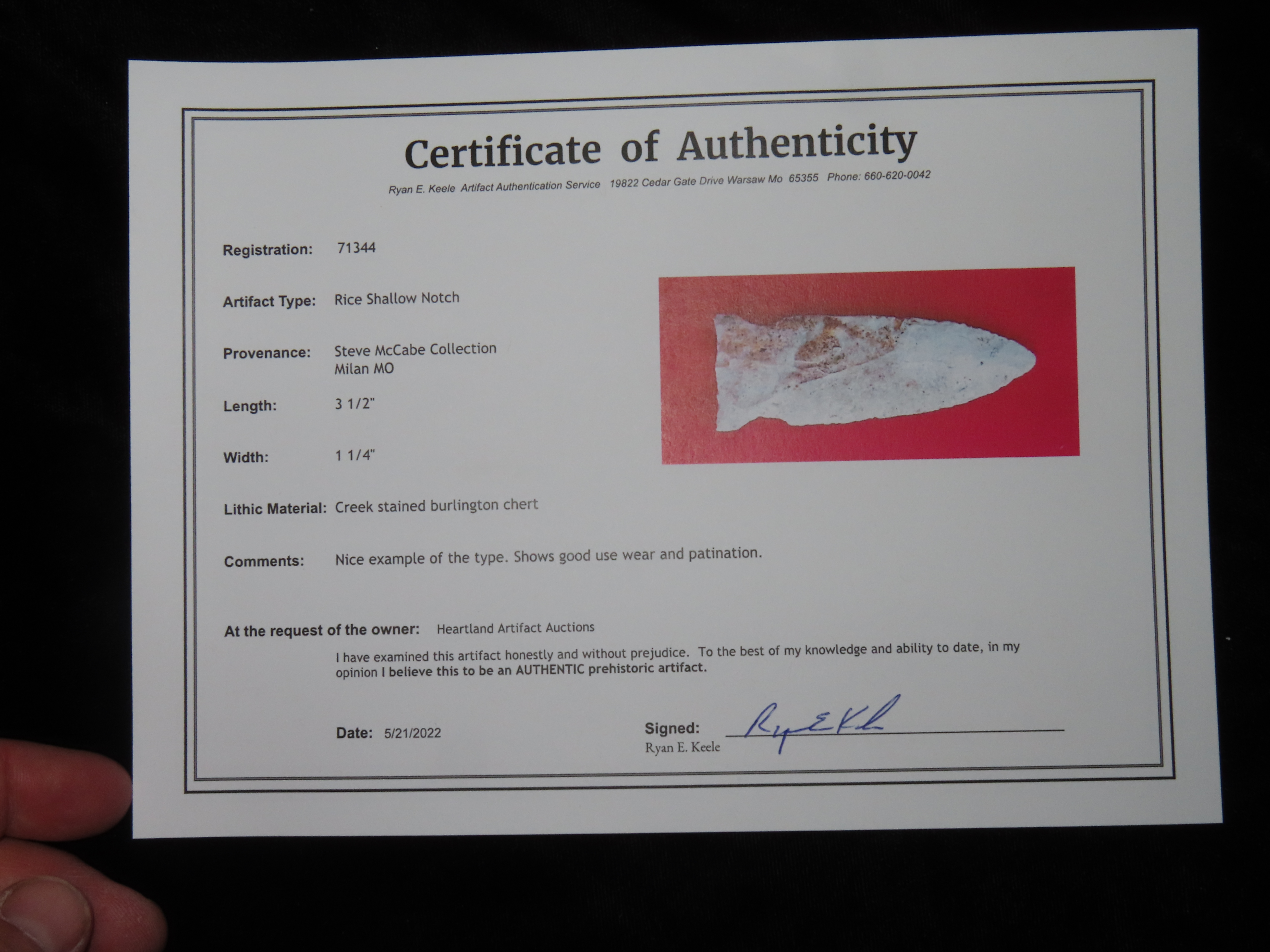 3 1/2″ Rice Shallow Notch, Keele COA, Ex Steve McCabe Collection, Sullivan Co., Missouri