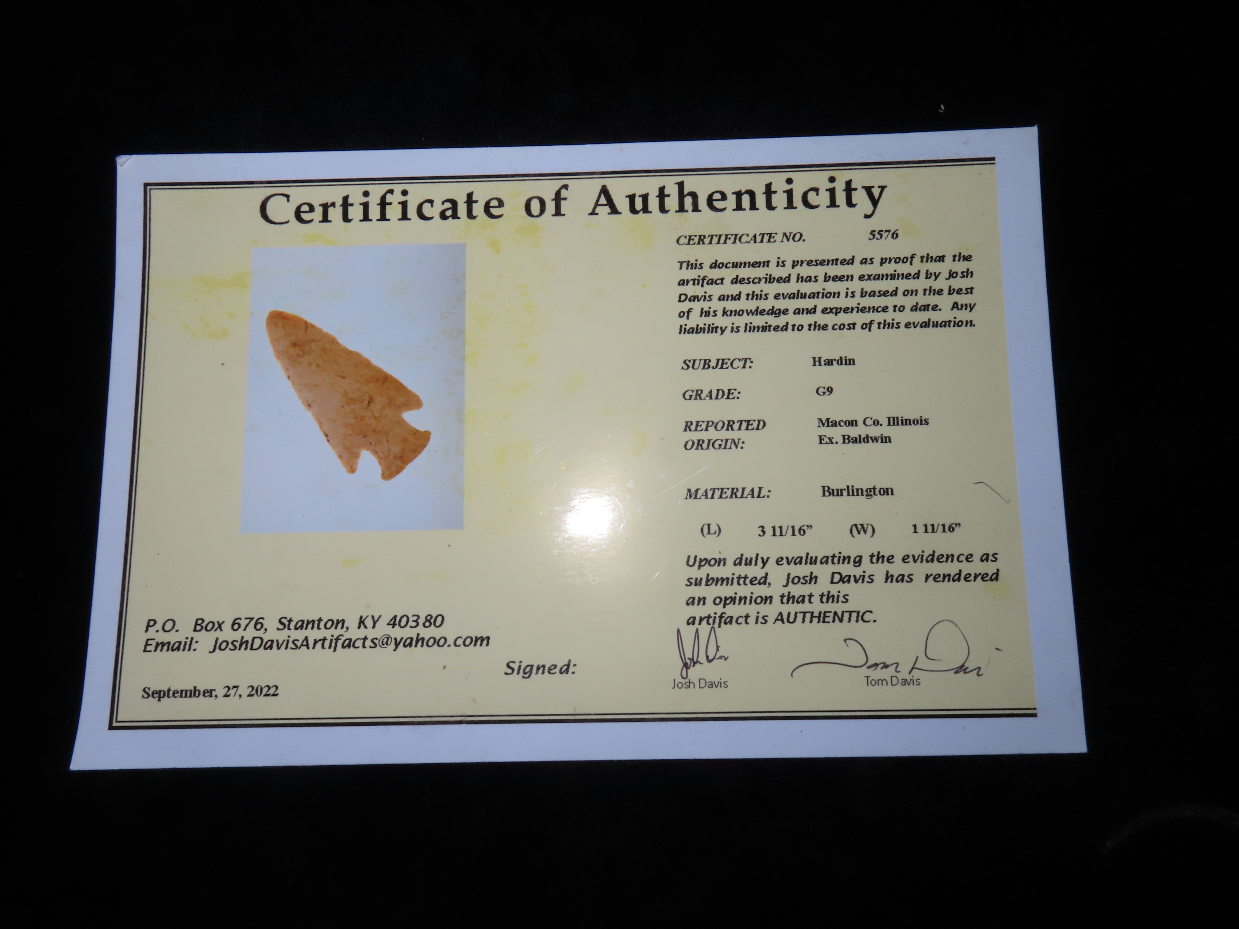 3 11/16″ Hardin, Davis COA, found in Macon Co., Illinois, Ex Baldwin Collection