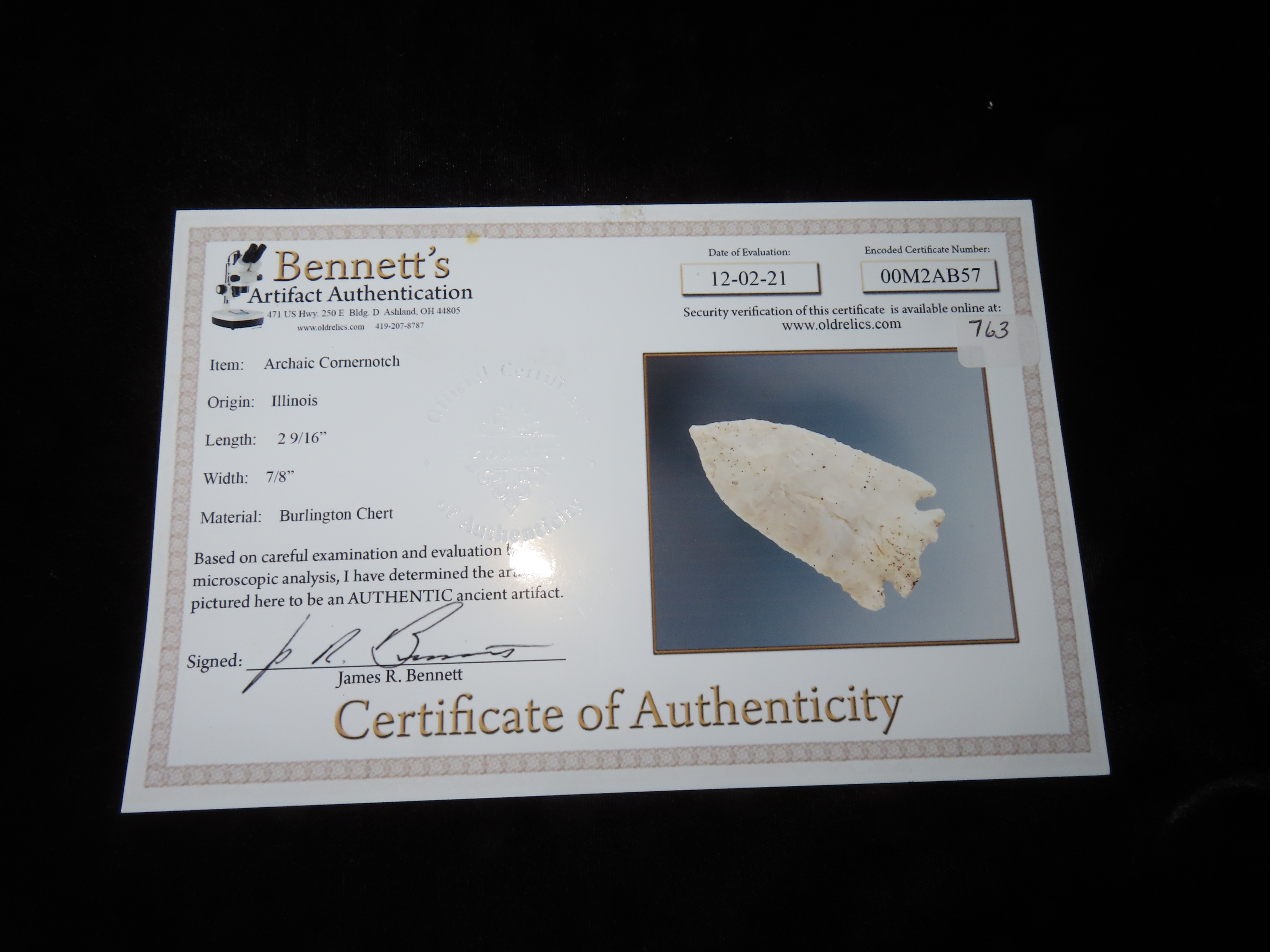 2 9/16″ Archaic Cornernotch, Bennett COA, found in Illinois, made of Burlington Chert