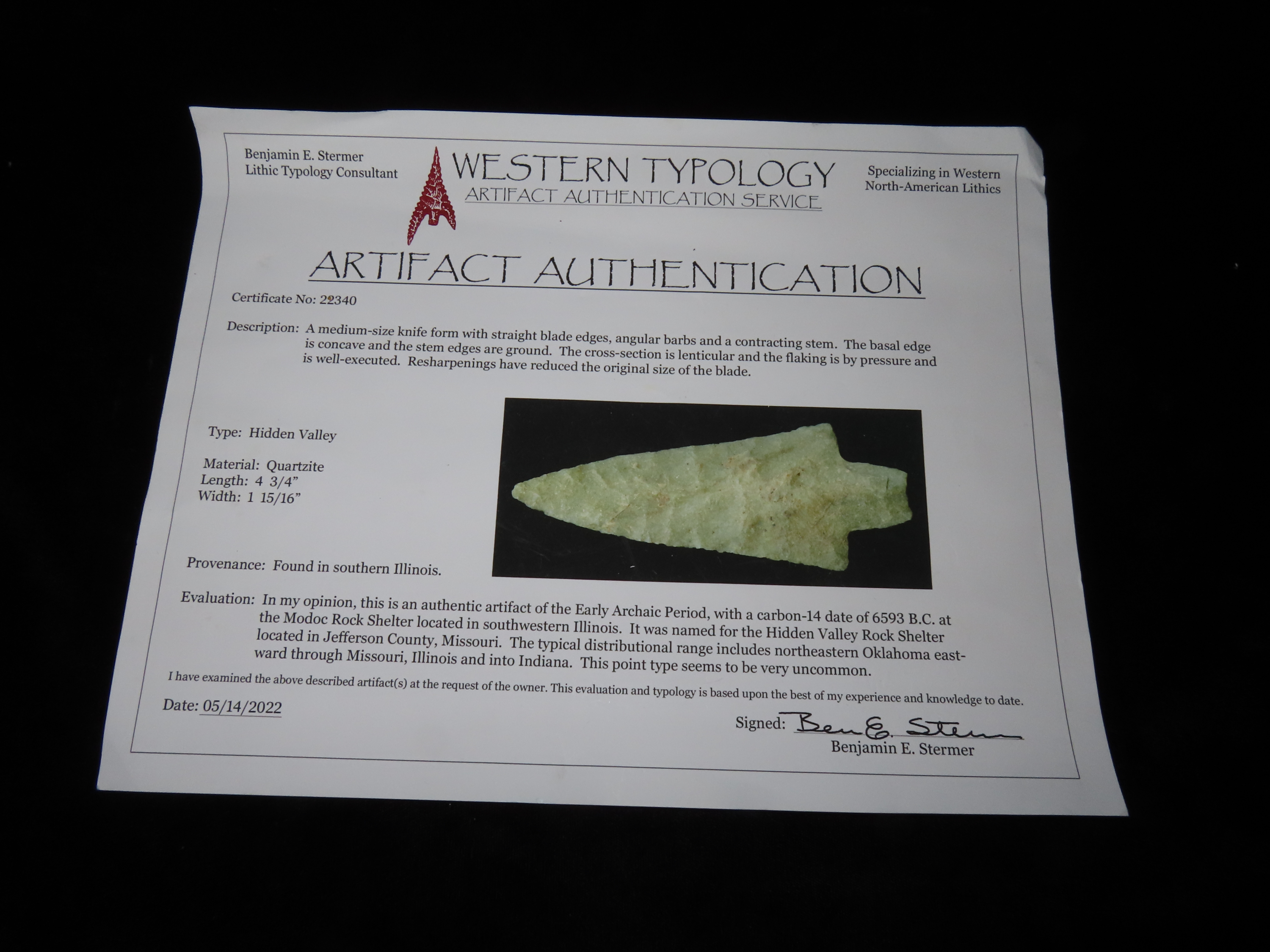 4 3/4″ Hidden Valley, Stermer COA, made of Quartzite, found in Southern Illinois