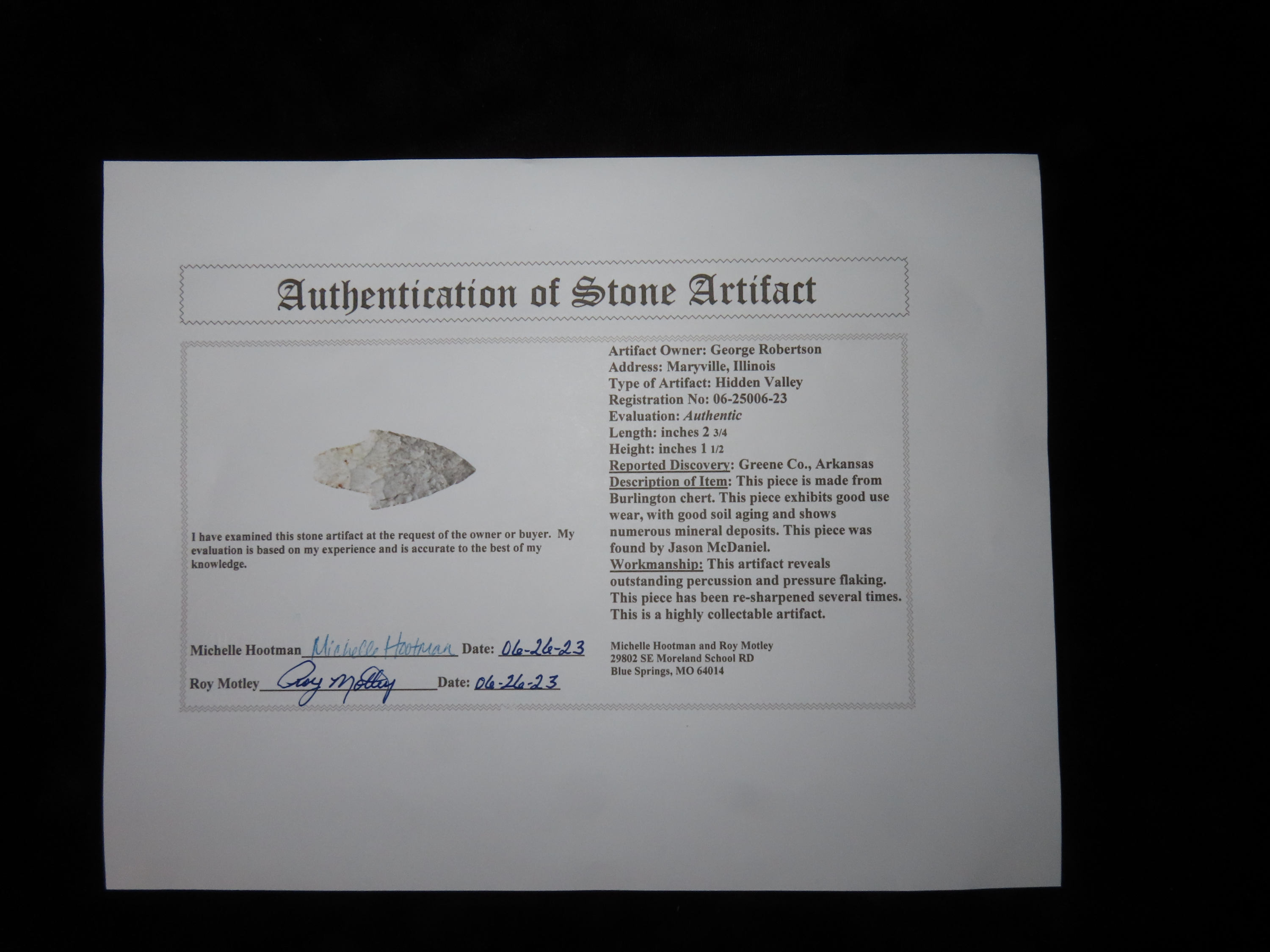 2 3/4″ Hidden Valley, Motley COA Greene Co. ARK, EX George Robertson Coll.