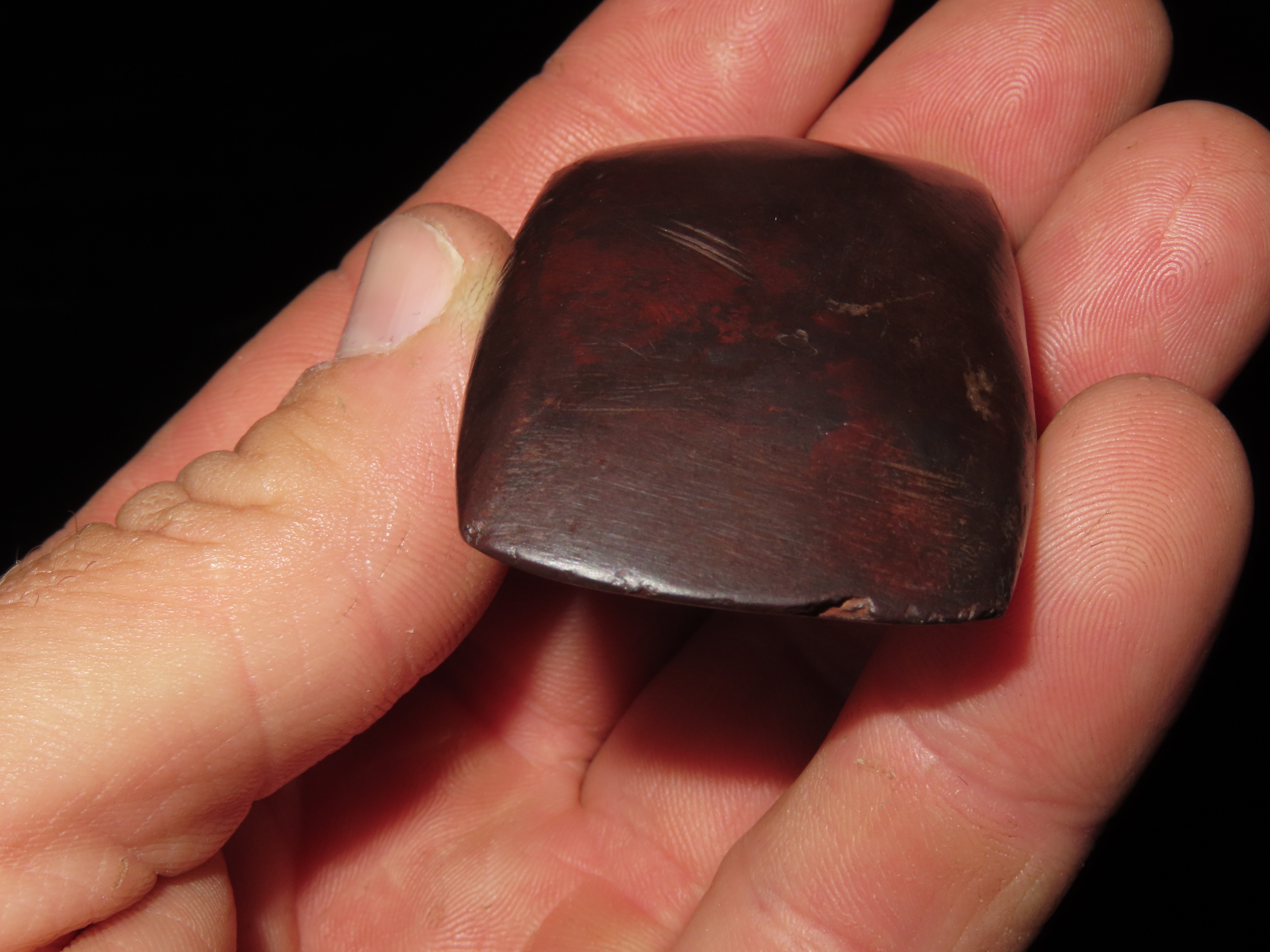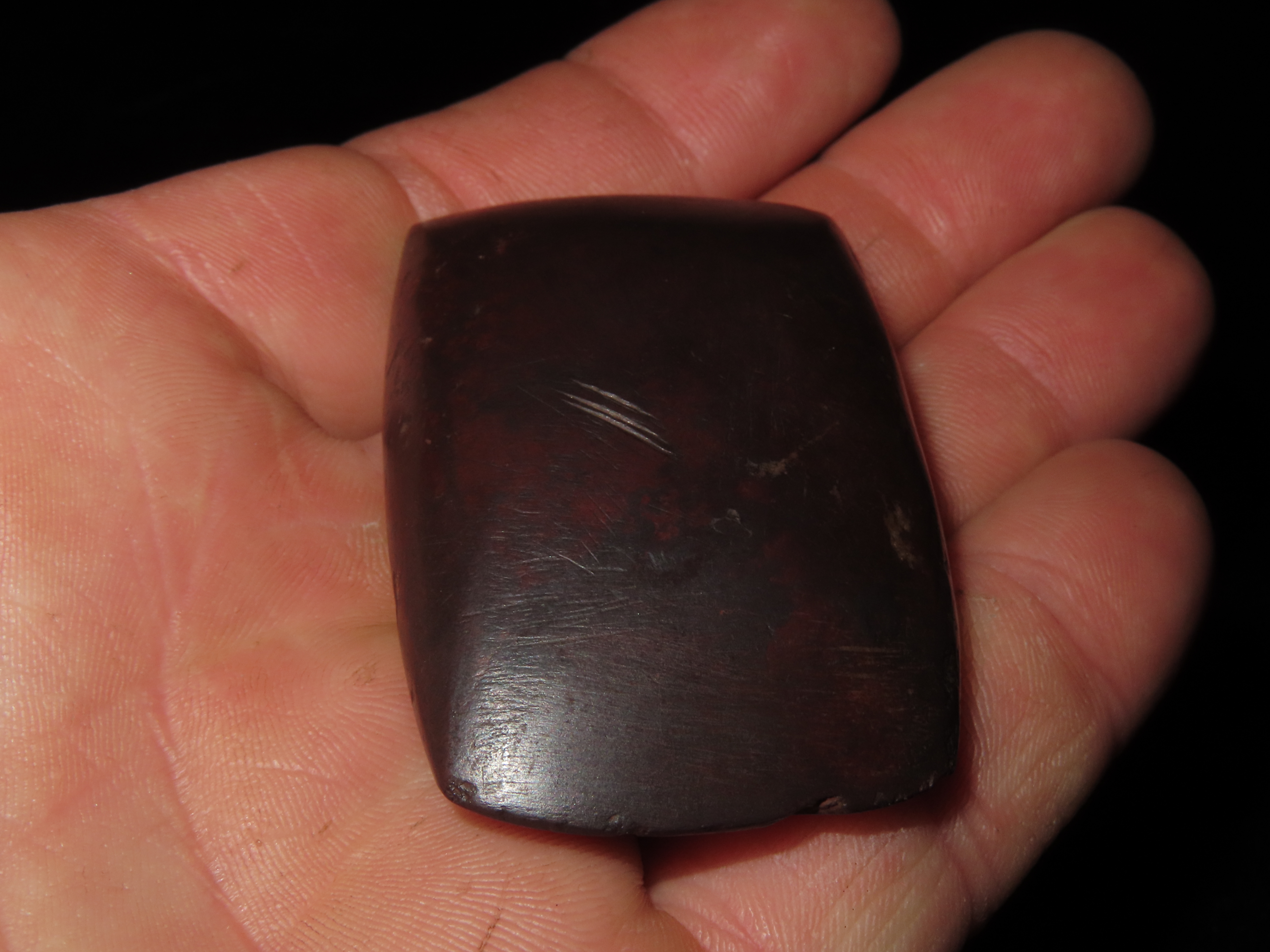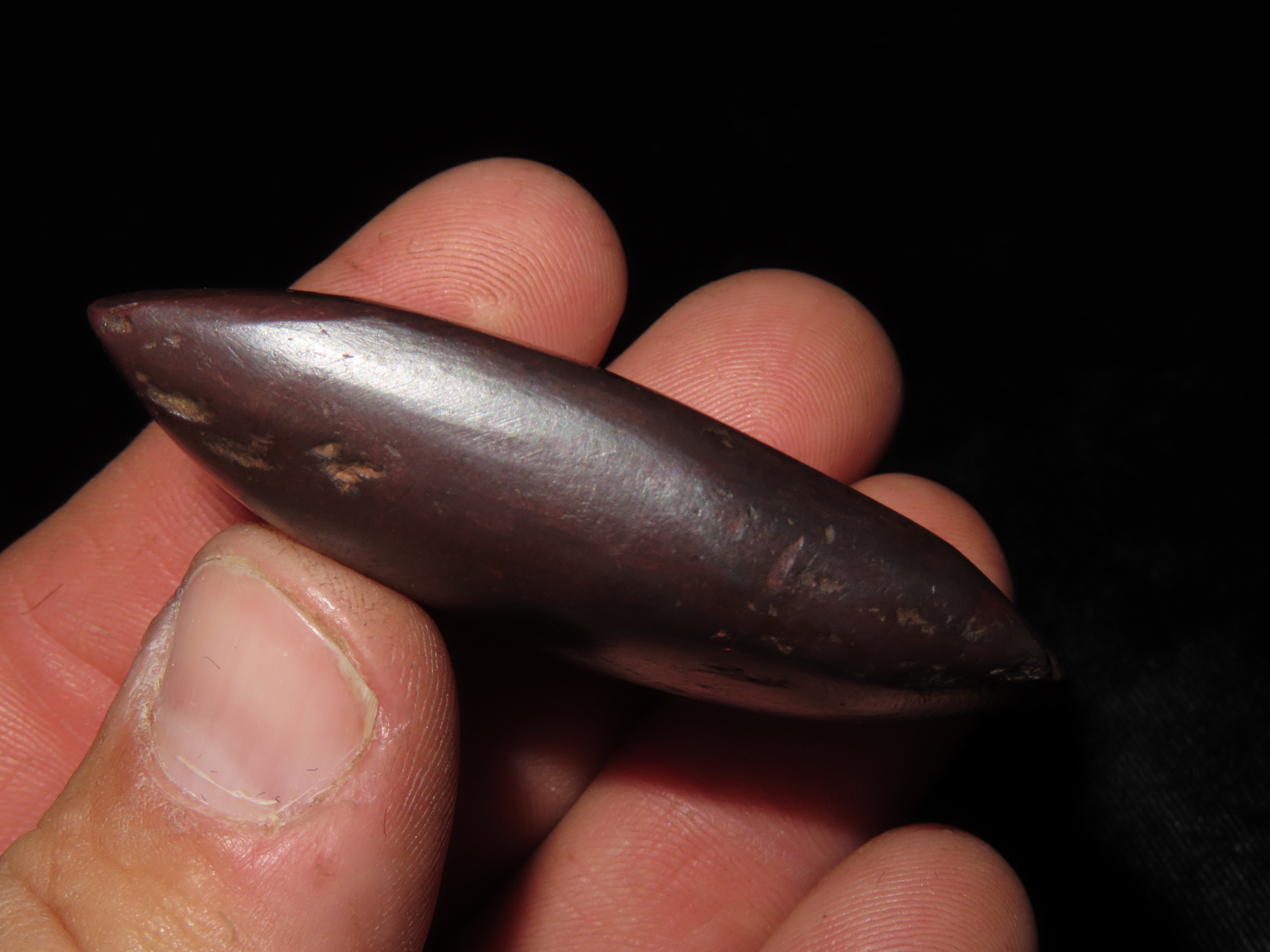 2 1/4″ Double Bitted Hematite Celt, Missouri EX Randall May Coll.