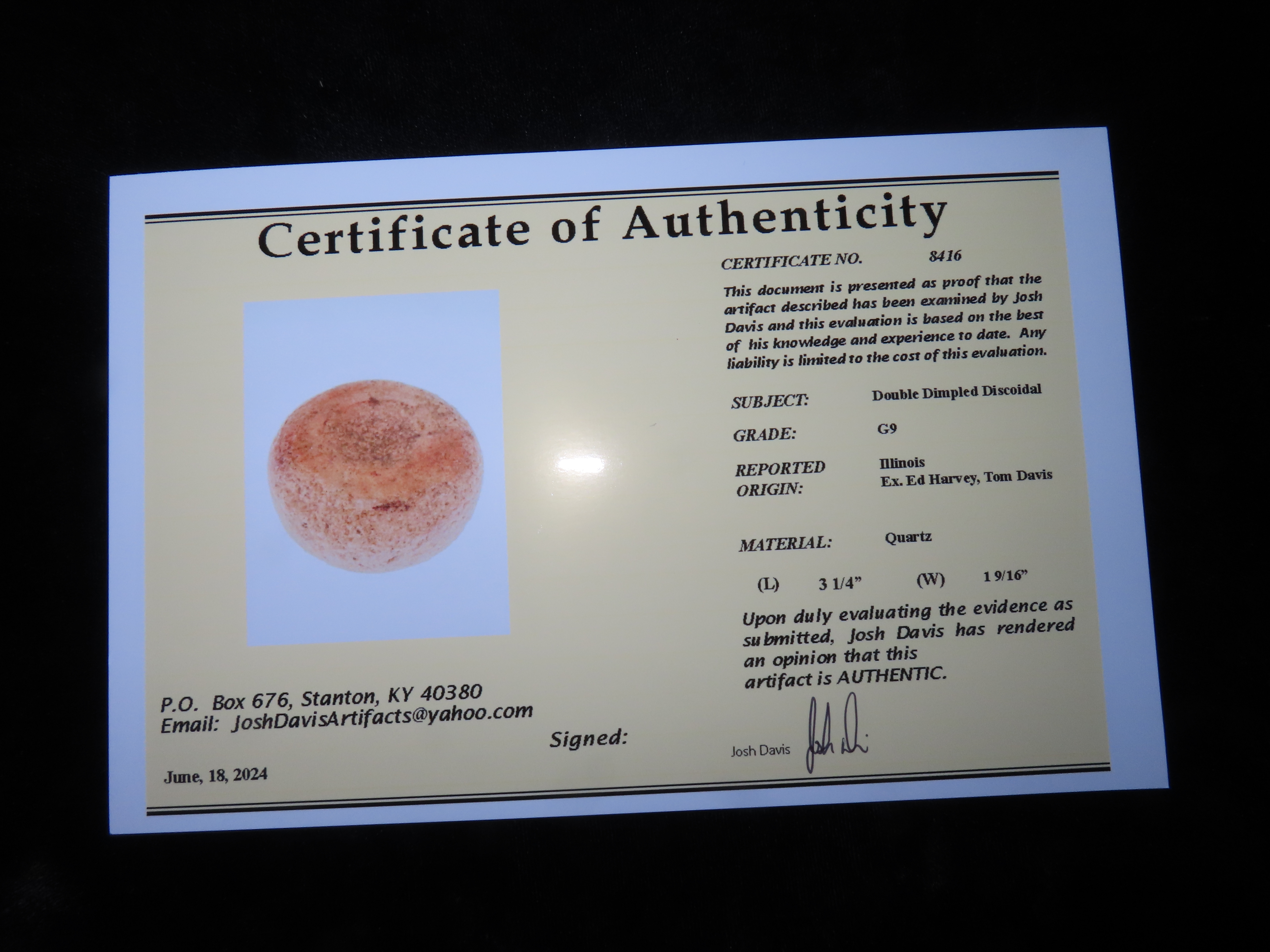 3 1/4″ Double Dimpled Discoidal, Davis COA, found in Illinois, Ex Ed Harvey, Ex Tom Davis Collections, Ex Josh Davis Collection