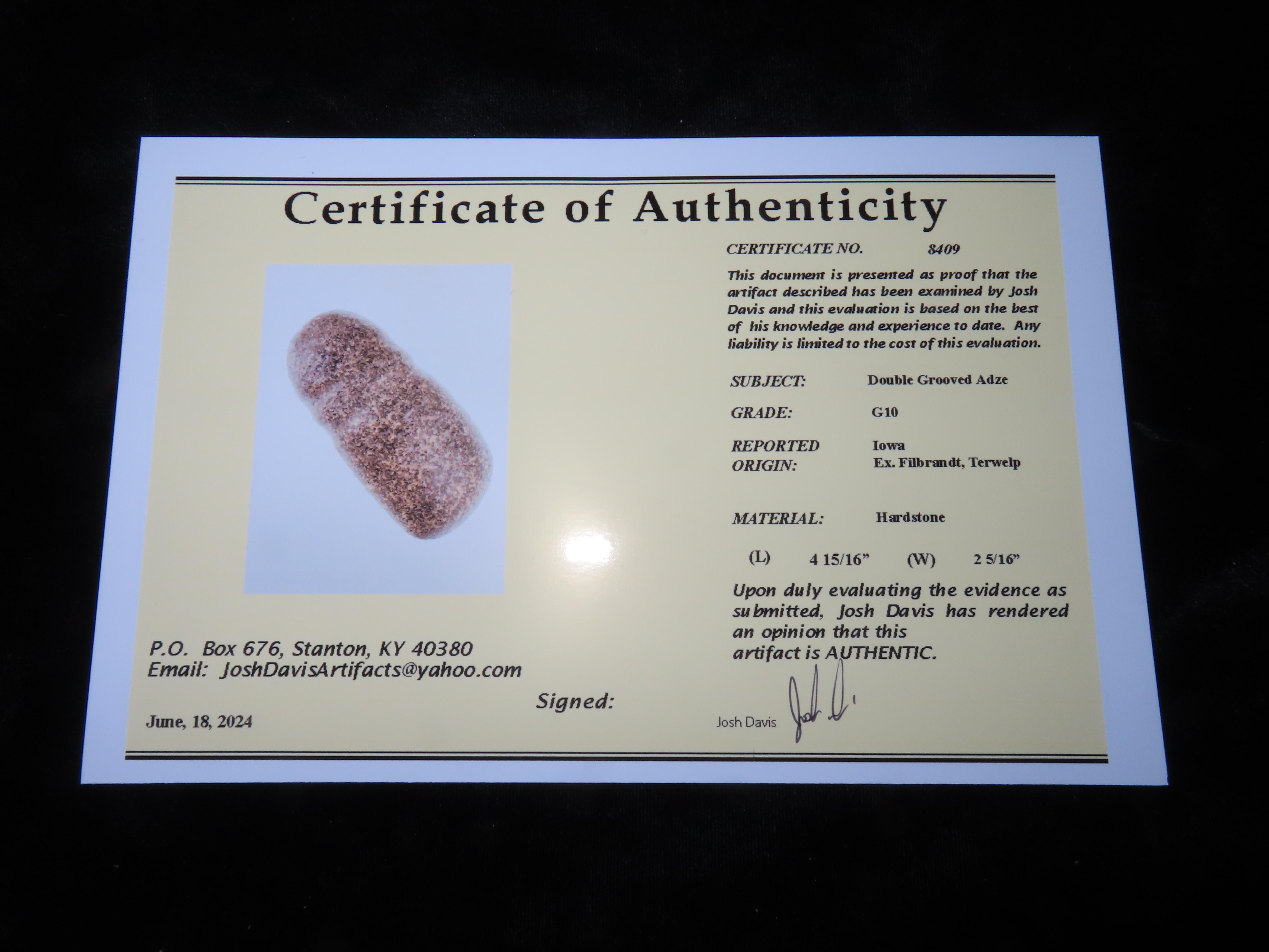 4 15/16″ Double Groove Adze, Davis COA, found in Iowa, Ex Filbrandt, Ex Terwelp Collections, Ex Josh Davis Collection