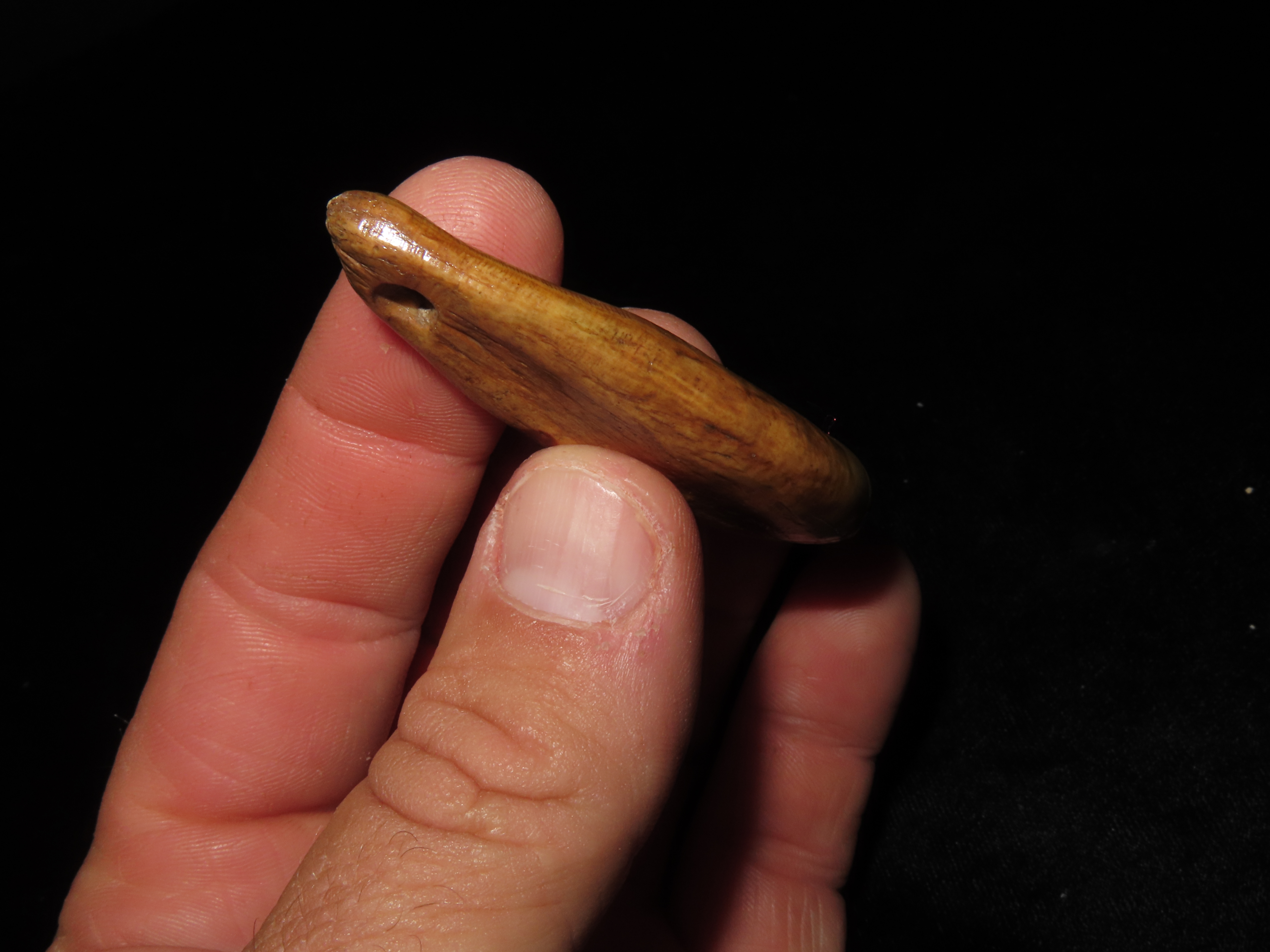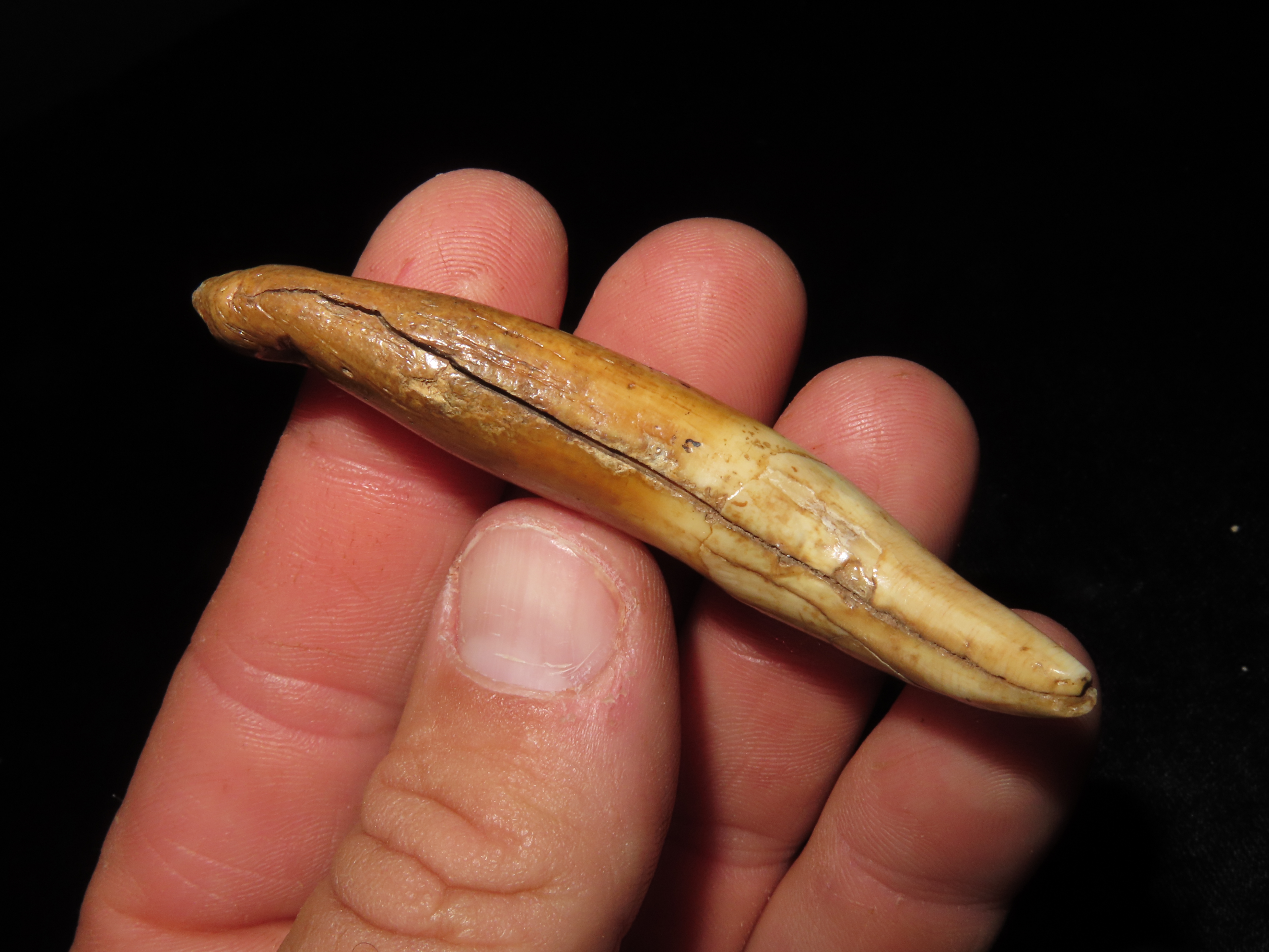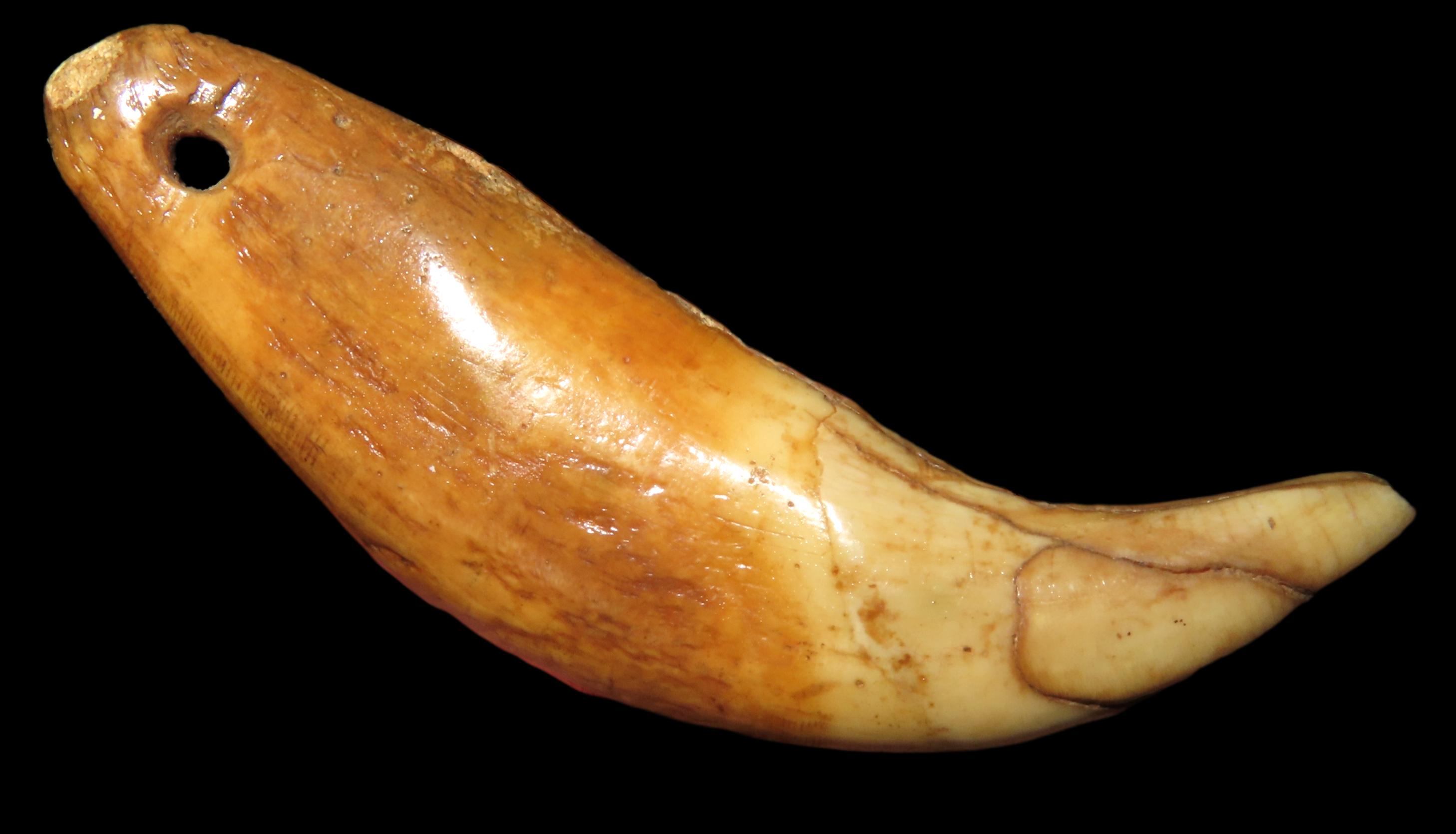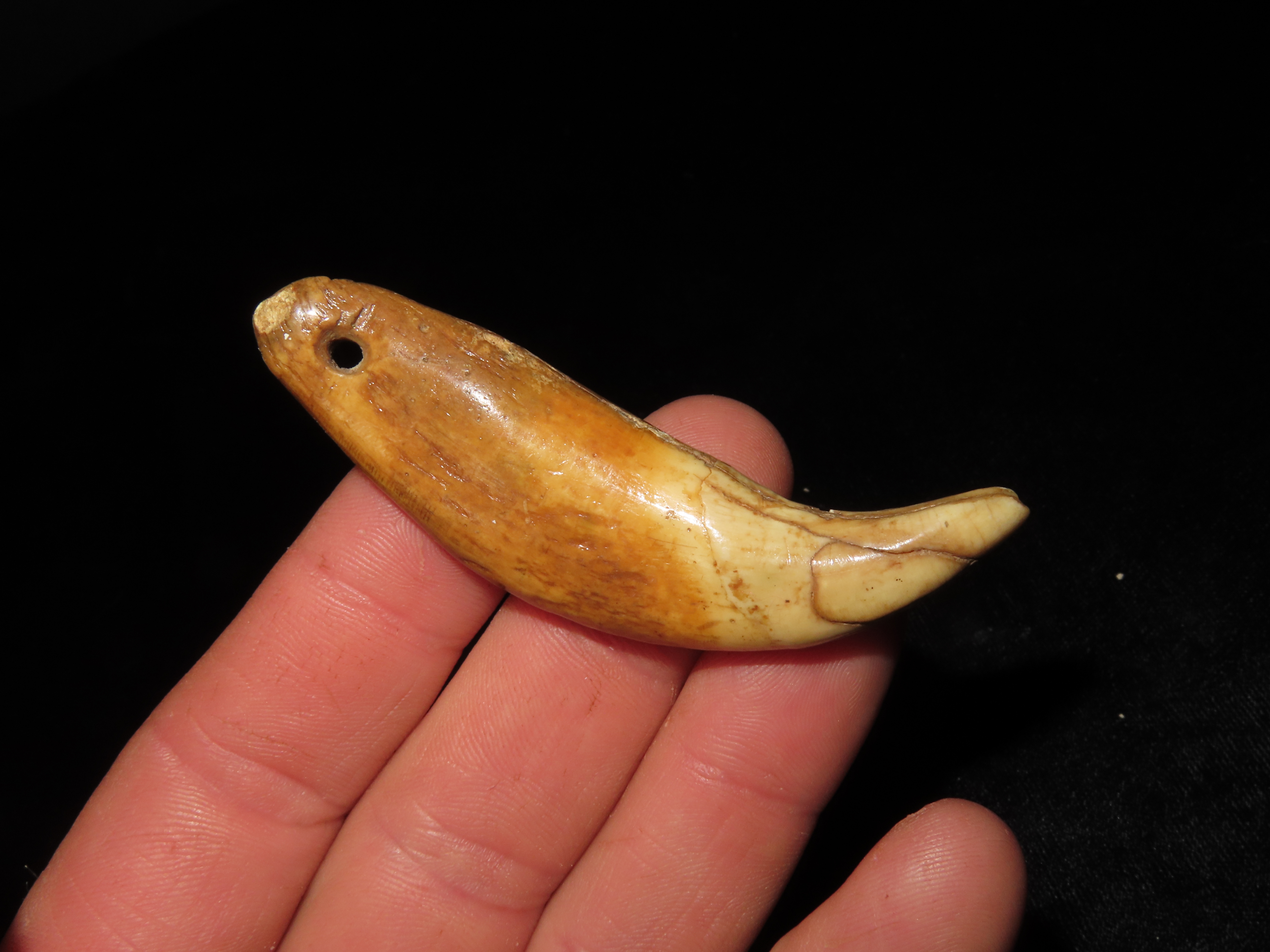 2 3/4″ Drilled Bear Tooth Pendant, found in Illinois, Ex Donny Johns Collection