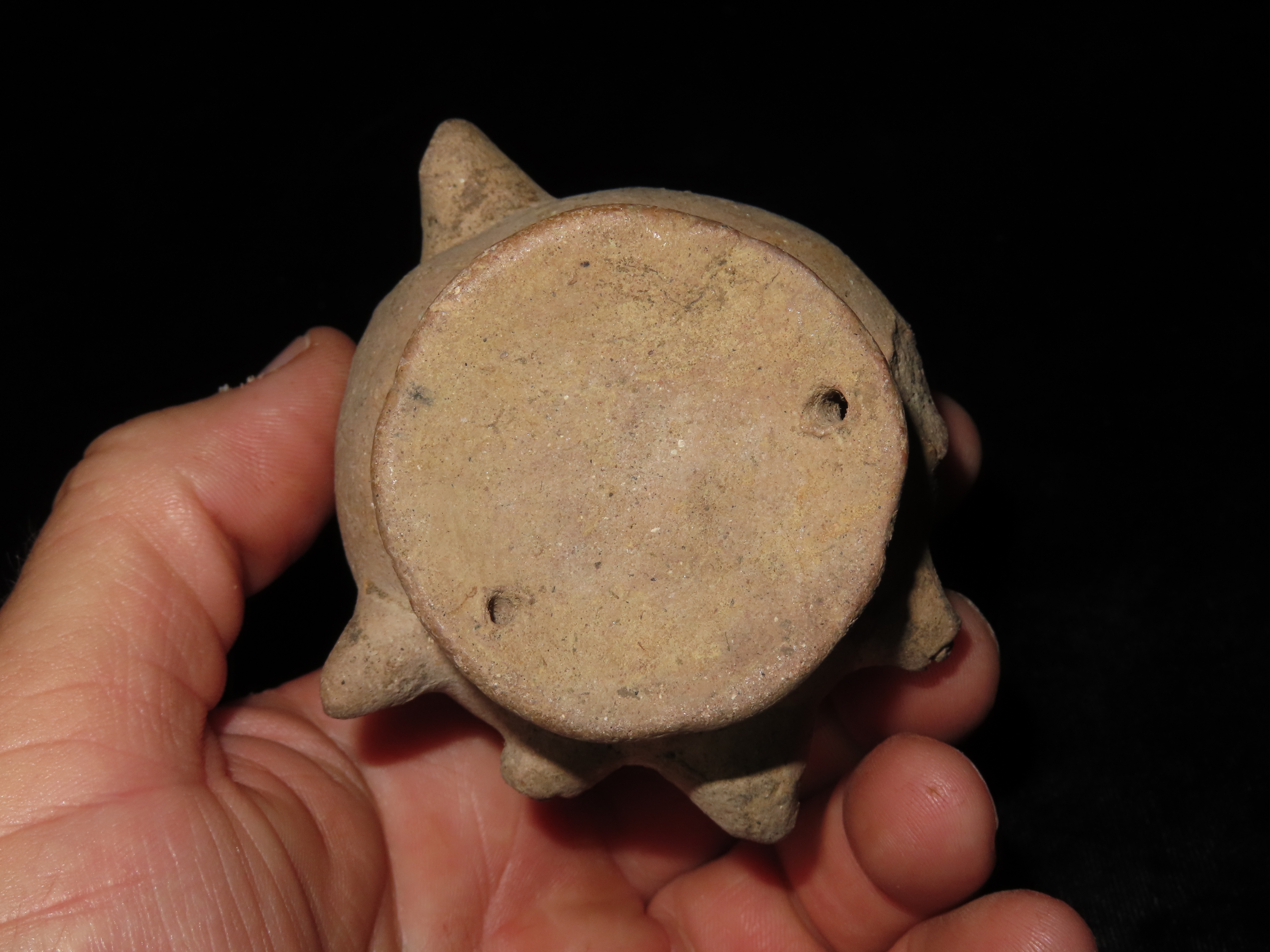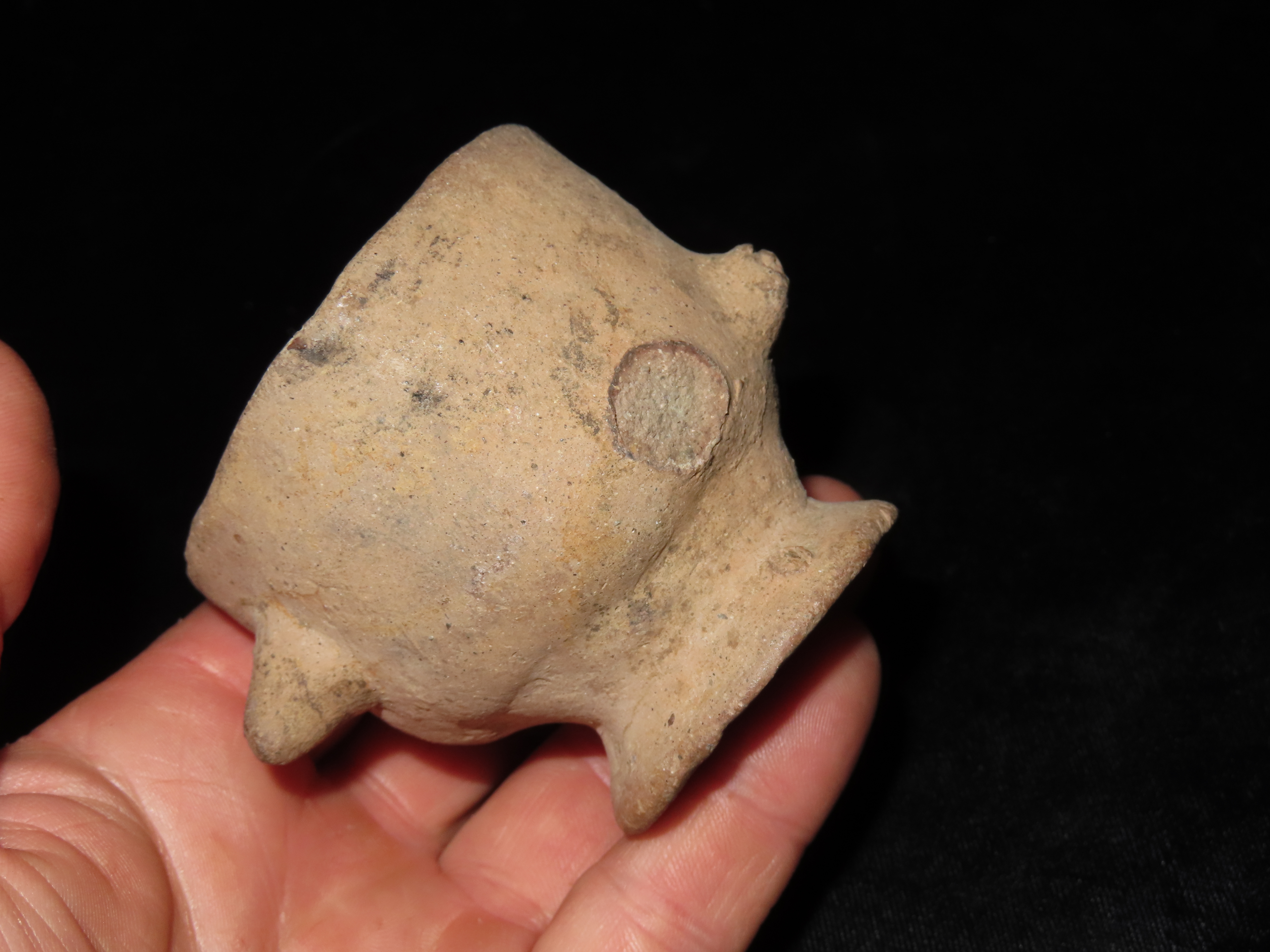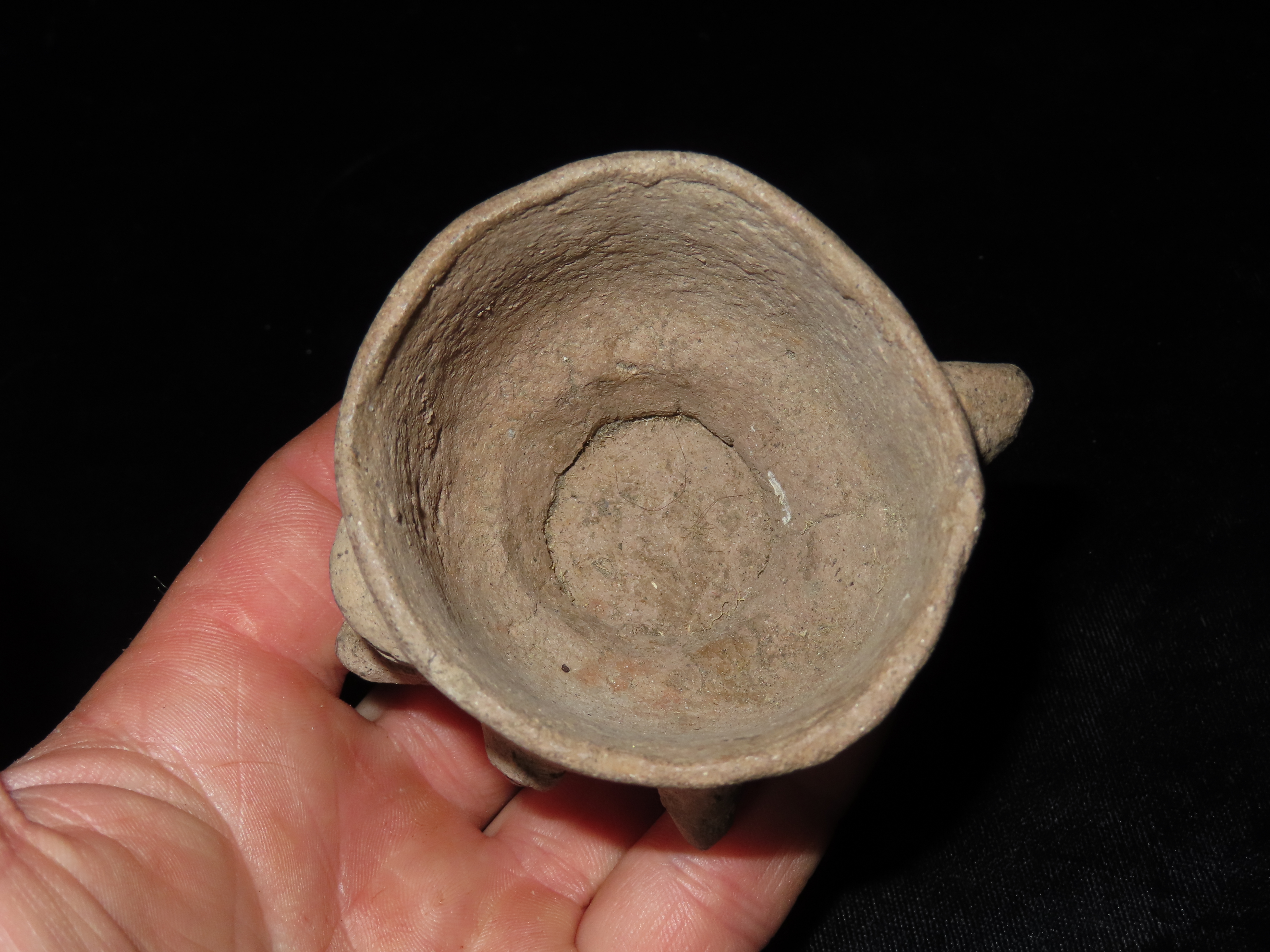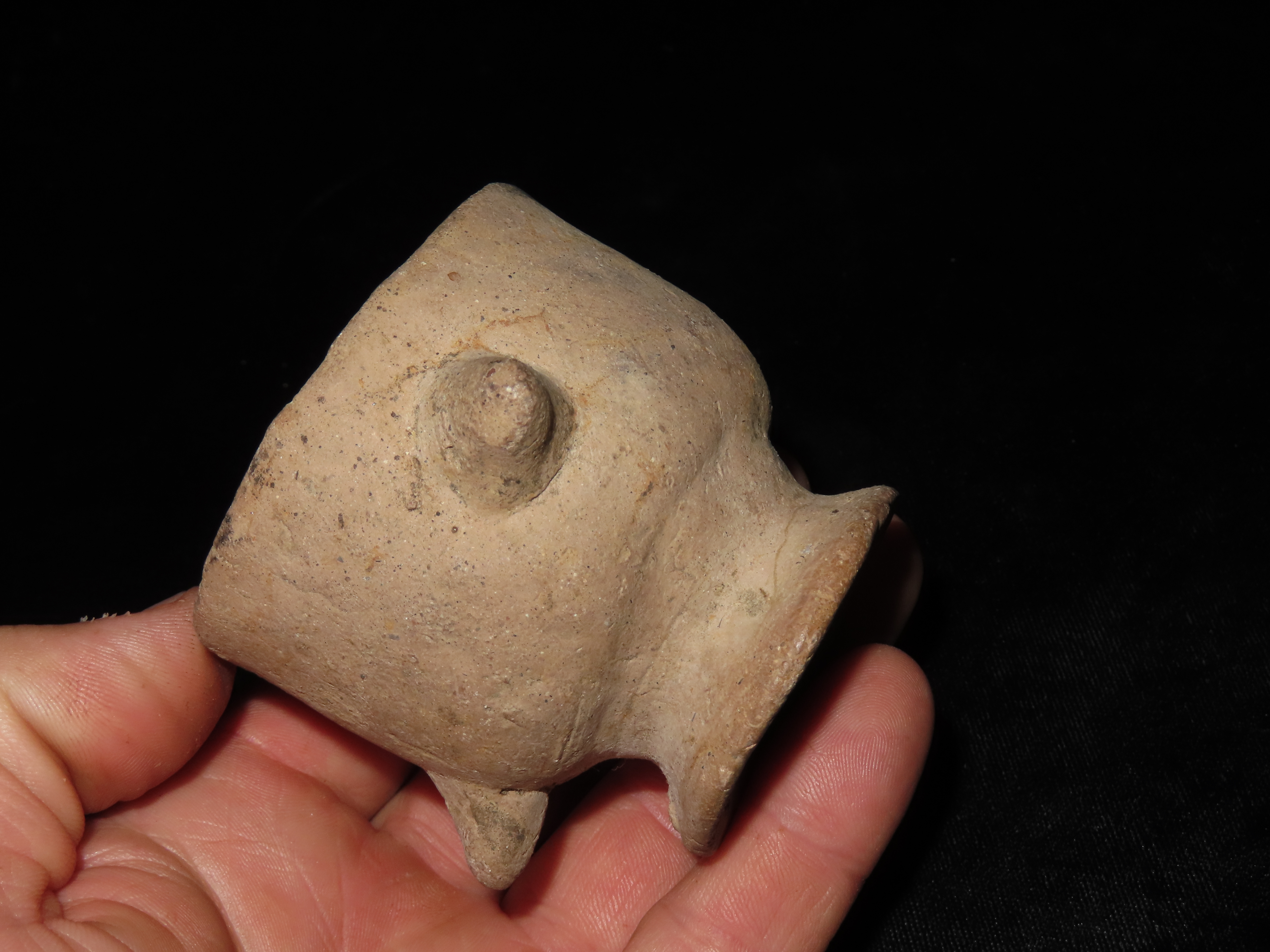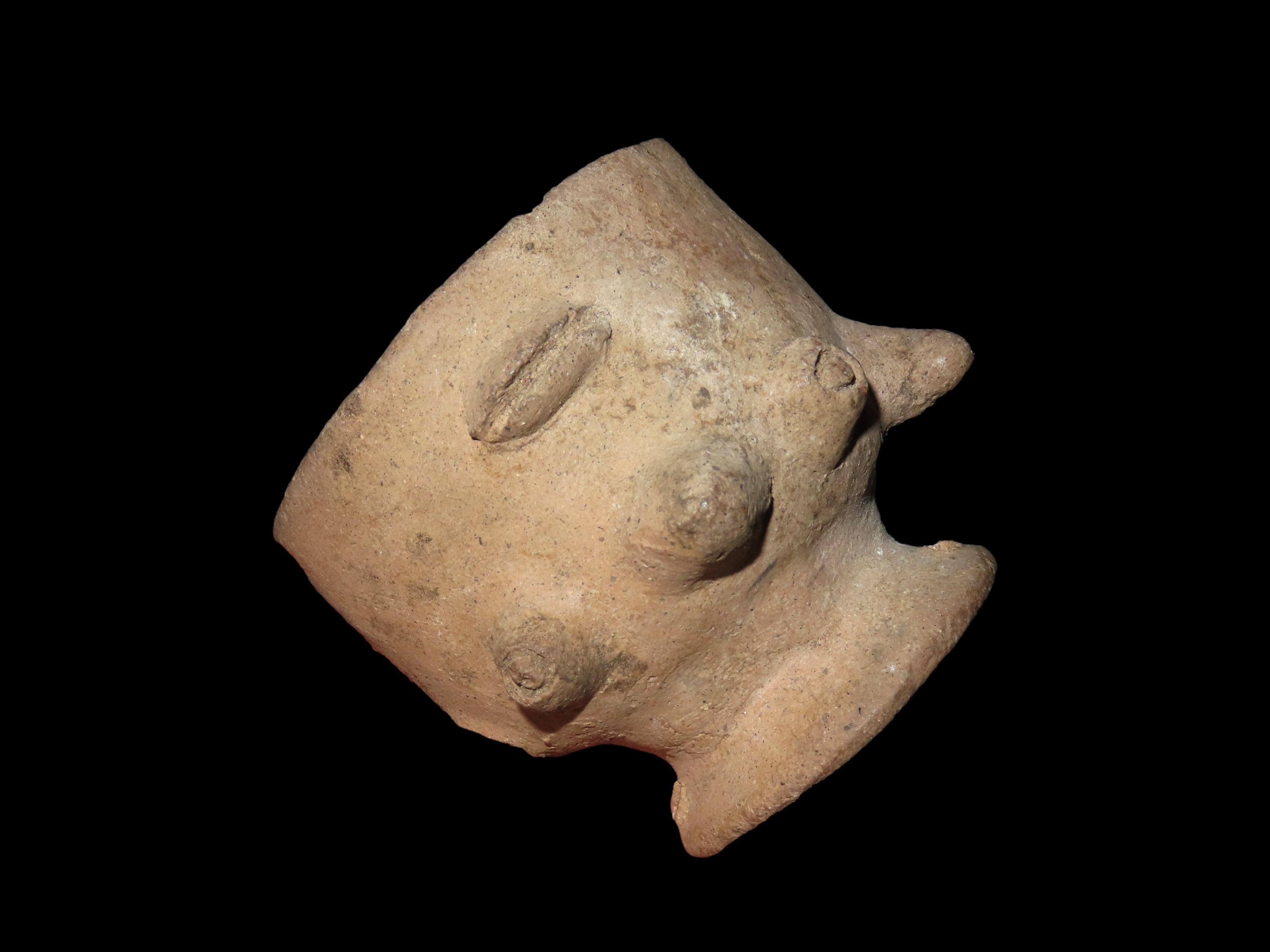 2 5/8″ x 3 3/4″ Pre-Colombian Upside Down-Faced Head Effigy Pottery Cup/Container, found in South America Ex Ernest Brose Collection