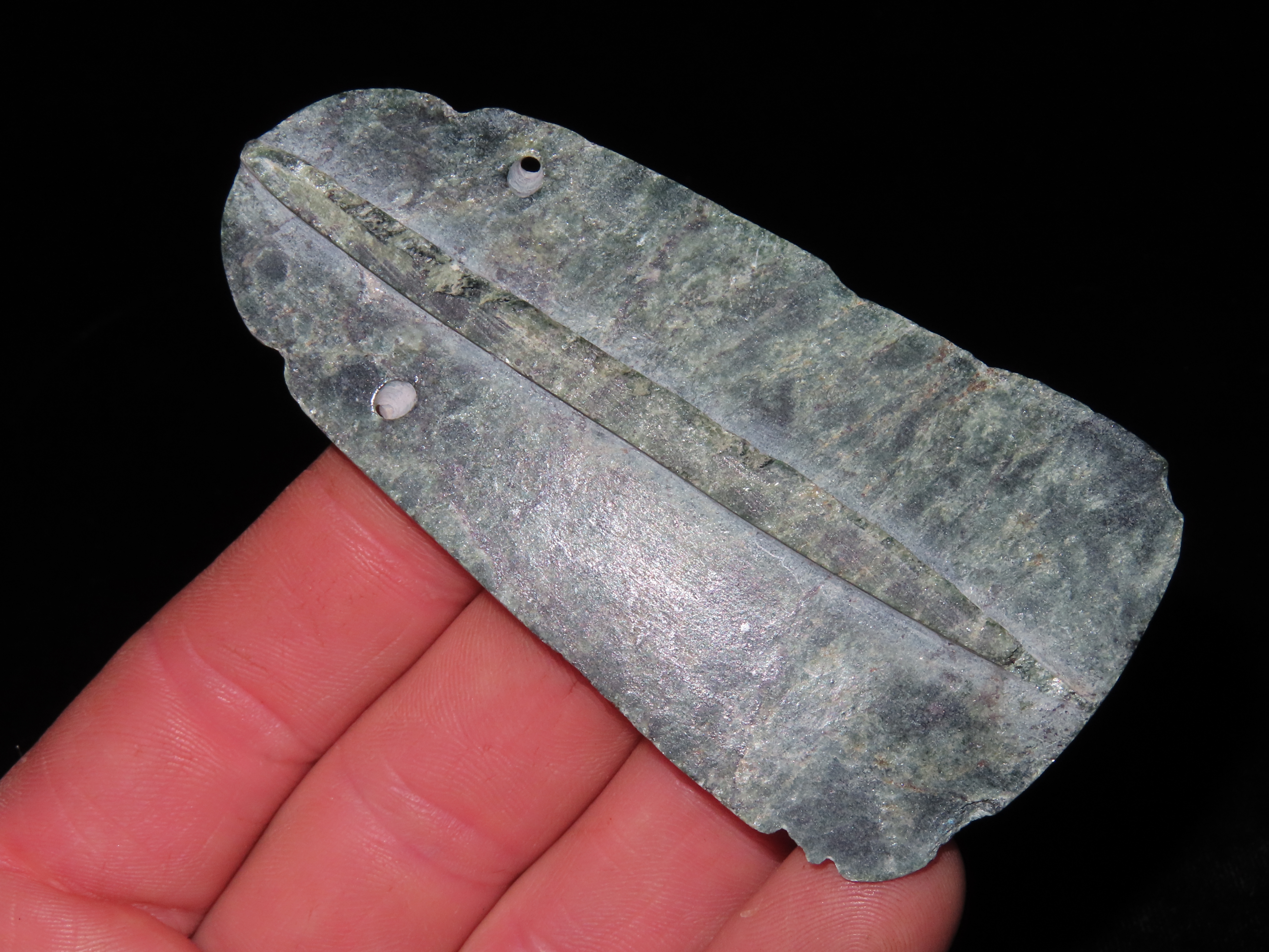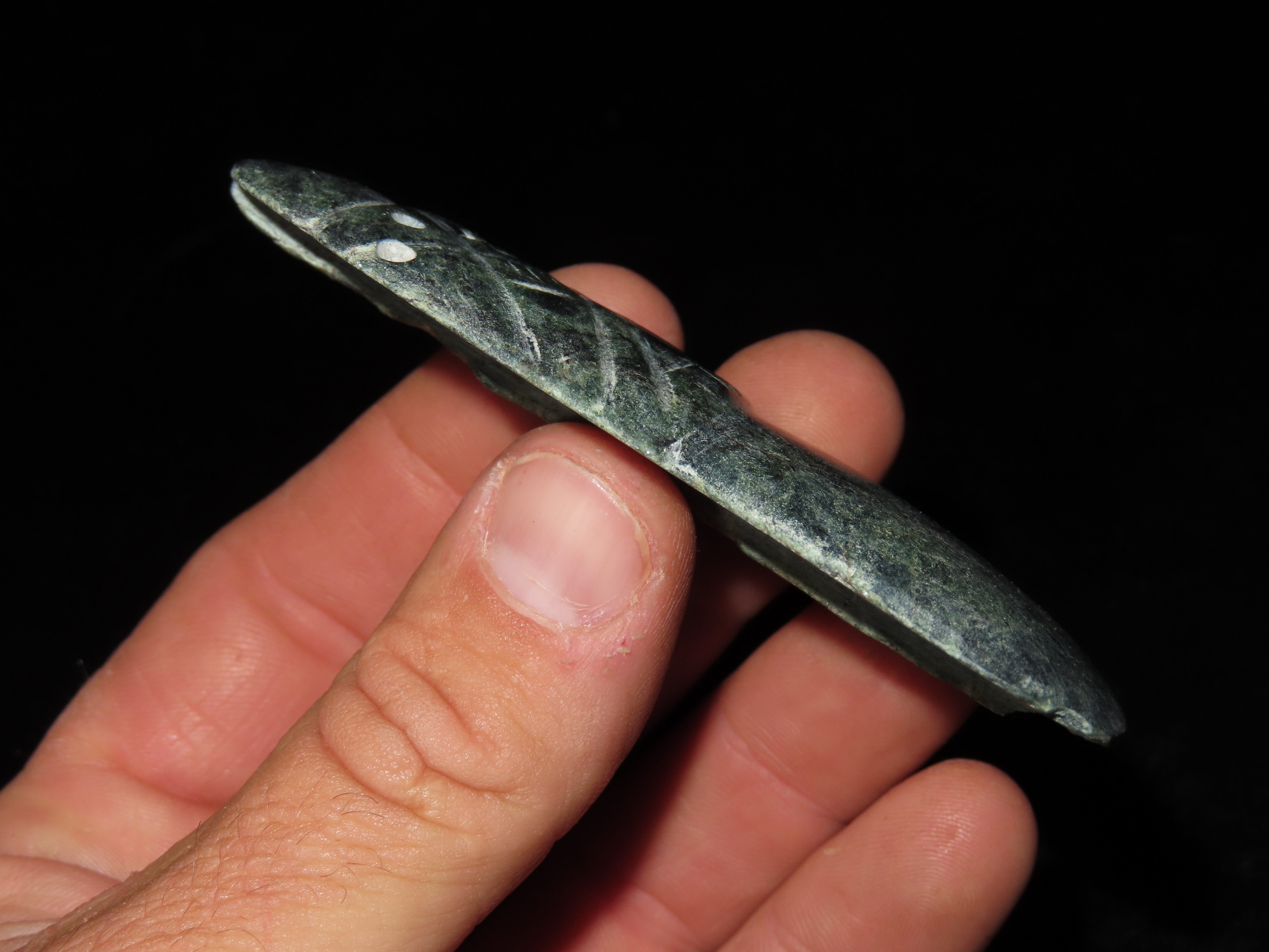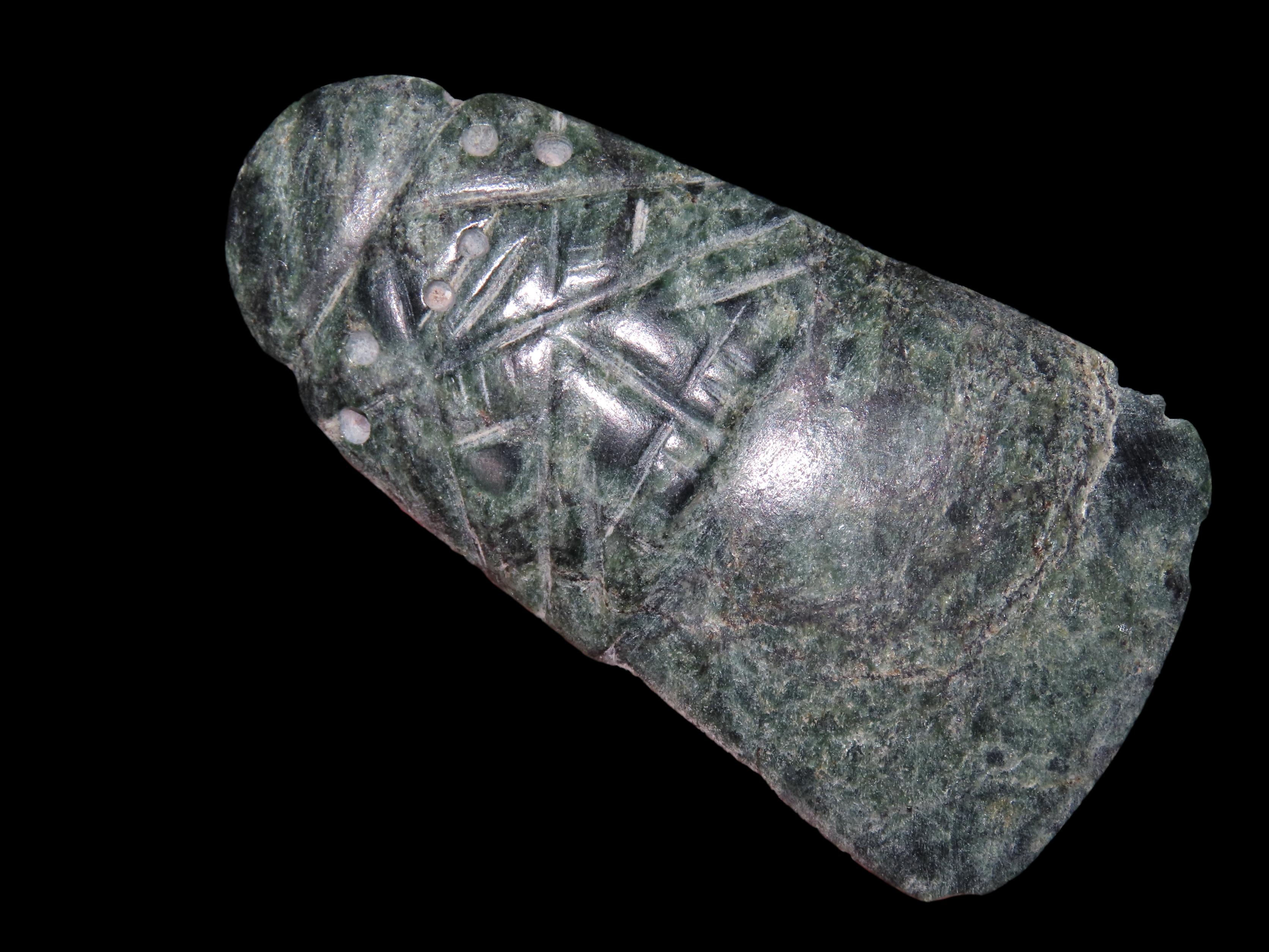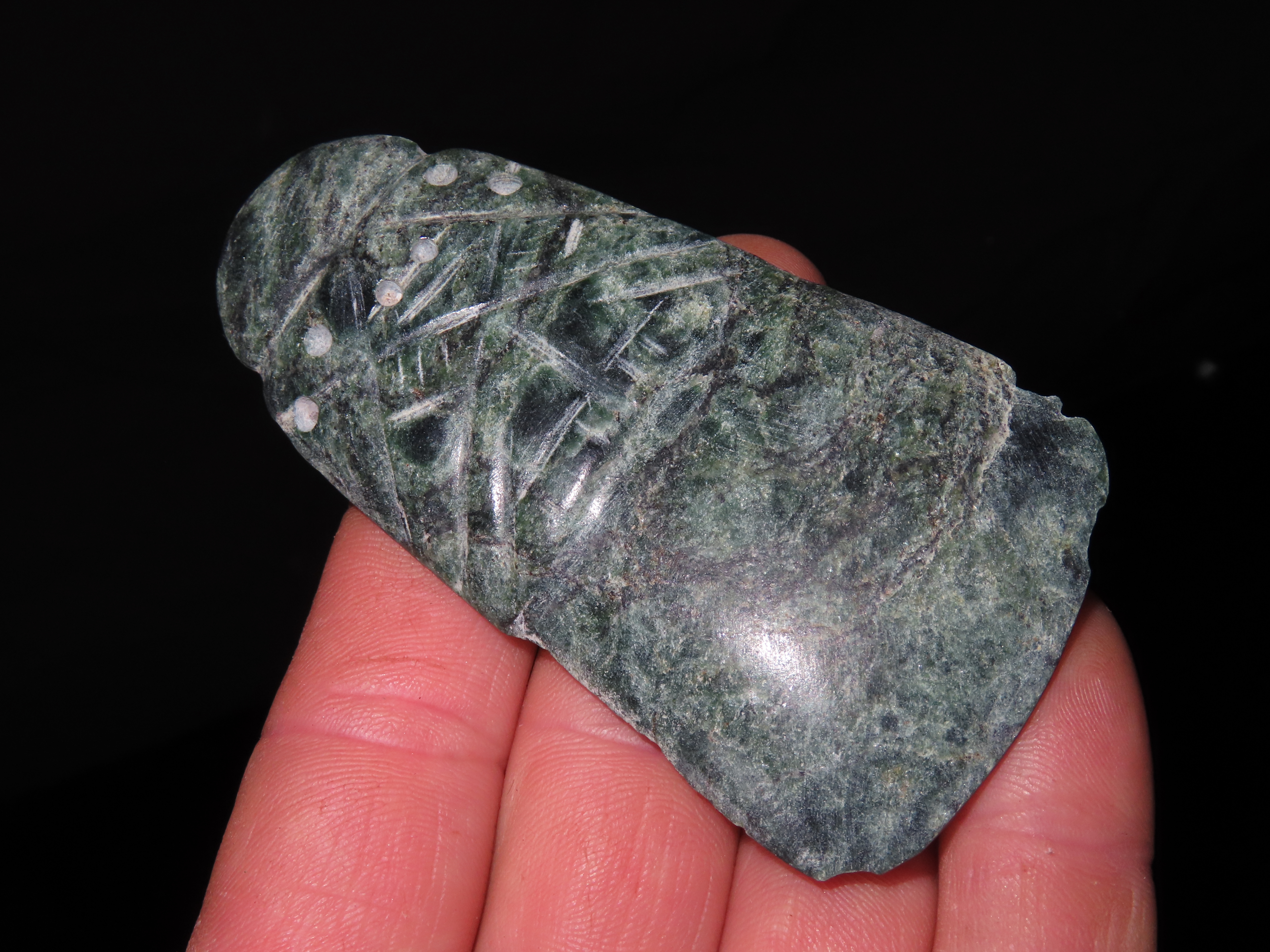 3 1/2" x 1 7/8" Pre-Colombian Jade Axe God Effigy Pendant, found in Costa Rica, ca. 800 BCE to 900 AD, Ex Randall May Collection