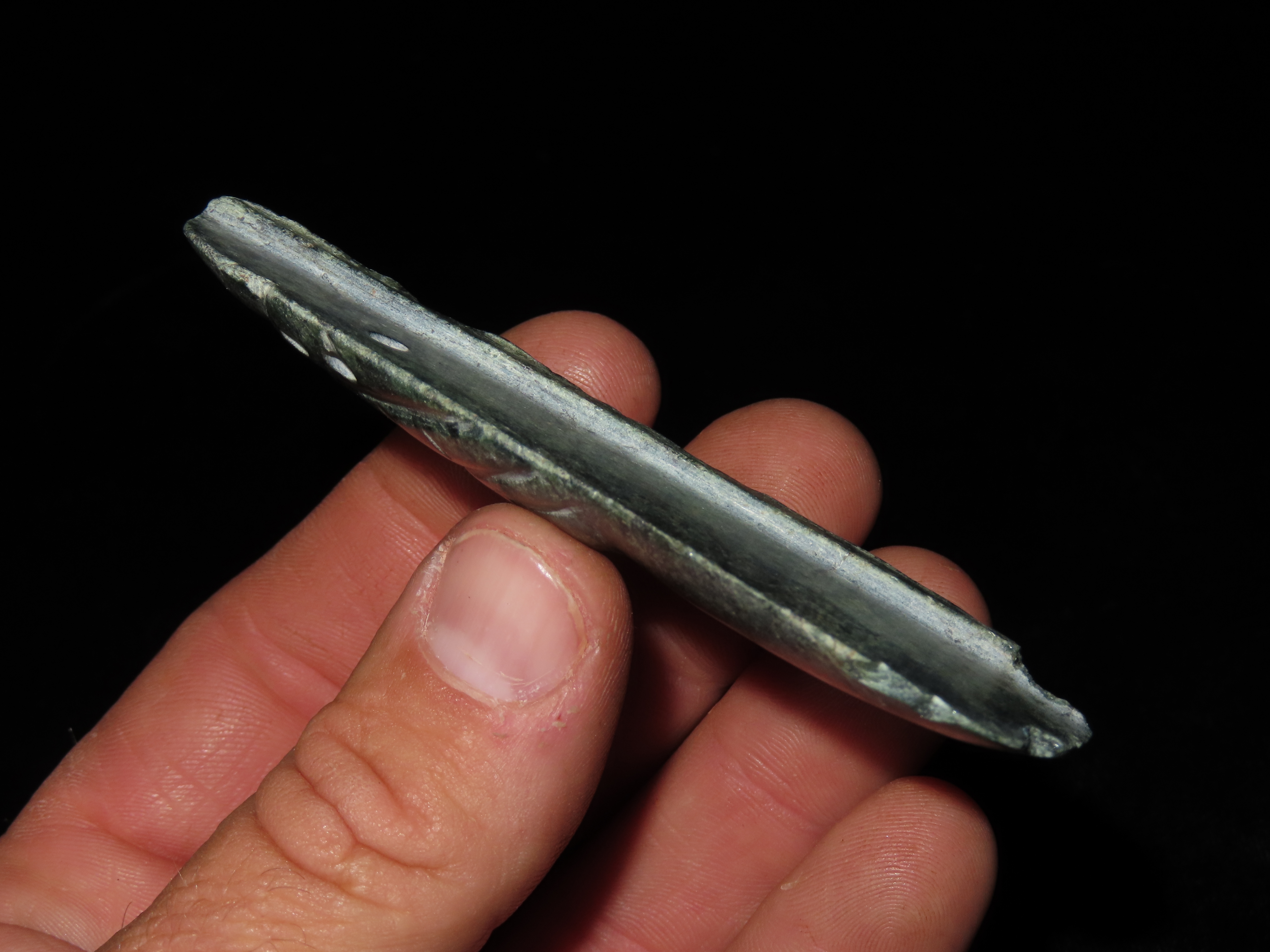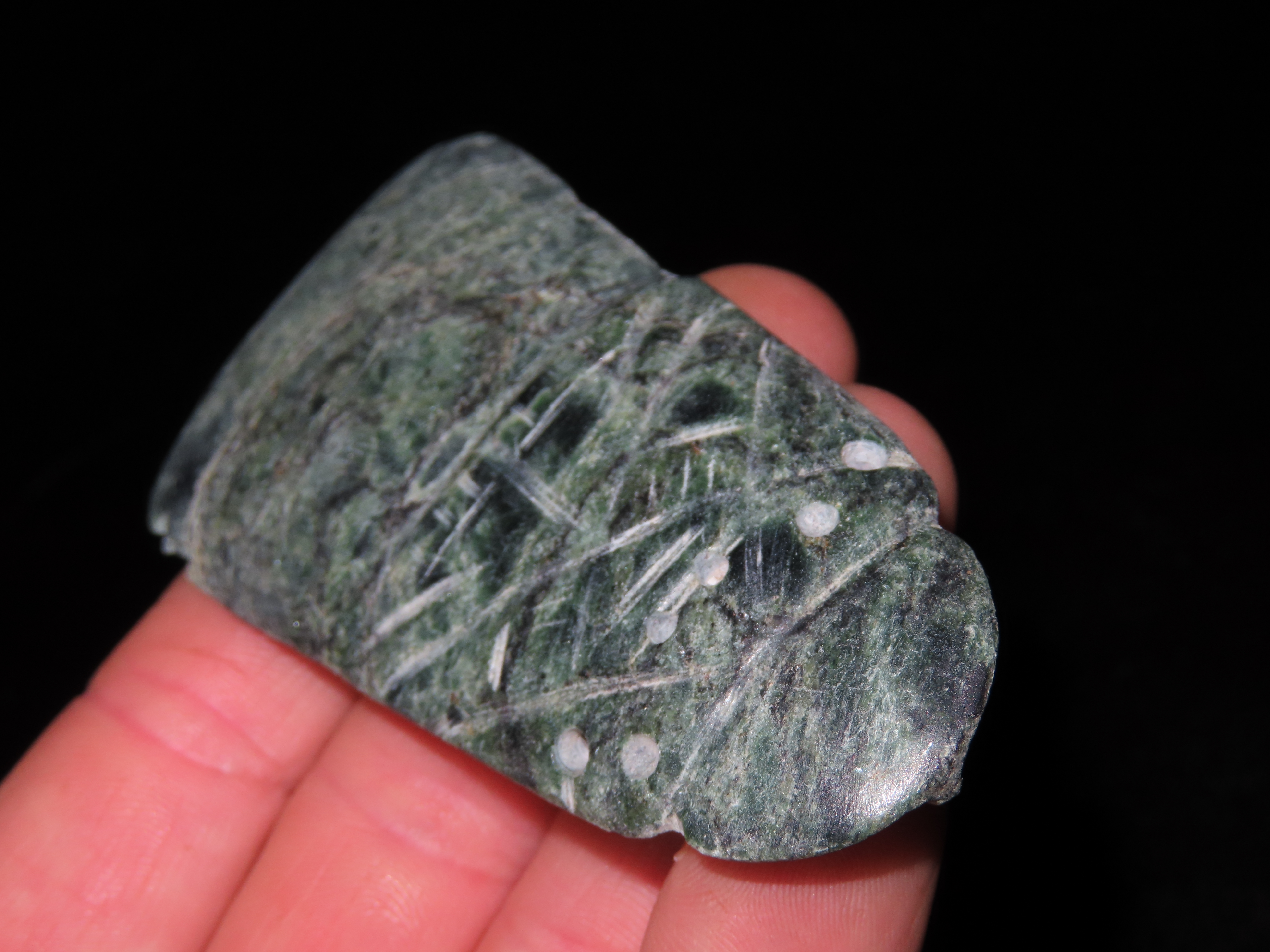 3 1/2″ x 1 7/8″ Pre-Colombian Jade Axe God Effigy Pendant, found in Costa Rica, ca. 800 BCE to 900 AD, Ex Randall May Collection