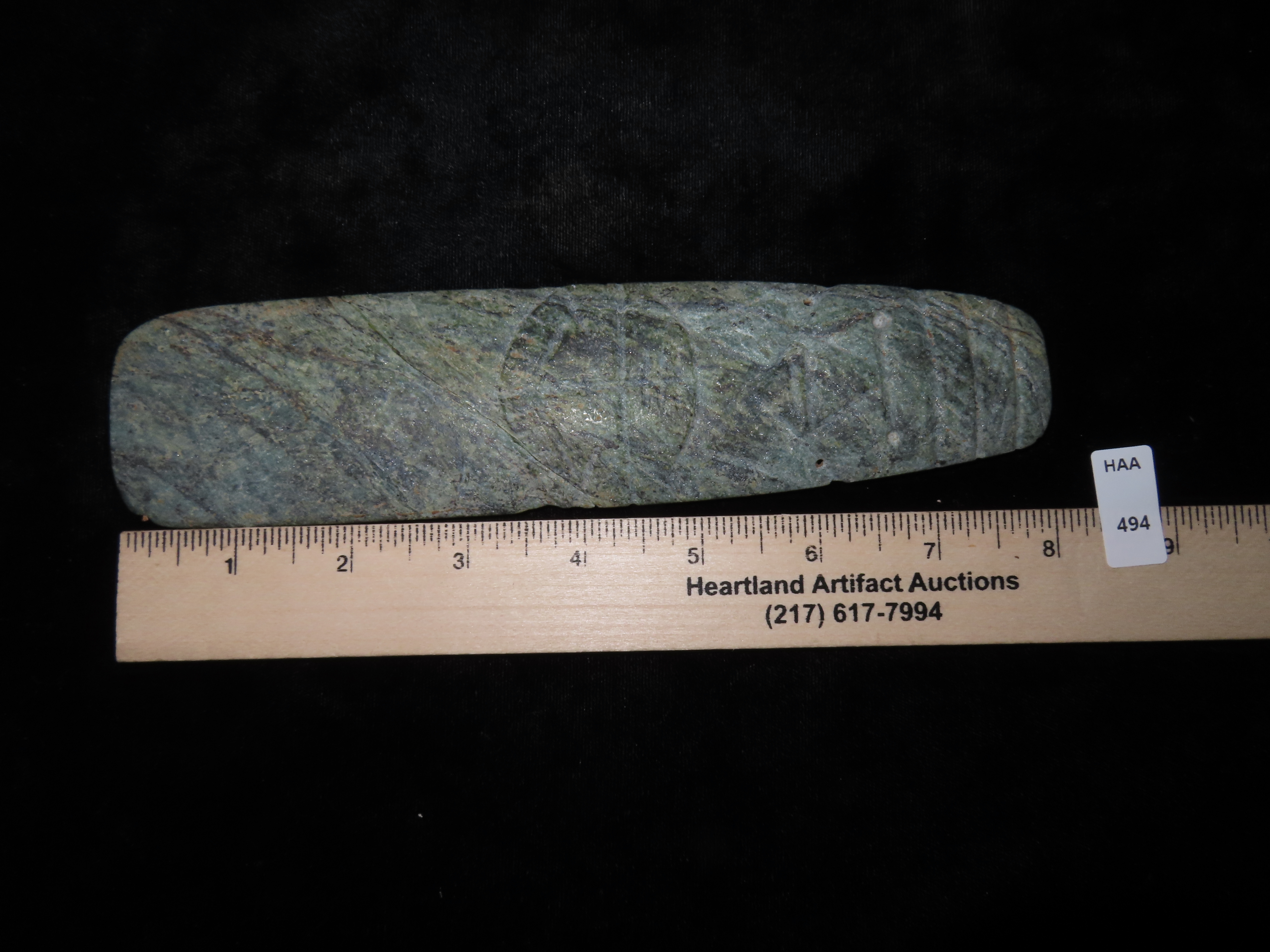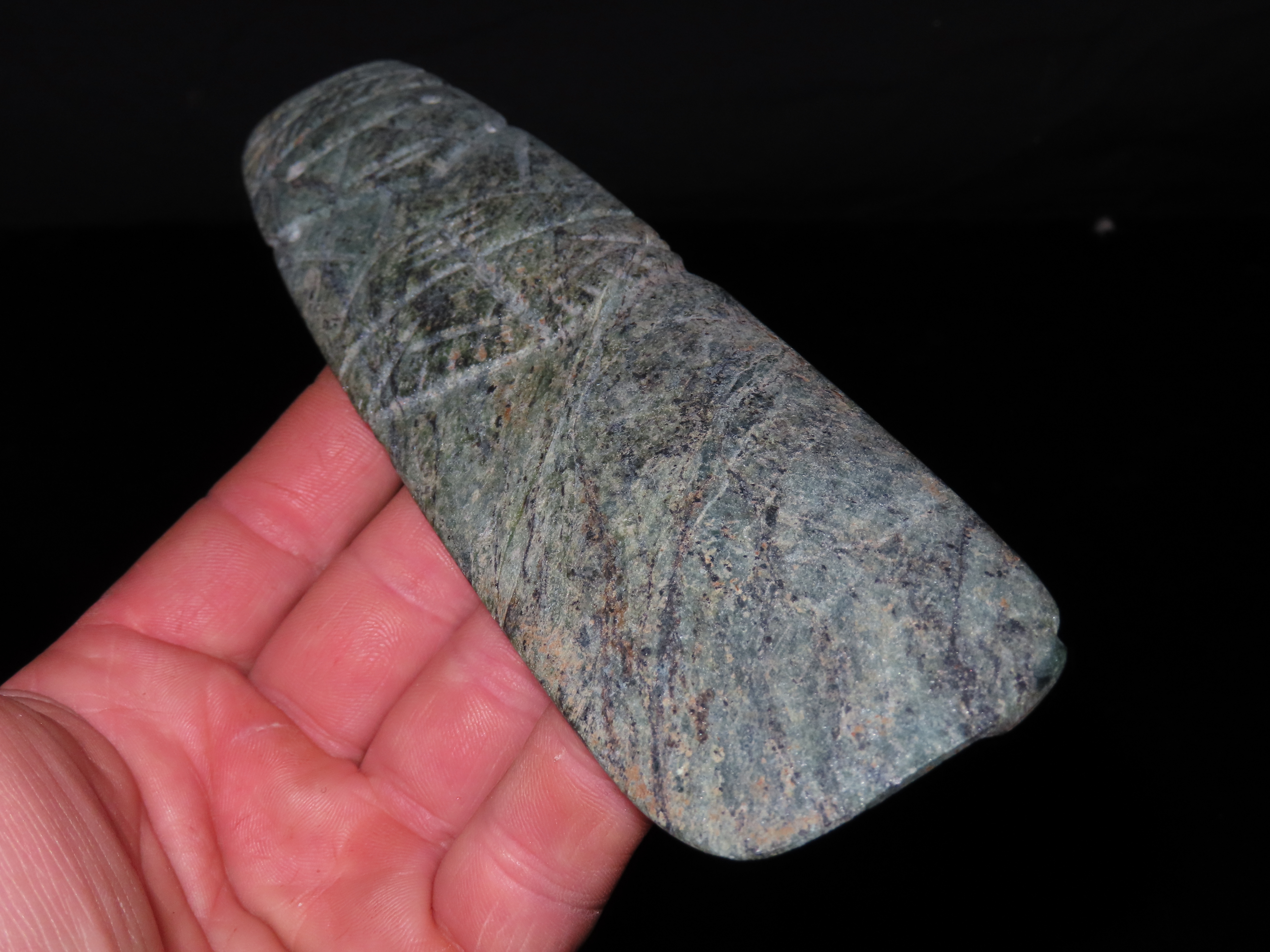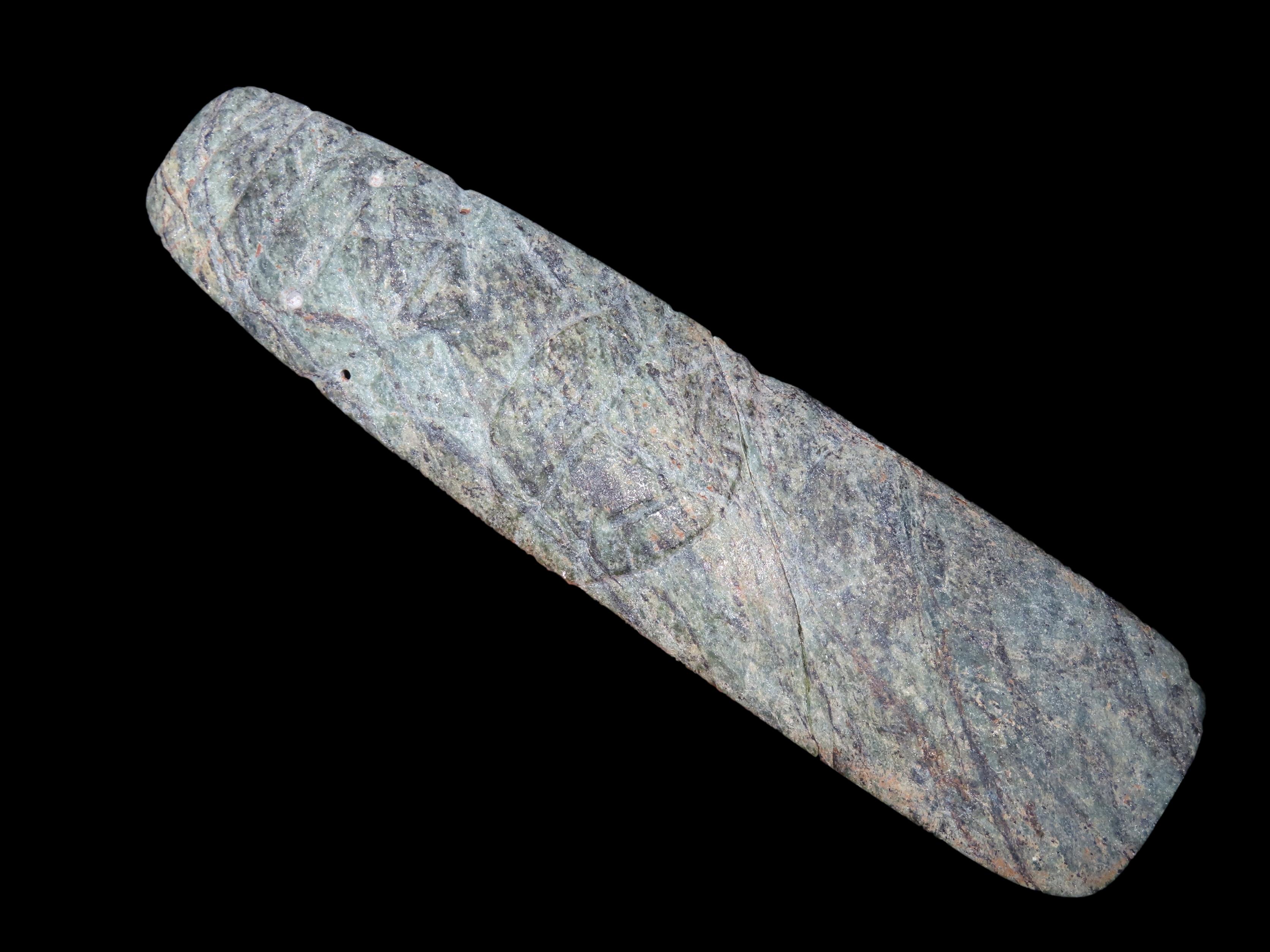 8 1/2″ x 2″ Pre-Colombian Jade Axe God Effigy Pendant, found in Costa Rica, ca. 800 BCE to 900 AD, Ex Randall May Collection