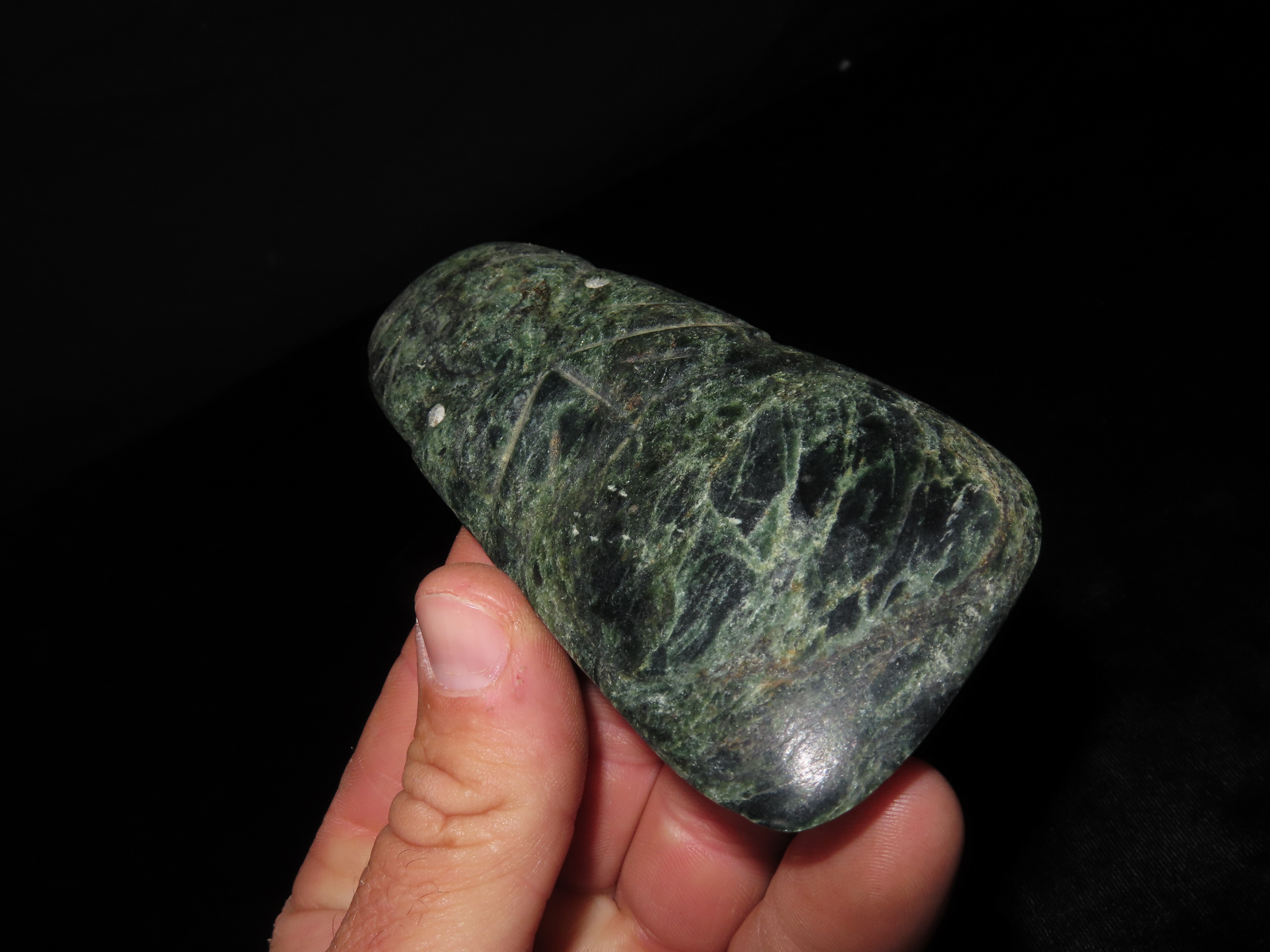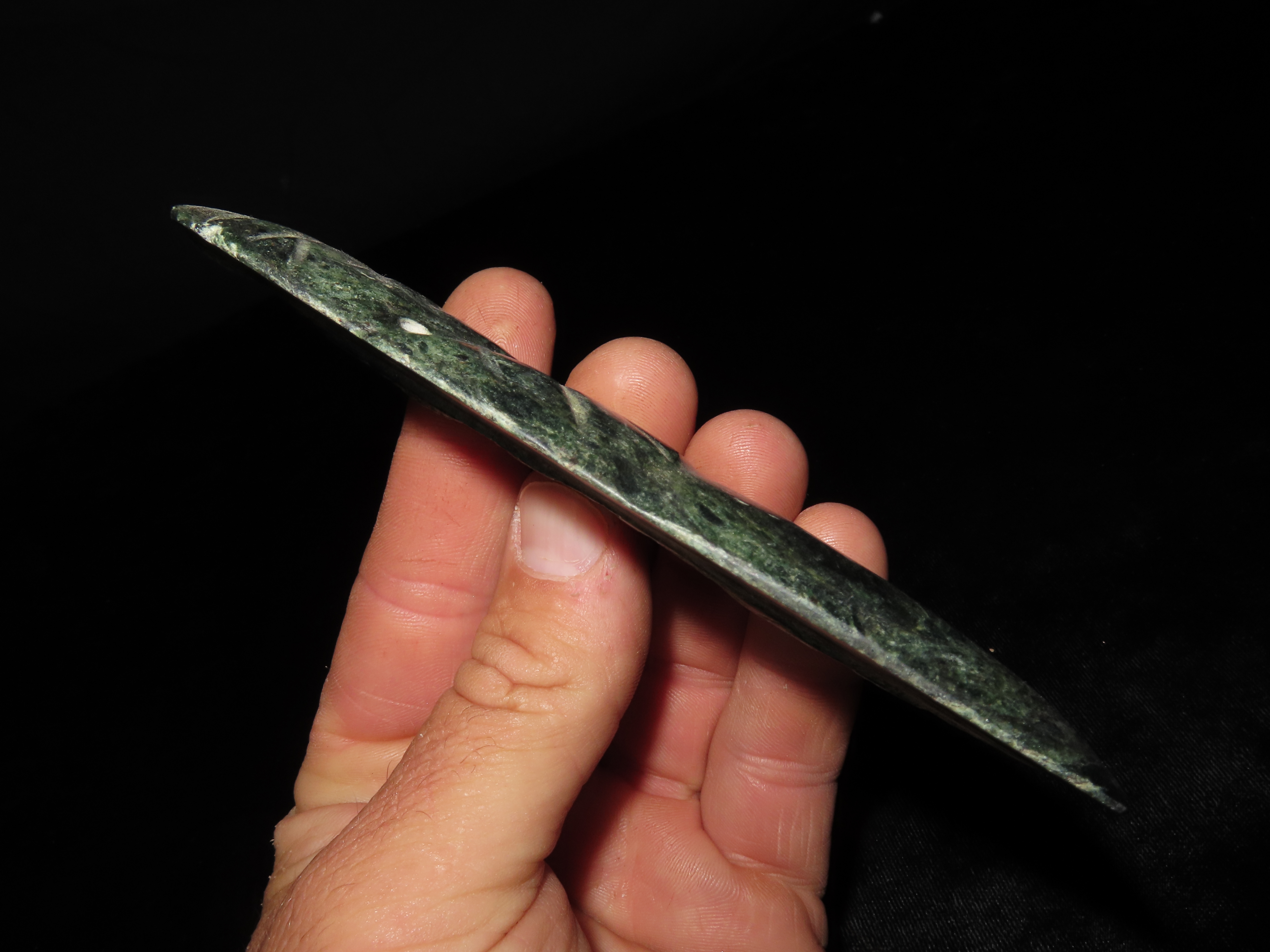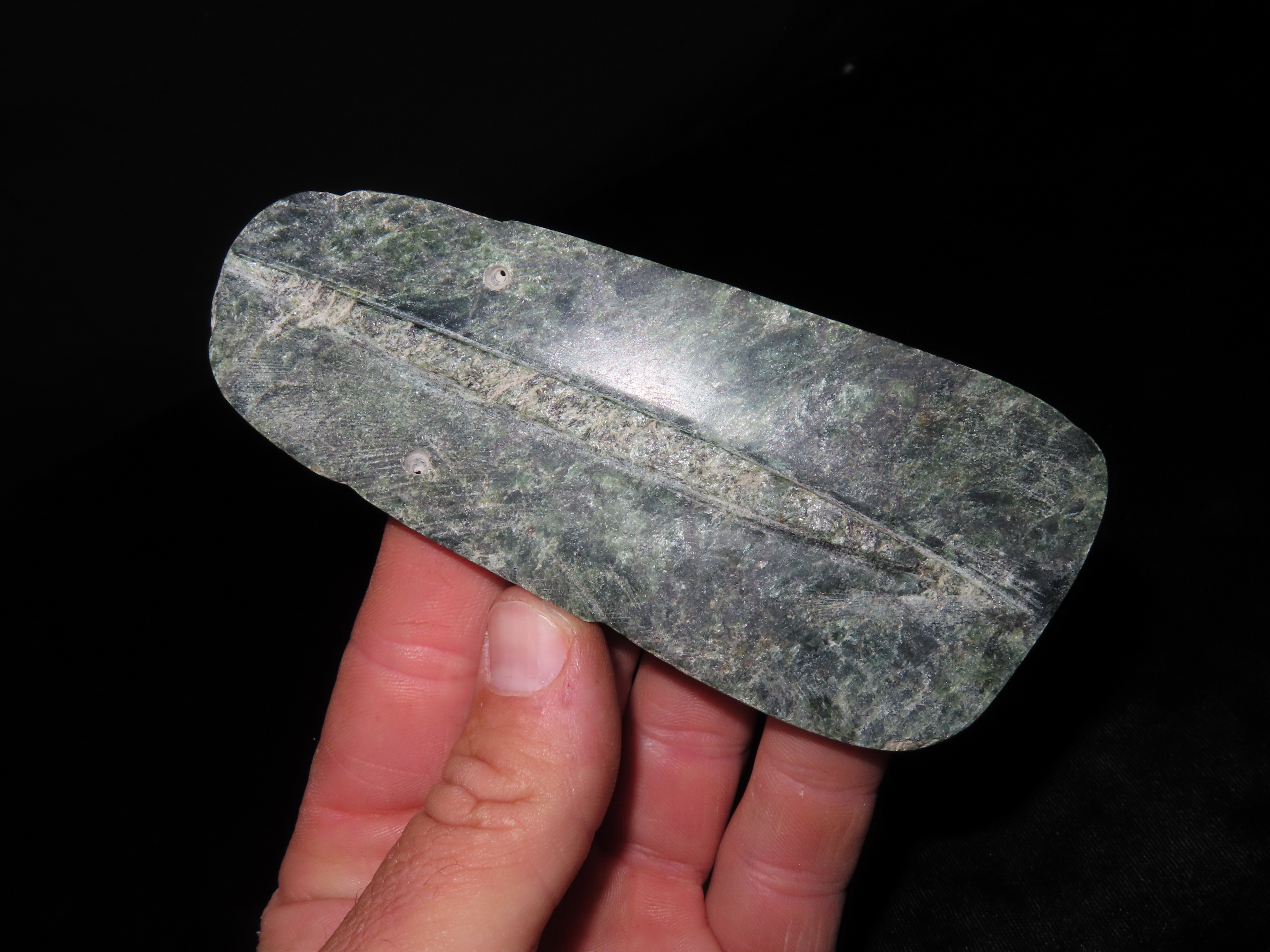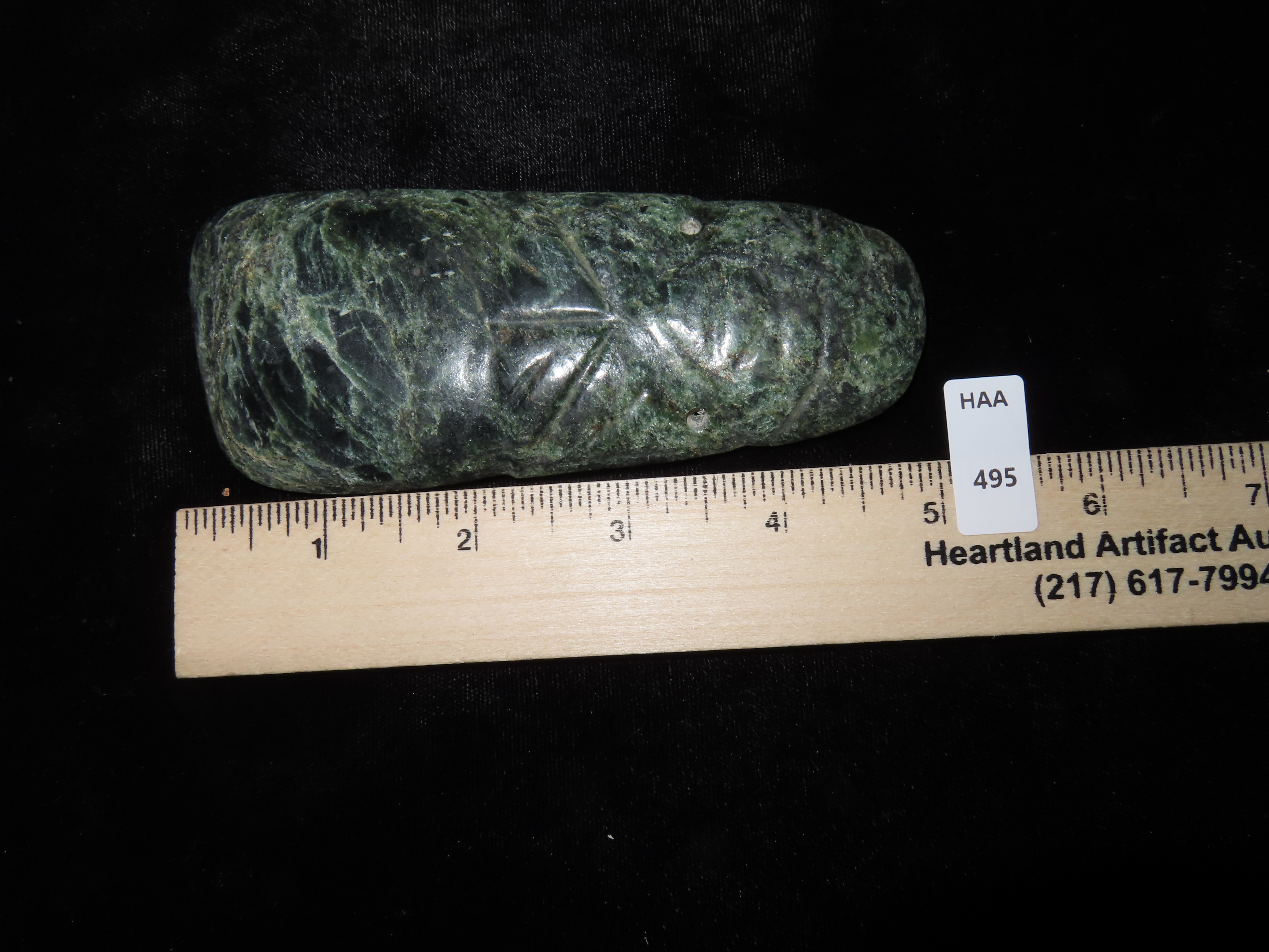 4 7/8″ x 2″ Pre-Colombian Jade Axe God Effigy Pendant, found in Costa Rica, ca. 800 BCE to 900 AD, Ex Randall May Collection
