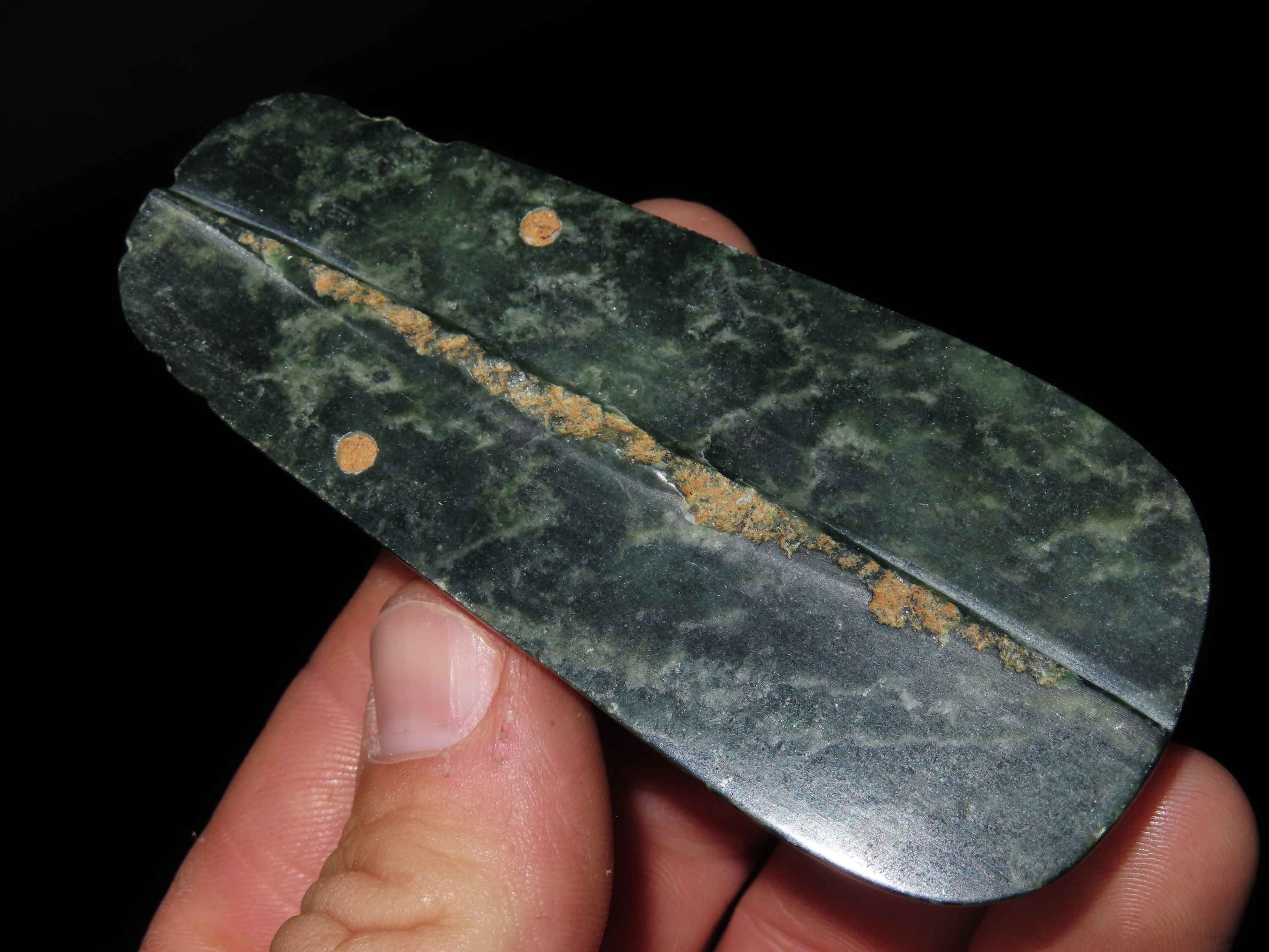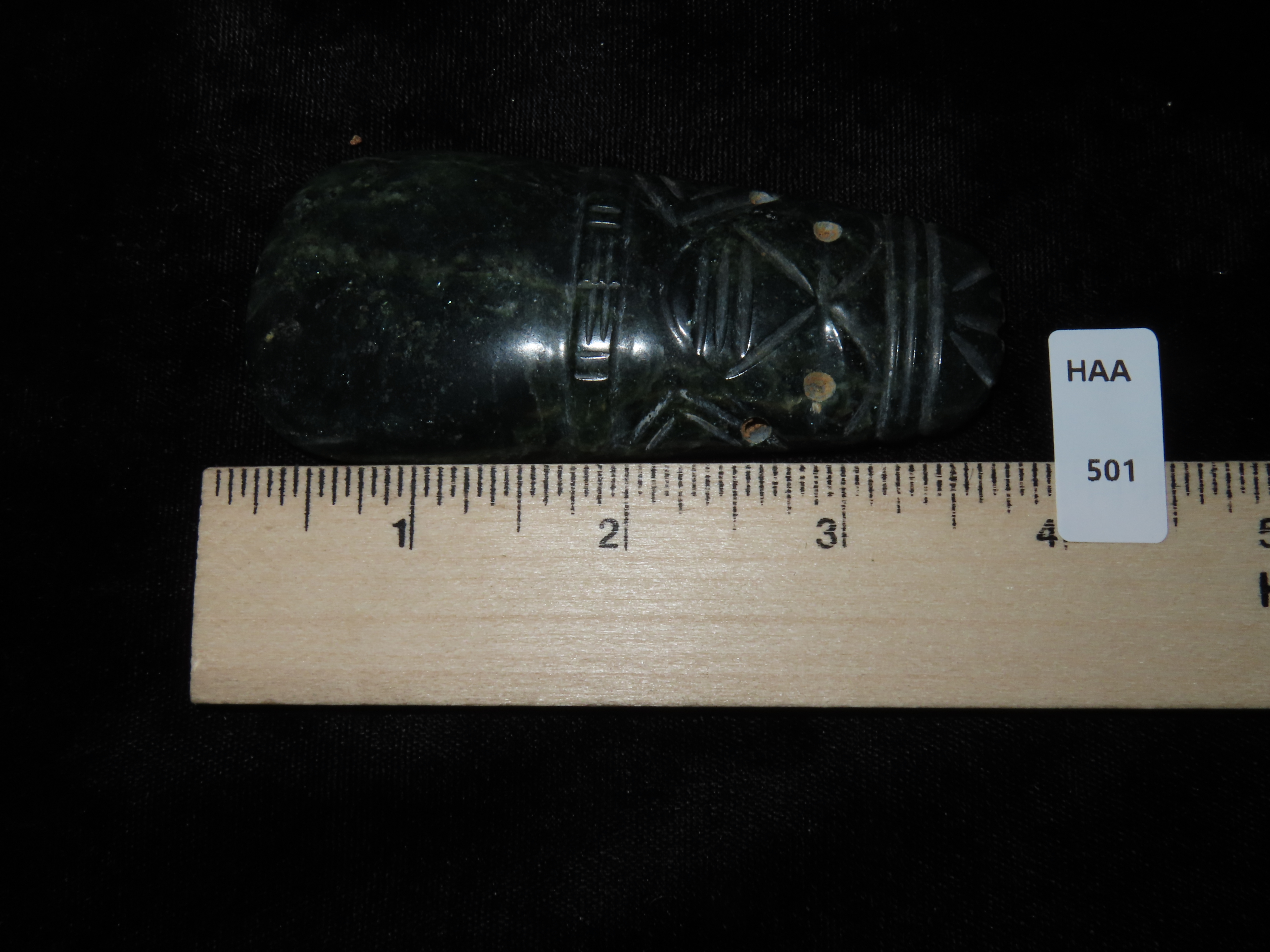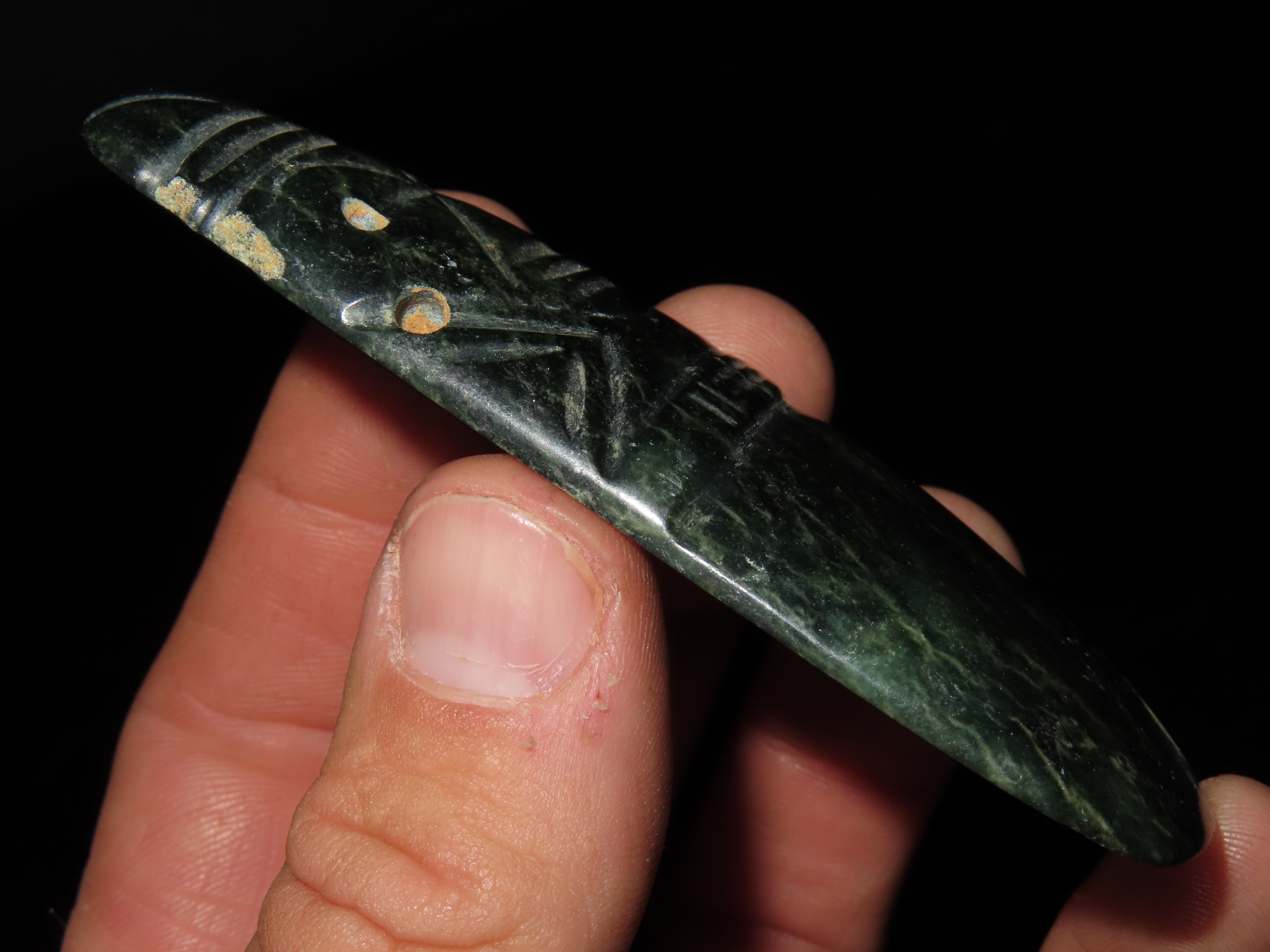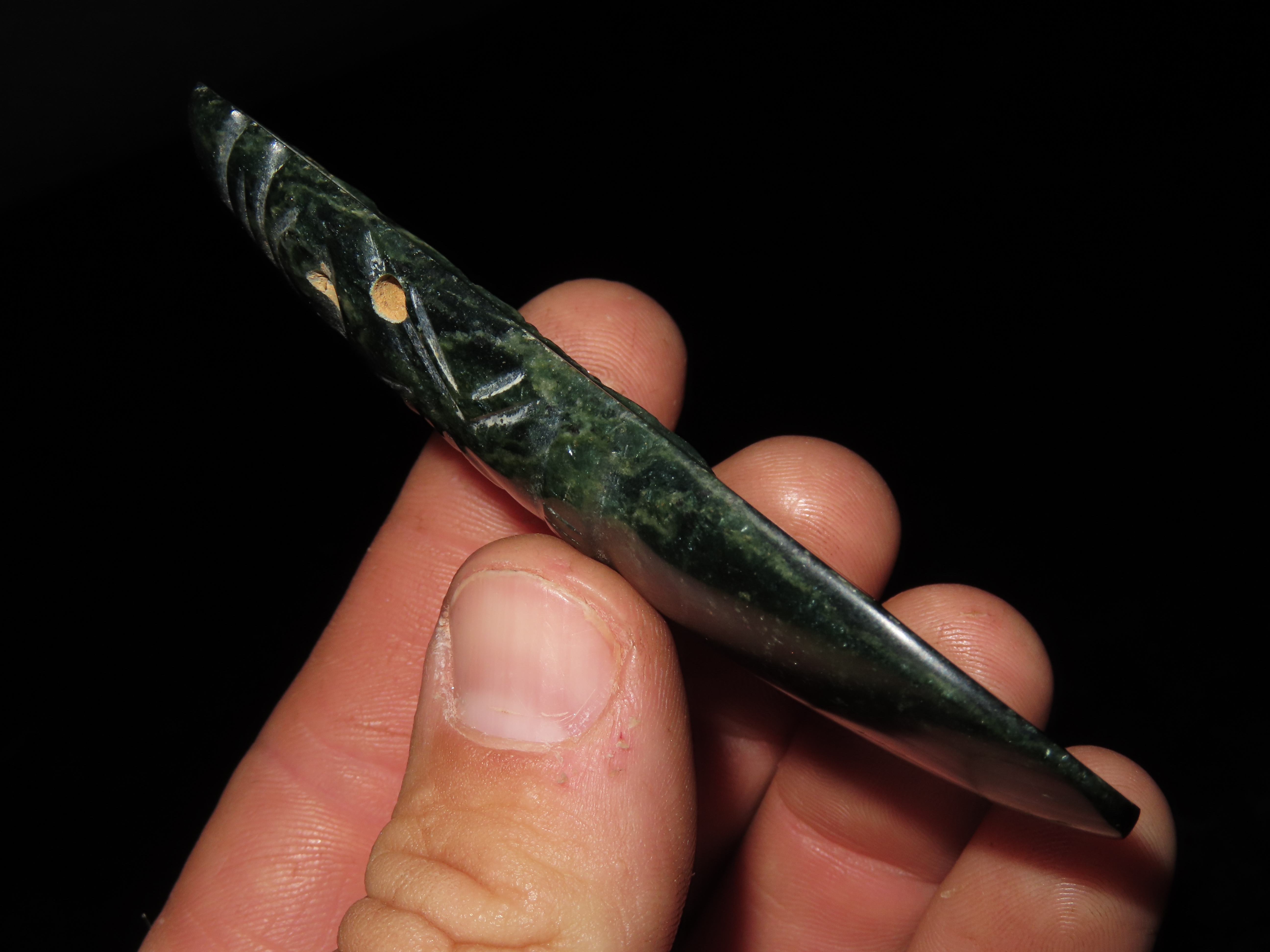 3 1/2" x 1 1/2" Pre-Colombian Jade Axe God Effigy Pendant, found in Costa Rica, ca. 800 BCE to 900 AD, Ex Randall May Collection