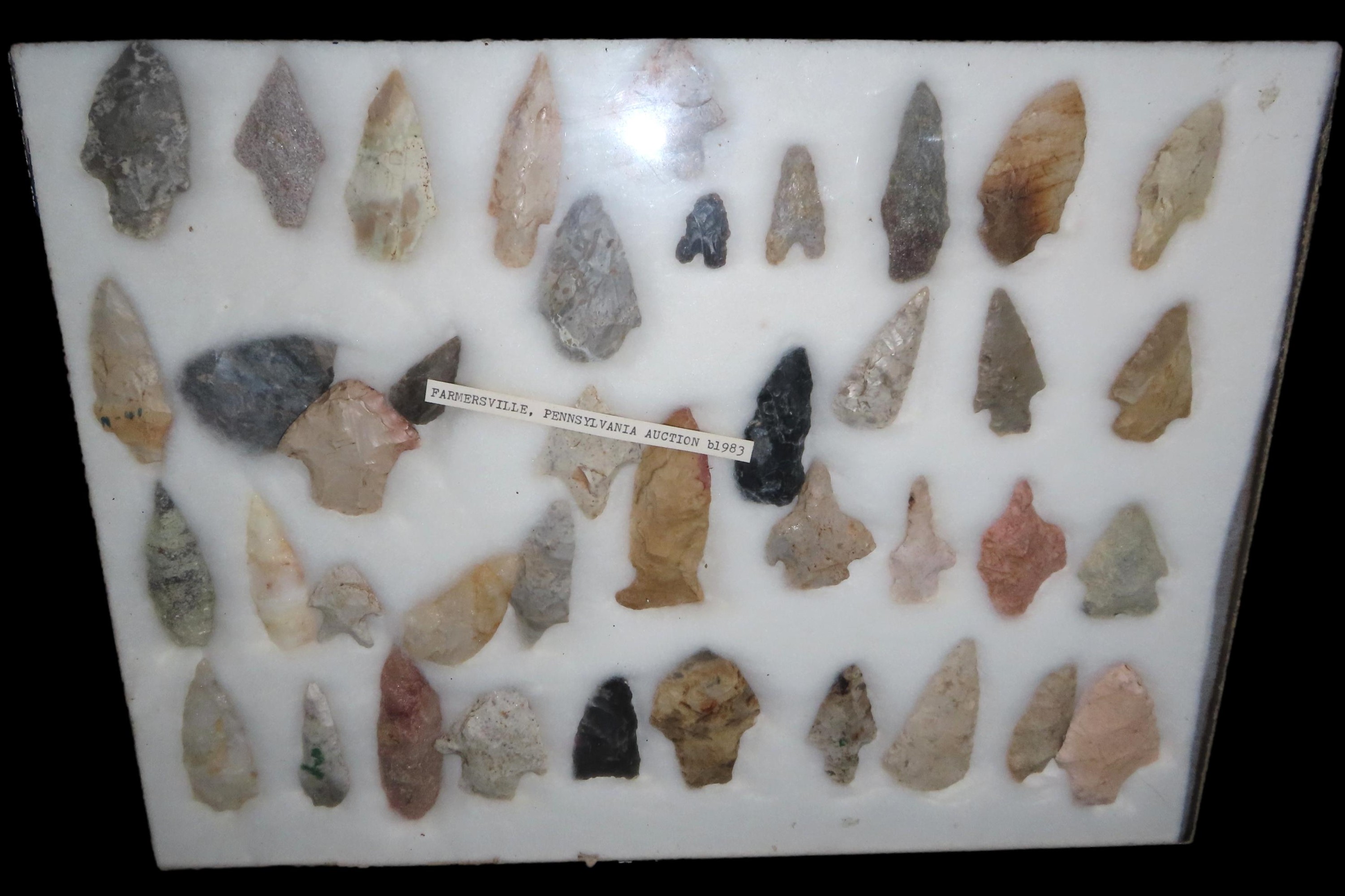 12″ x 18″ Frame of Miscellaneous Arrowheads Collected in the Farmersville, Pennsylvania region, bought at Auction in 1983, Ex Randall May Collection