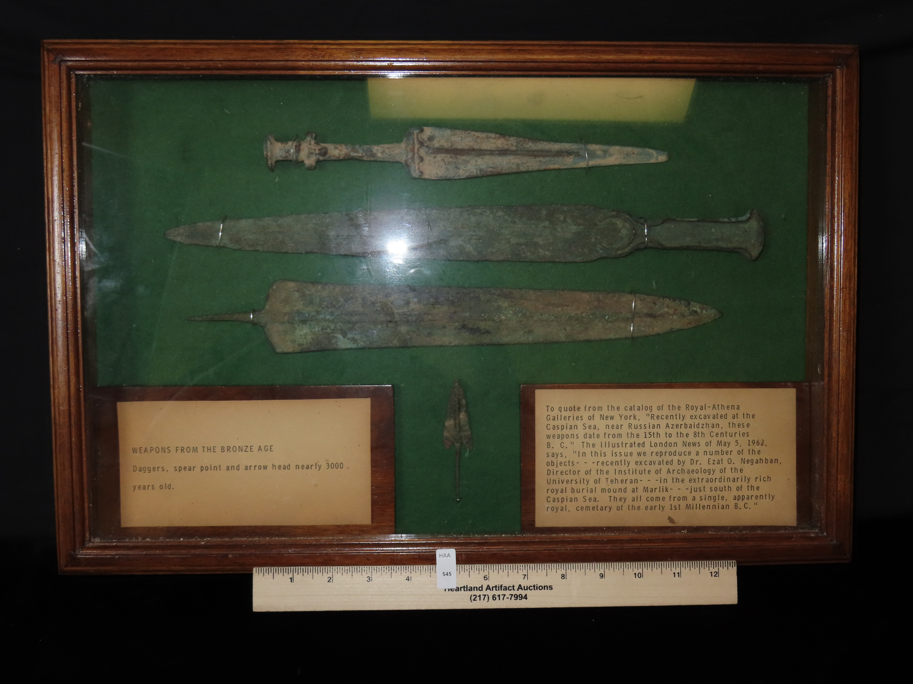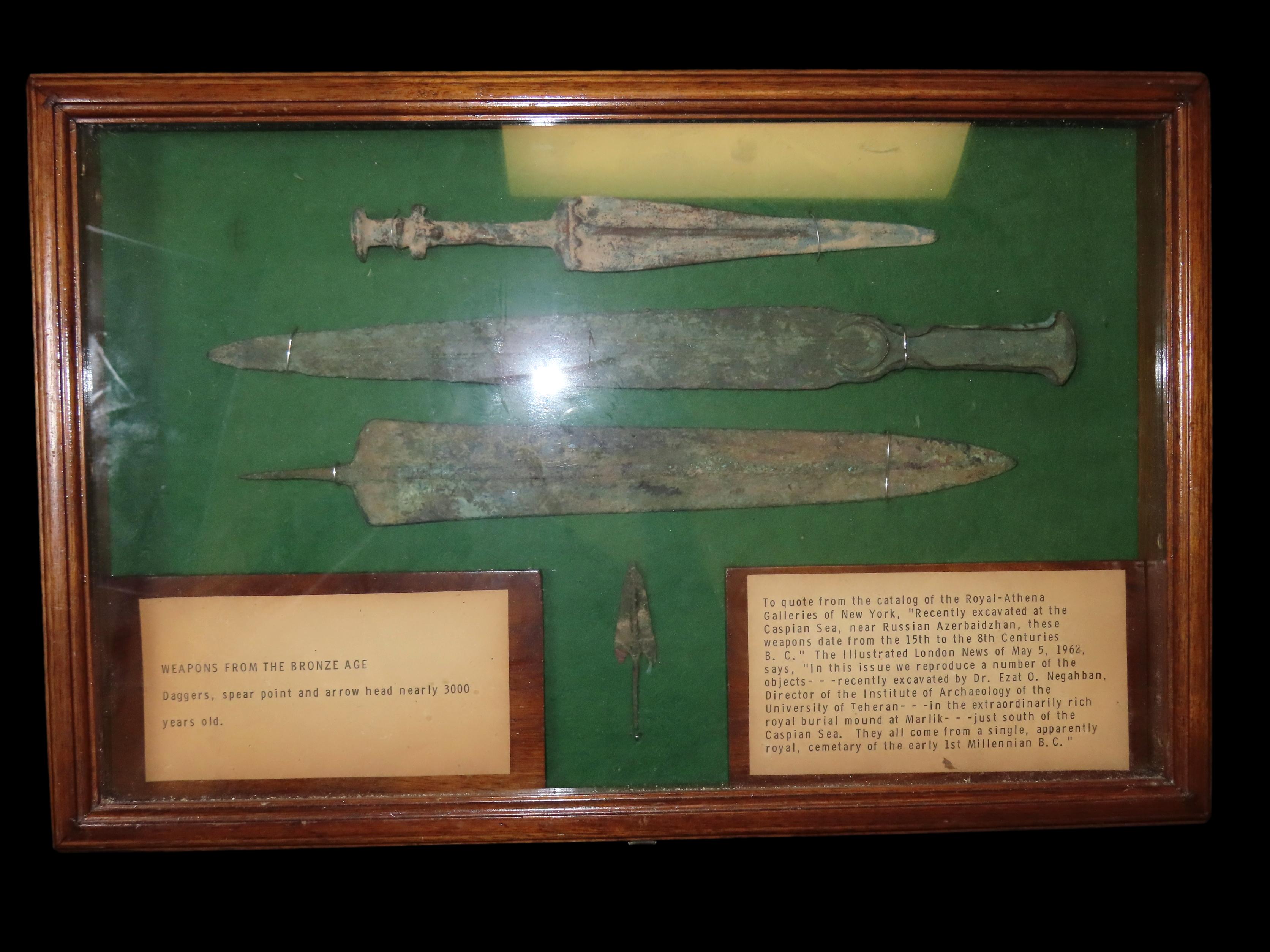 12" x 14" Frame of Bronze Age Weapons- Short Sword, Spear Point, Arrowhead, found near The Caspian Sea, Ex Randall May Collection
