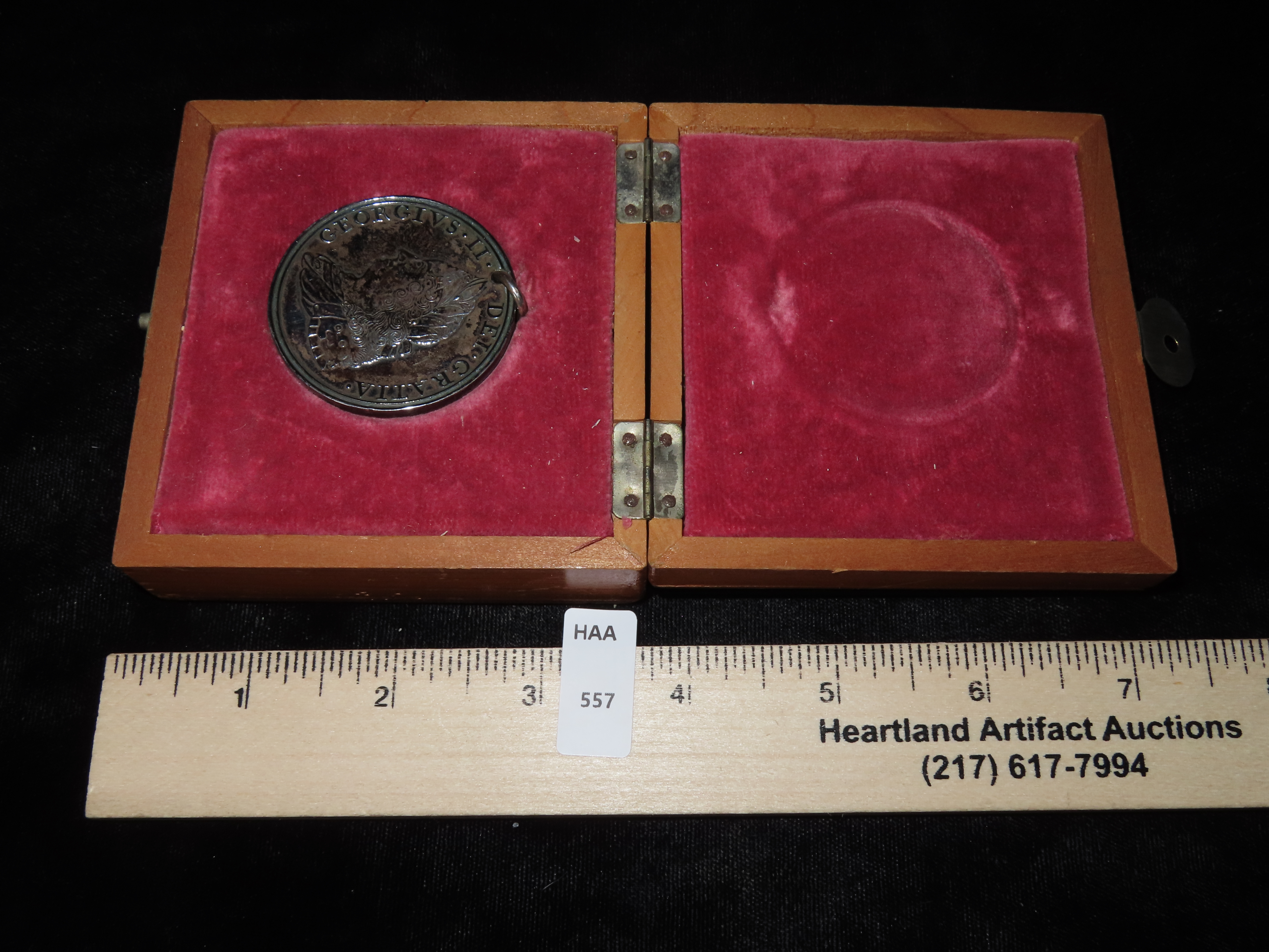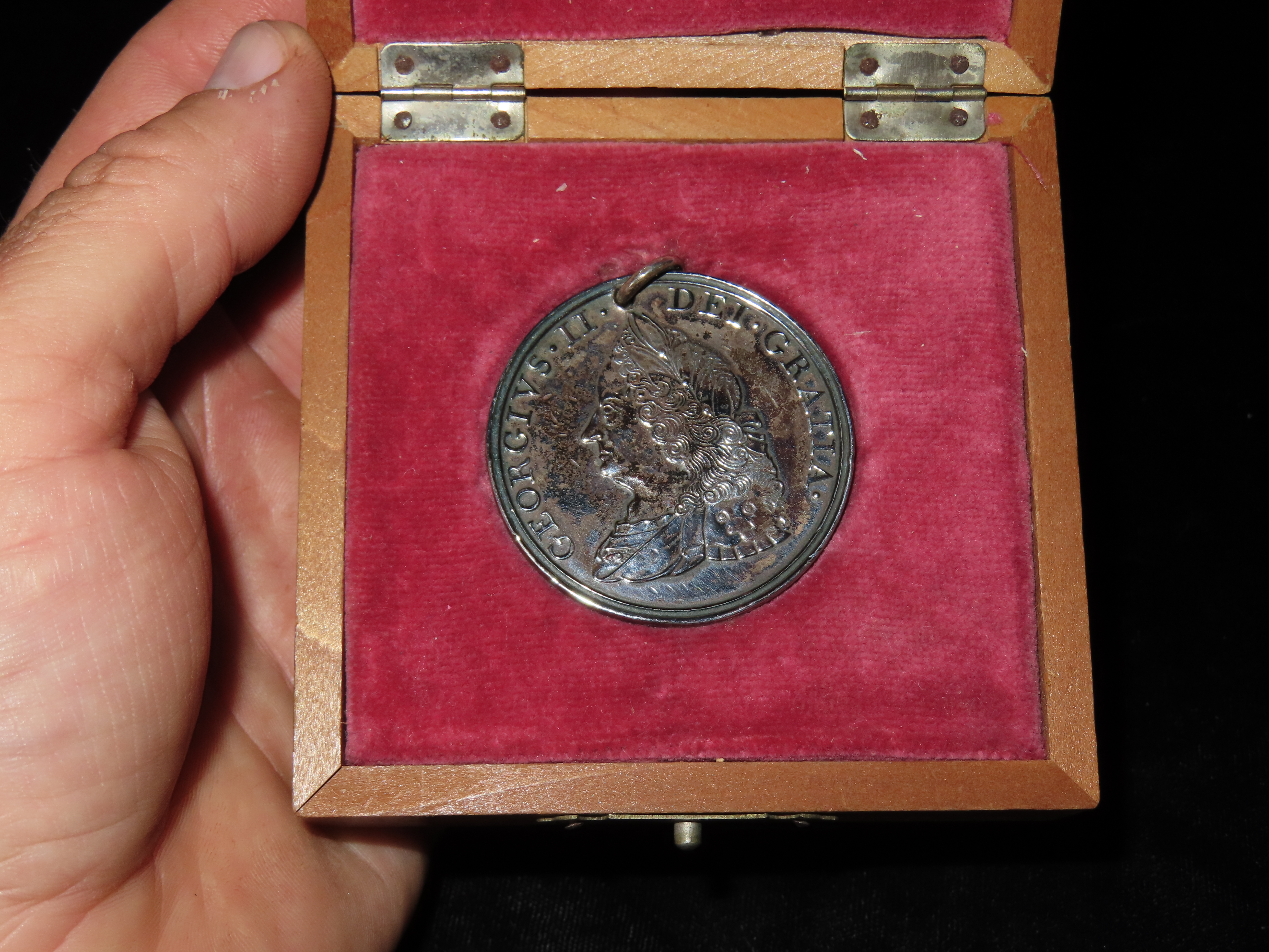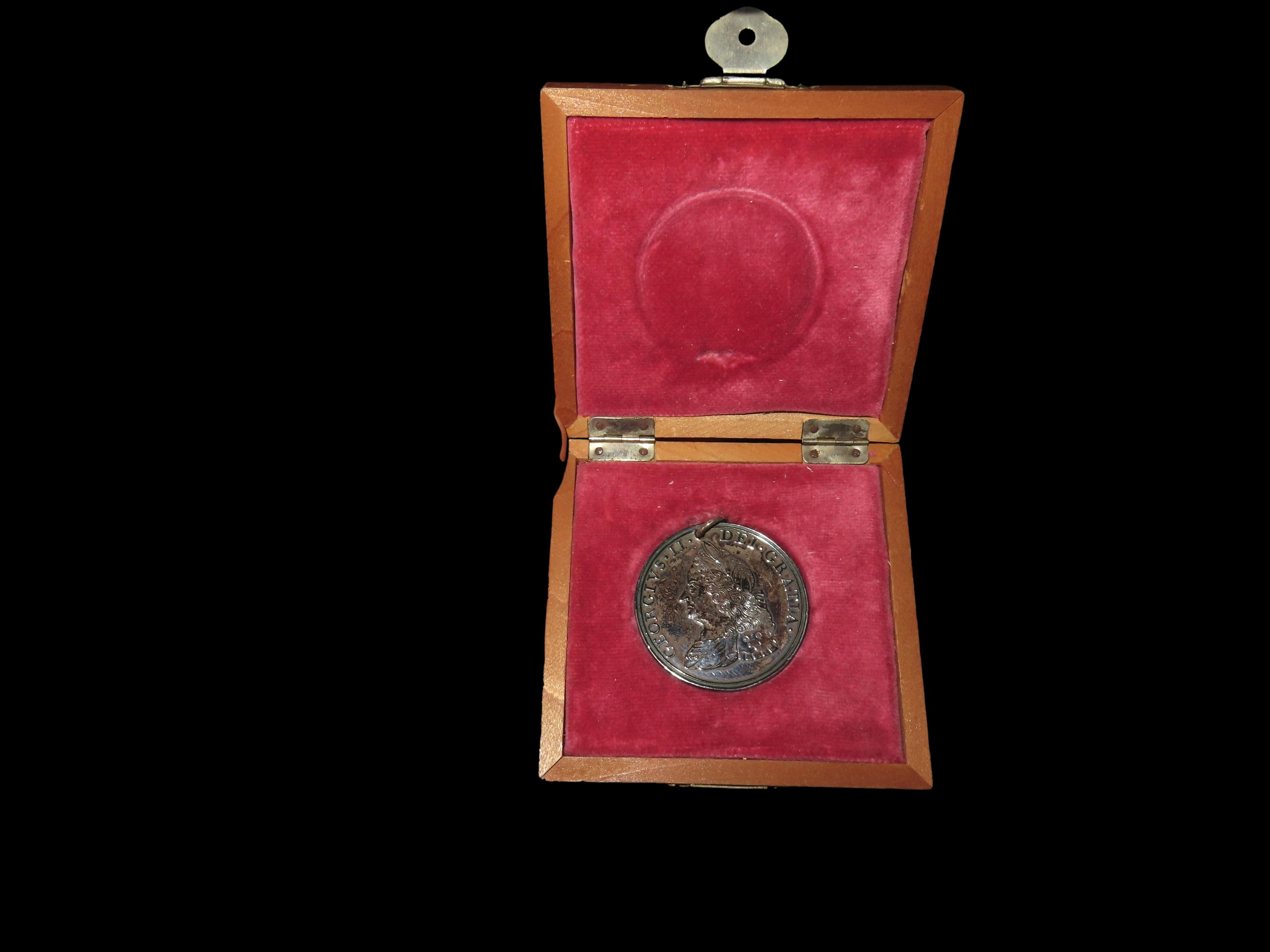 3 3/4″ x 3 3/4″ Wooden Box containing King George II Medallion, Ex Randall May Collection