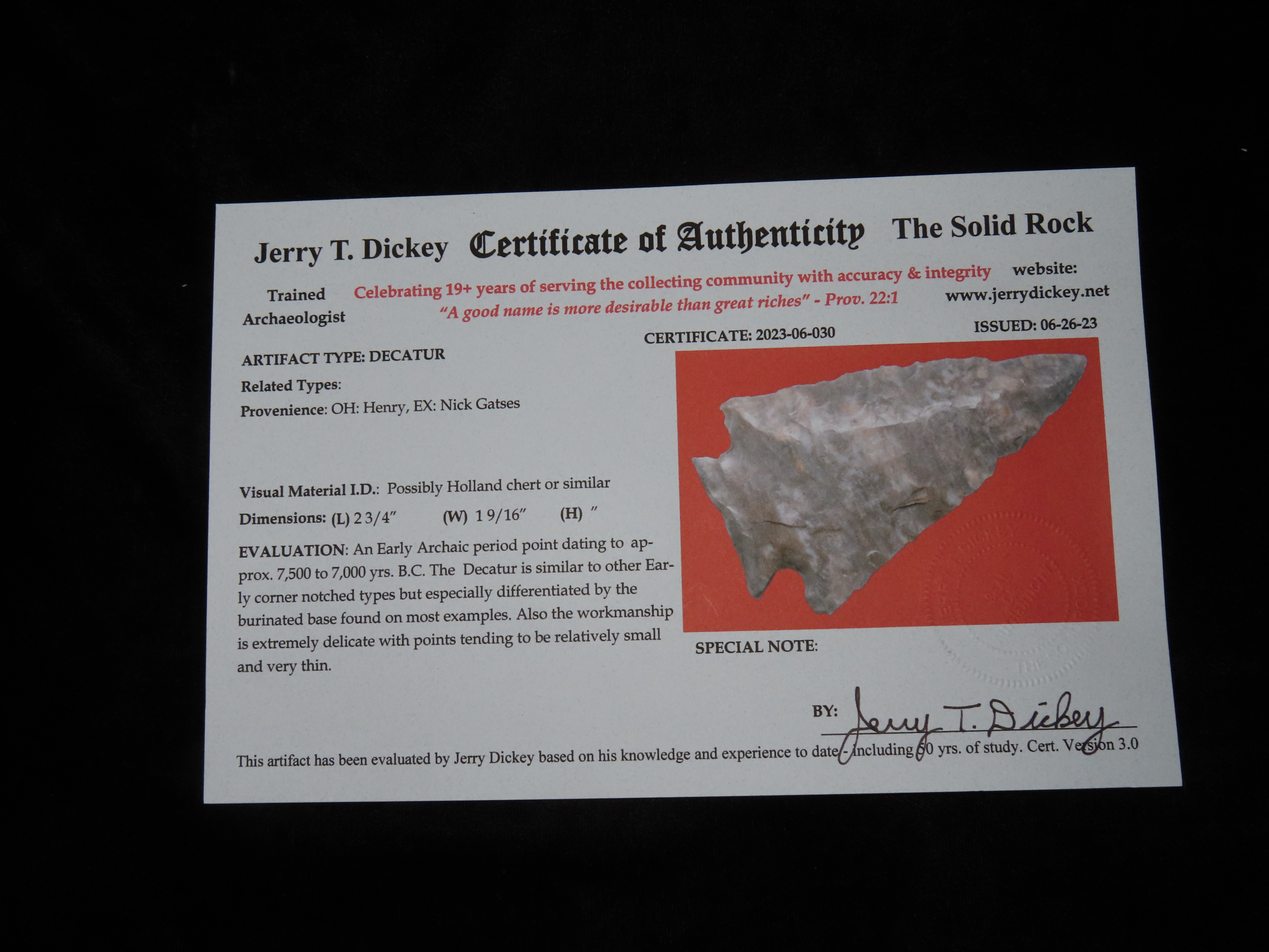 2 3/4″ Decatur, Dickey COA, found in Henry Co., Ohio,made of Holland Chert, Ex Nick Gatses Collection