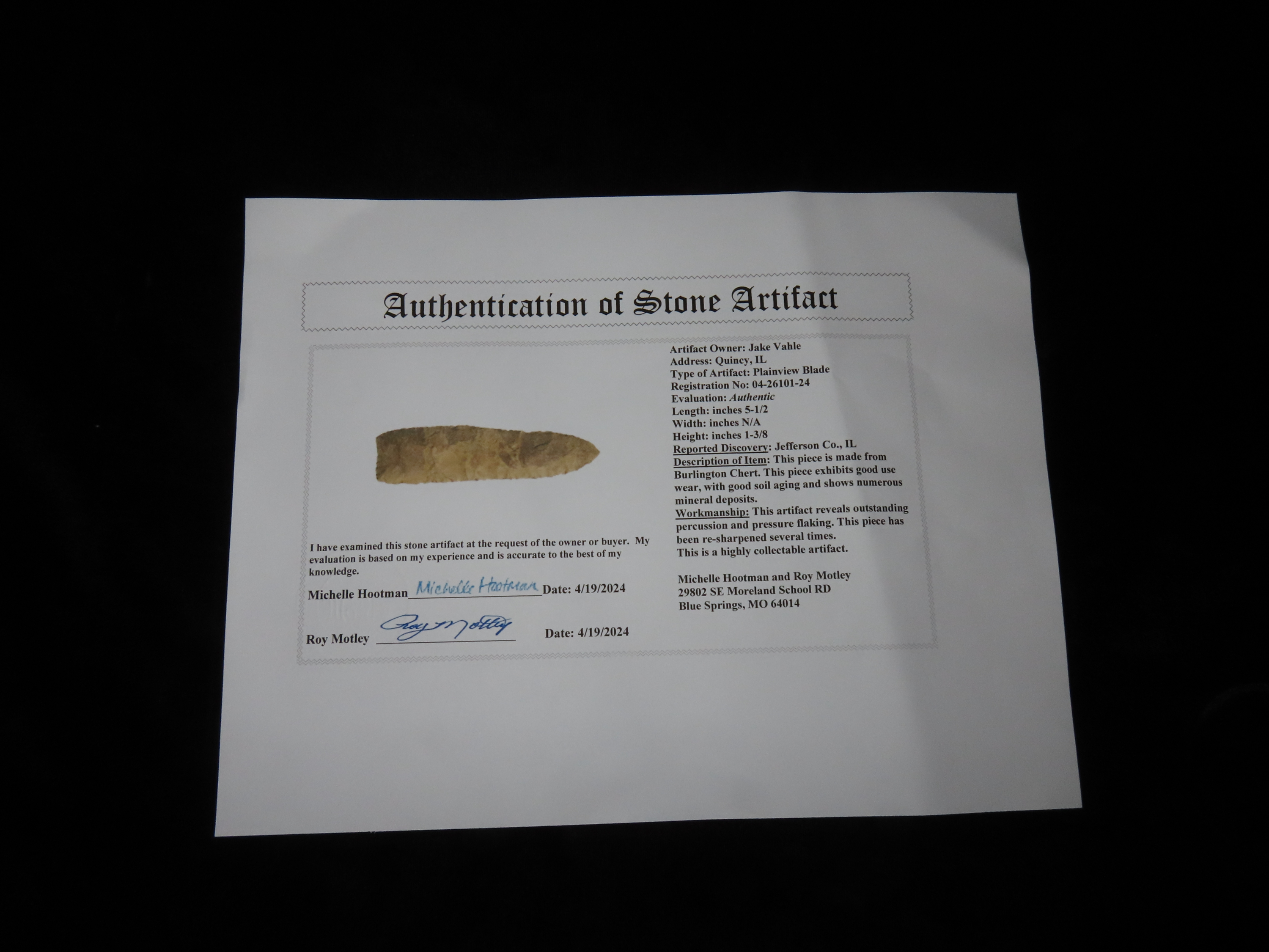5 1/2″ Plainview Blade/Knife, 2x COA-Dickey/Motley, found in Jefferson Co., Illinois, Ex Jake Vahle