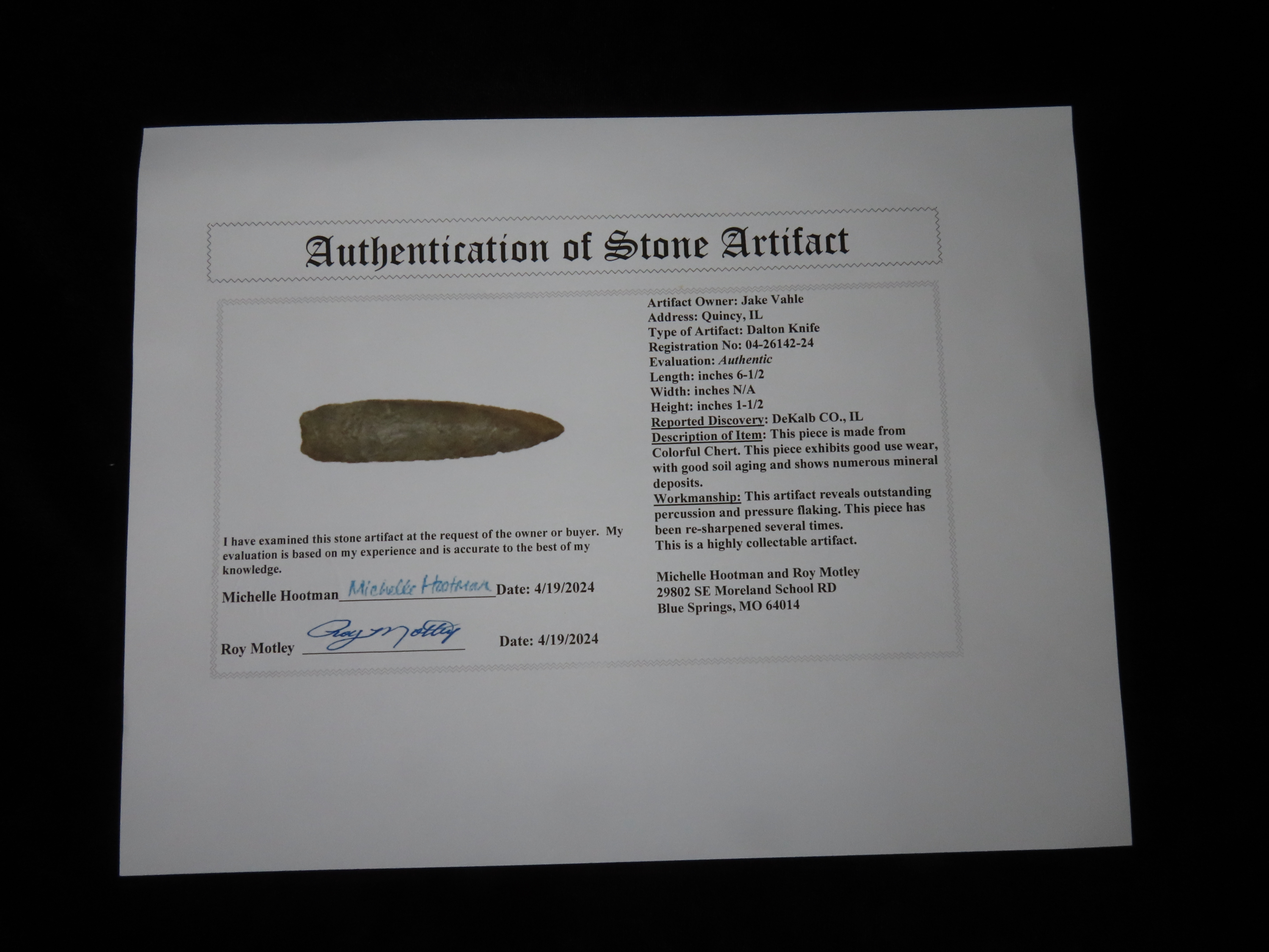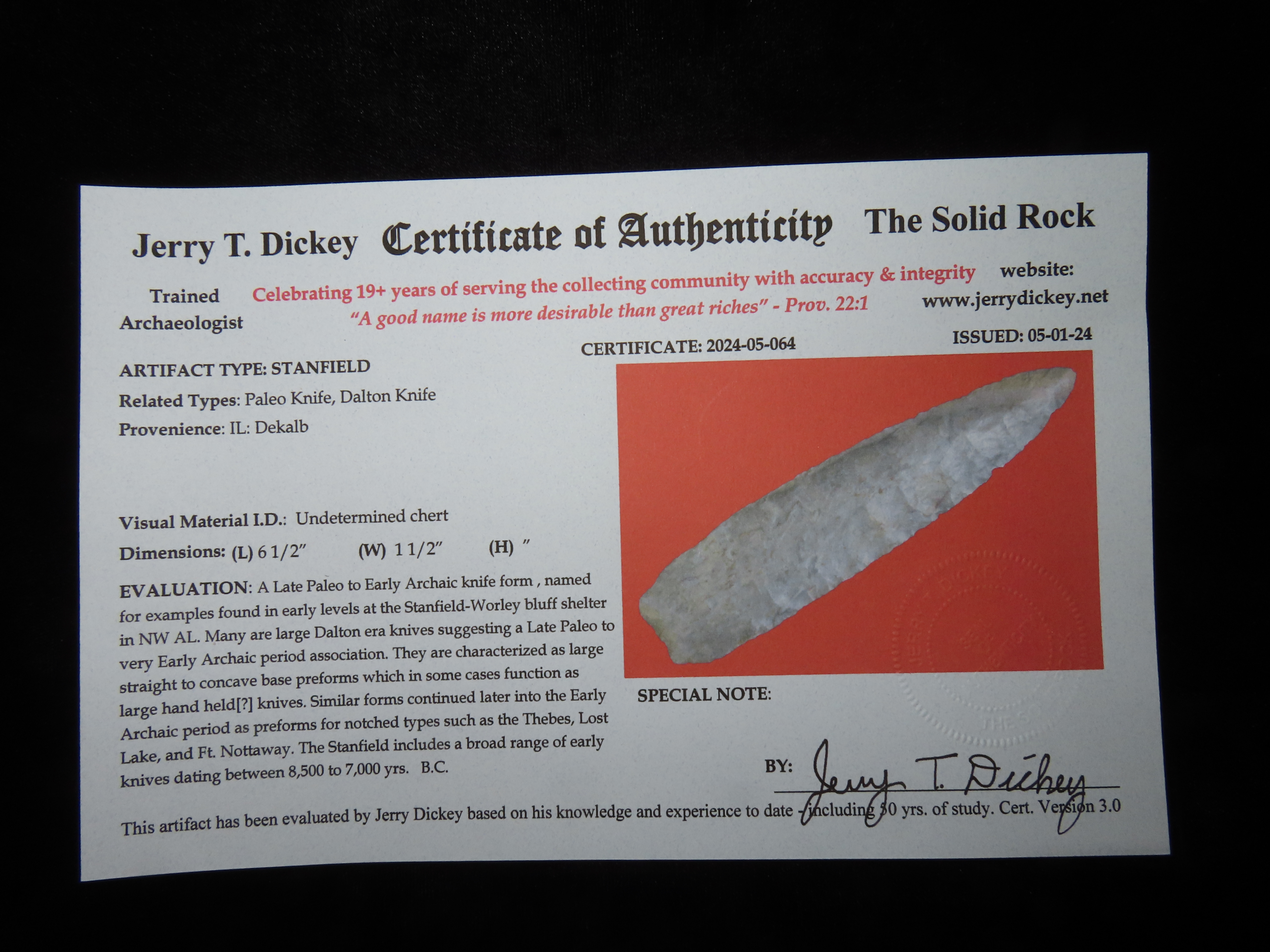 6 1/2″ OUTSTANDING Stanfield/Dalton Knife, 2xCOA-Dickey/Motley, found in DeKalb Co., Illinois