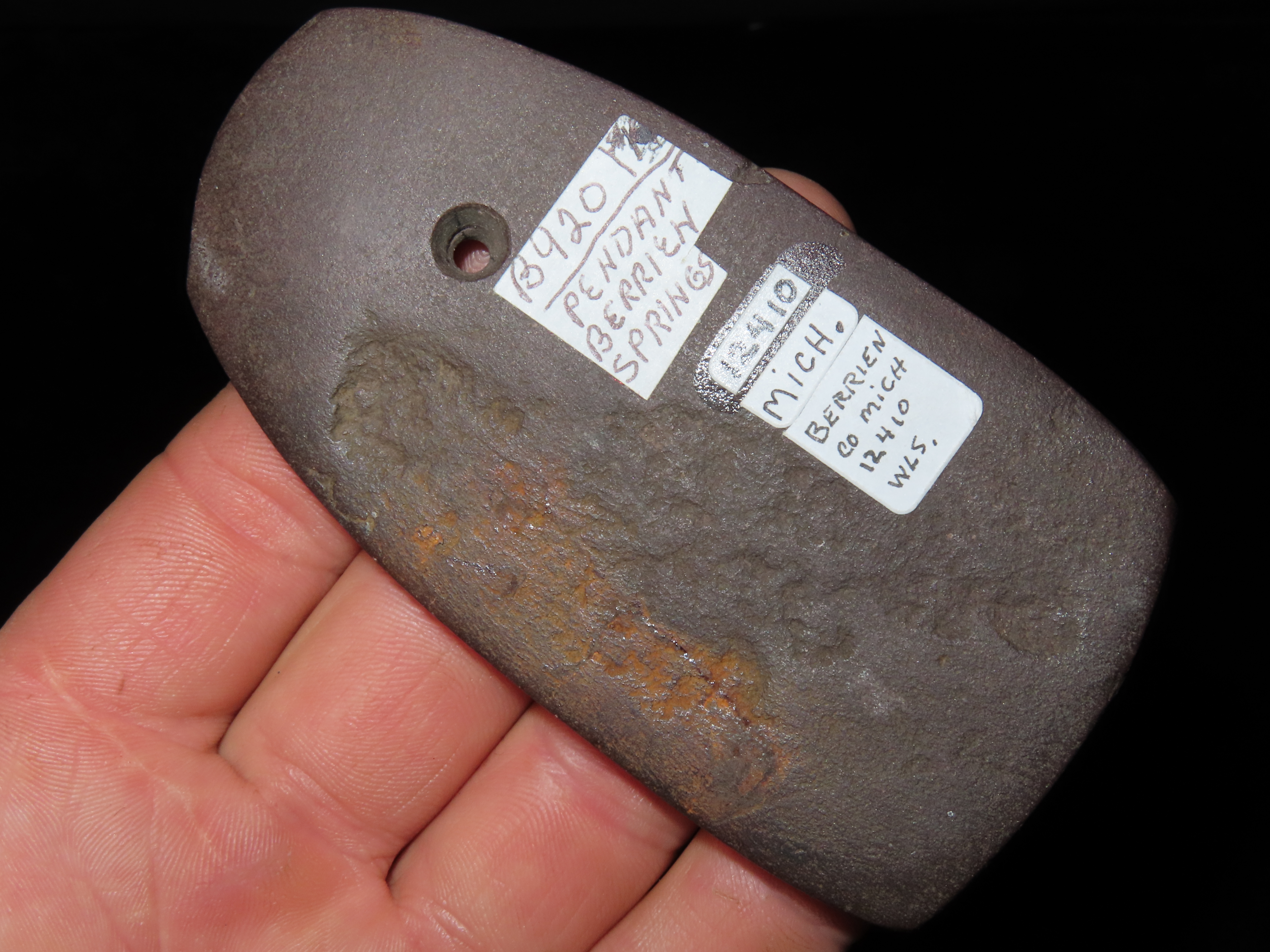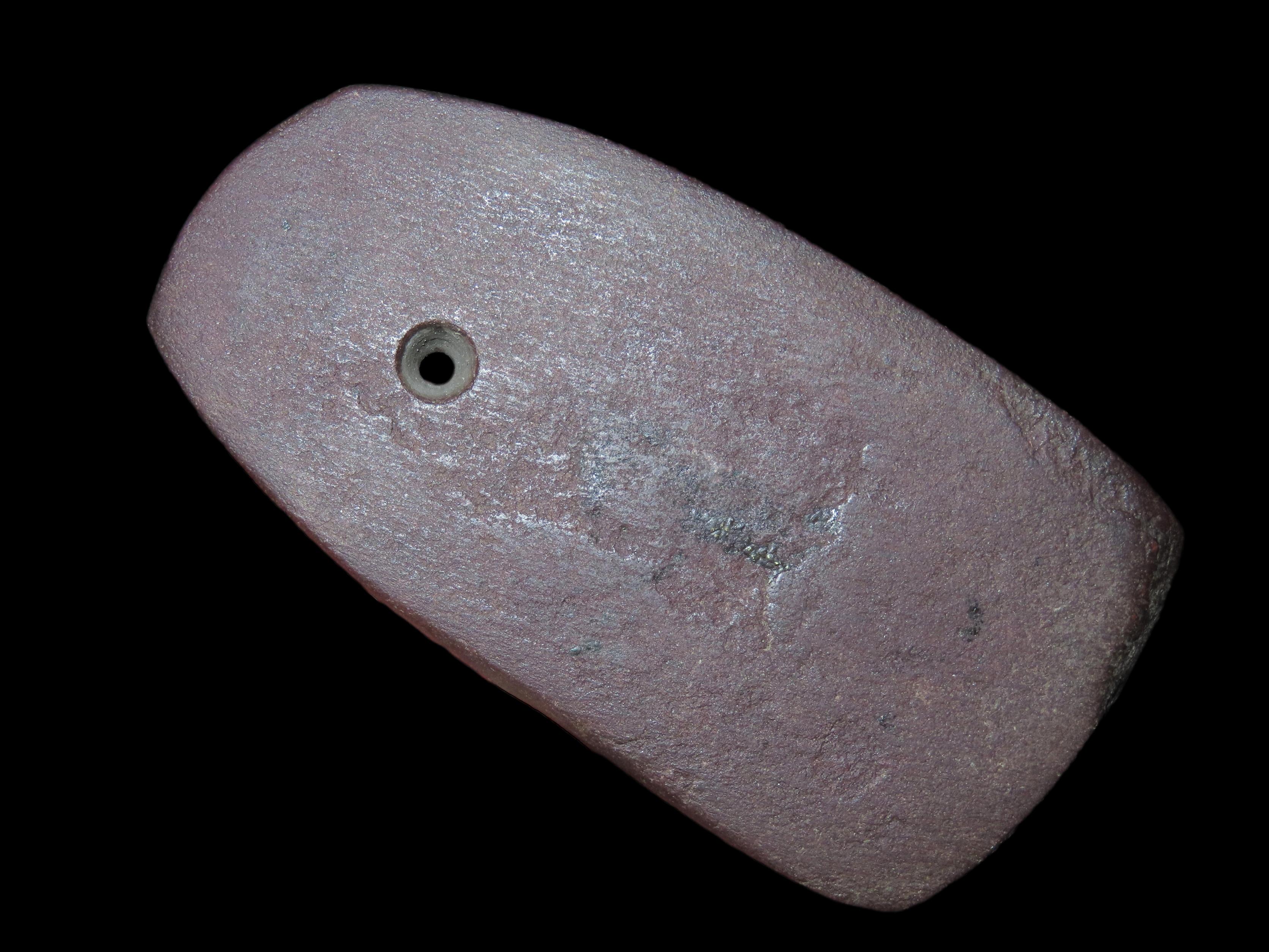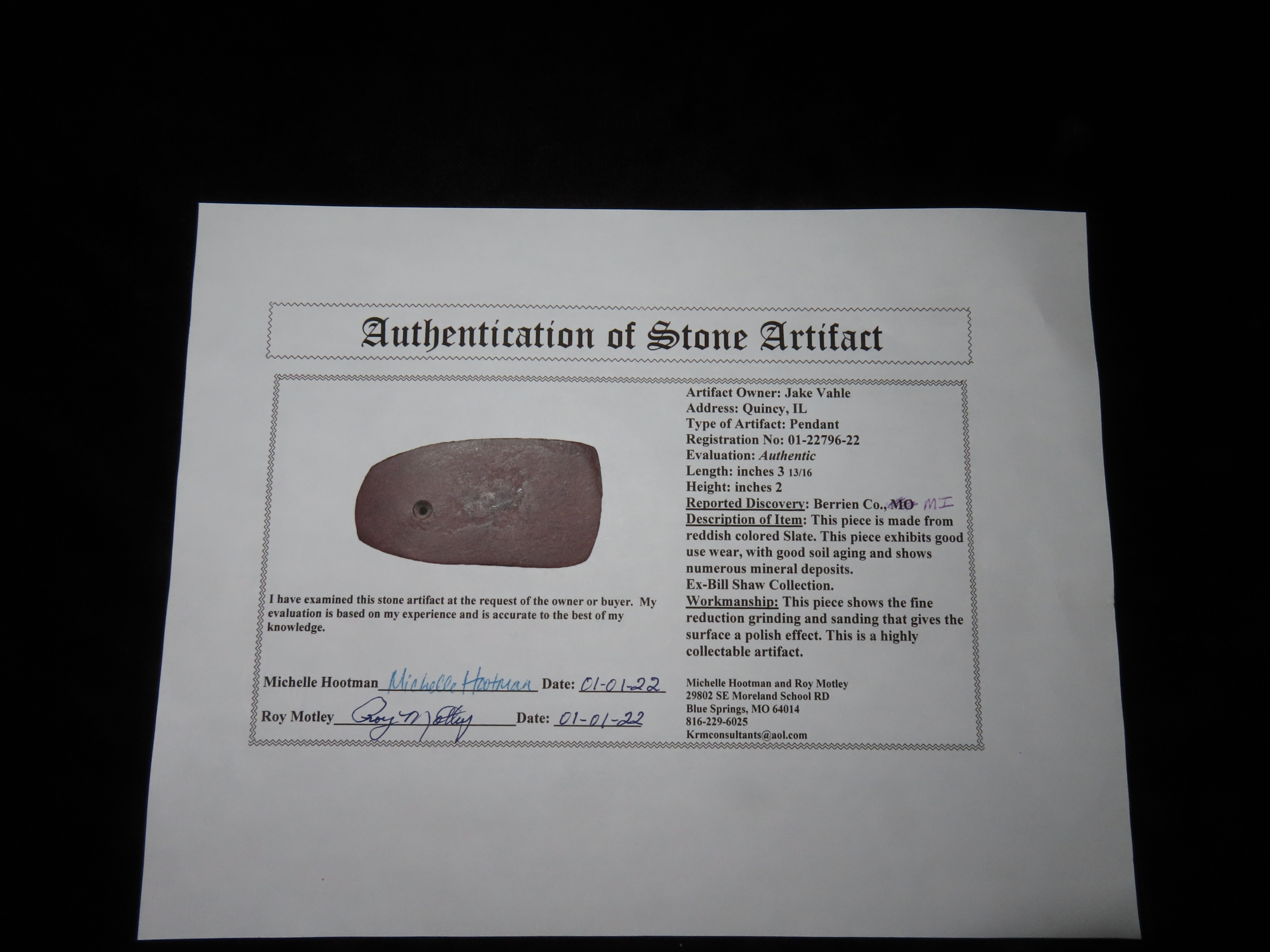3 13/16″ Red Slate Pendant, Motley COA, found in Berrian Co., Michigan, Ex Bill Shaw Collection