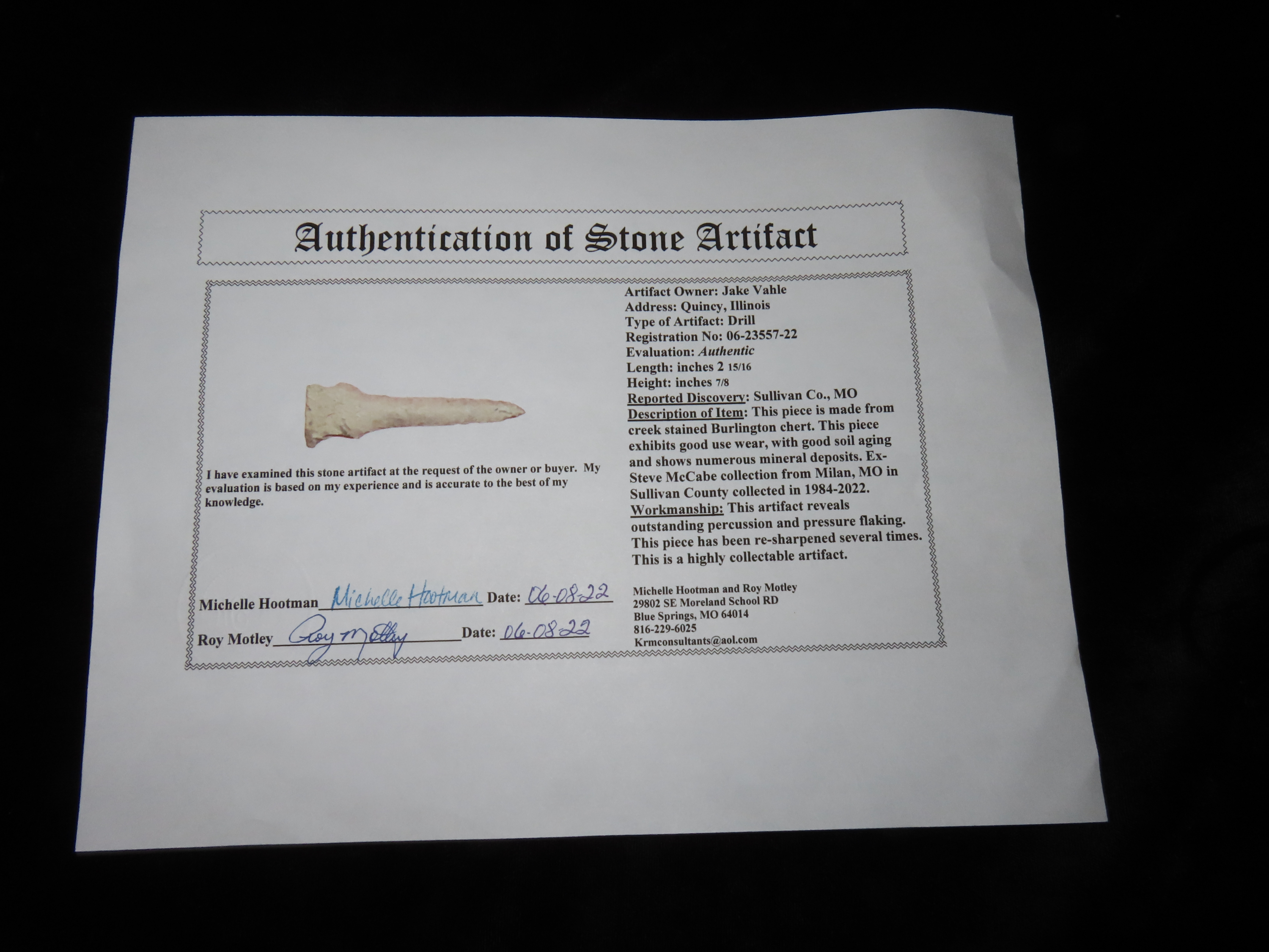 2 15/16″ Drill, Motley COA, found in Missouri, Ex Steve McCabe Collection