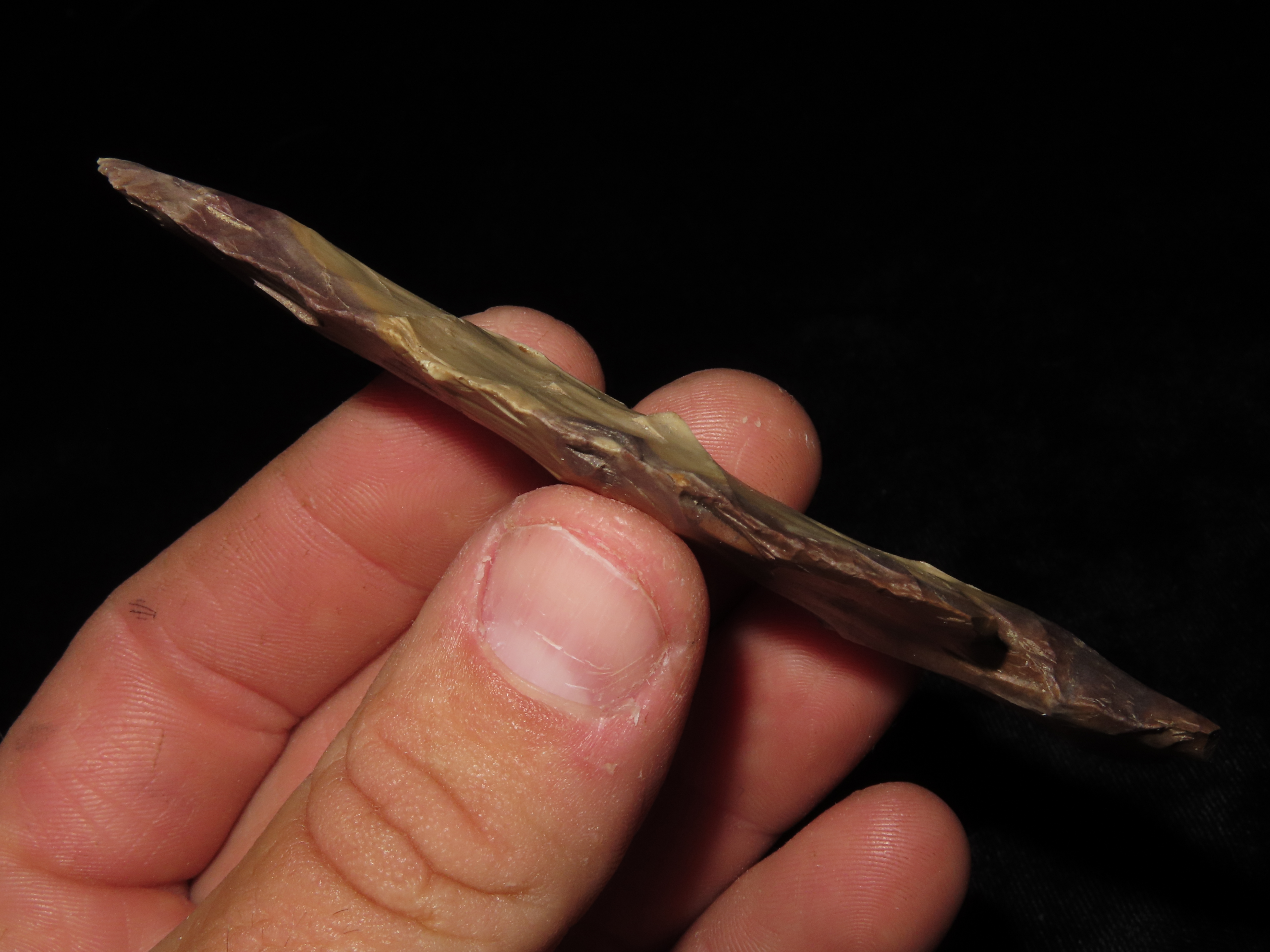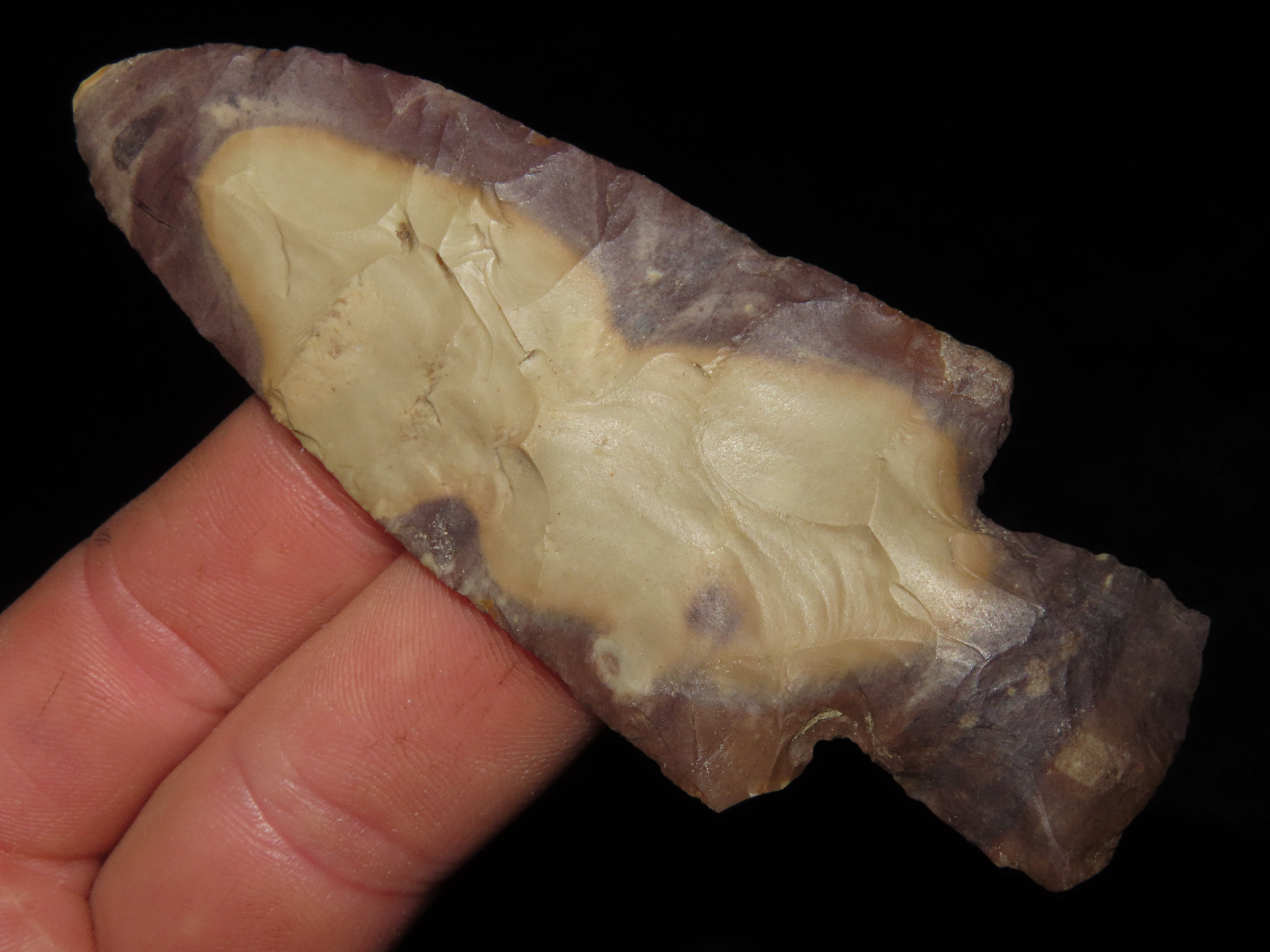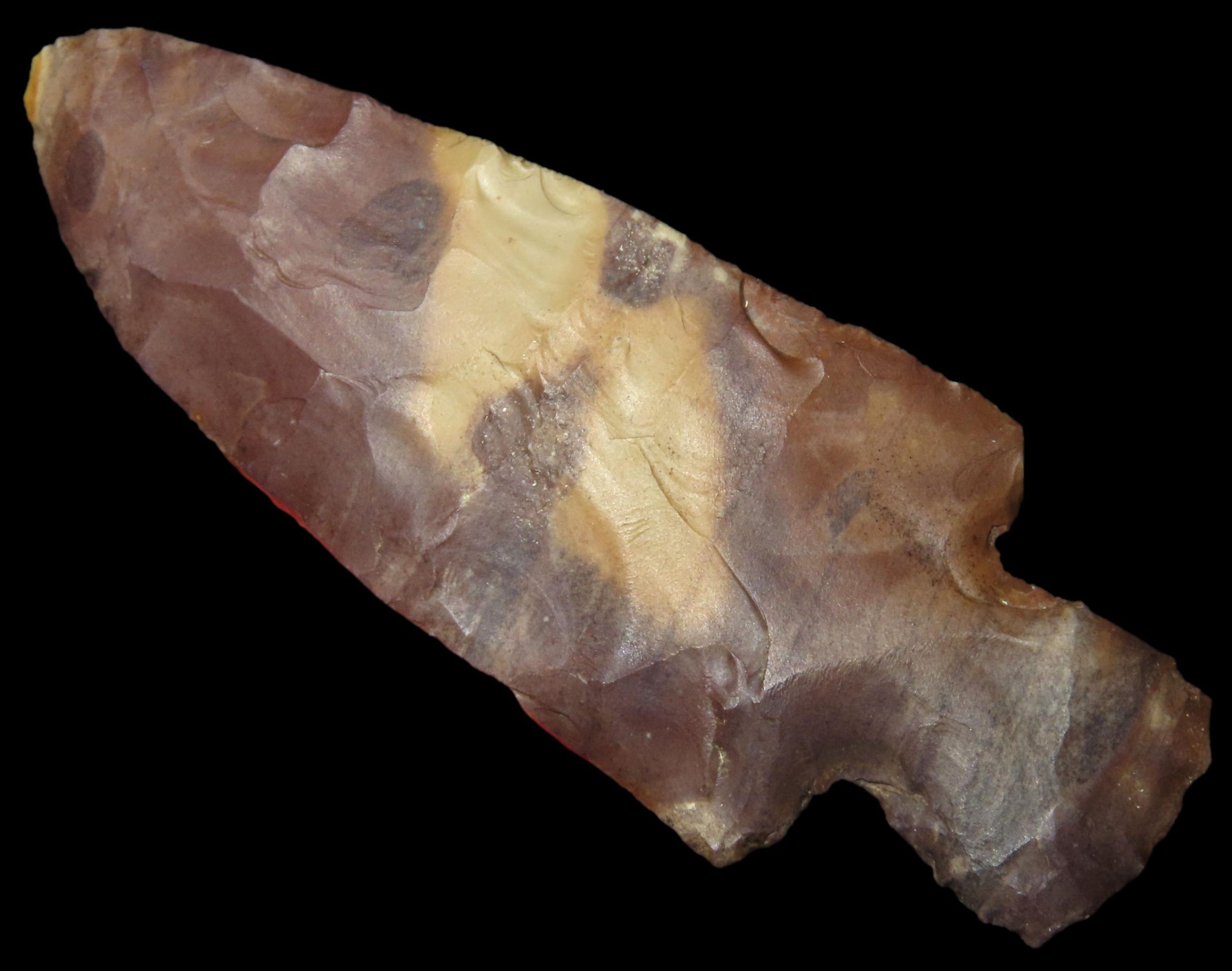 3 7/8″ COLORFUL STEMMED BASKET MAKERS KNIFE, LINCOLN COUNTY COLORADO, INCREDIBLE EXAMPLE OF A LARGE RARE TYPE, HEAVILY PATINATED ARROWHEAD