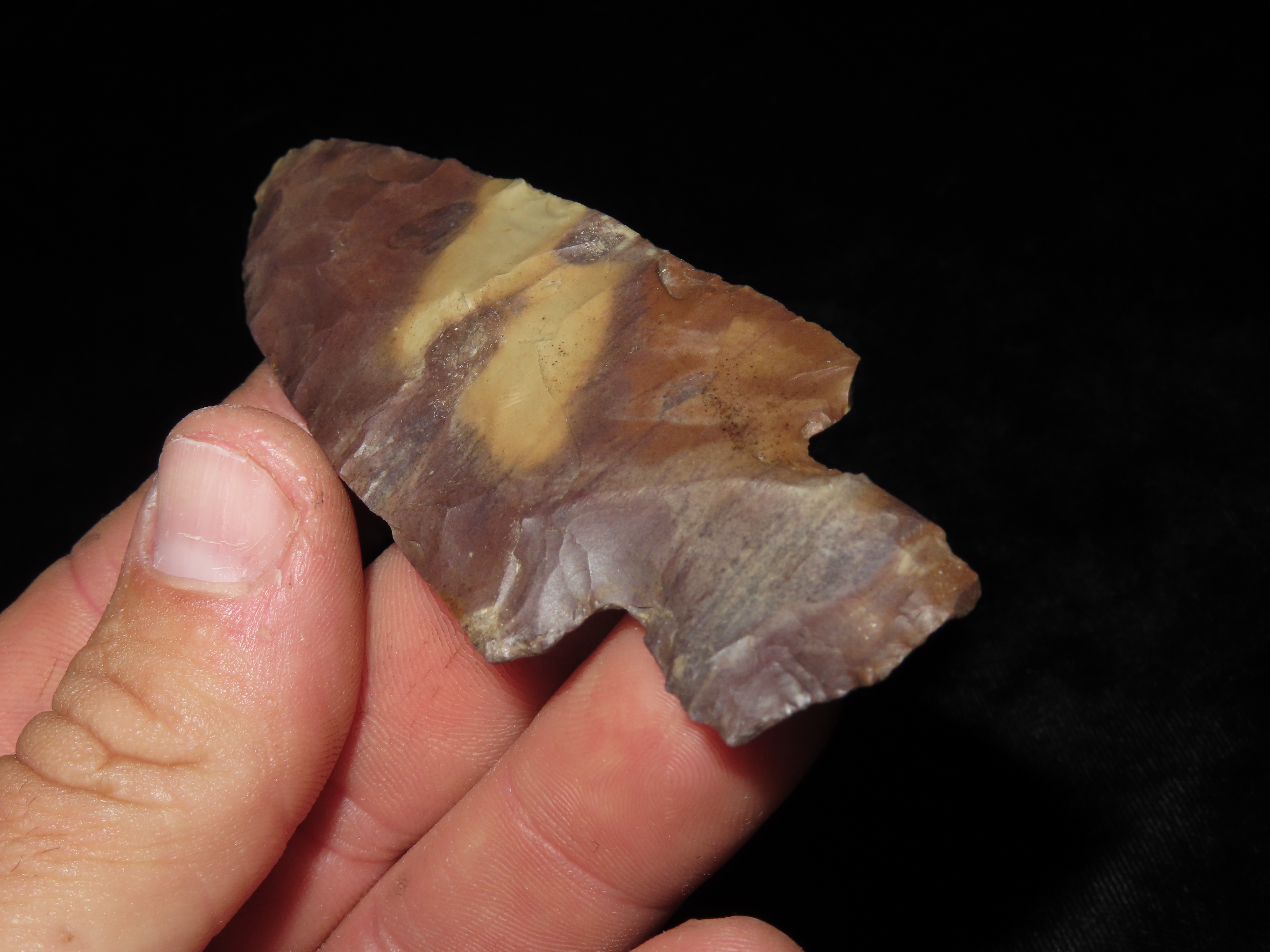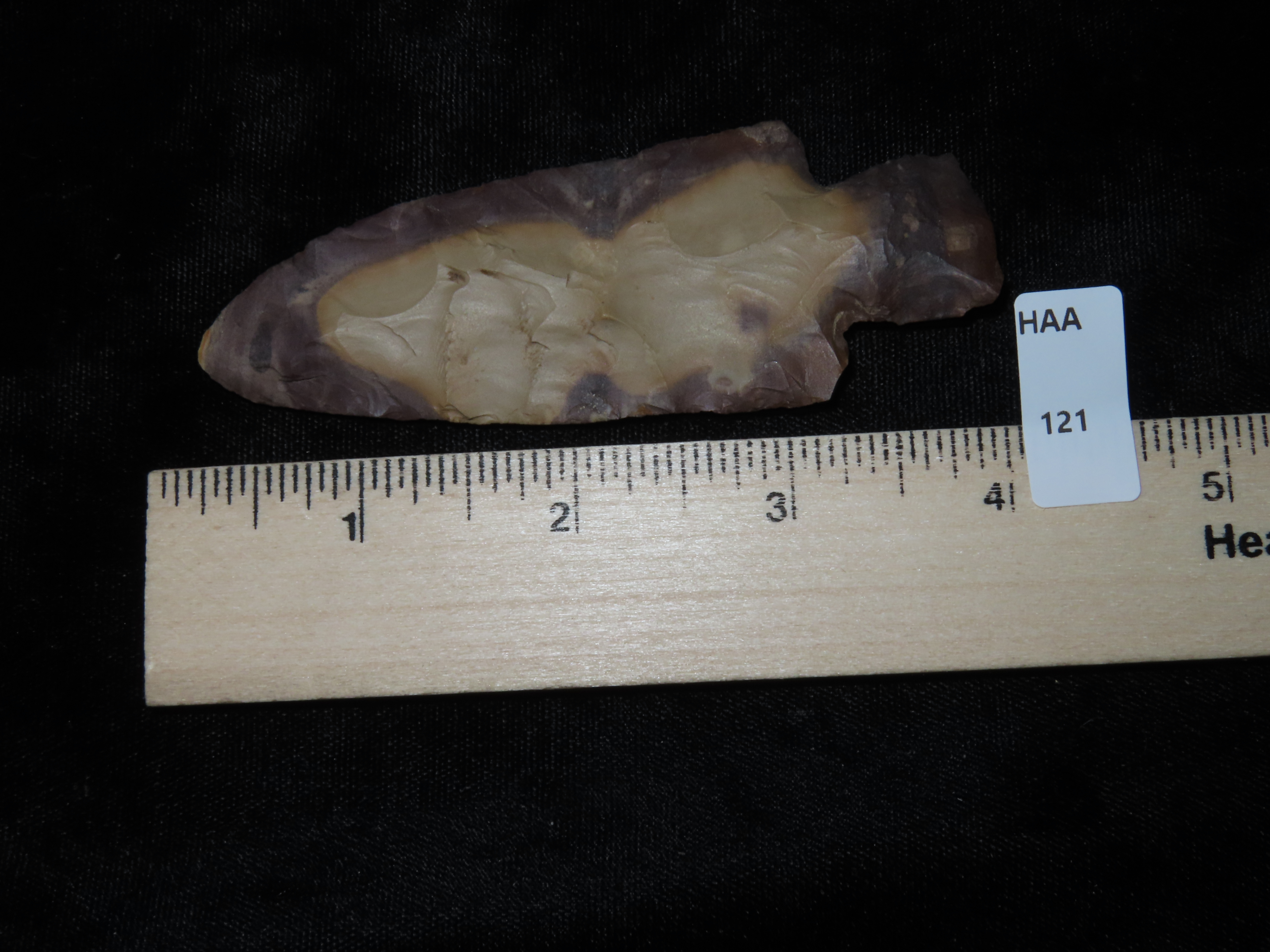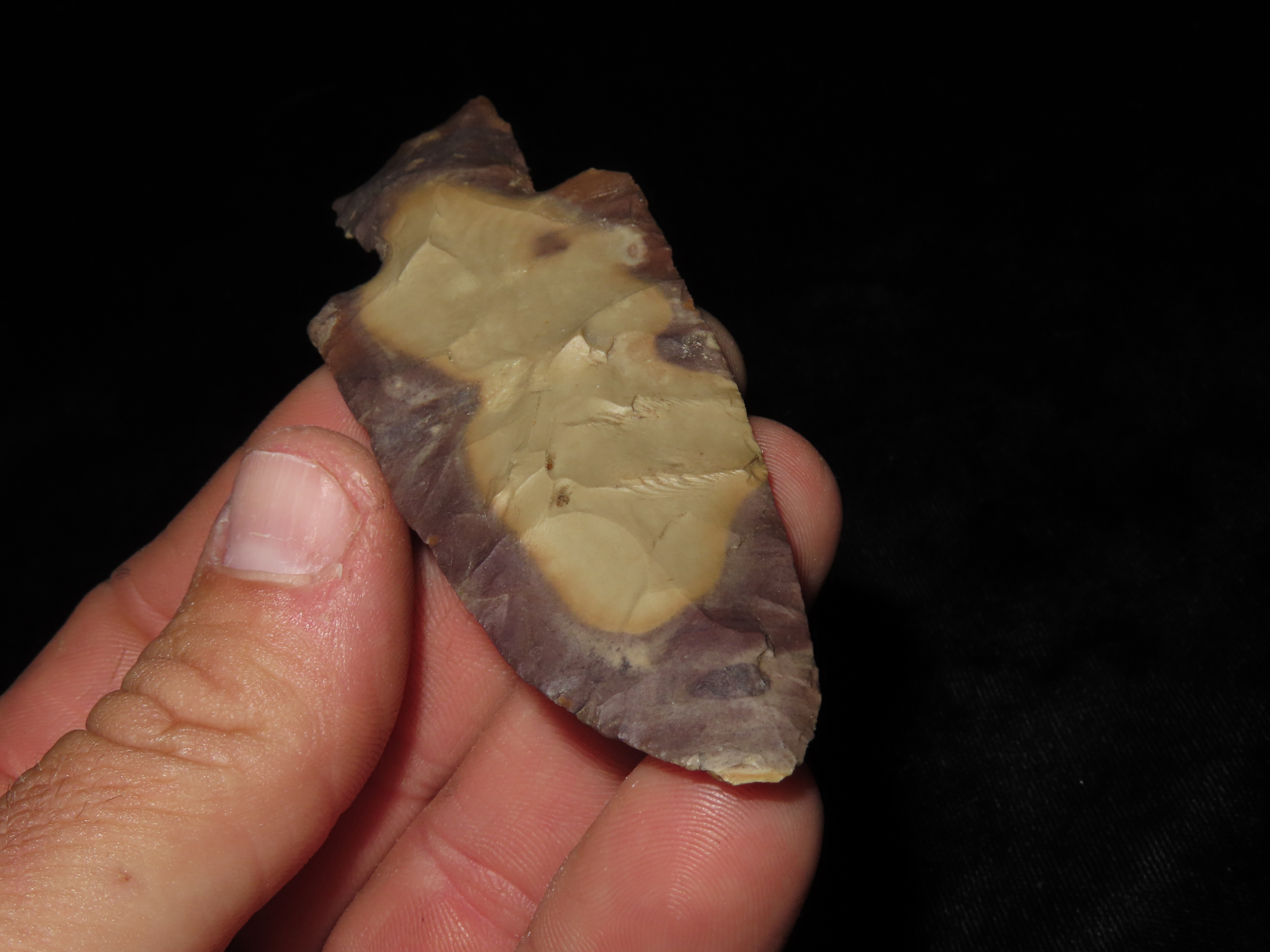 3 7/8″ COLORFUL STEMMED BASKET MAKERS KNIFE, LINCOLN COUNTY COLORADO, INCREDIBLE EXAMPLE OF A LARGE RARE TYPE, HEAVILY PATINATED ARROWHEAD