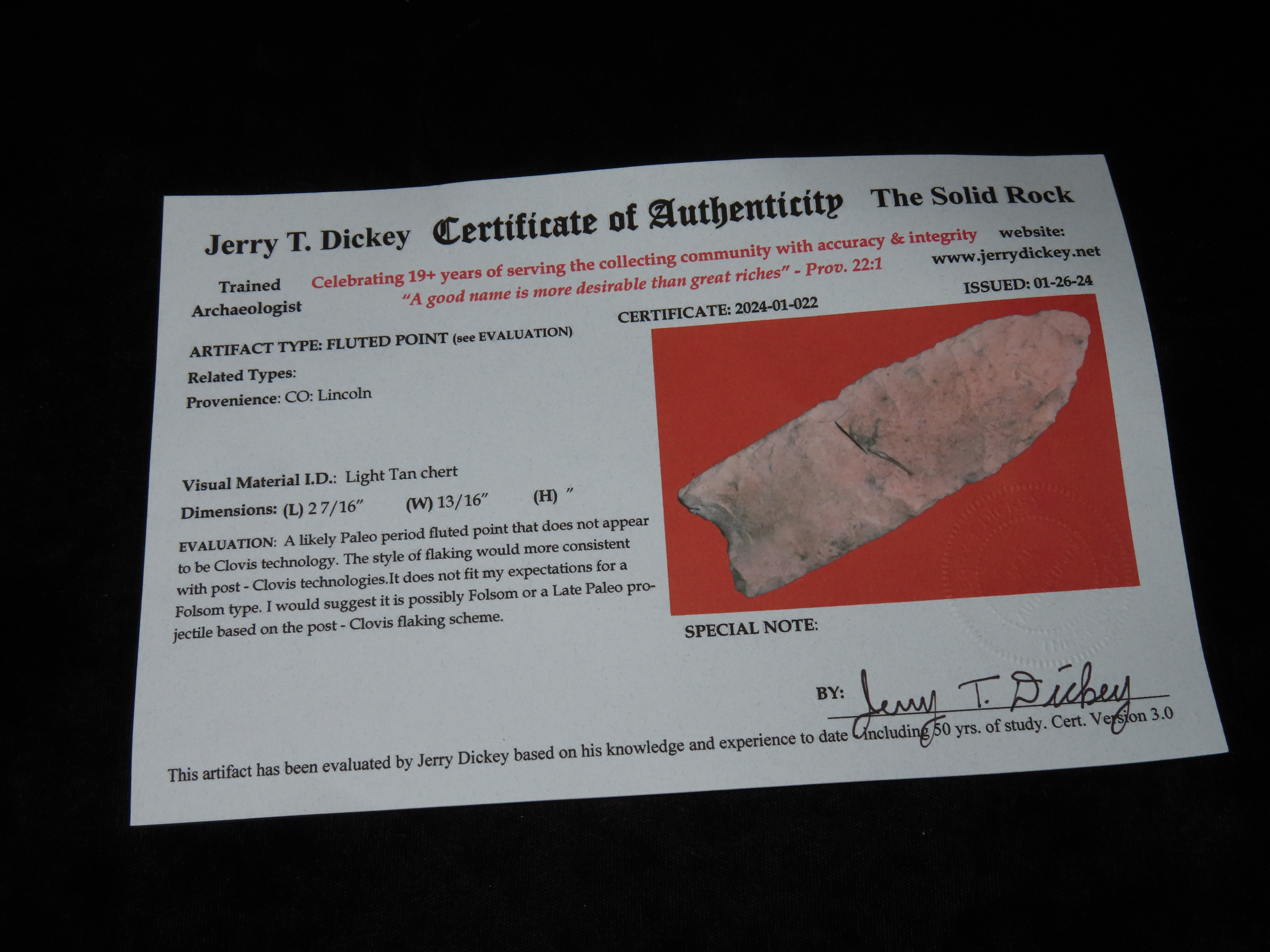 2 7/16″ PALEO FLUTED FOLSOM, DICKEY COA, LINCOLN COUNTY COLORADO, GREAT EXAMPLE, NO BRAINER PATINA, INDIAN ARROWHEAD, ARTIFACT