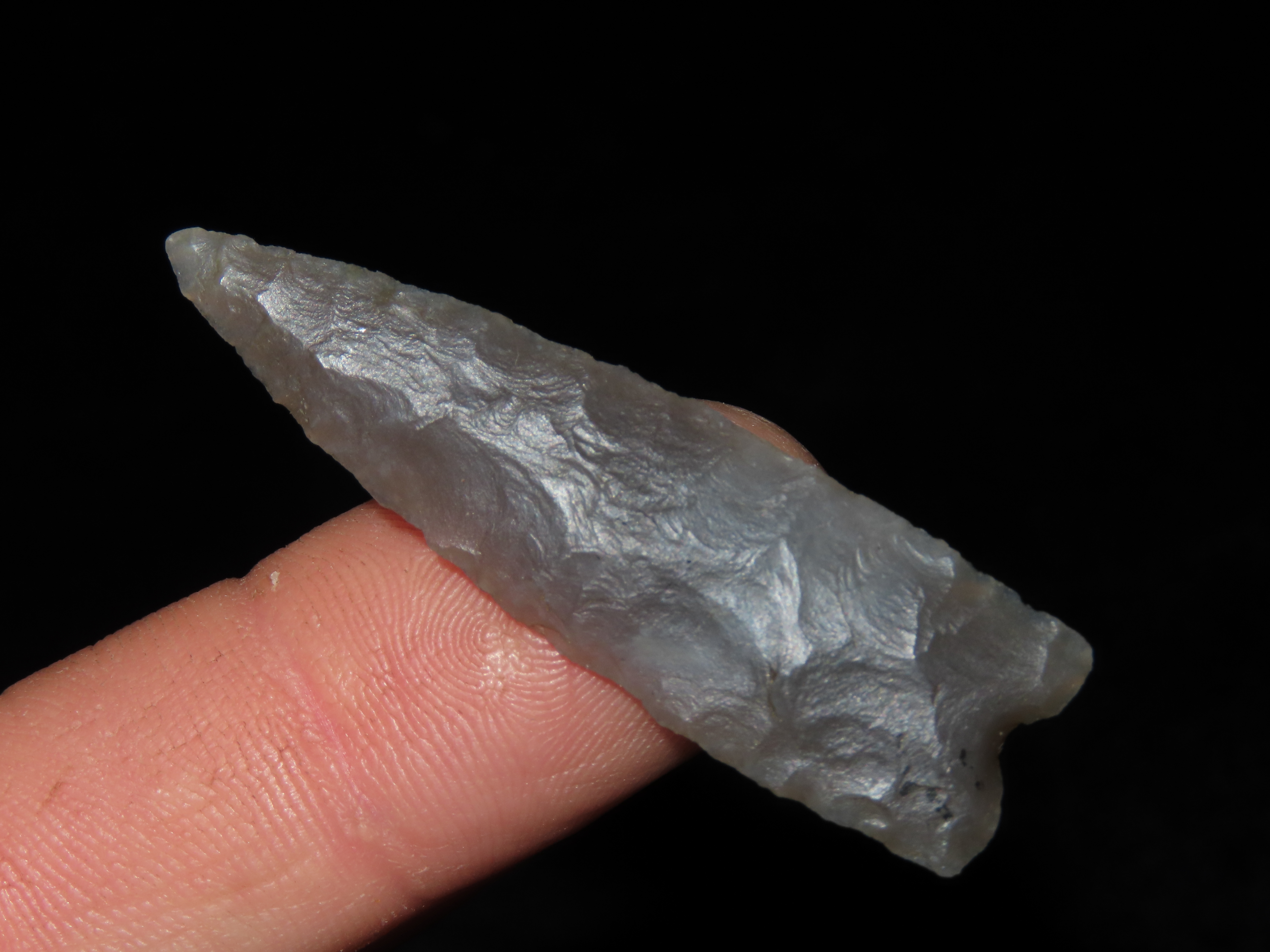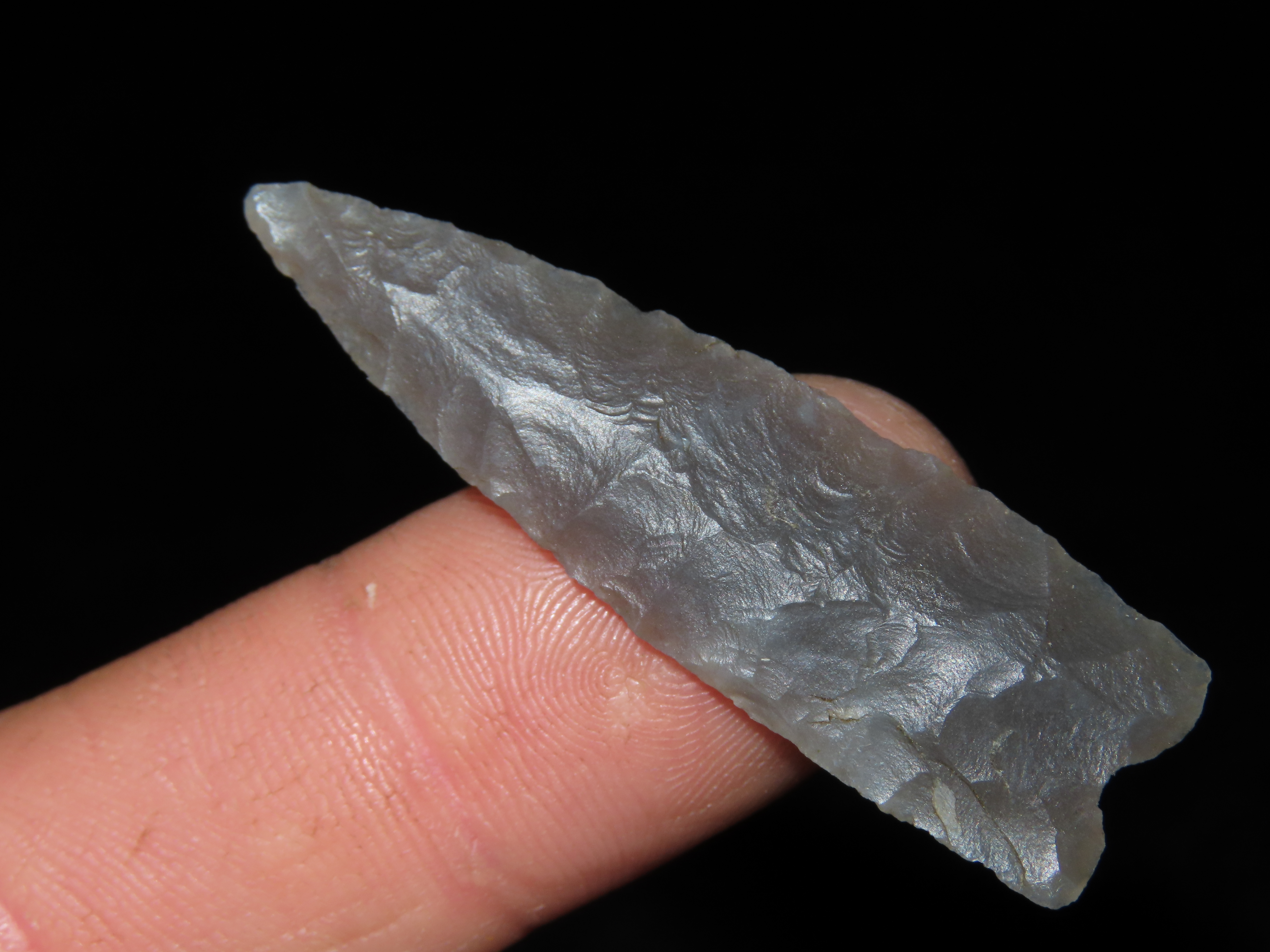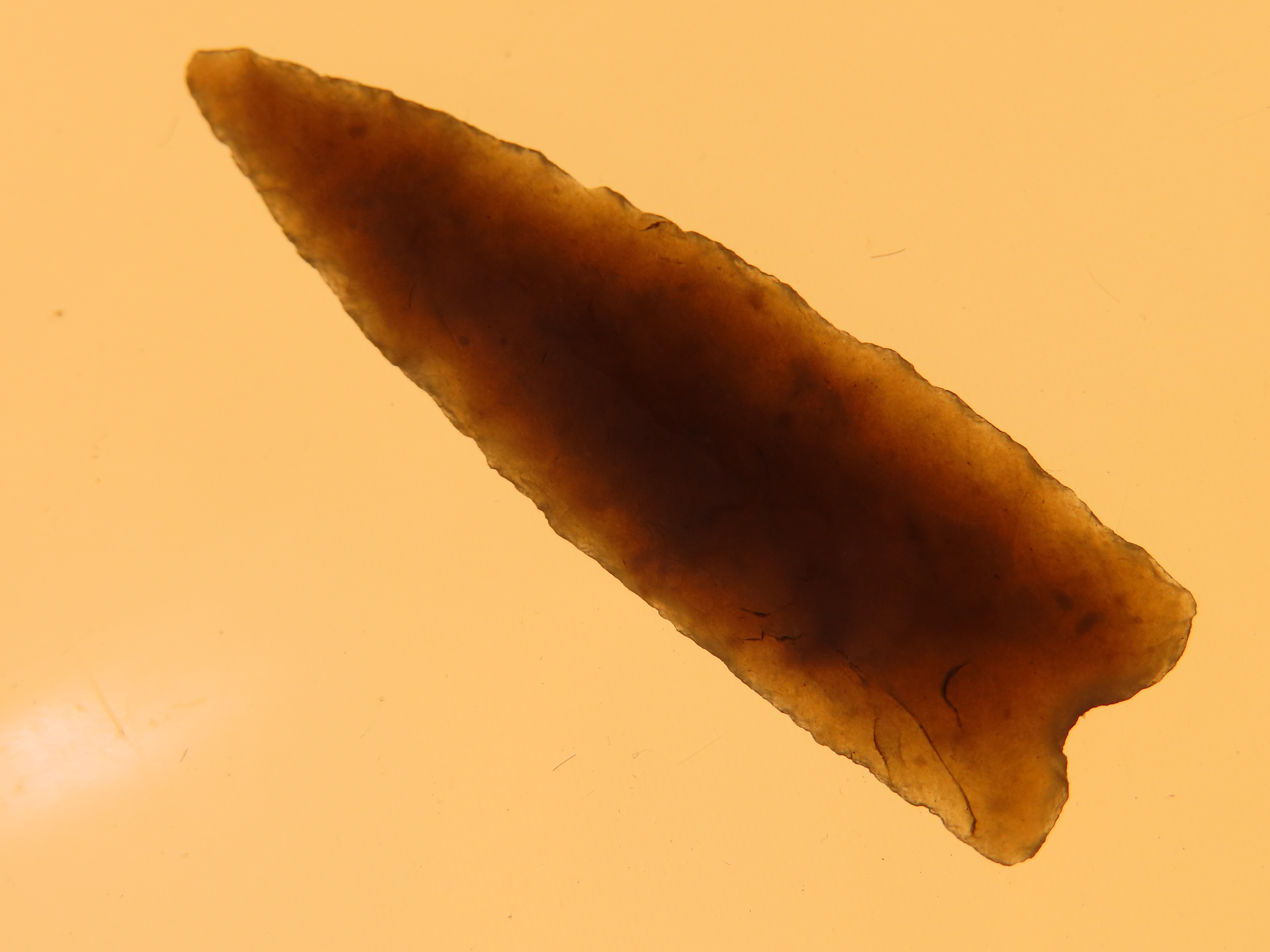 1 15/16″ KNIFE RIVER FLINT PLAINVIEW, NICE HIGH PLAINS PALEO, HIGHLY TRANSLUCENT WELL FLAKED EXAMPLE, INDIAN ARROWHEAD