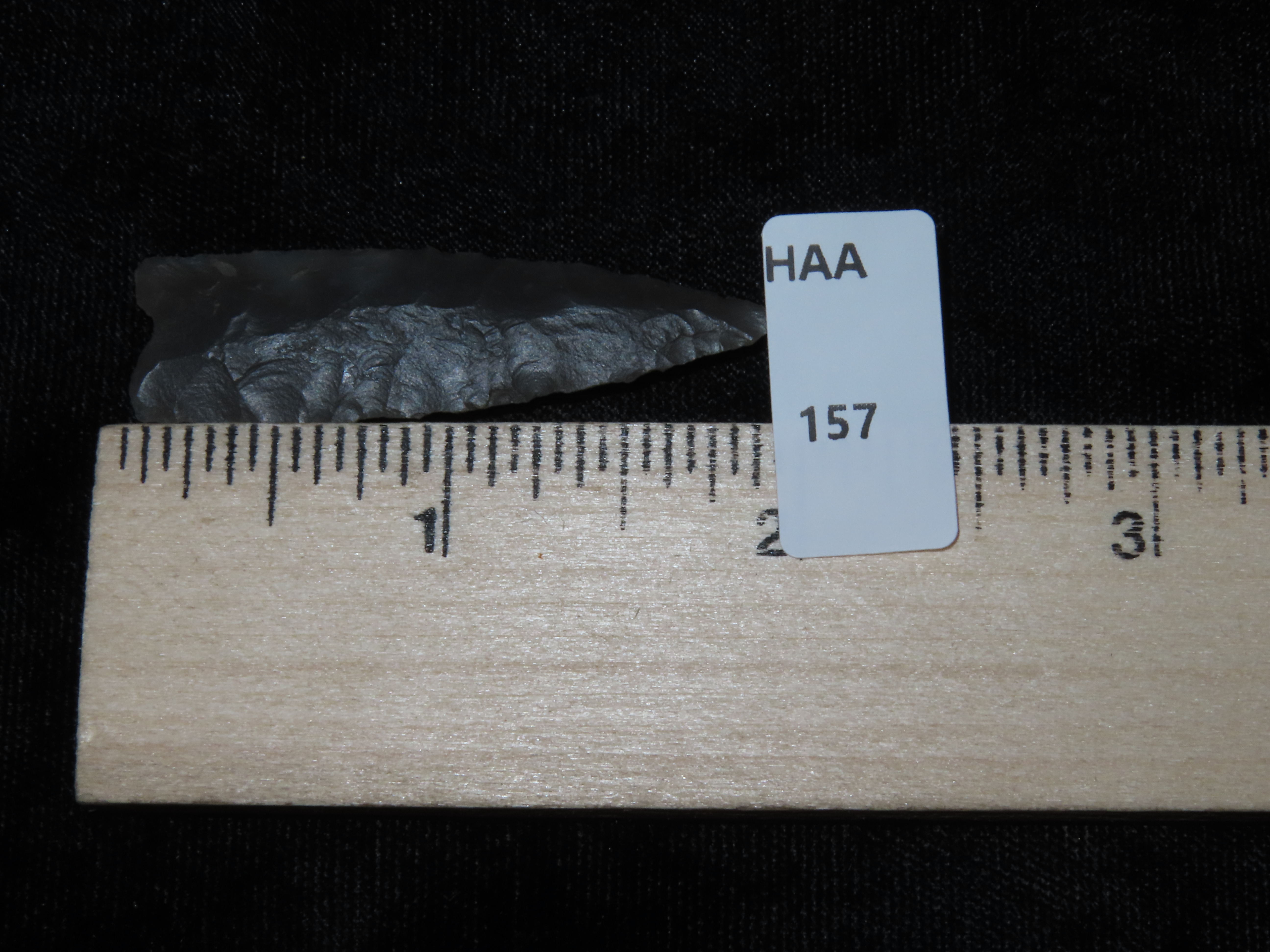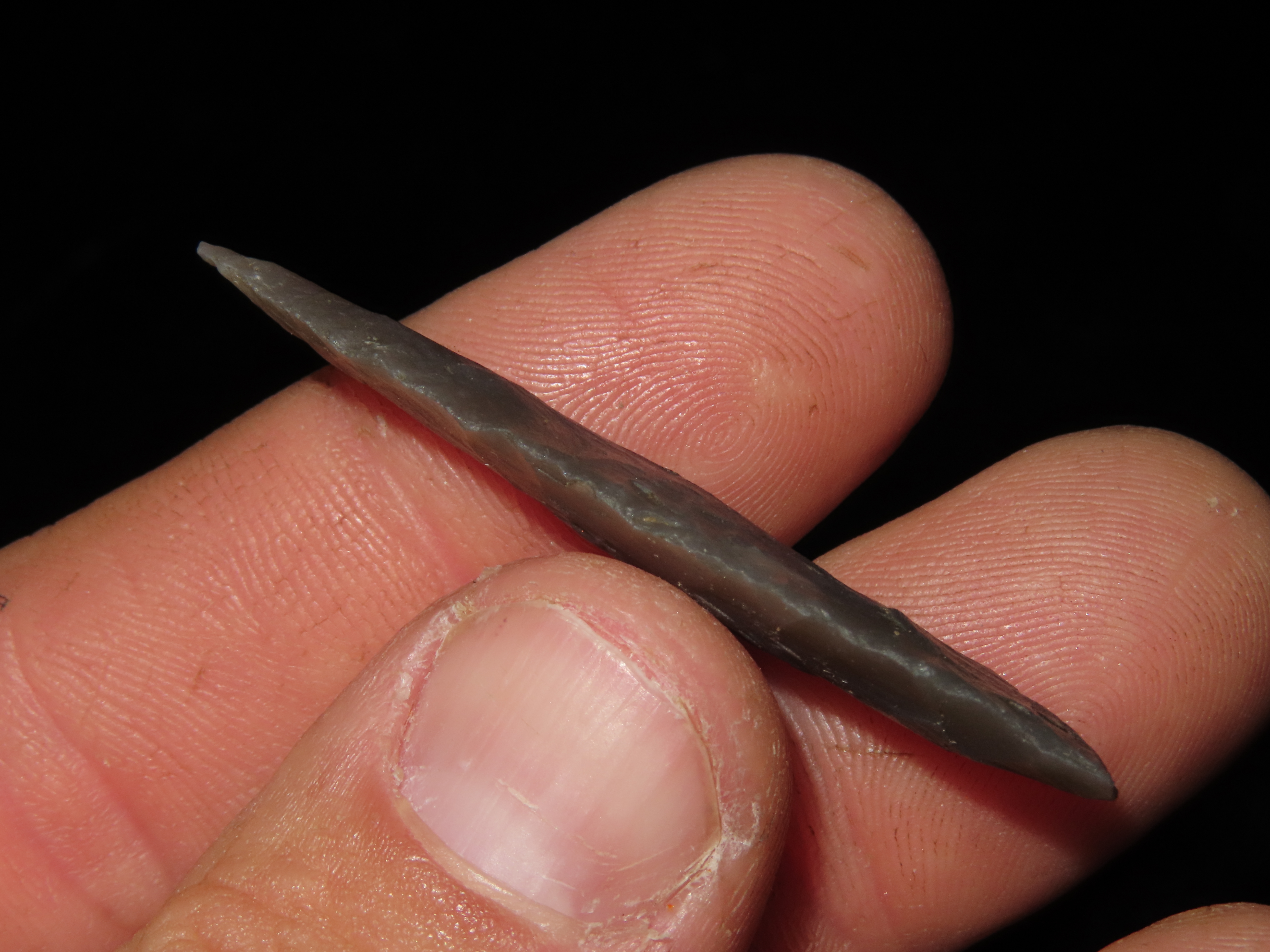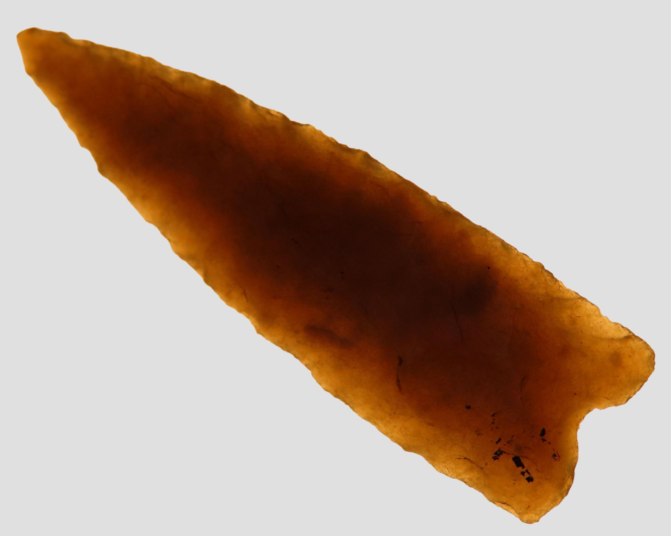 1 15/16″ KNIFE RIVER FLINT PLAINVIEW, NICE HIGH PLAINS PALEO, HIGHLY TRANSLUCENT WELL FLAKED EXAMPLE, INDIAN ARROWHEAD