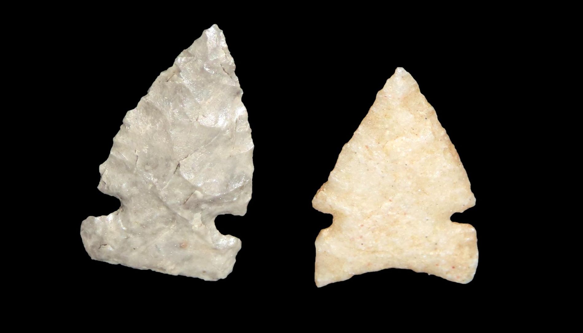 NICE PAIR OF SIDE NOTCH BIRD POINTS FOUND BY JOHN GROTTE IN SOUTH DAKOTA, MALLORY & CUT BANK SIDE NOTCH, PLAINS INDIAN SIDENOTCH VARIETIES
