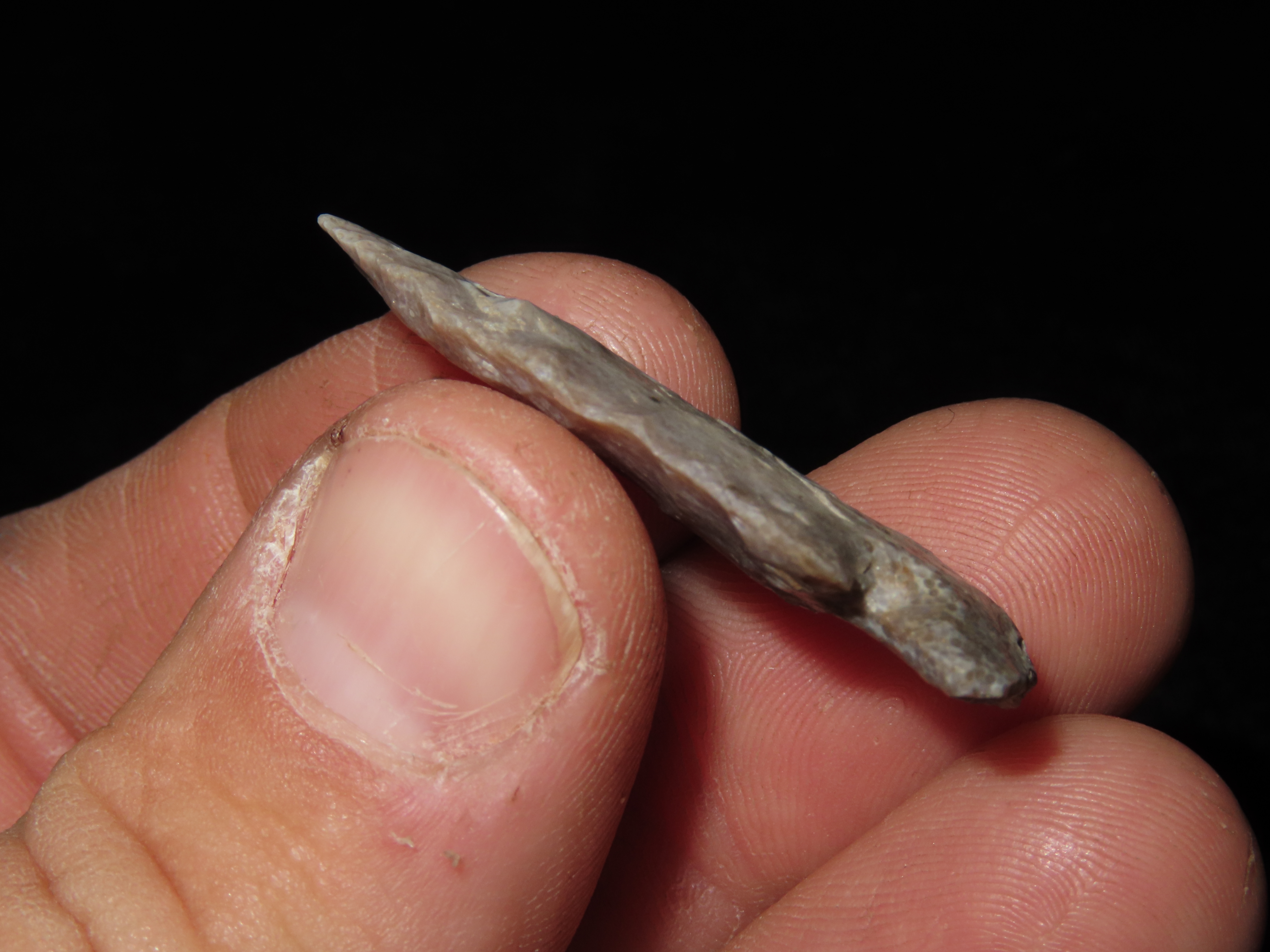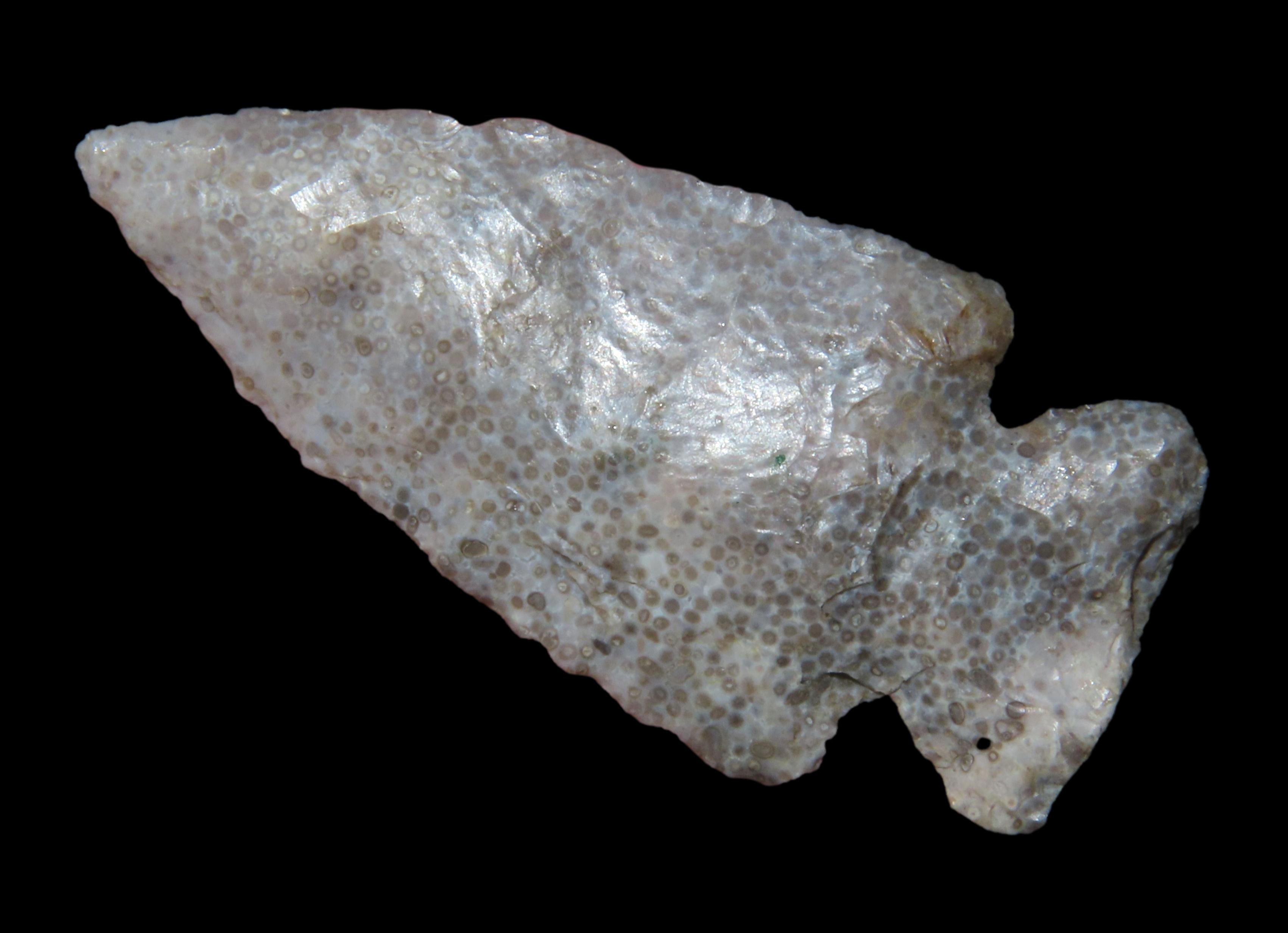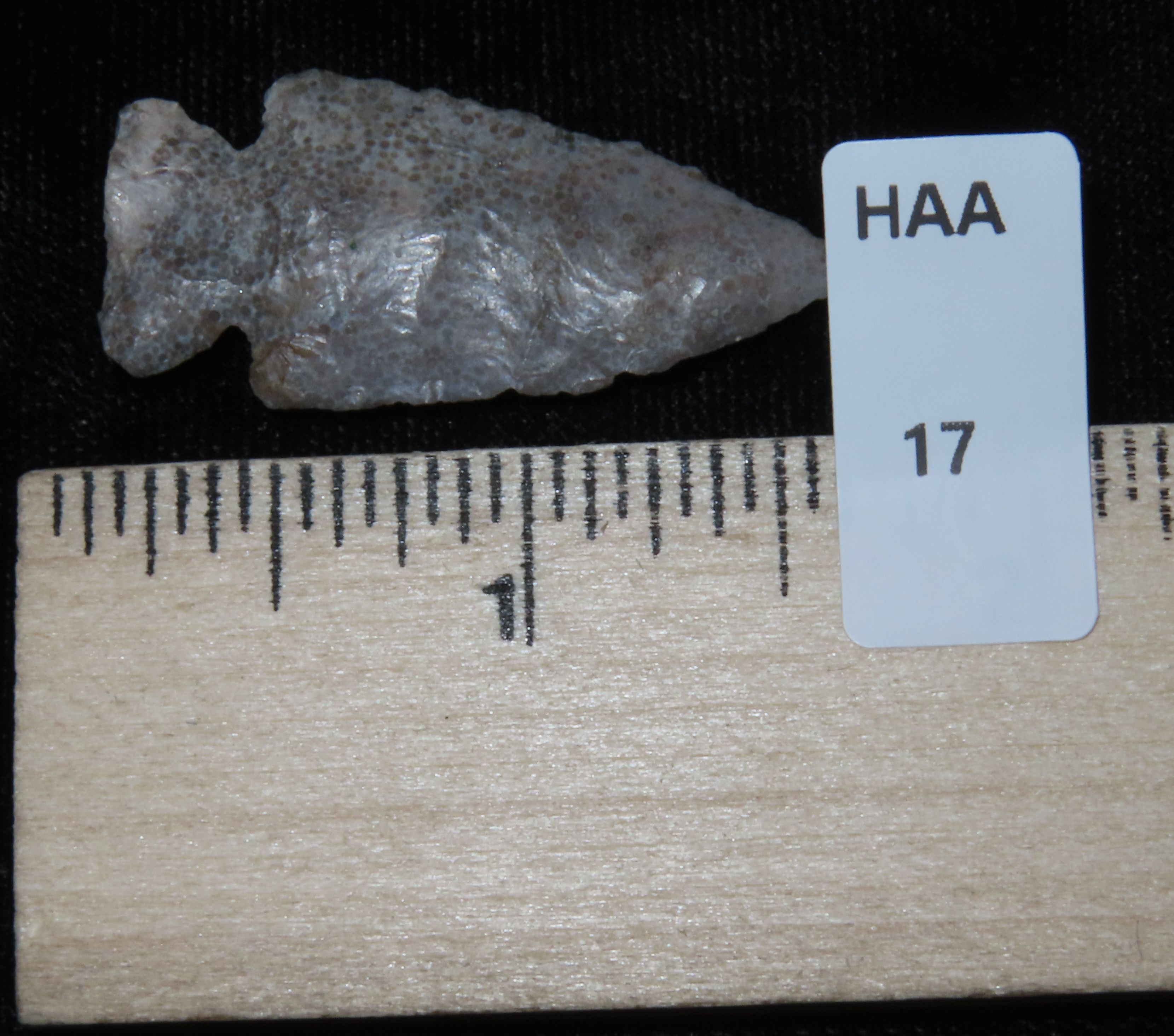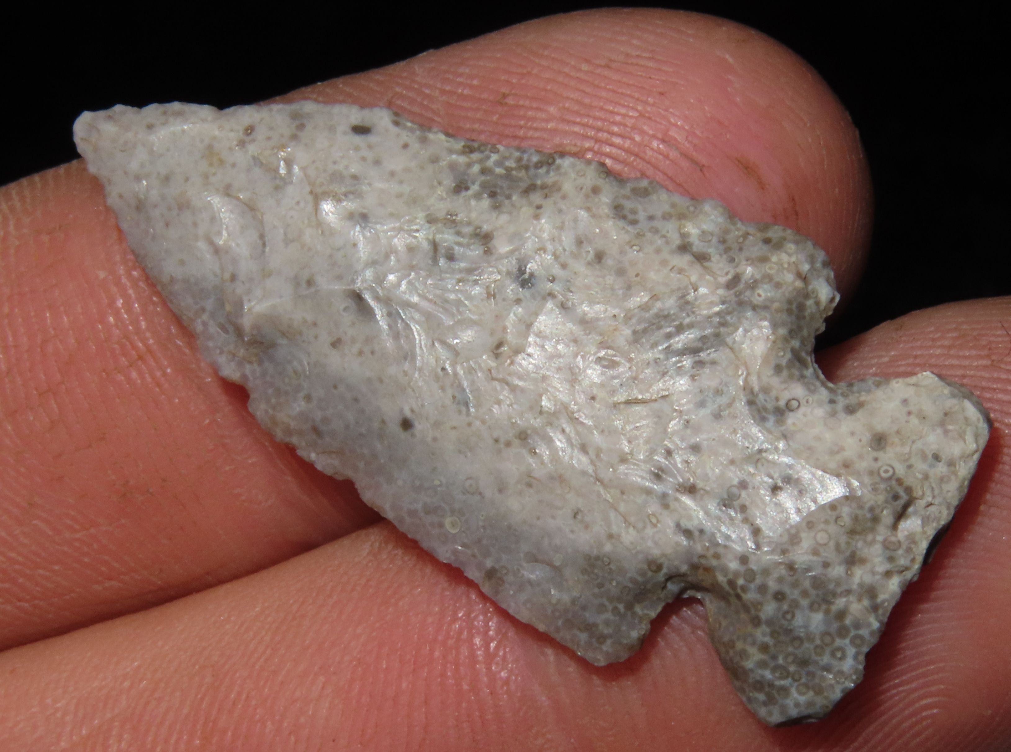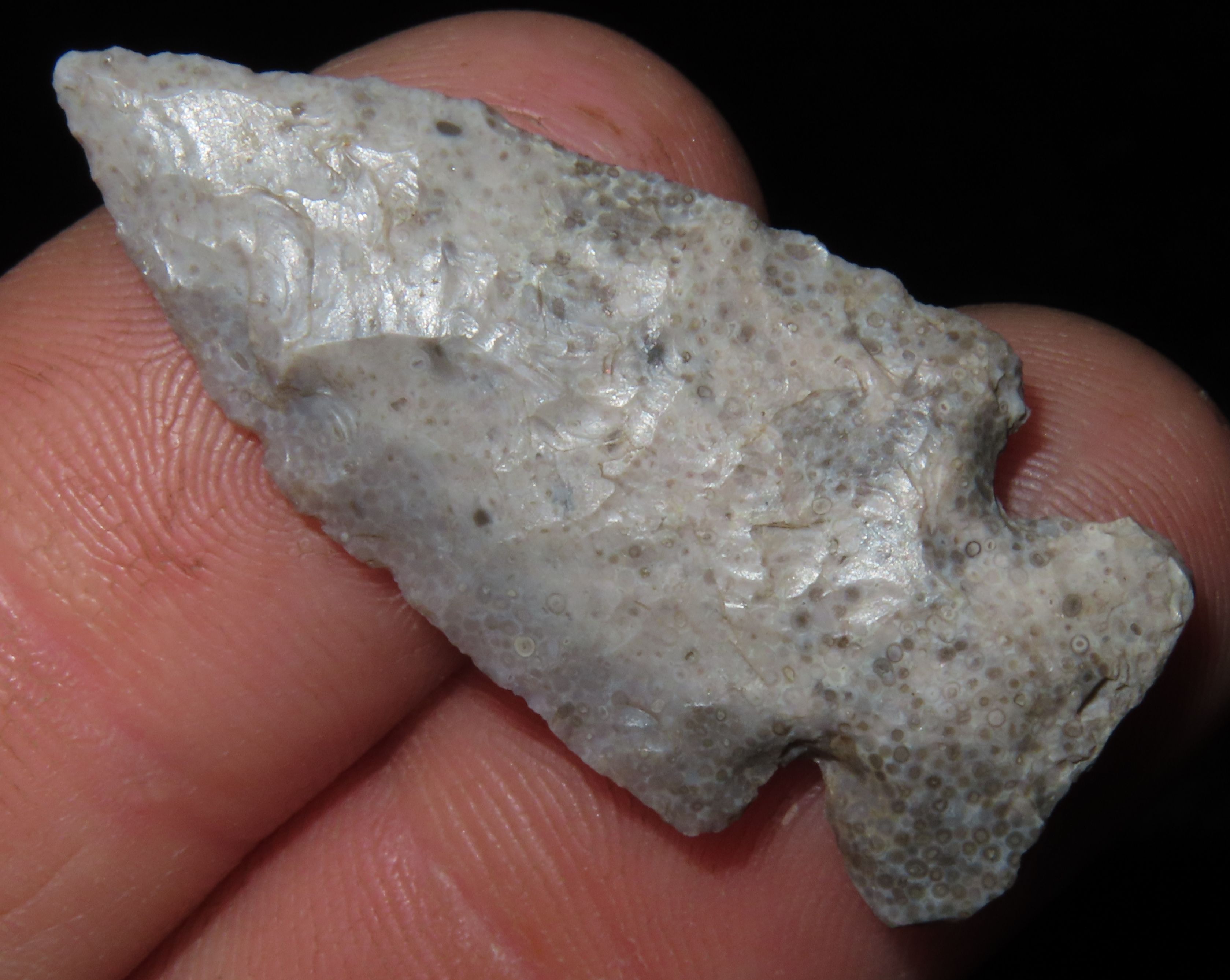 1 9/16″ OOLITIC CHERT BIRD POINT FOUND IN BENTON COUNTY MISSOURI, VERY WELL MADE, THIN EXAMPLE, INDIAN ARROWHEAD, ARTIFACT