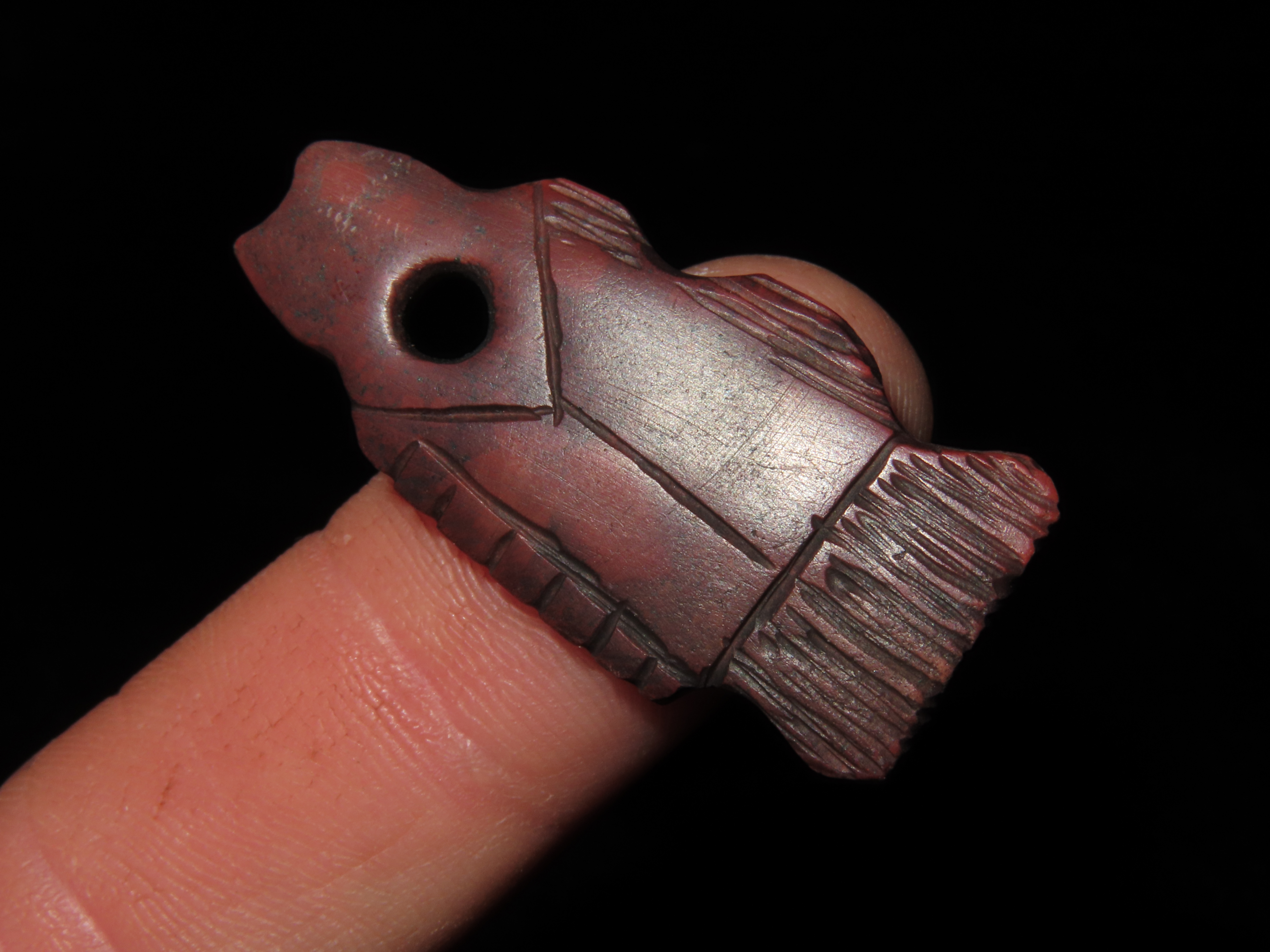 1 9/16″ SIOUX INDIANS CATLINITE FISH EFFIGY PENDANT, SOUTH DAKOTA, NICELY DETAILED EXAMPLE WITH NICE USE WEAR & PATINA