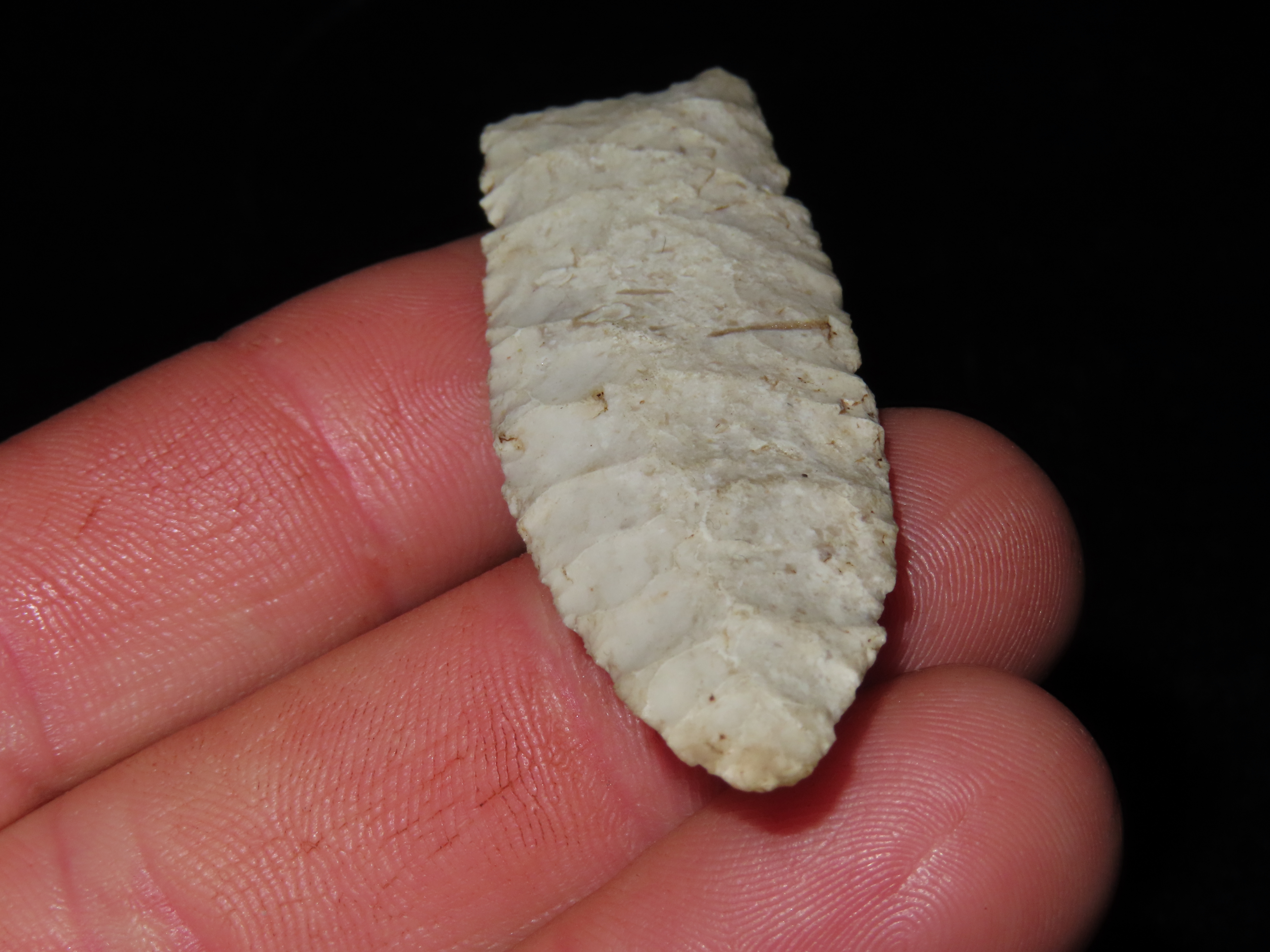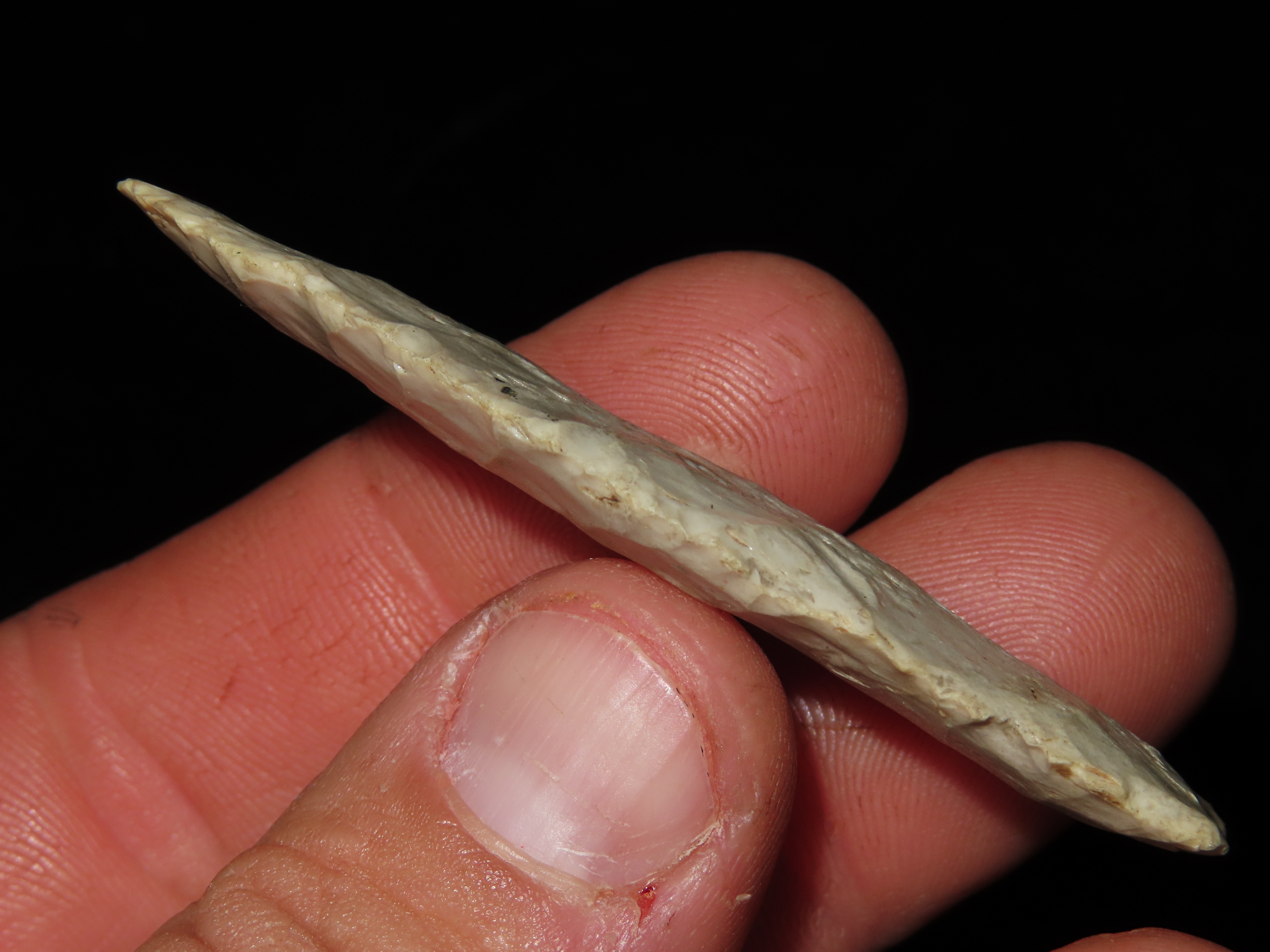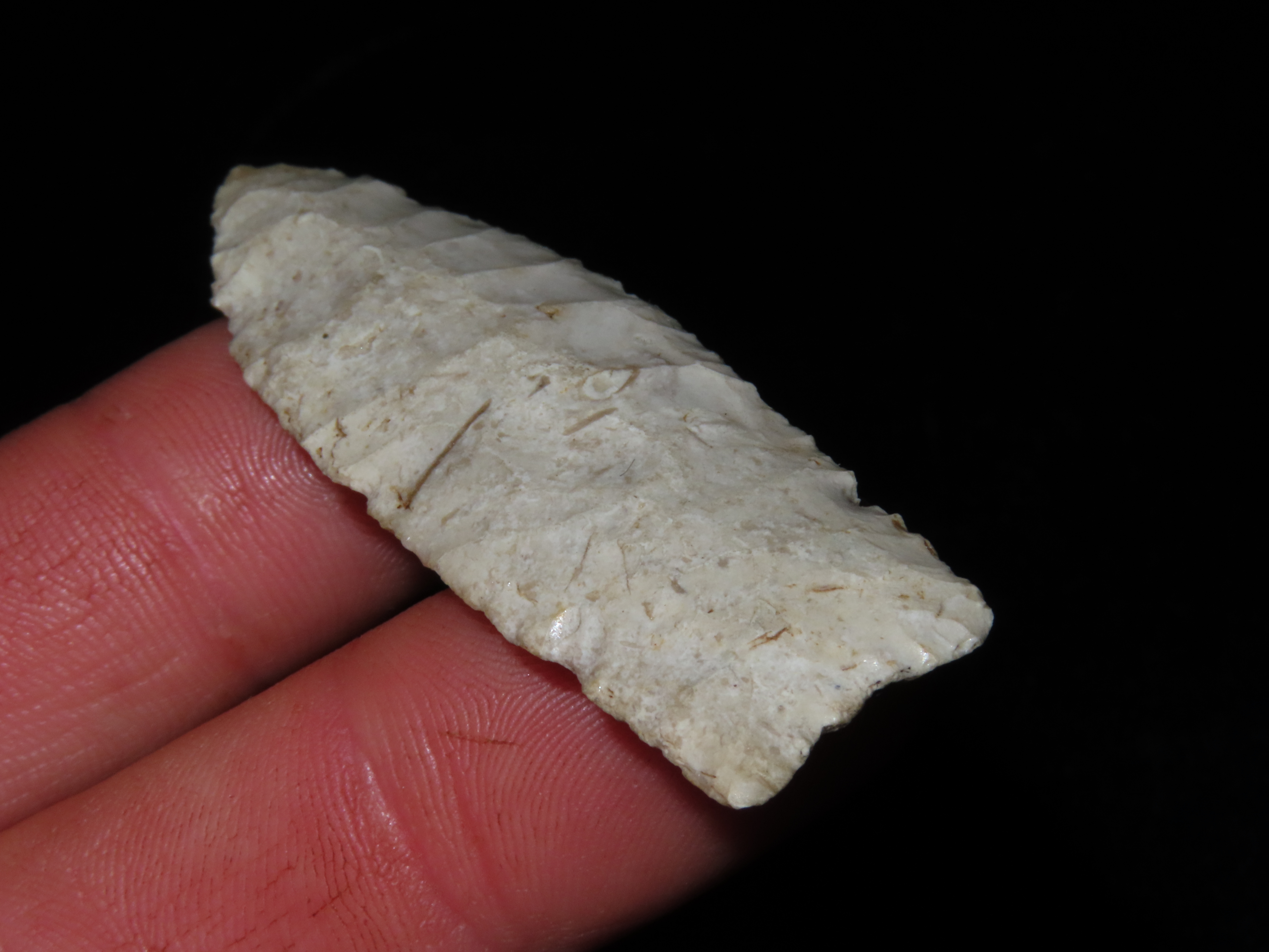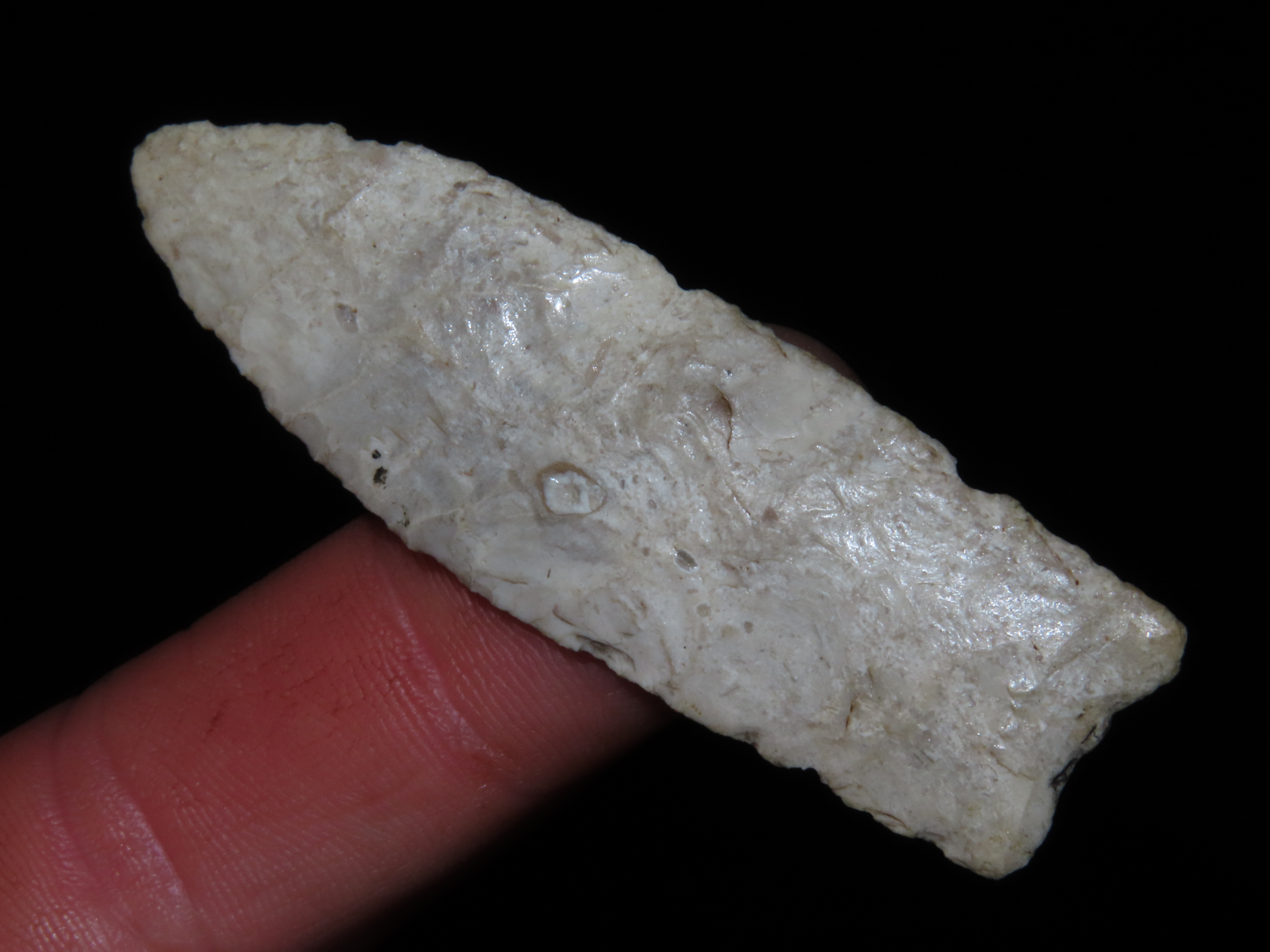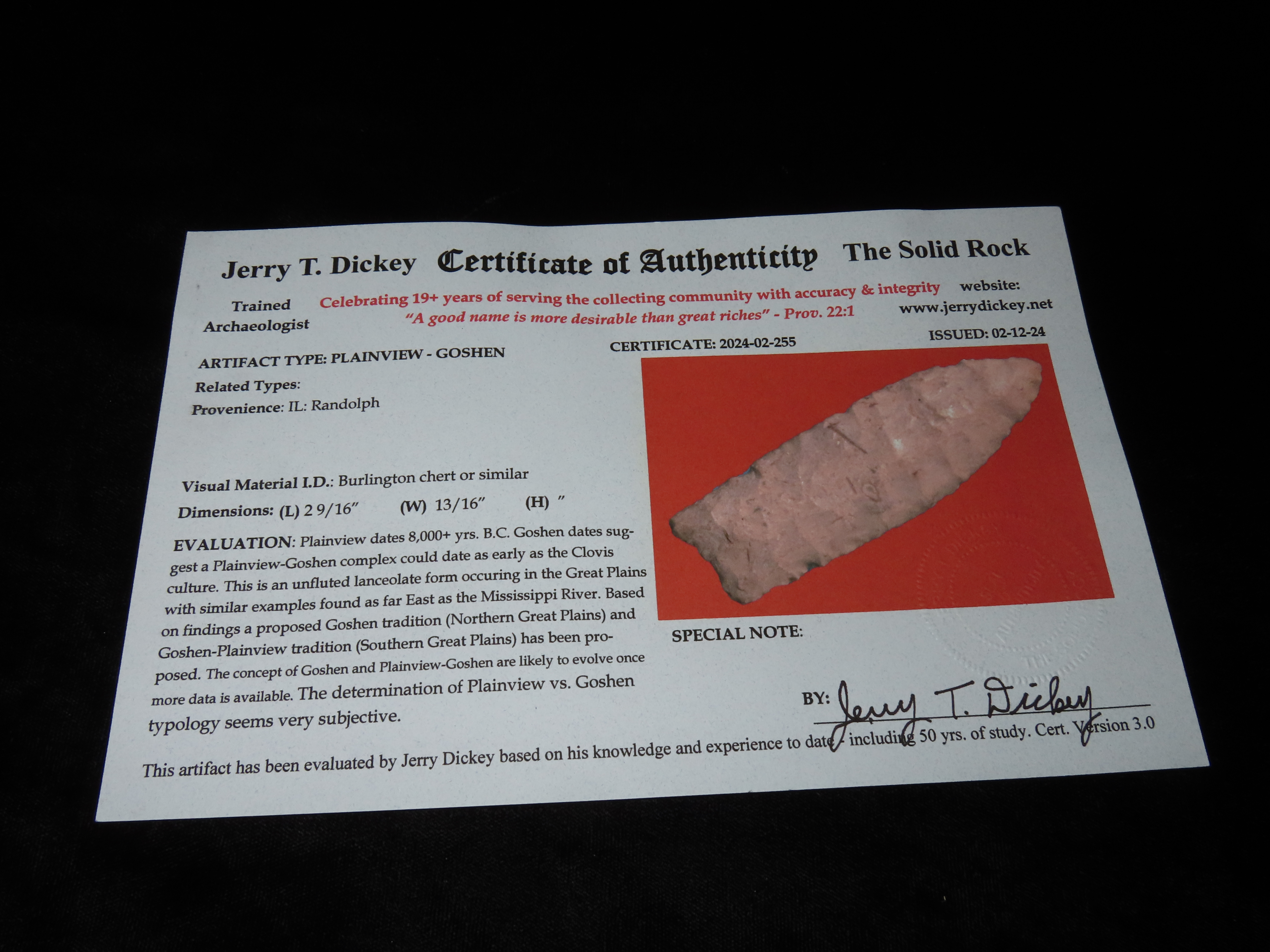 2 9/16″ PALEO GOSHEN, DICKEY COA, RANDOLPH COUNTY ILLINOIS, VERY FINELY FLAKED AND WELL PATINATED EXAMPLE, PLANVIEW, CLOVIS, ARROWHEAD