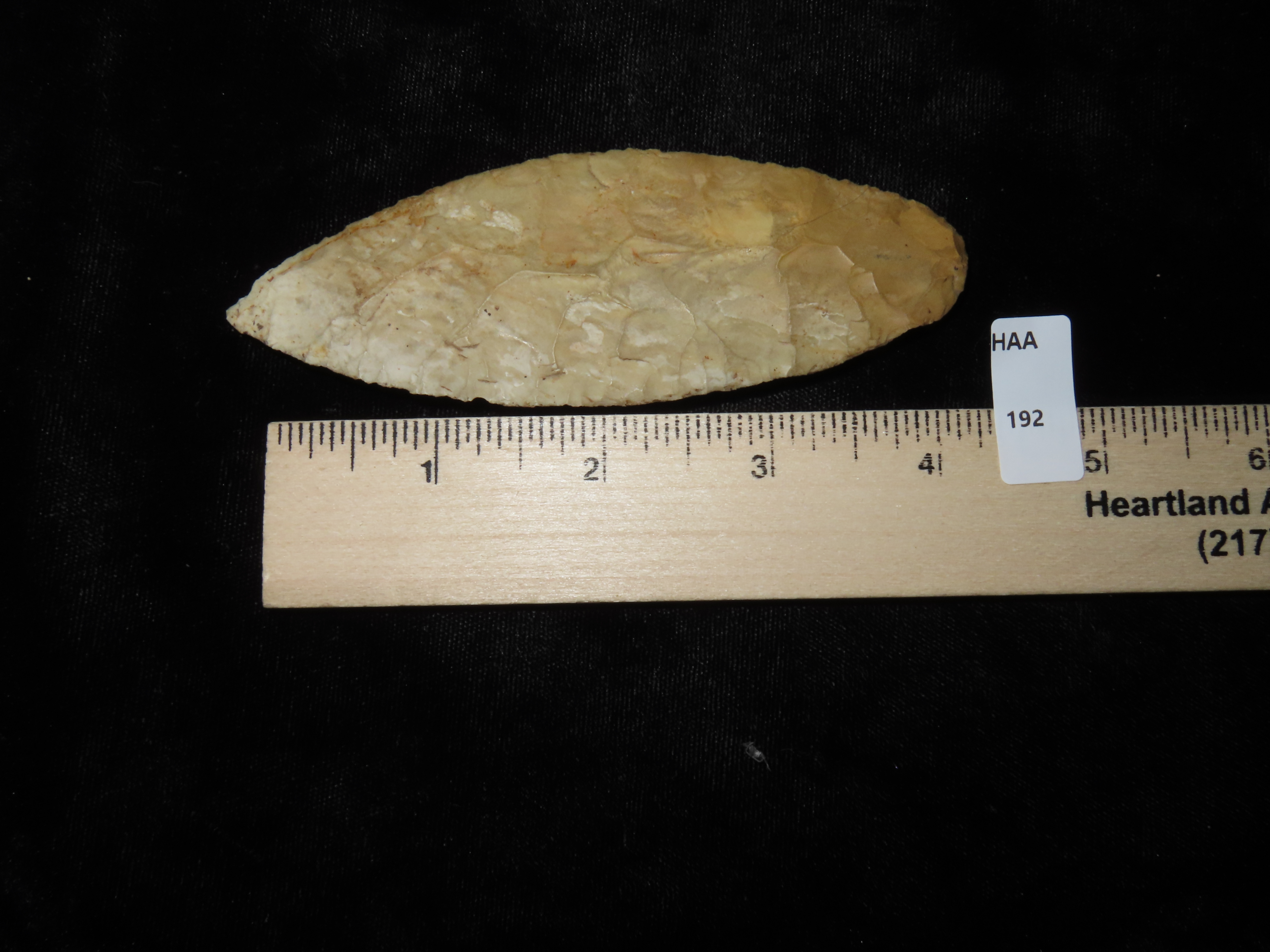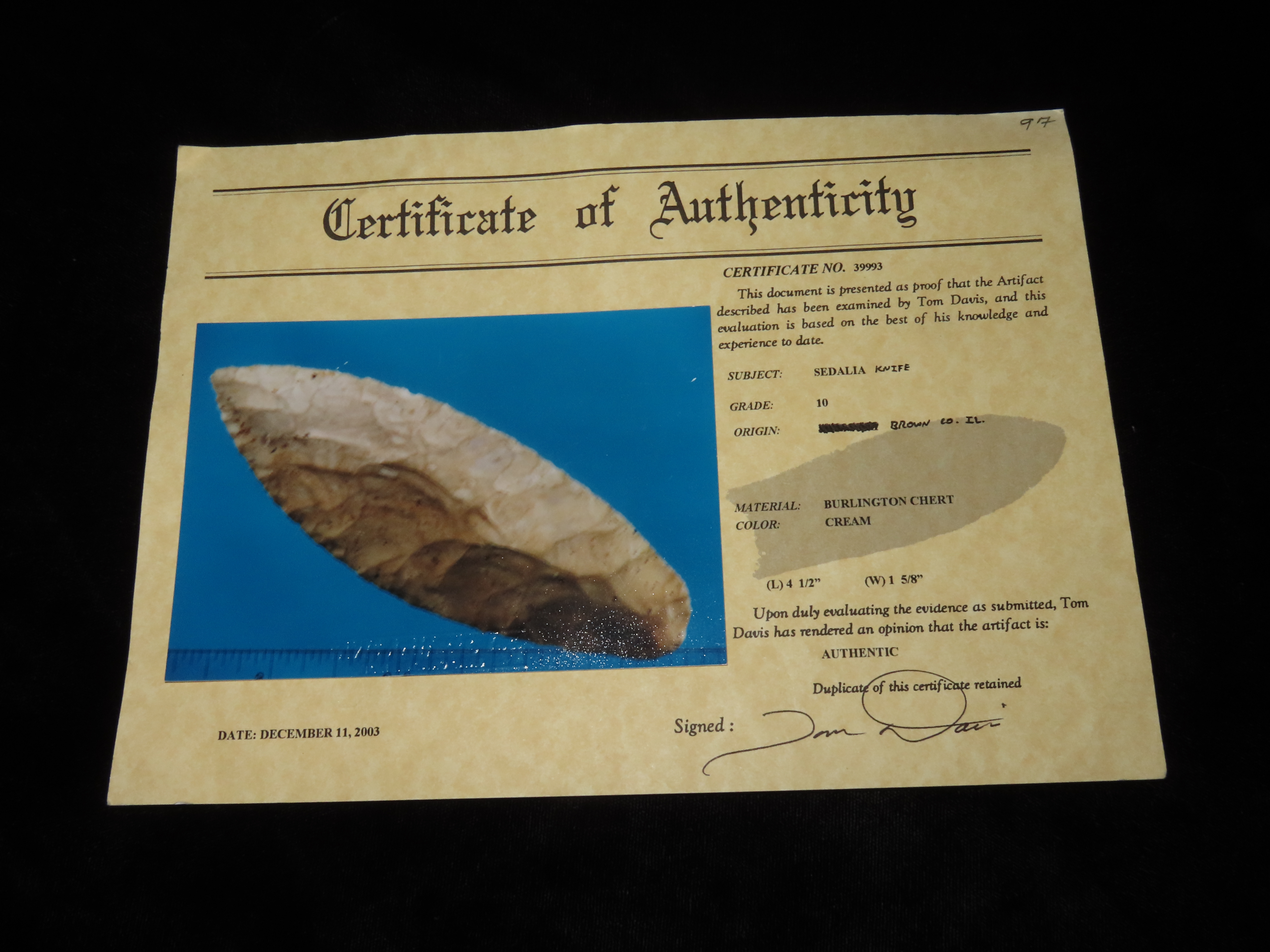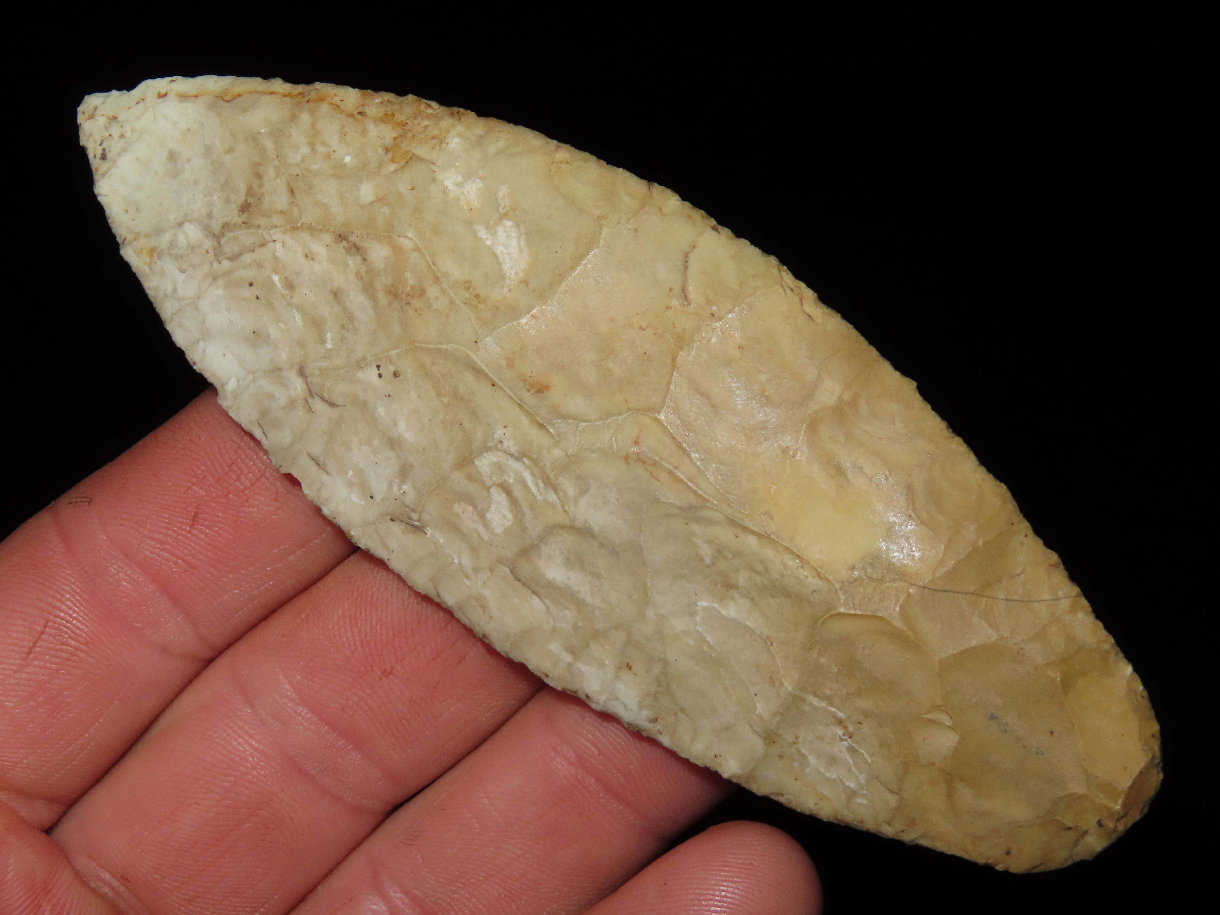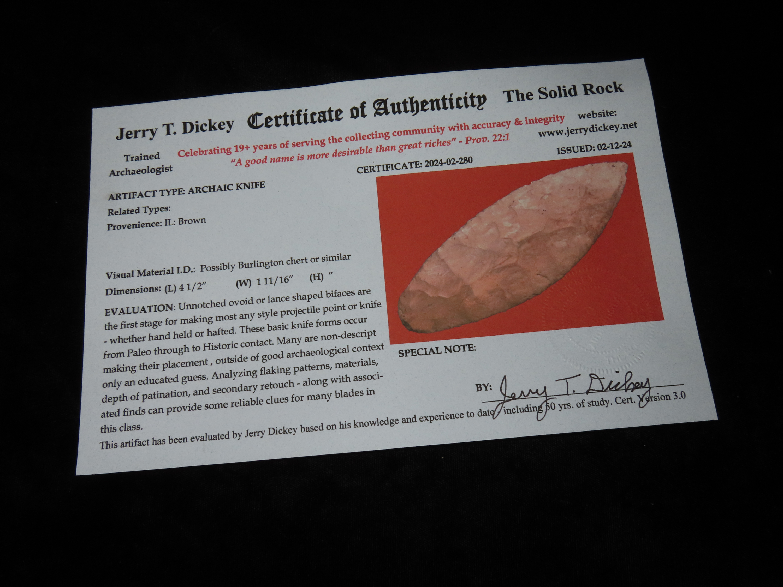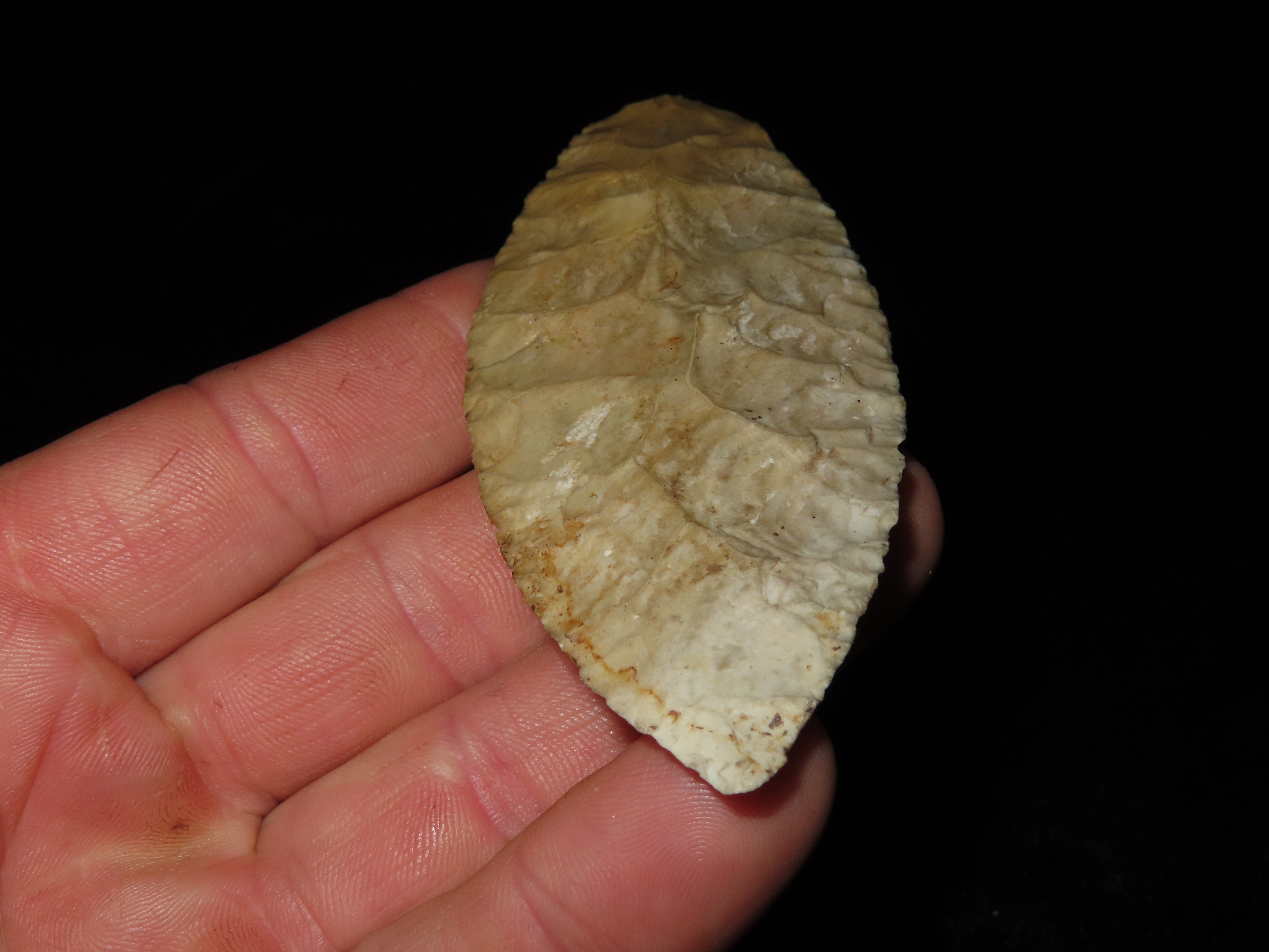 4 1/2″ EARLY OVOID KNIFE, DICKEY & DAVIS G10 COA, BROWN COUNTY ILLINOIS, GREAT EARLY FLAKING, HEAVY PATINA AND GREAT DEPOSITS