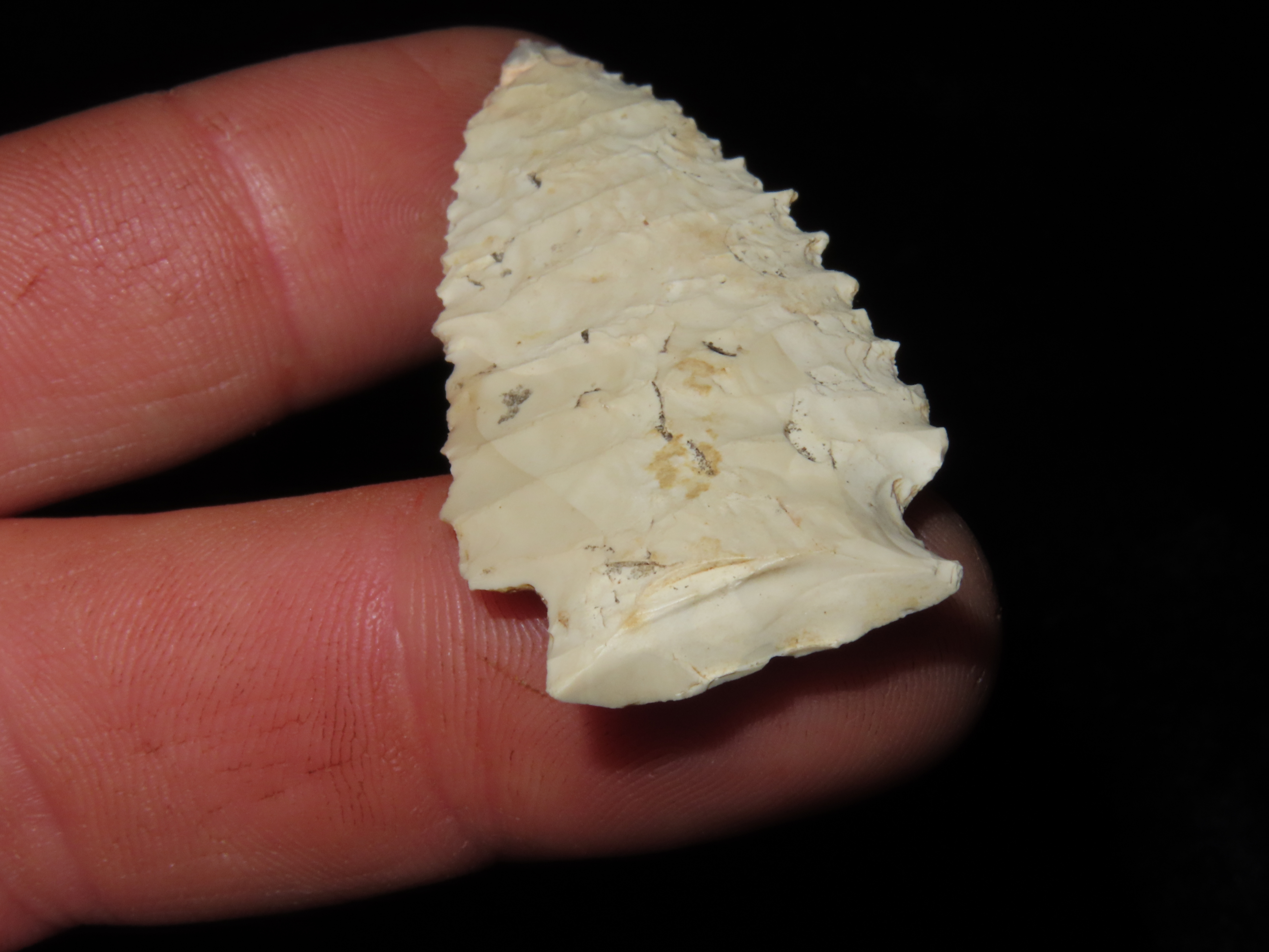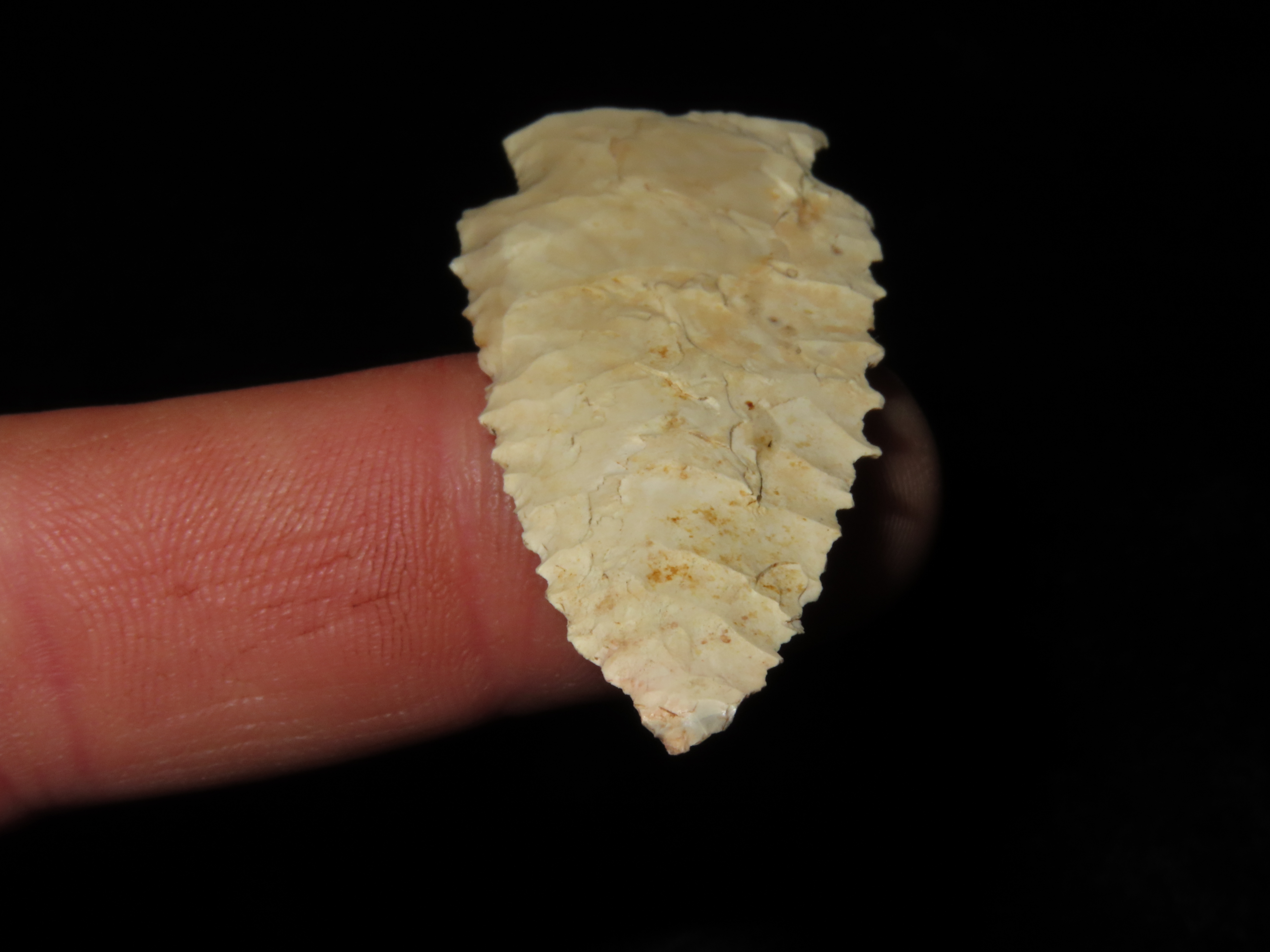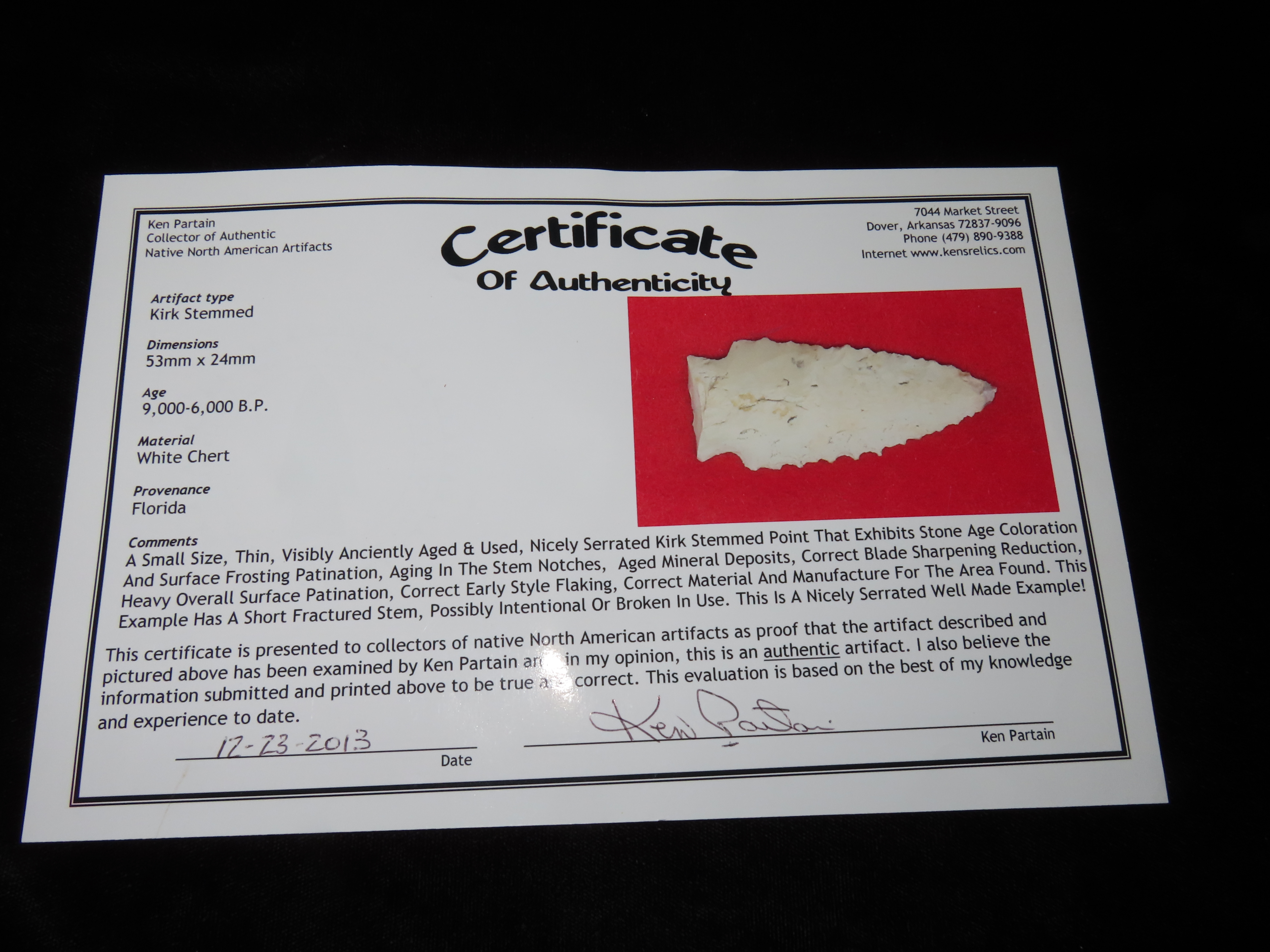 2 1/8″ SERRATED KIRK CORNER NOTCH FROM FLORIDA, PARTAIN COA, VERY THIN AND WELL FLAKED EXAMPLE, SHARP SAWTOOTH SERRATIONS, VERY THIN