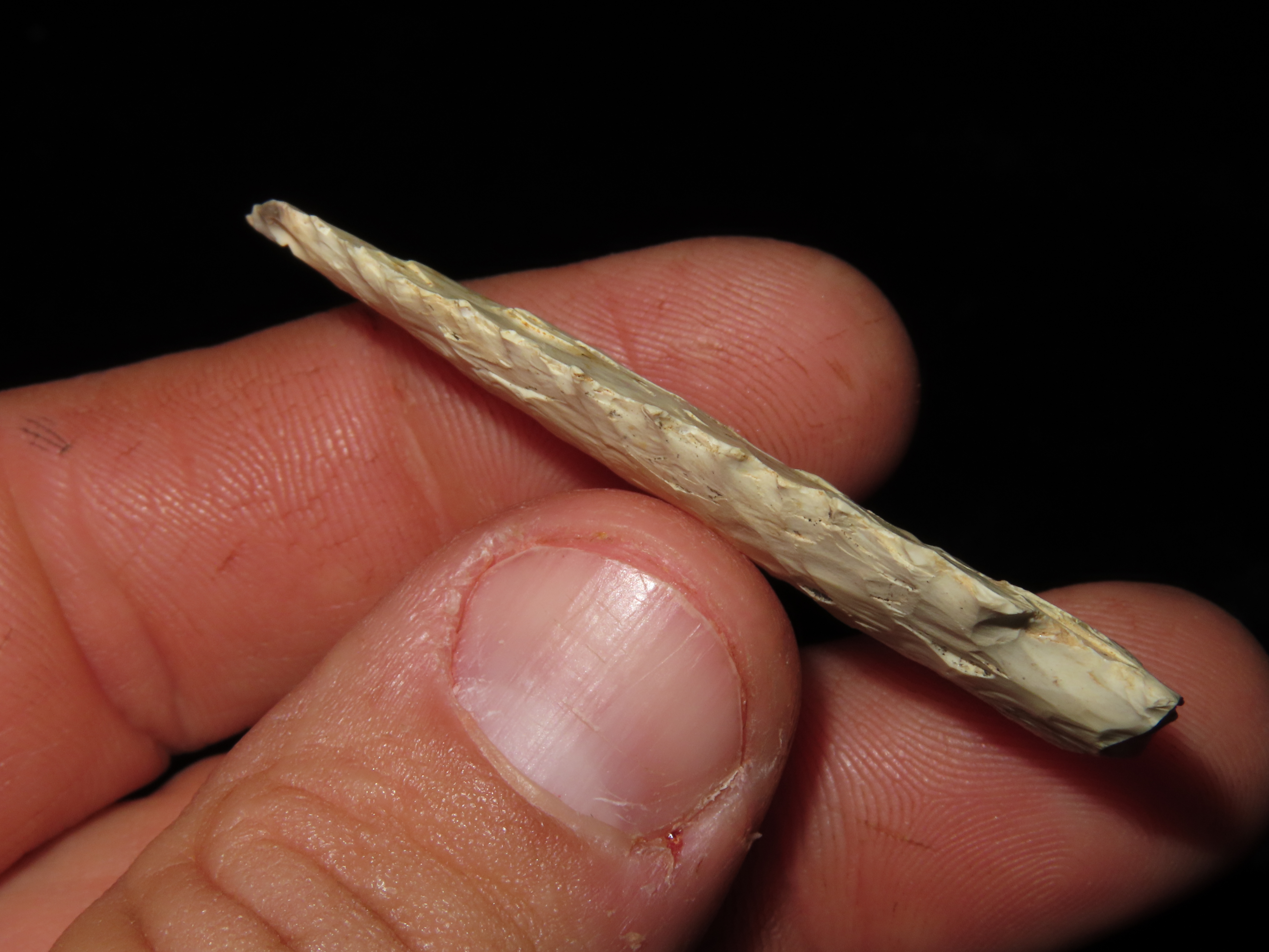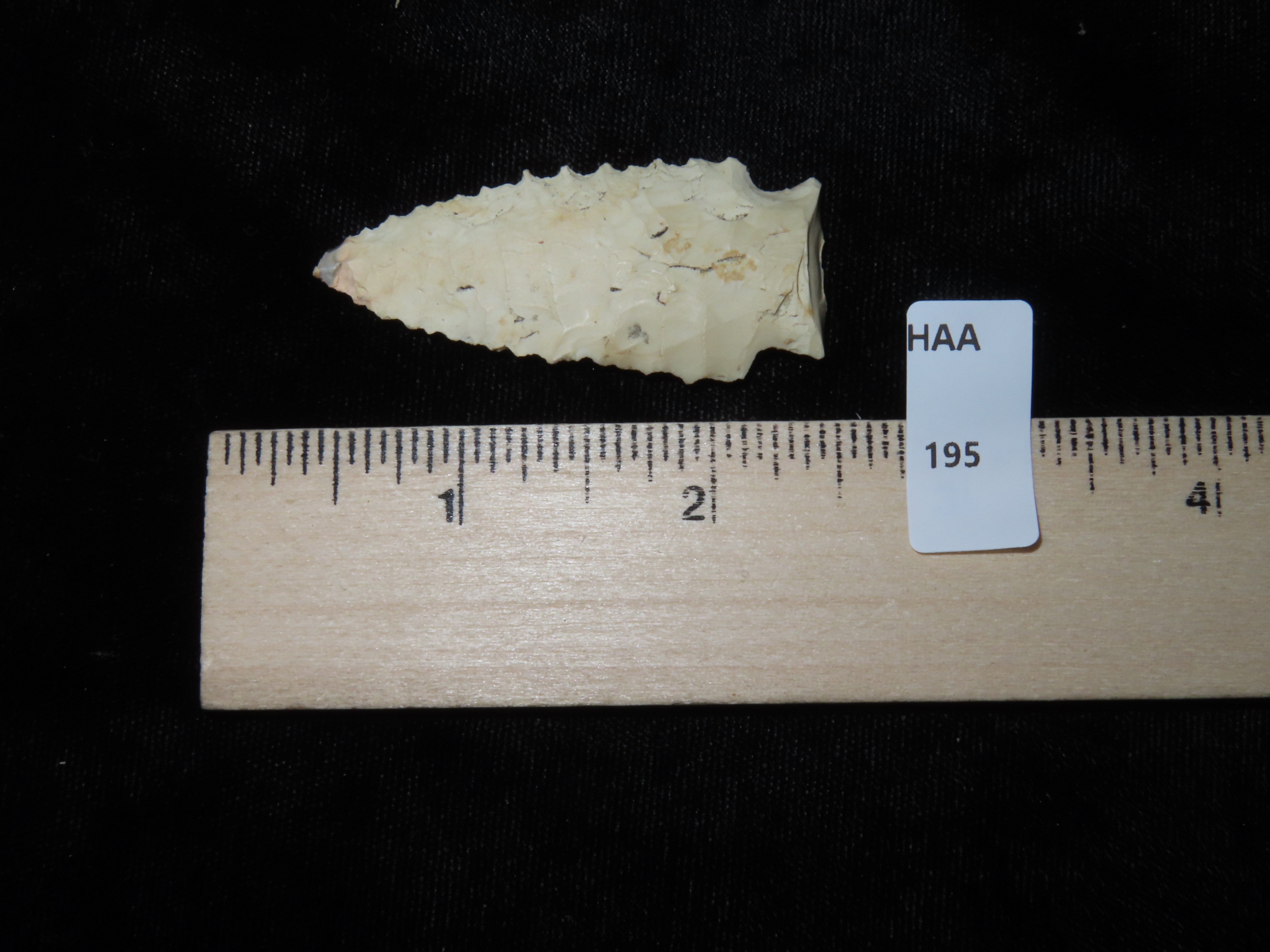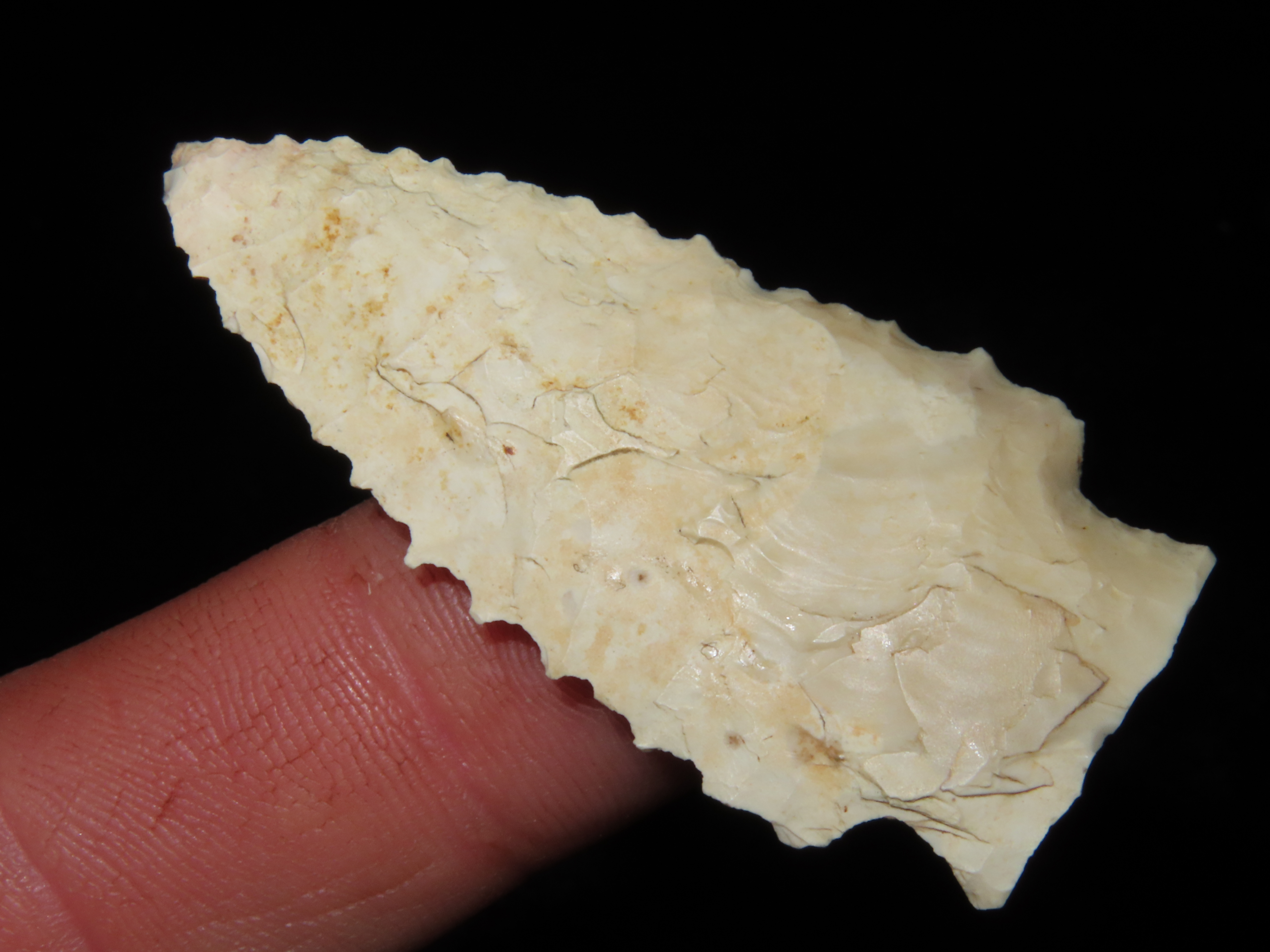2 1/8″ SERRATED KIRK CORNER NOTCH FROM FLORIDA, PARTAIN COA, VERY THIN AND WELL FLAKED EXAMPLE, SHARP SAWTOOTH SERRATIONS, VERY THIN