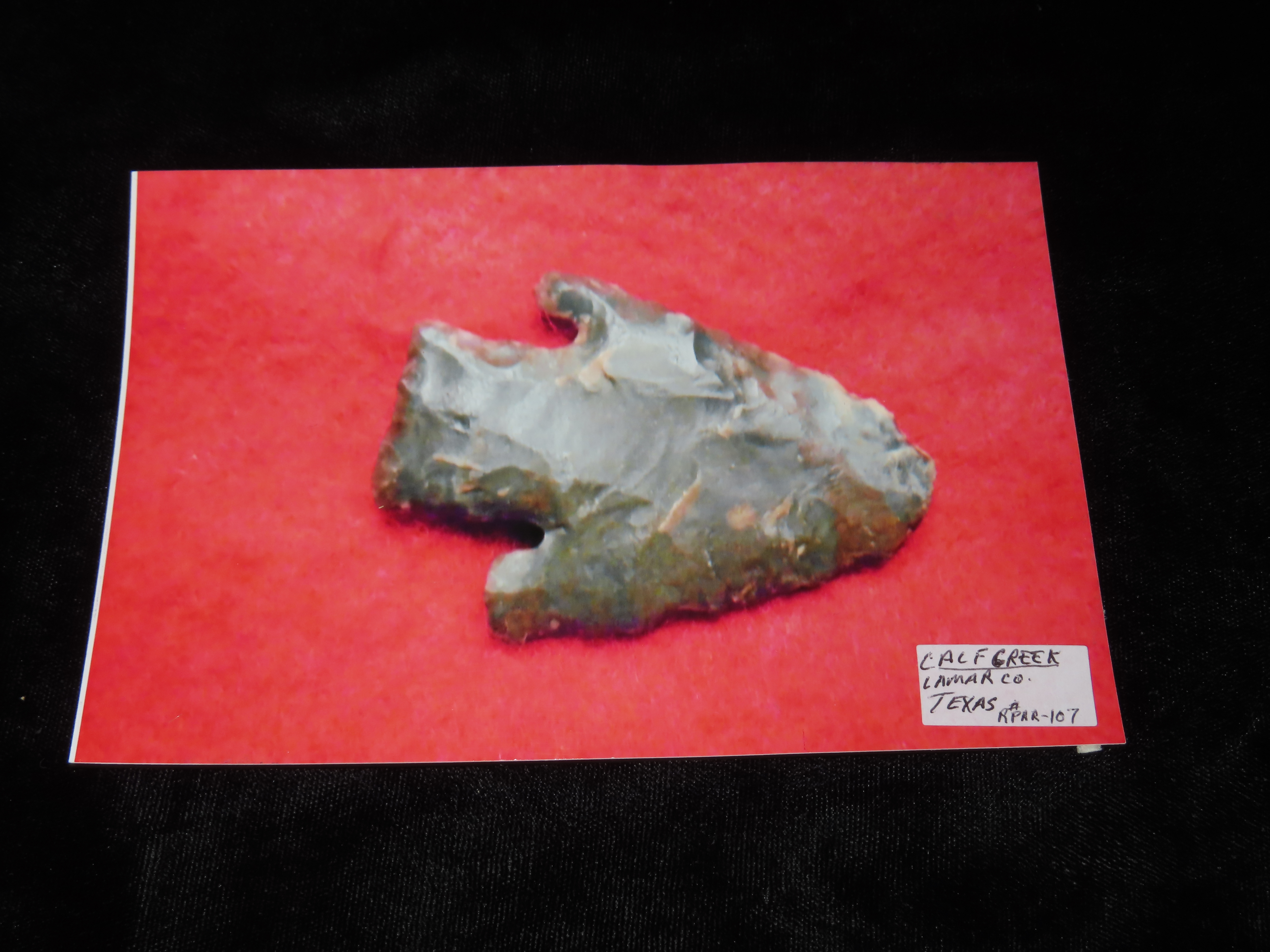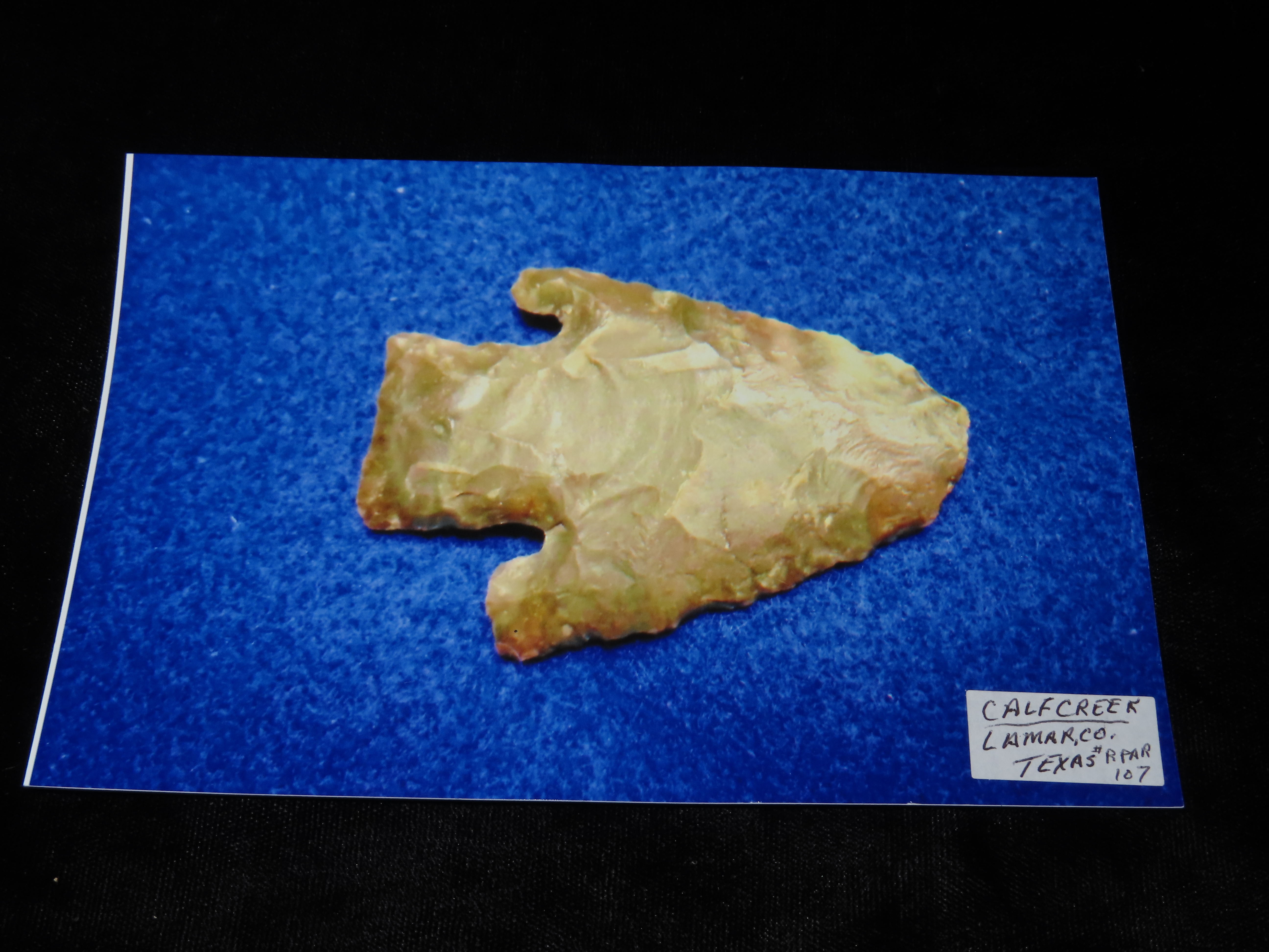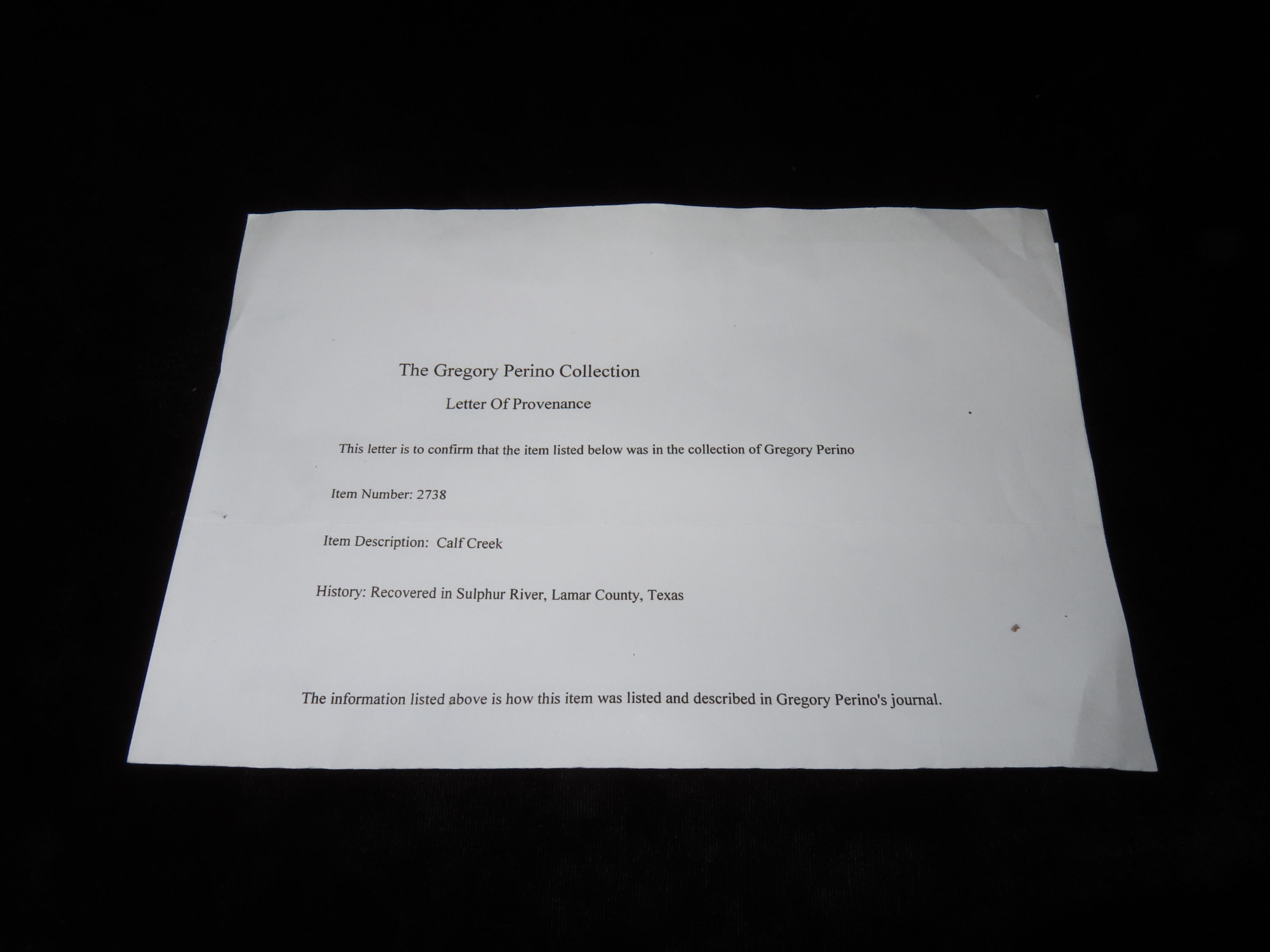 1 15/16″ TRANSLUCENT CALF CREEK, LAMAR CO. TEXAS, FOUND NEAR THE SULPHUR RIVER, EX GREG PERINO COLLECTION, COMES WITH LETTER OF PREVENANCE