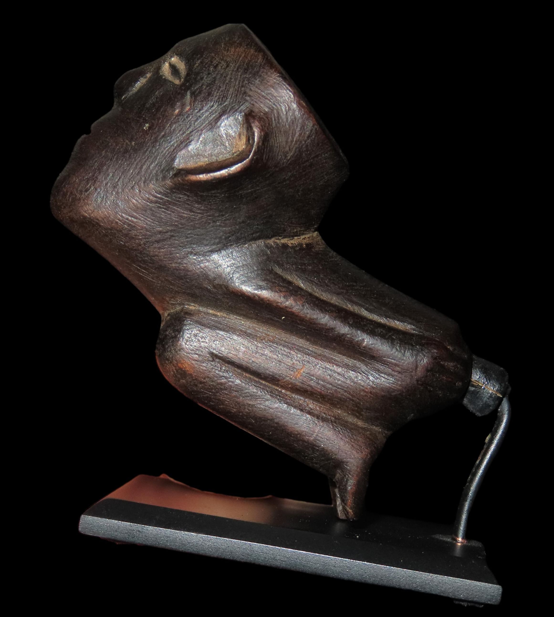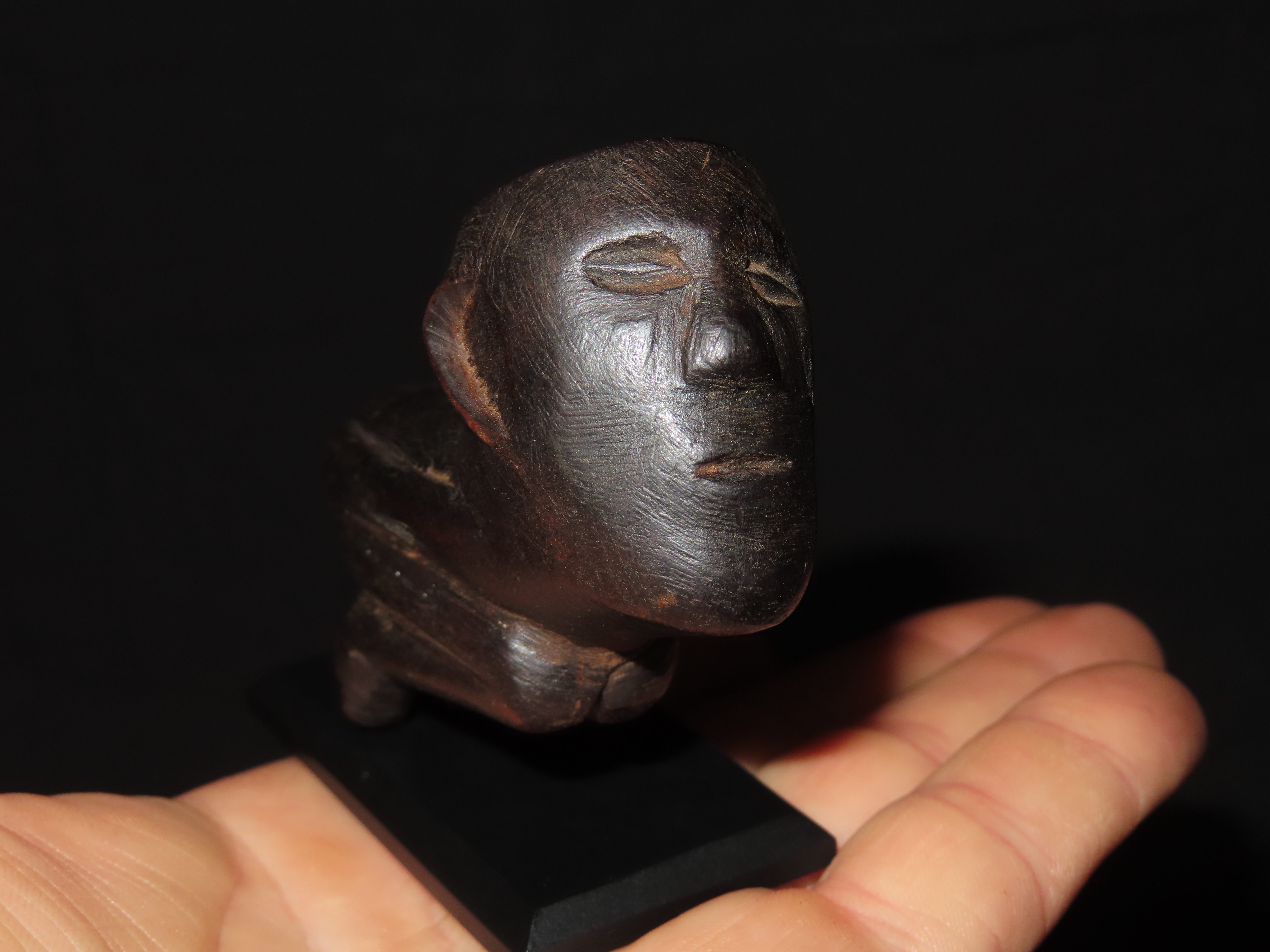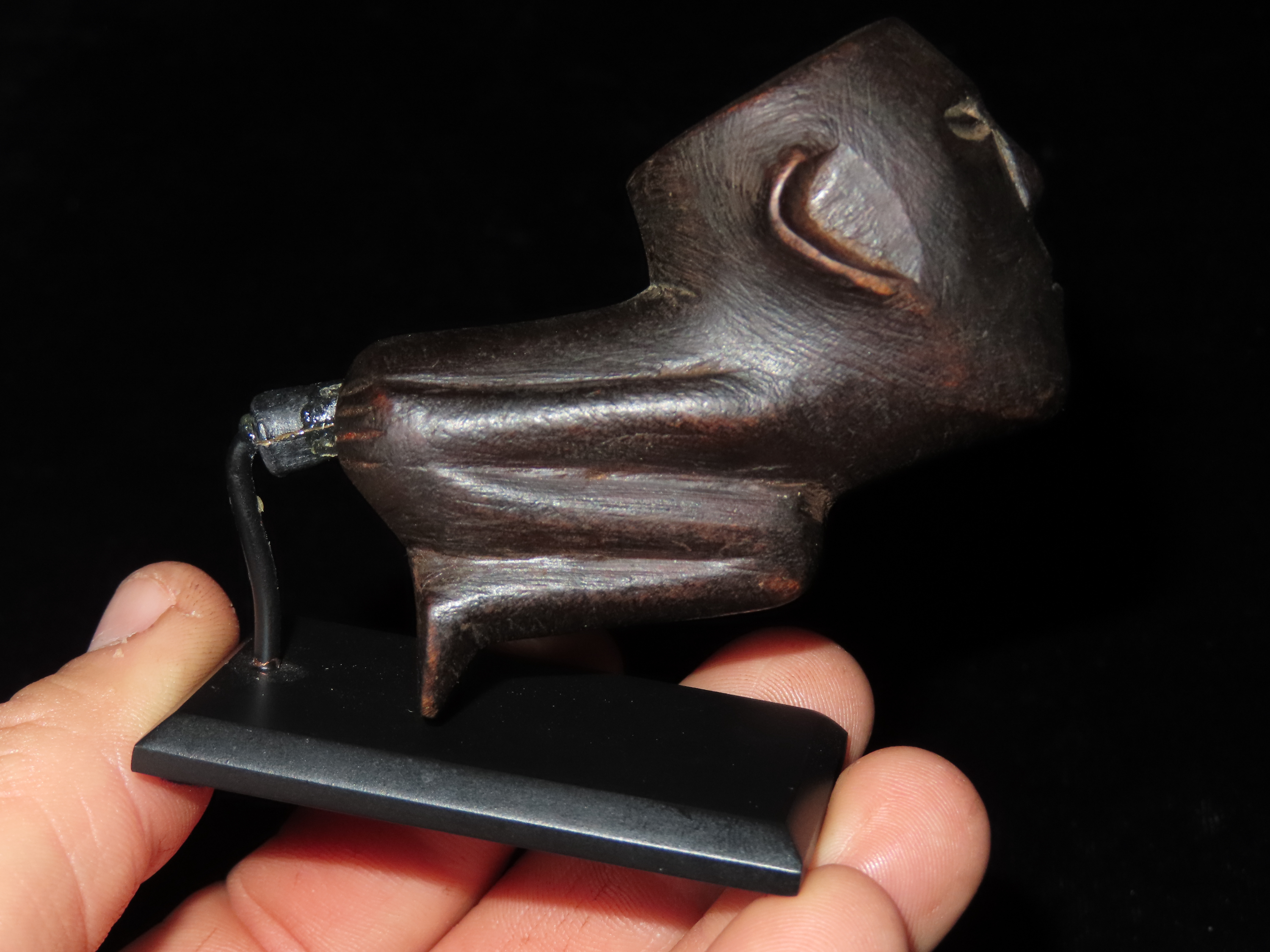 INCREDIBLE HUMAN EFFIGY HISTORIC WOODEN PIPE, INTRICATELY CARVED WITH GREAT DETAIL, RICH PATINA, INCLUDES A NICE MUSEUM STAND, RARE EXAMPLE