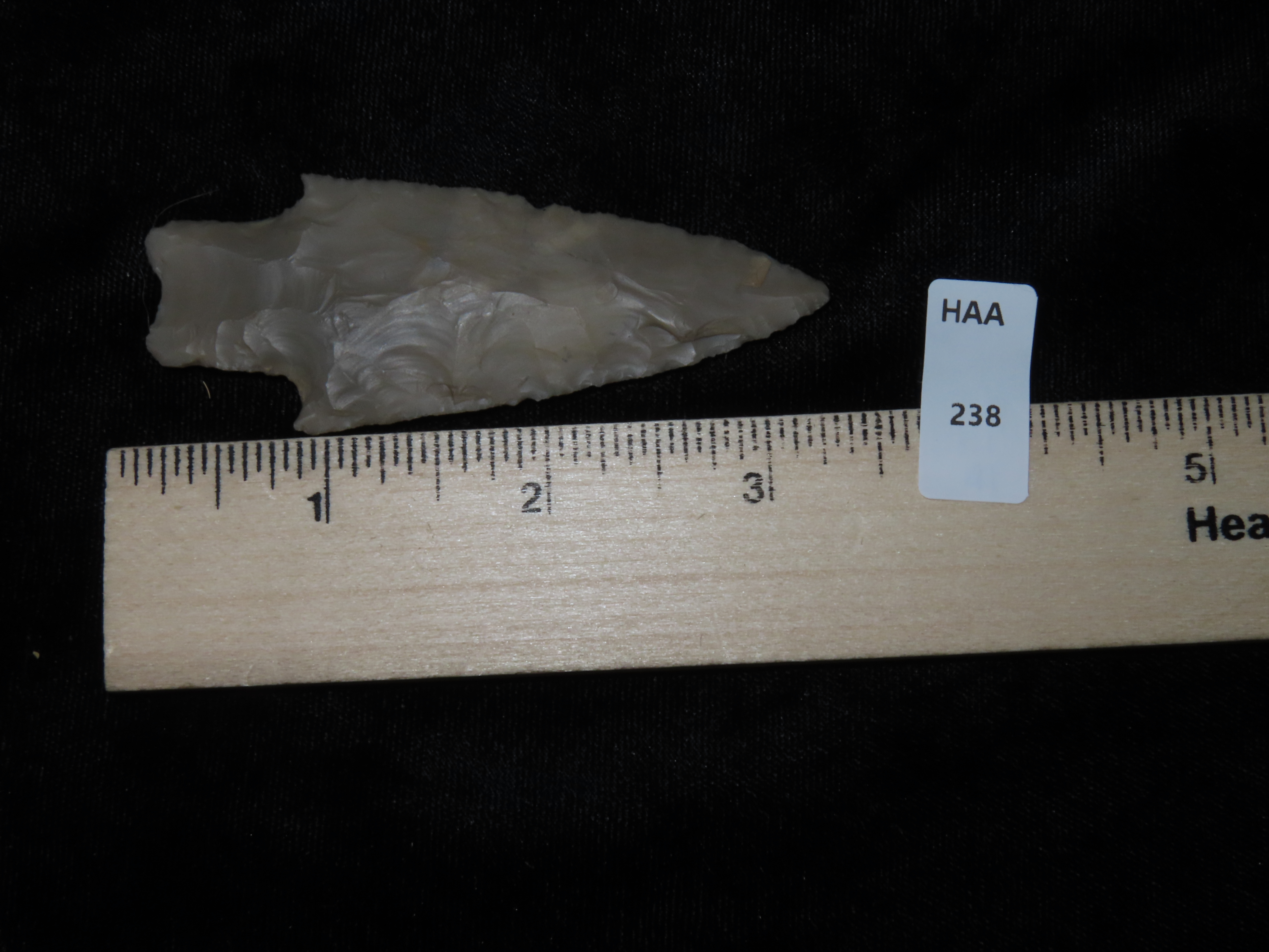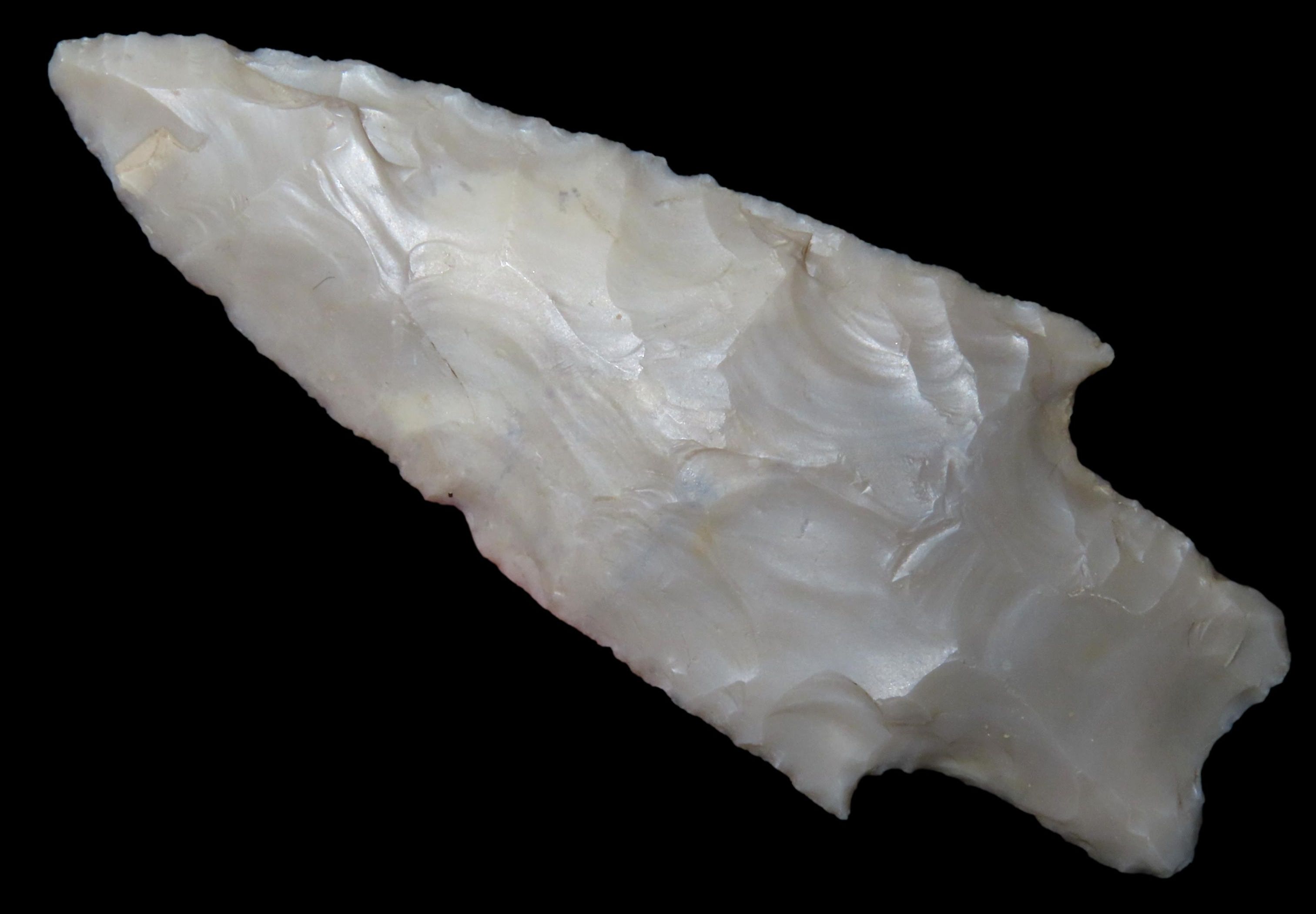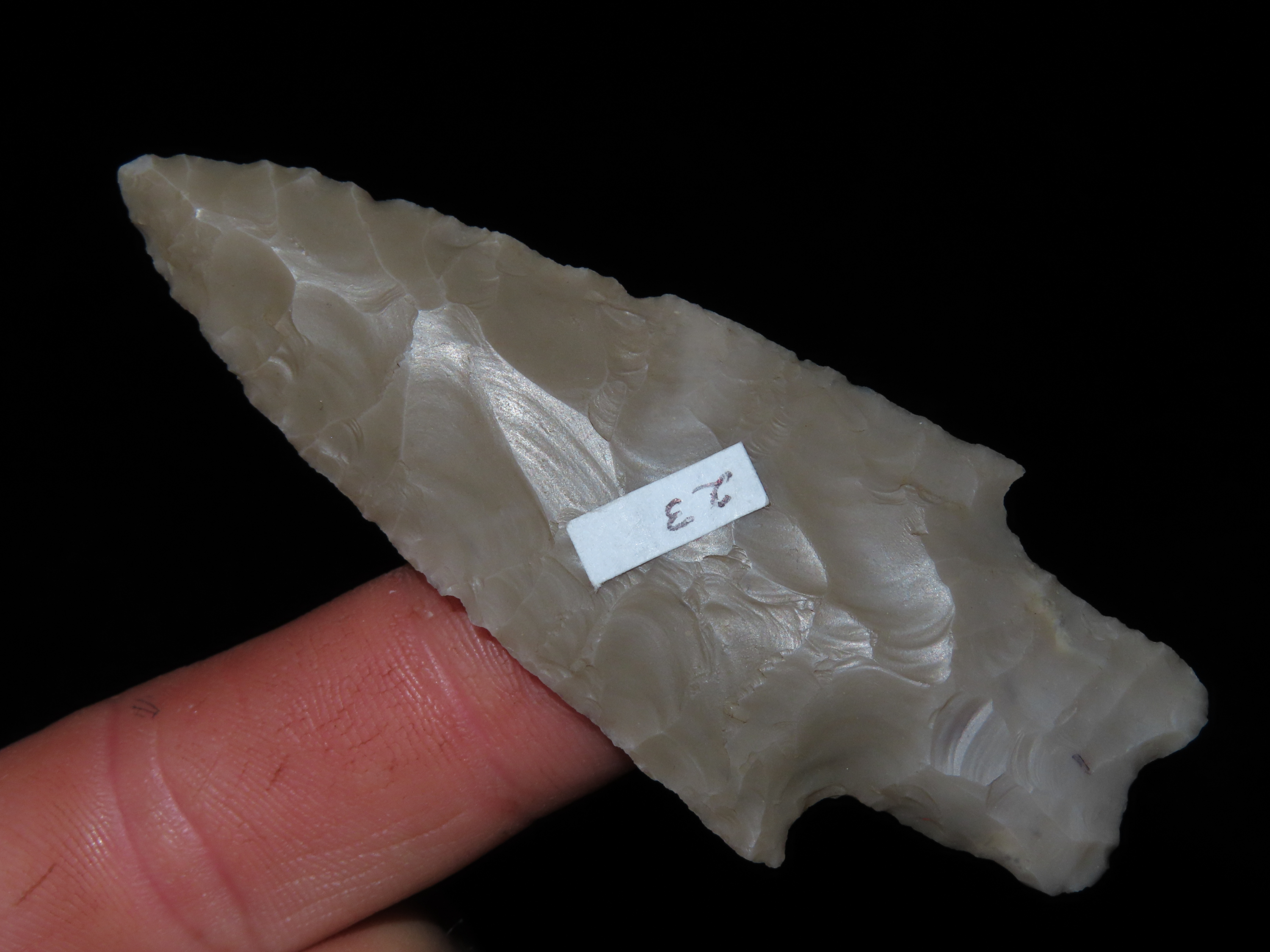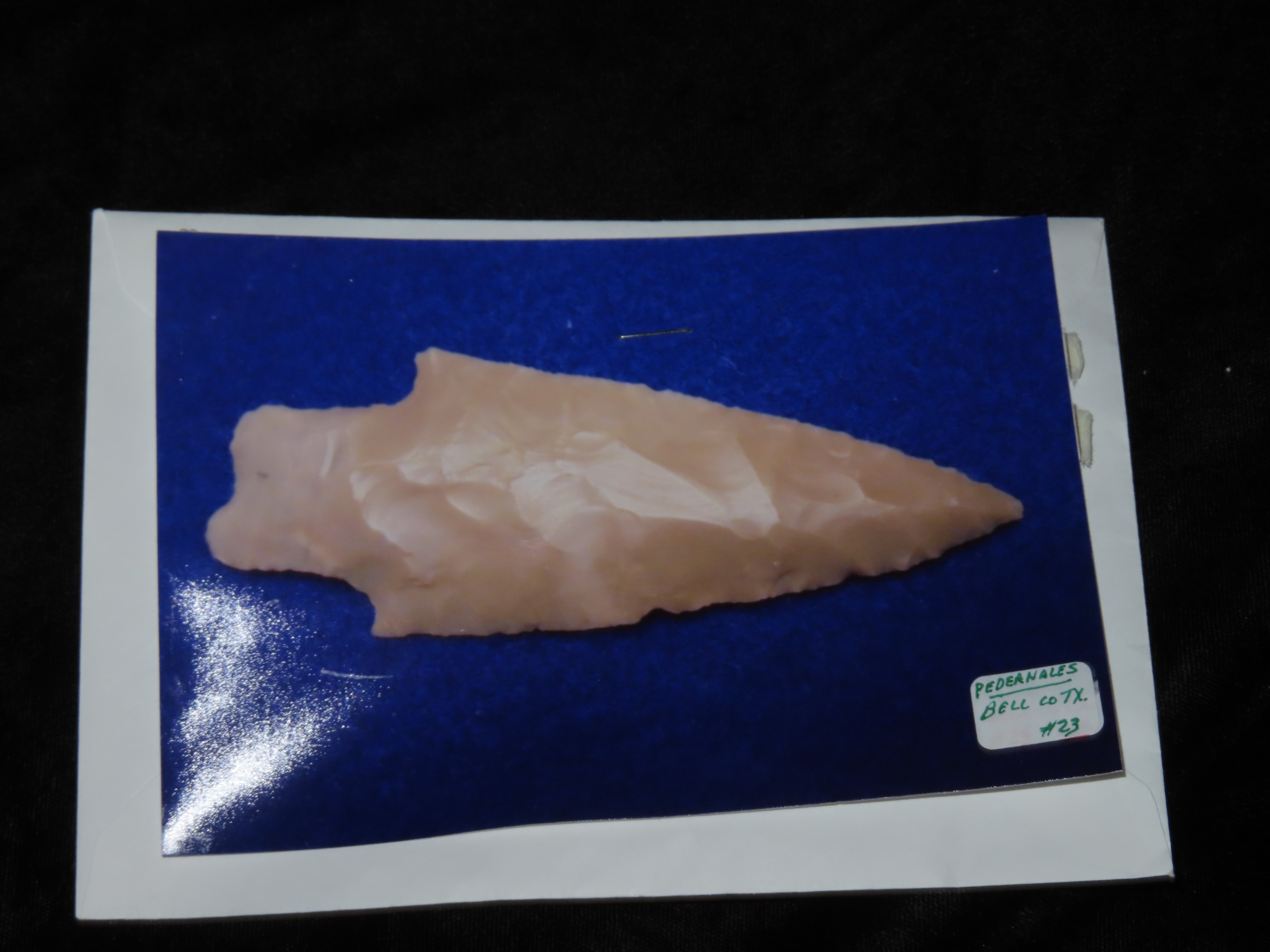 3 1/4″ PEDERNALES, BELL COUNTY TEXAS, NICE PERD, HIGHLY TRANSLUCENT & VERY WELL FLAKED EXAMPLE, EX DR. TED RAUCK COLLECTION, INDIAN ARROWHEAD