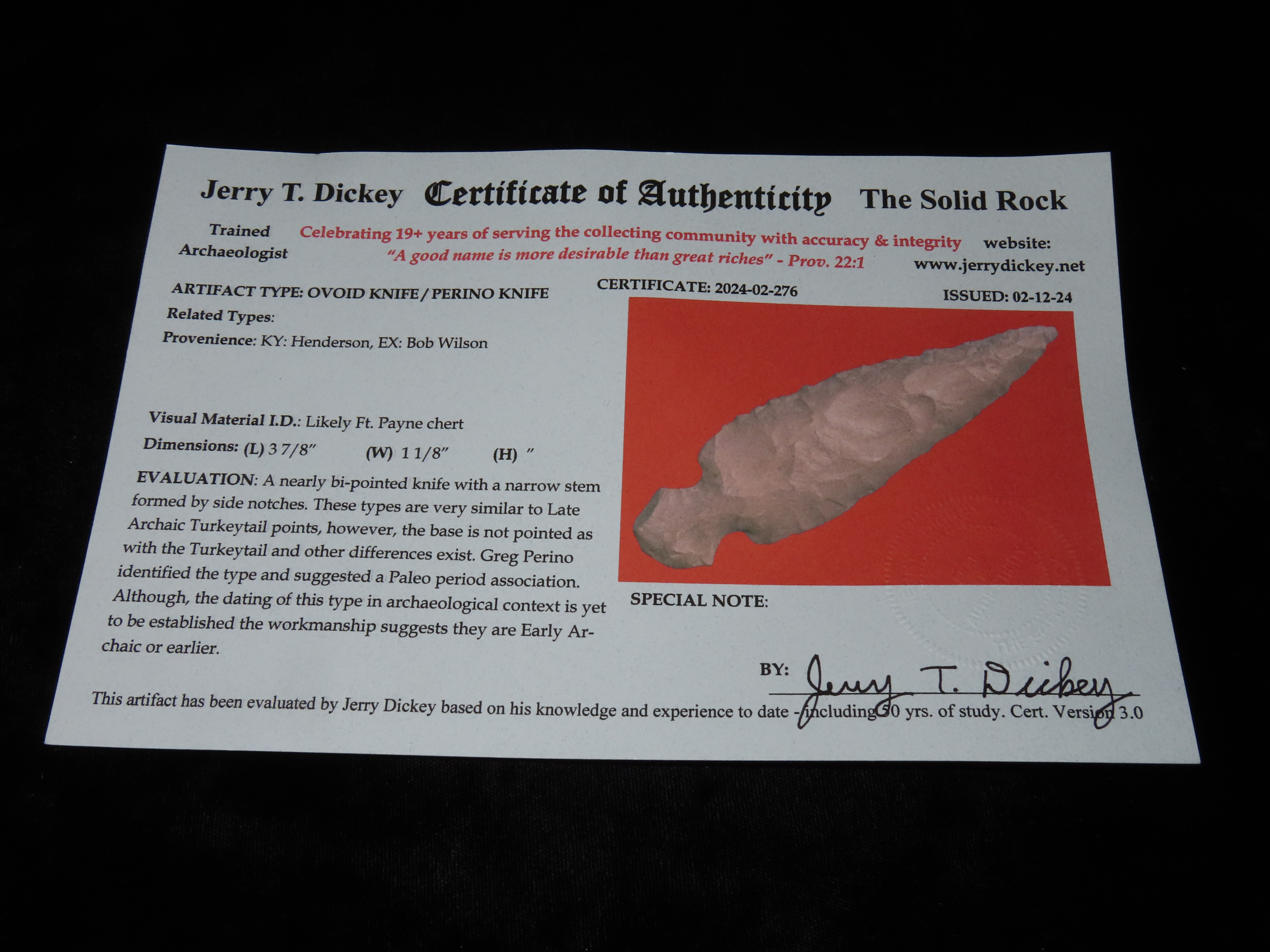 3 7/8″ EARLY OVOID KNIFE / PERINO KNIFE, DICKEY COA, FOUND IN HENDERSON COUNTY KENTUCKY, EX BOB WILSON COLLECTION, NICE CLASSIC EXAMPLE