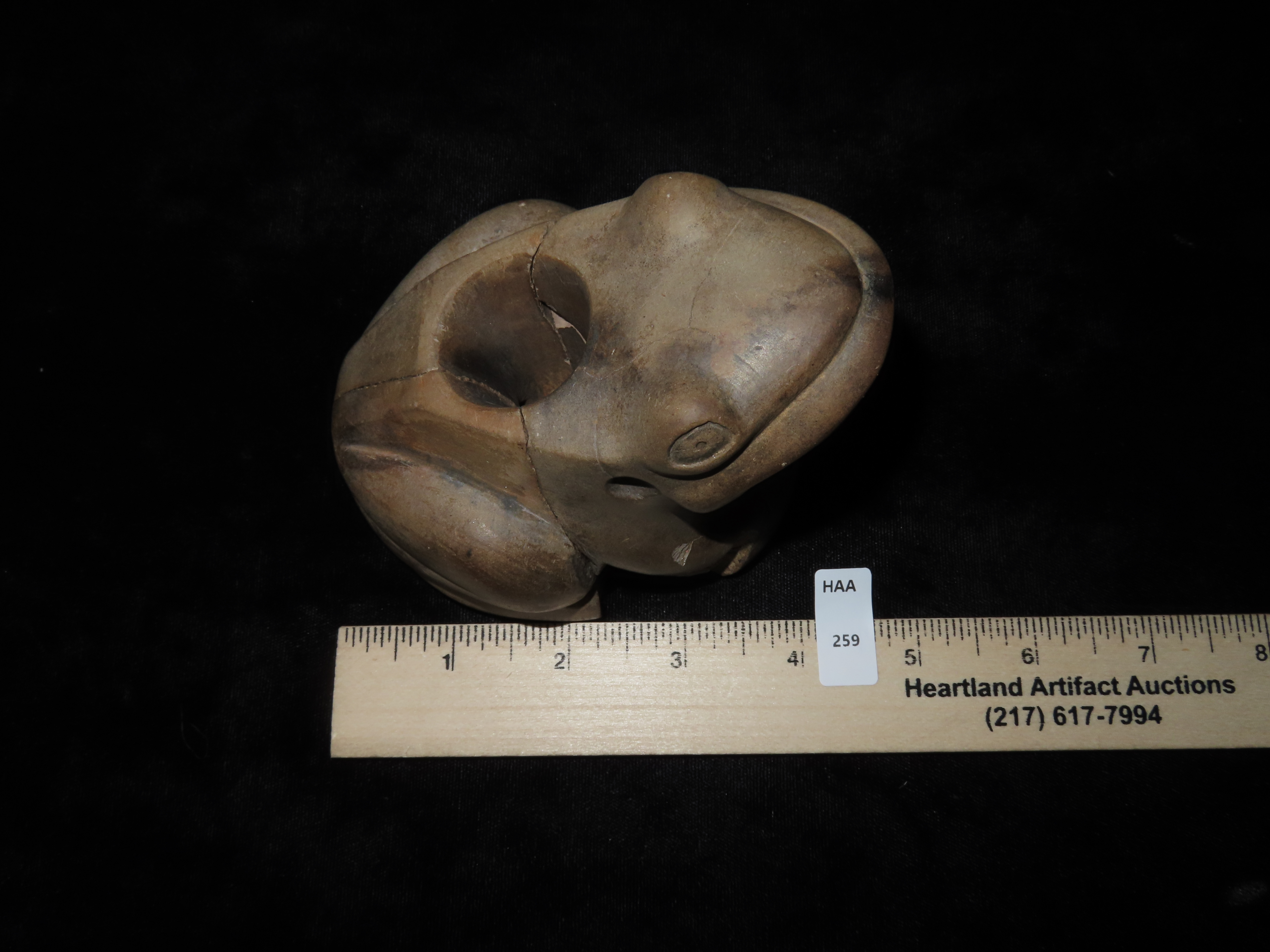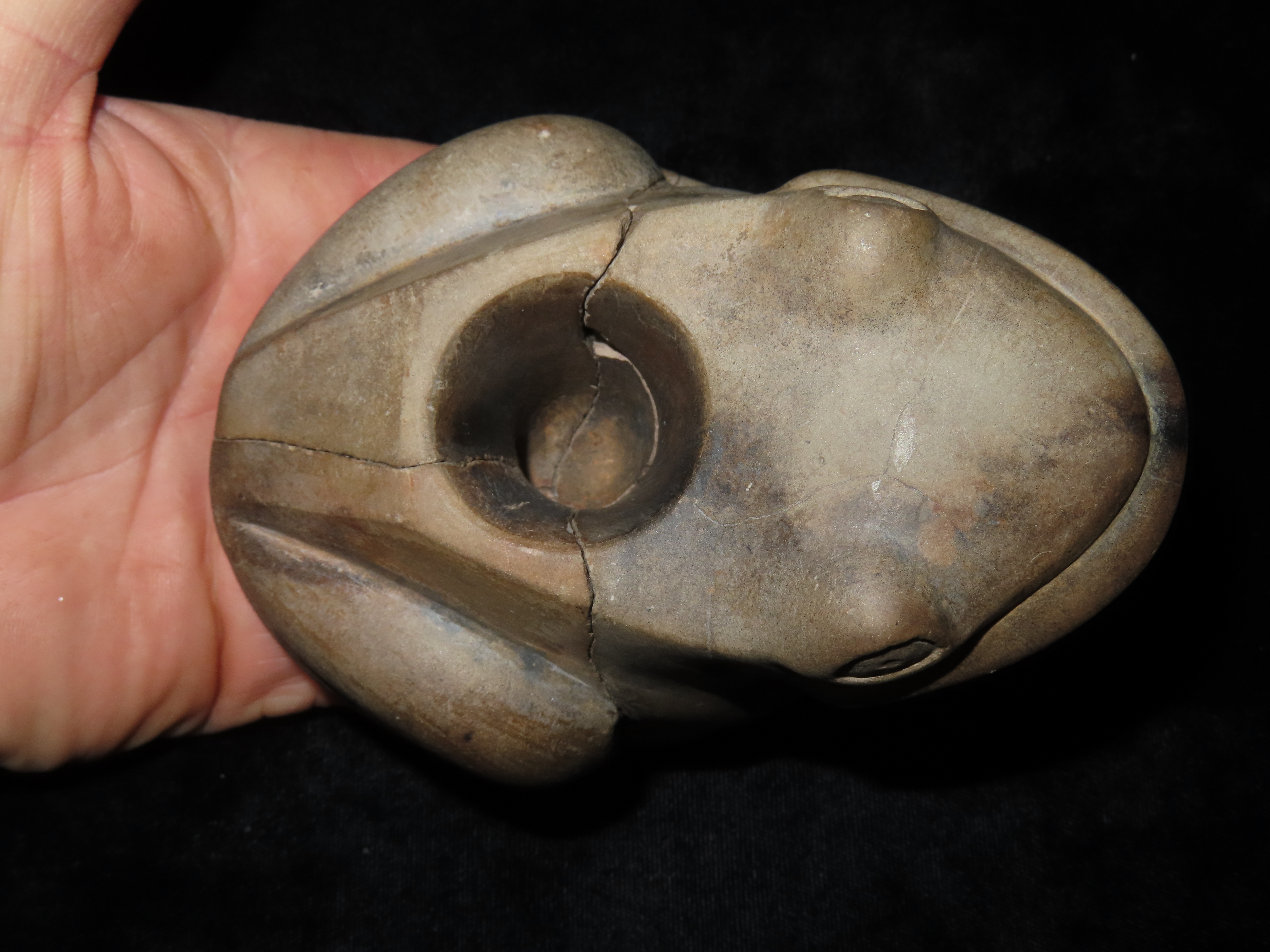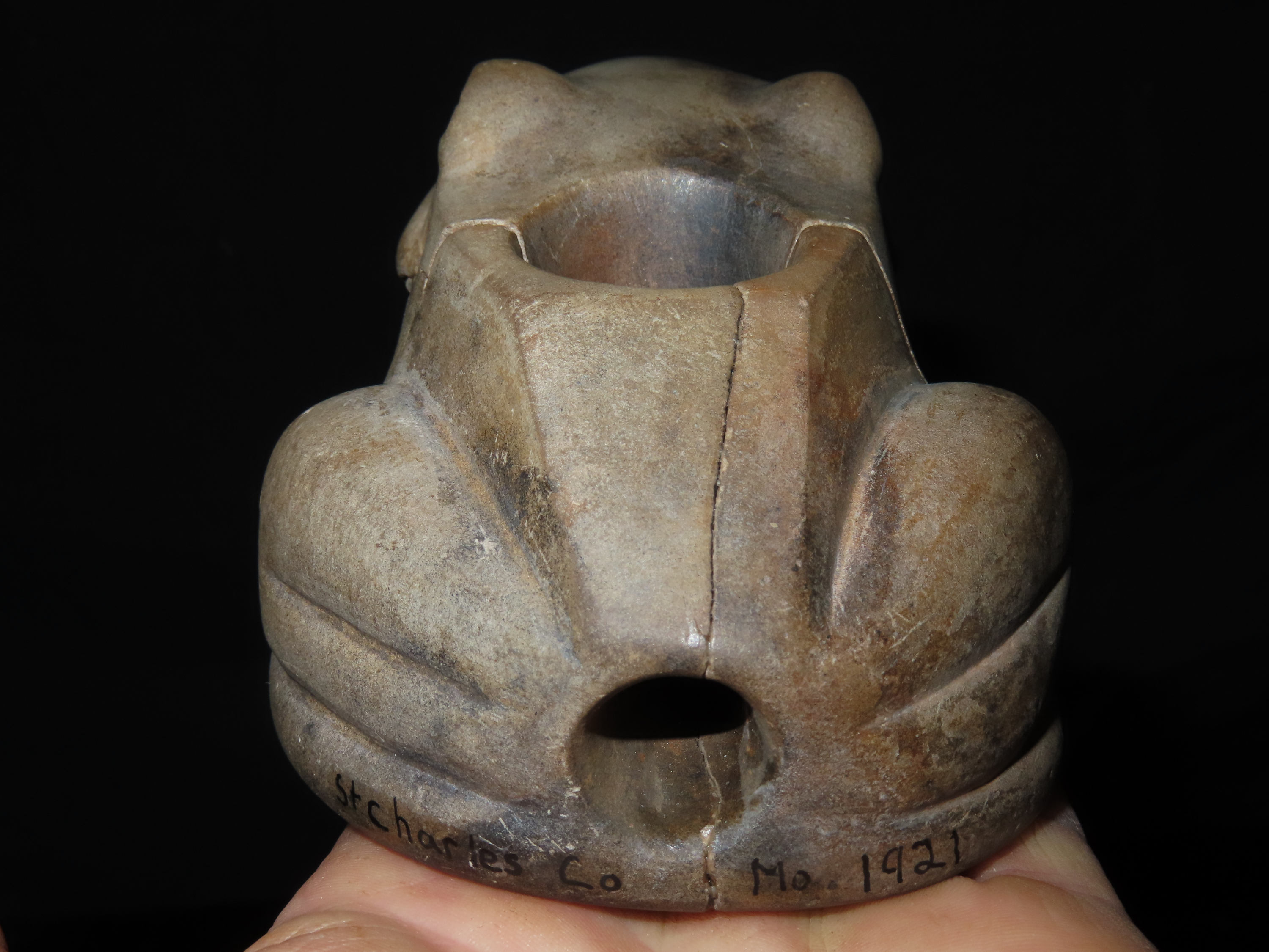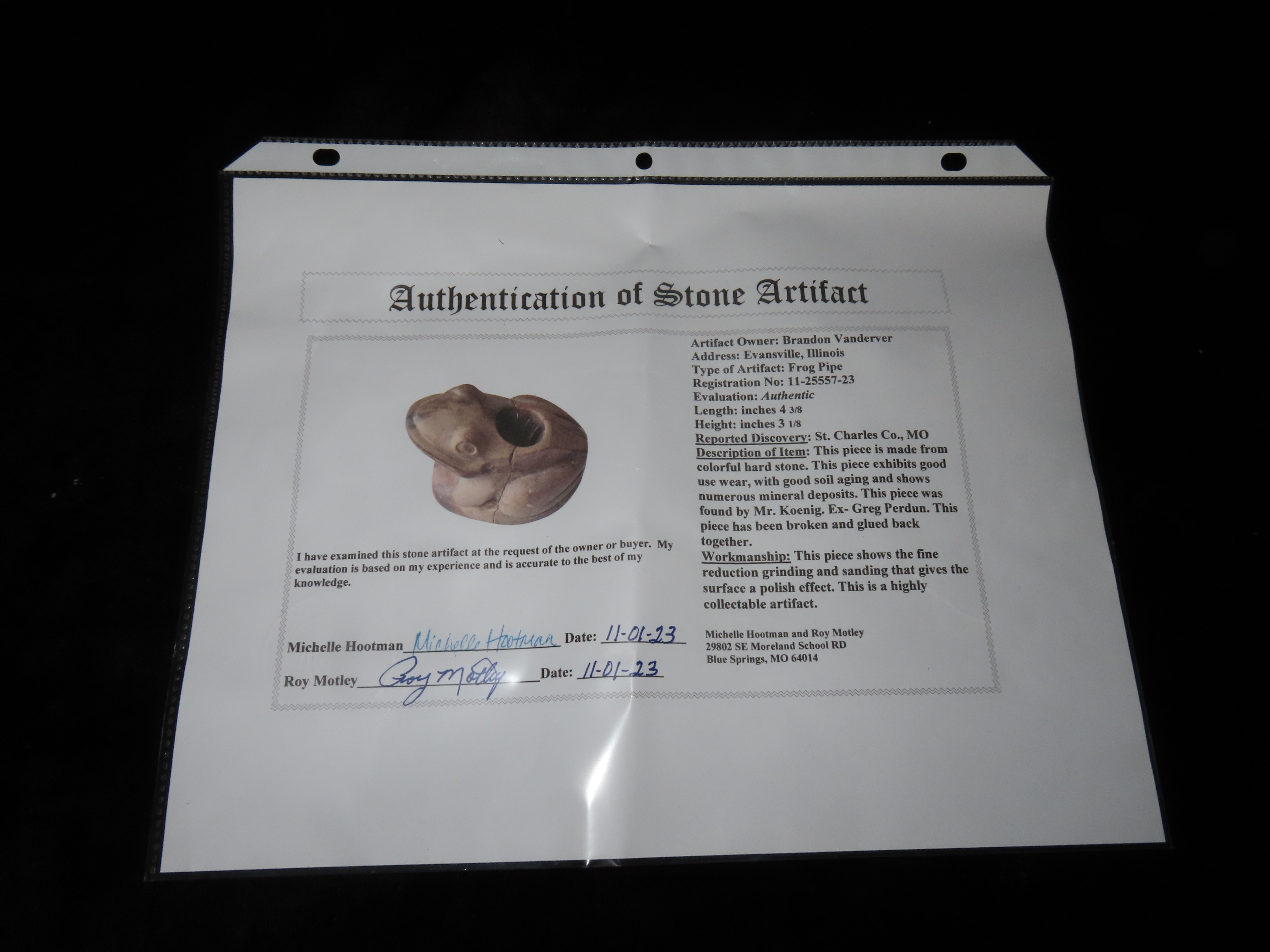 RARE FROG EFFIGY PIPE, MOTLEY COA, ST CHARLES COUNTY MISSOURI, FOUND BY MR KOENIG, EX GREG PERDUN COLLECTION, FOUND IN PIECES & GLUED TOGETHER, AMAZING DETAIL, IN PERDUN’S COLLECTION FOR MANY YEARS UNTIL HE PASSED IN 2021.
